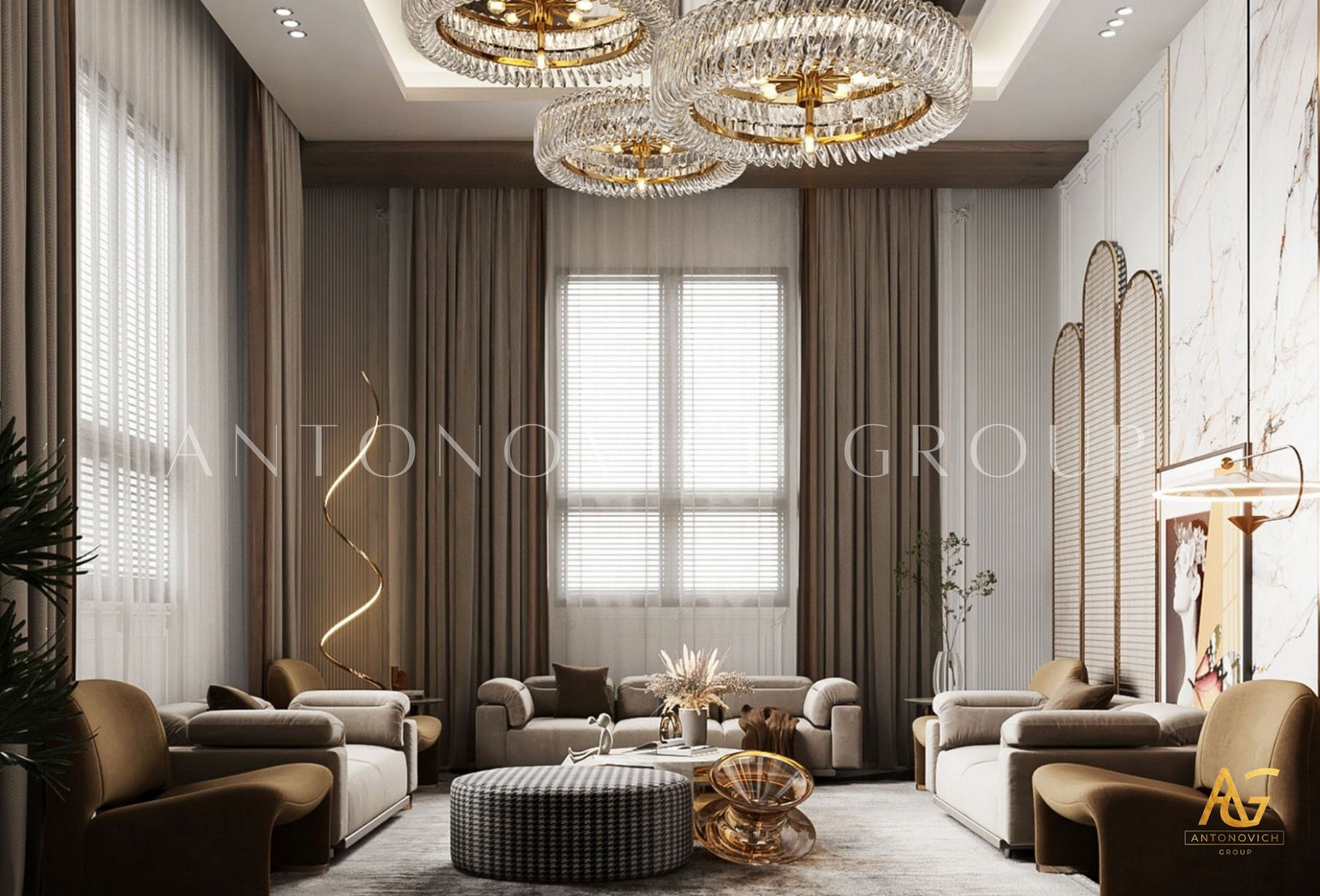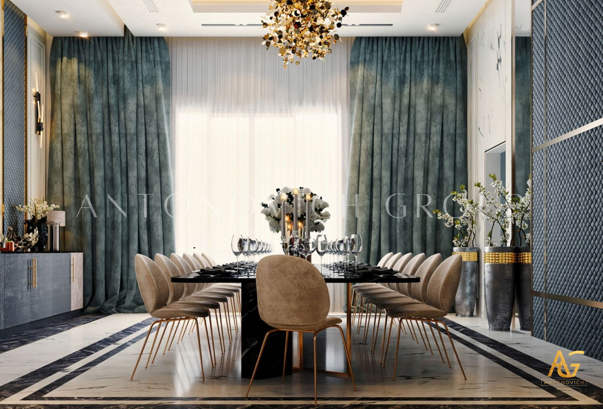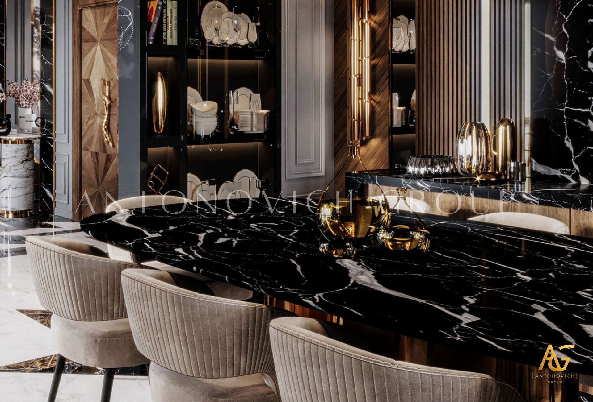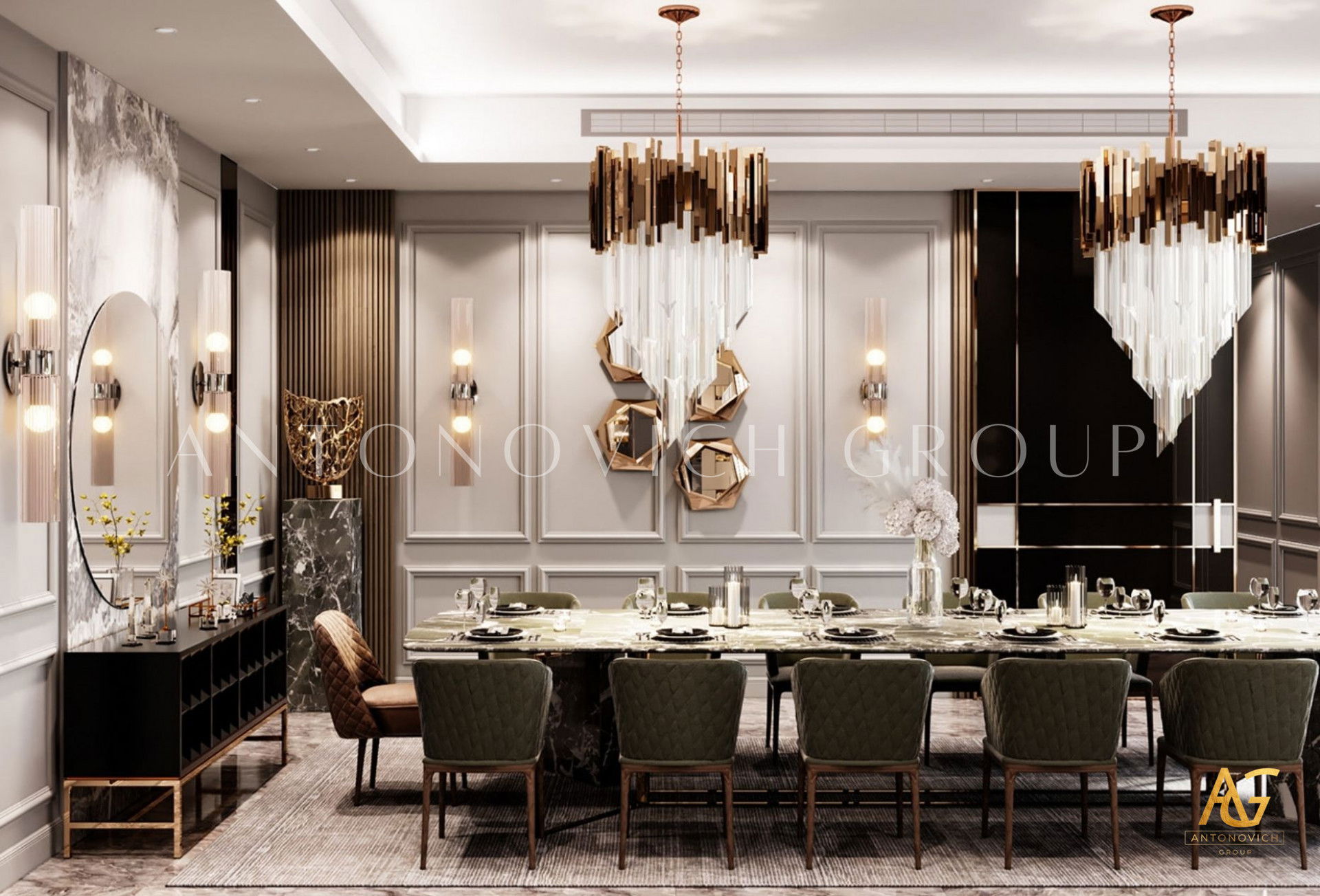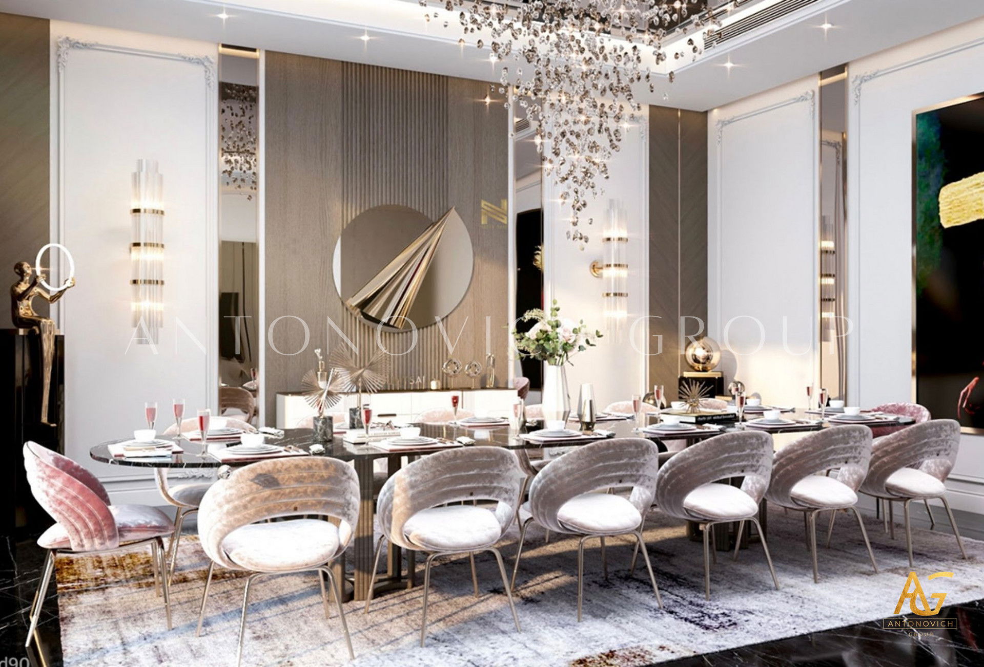 Luxury Antonovich Design created it in a modern style with practical features and bright colors. After the Dubai villa design plans was completed, the customers were pleased with the results. Theyve transformed their bland high-rise into a warm and inviting house thats not just well-designed but also comfy and lavish! The living area is only a few steps away from the large dining room. Because of the tall, big windows, fitting the entire luxury Dubai villa design plans and the kitchen has been wonderful. The luxury home interior design Dubai chose to make things better.