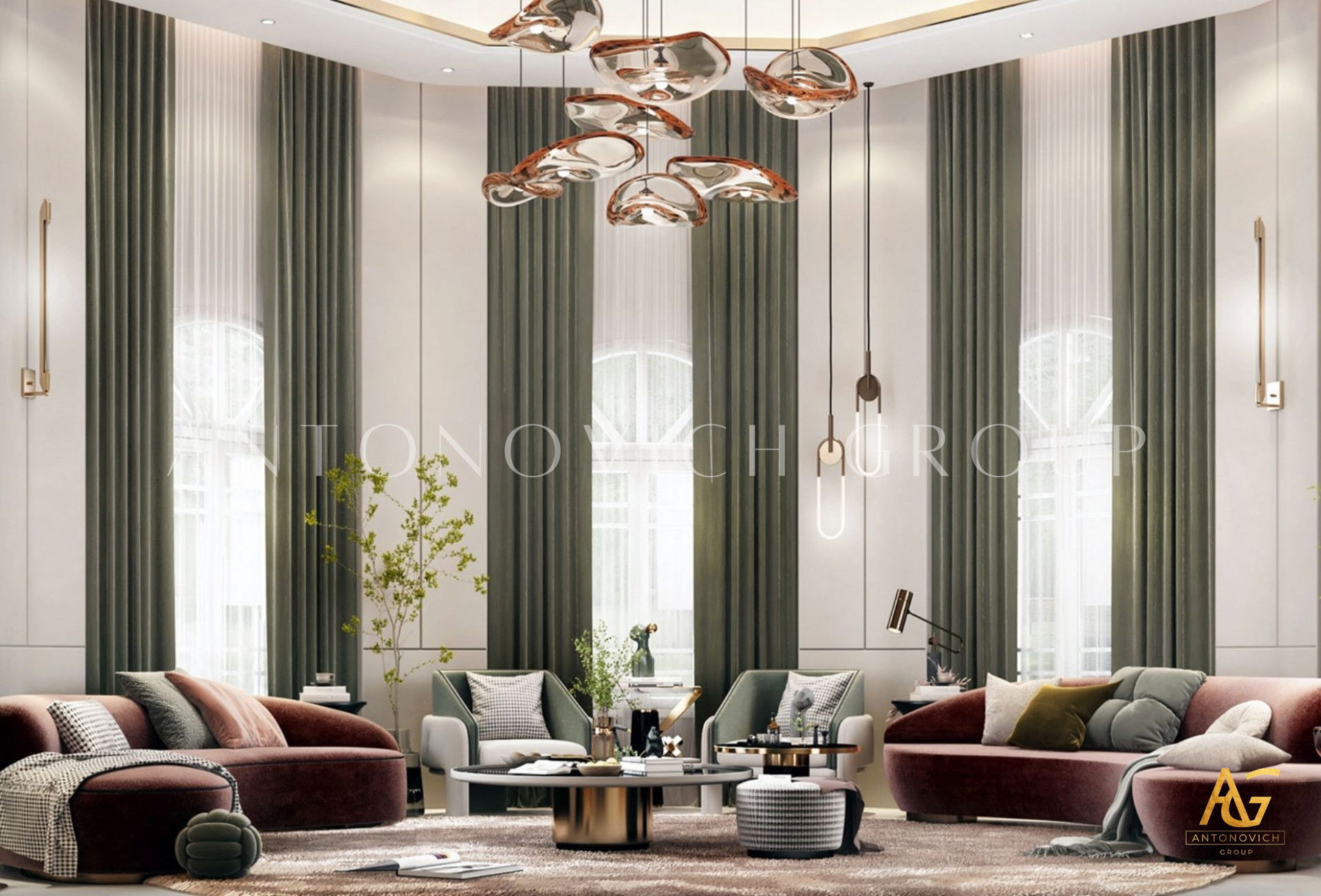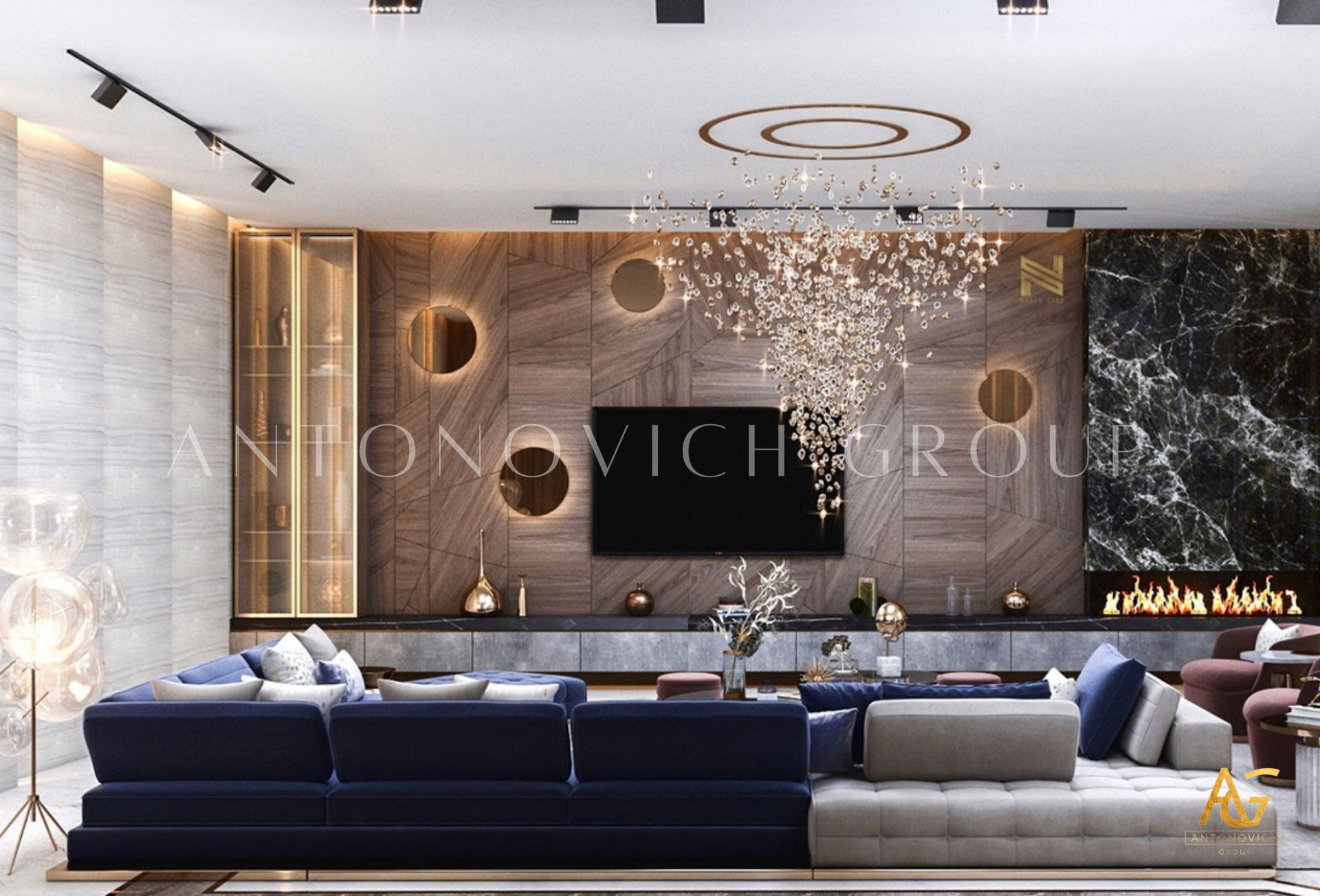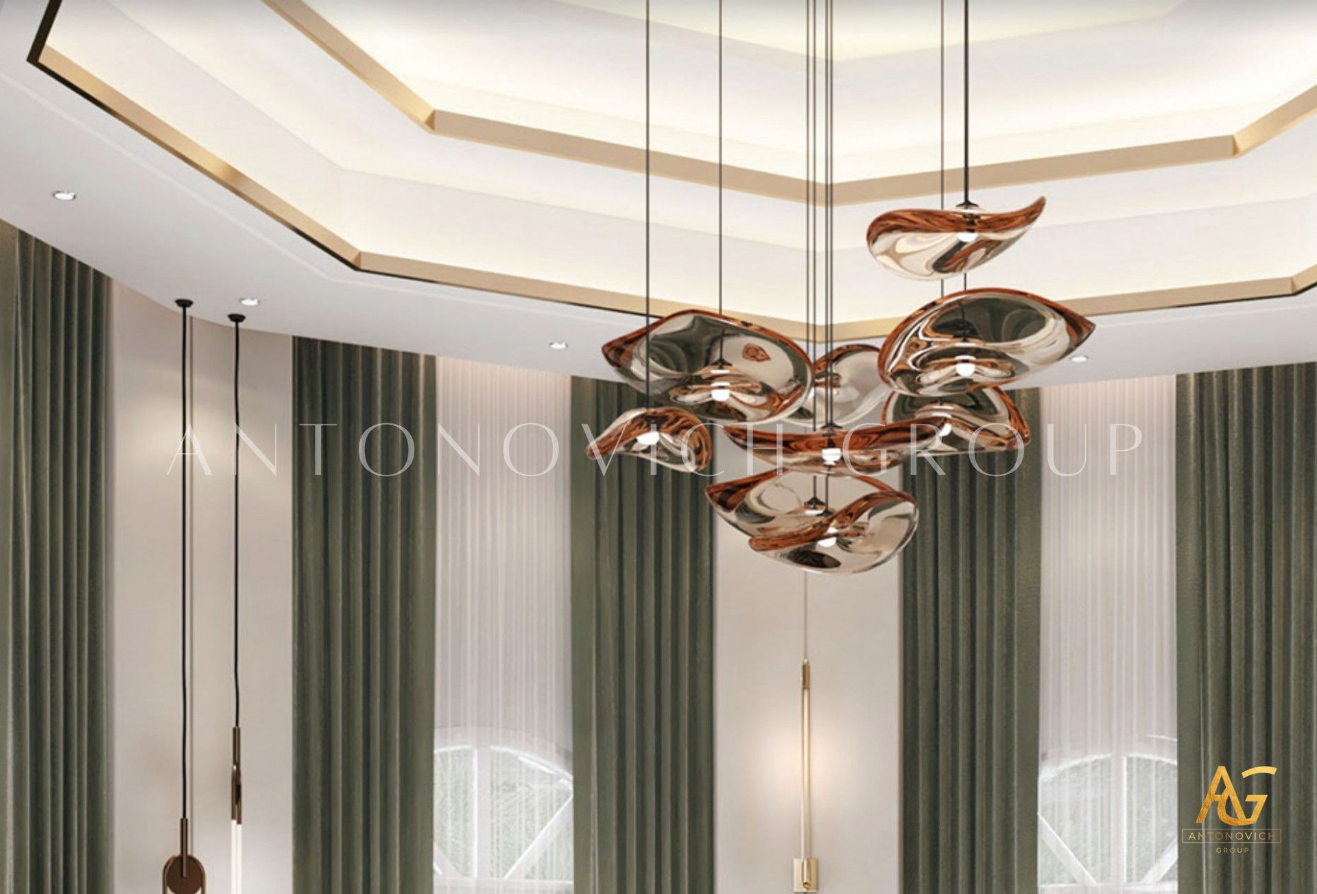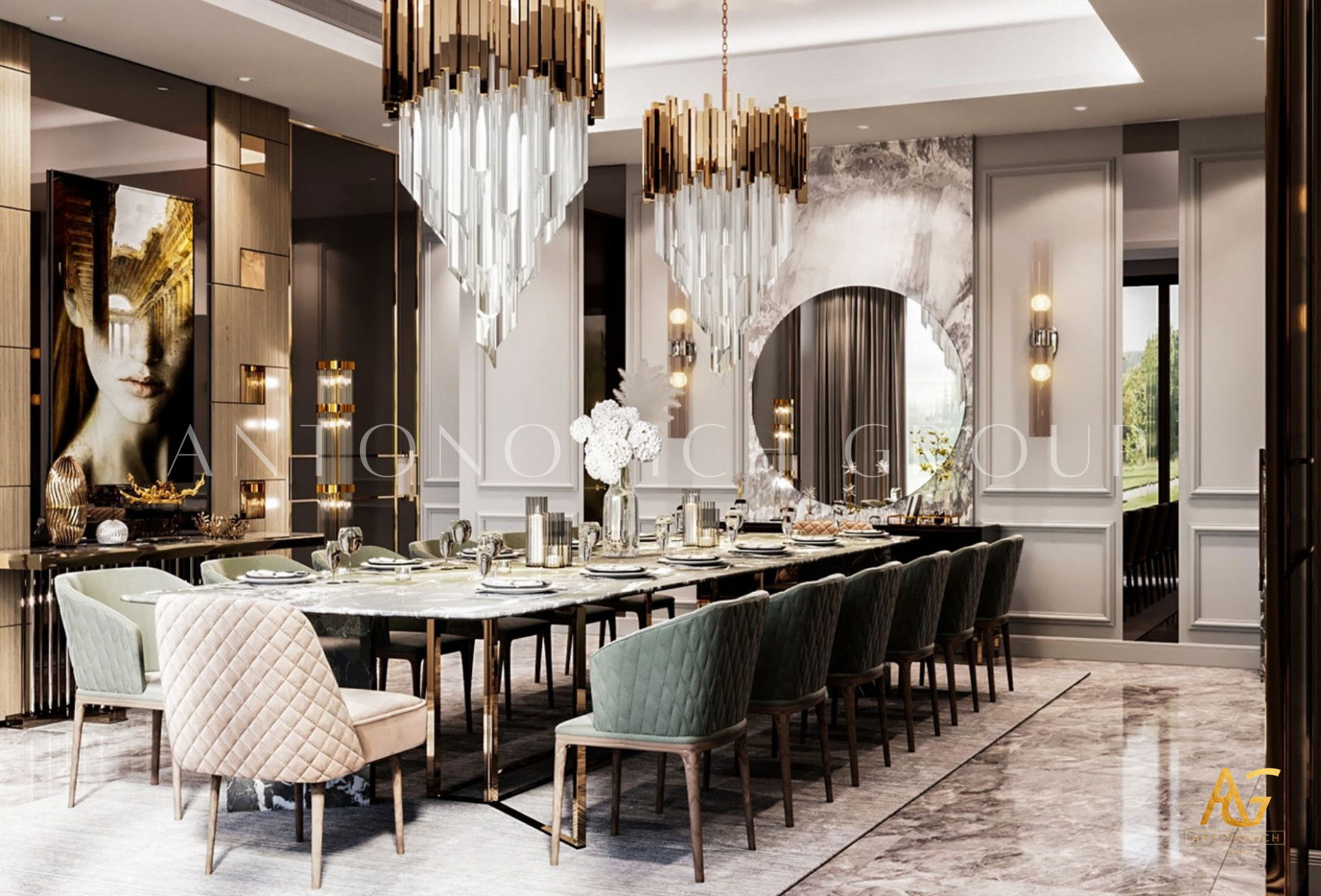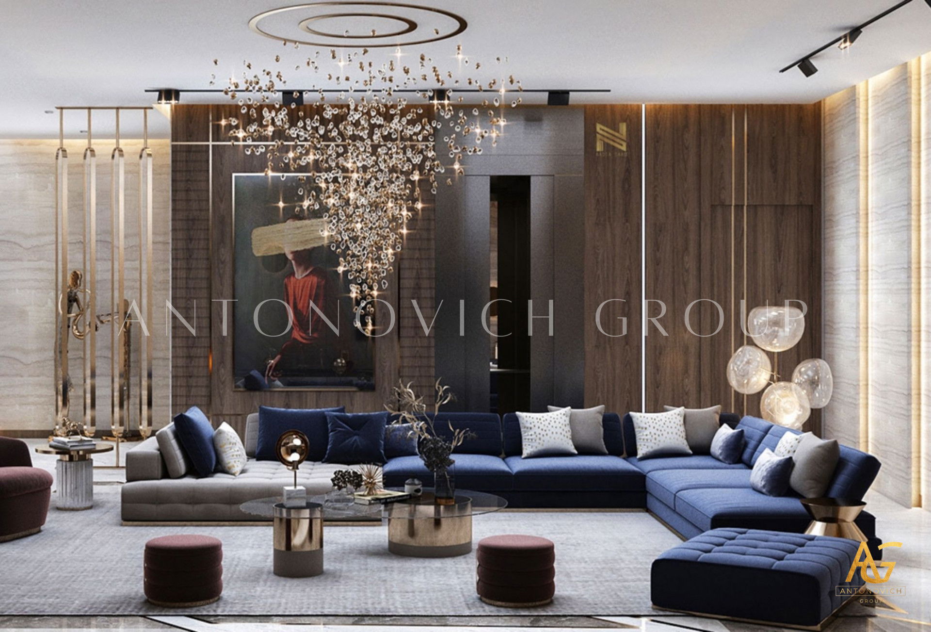 Luxury Antonovich Design created it in a modern style with practical features and bright colors. After the Dubai villa design plans was completed, the customers were pleased with the results. Theyve transformed their bland high-rise into a warm and inviting house thats not just well-designed but also comfy and lavish! The living area is only a few steps away from the large dining room. Because of the tall, big windows, fitting the entire luxury Dubai villa design plans and the kitchen has been wonderful. The luxury home interior design Dubai chose to make things better.