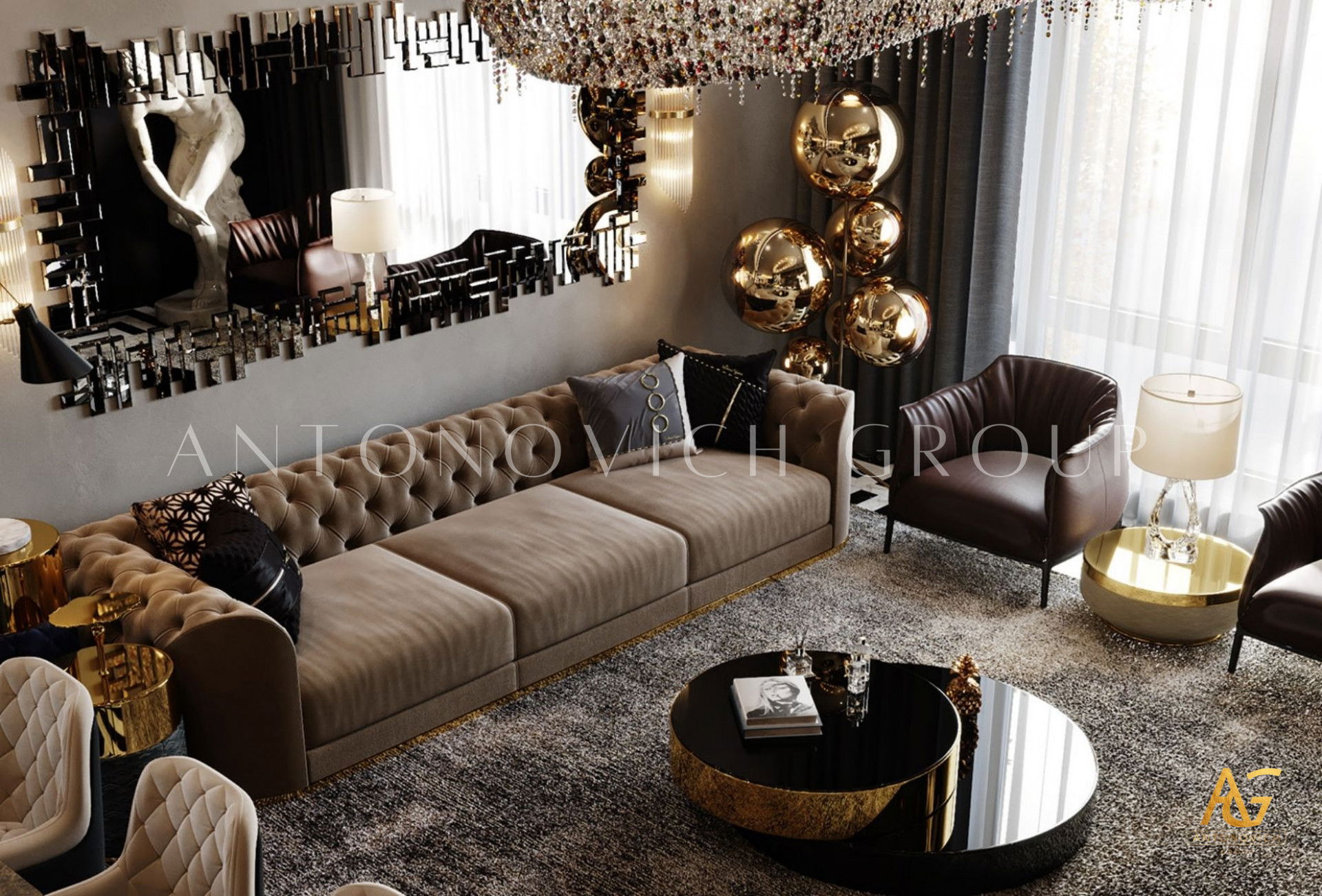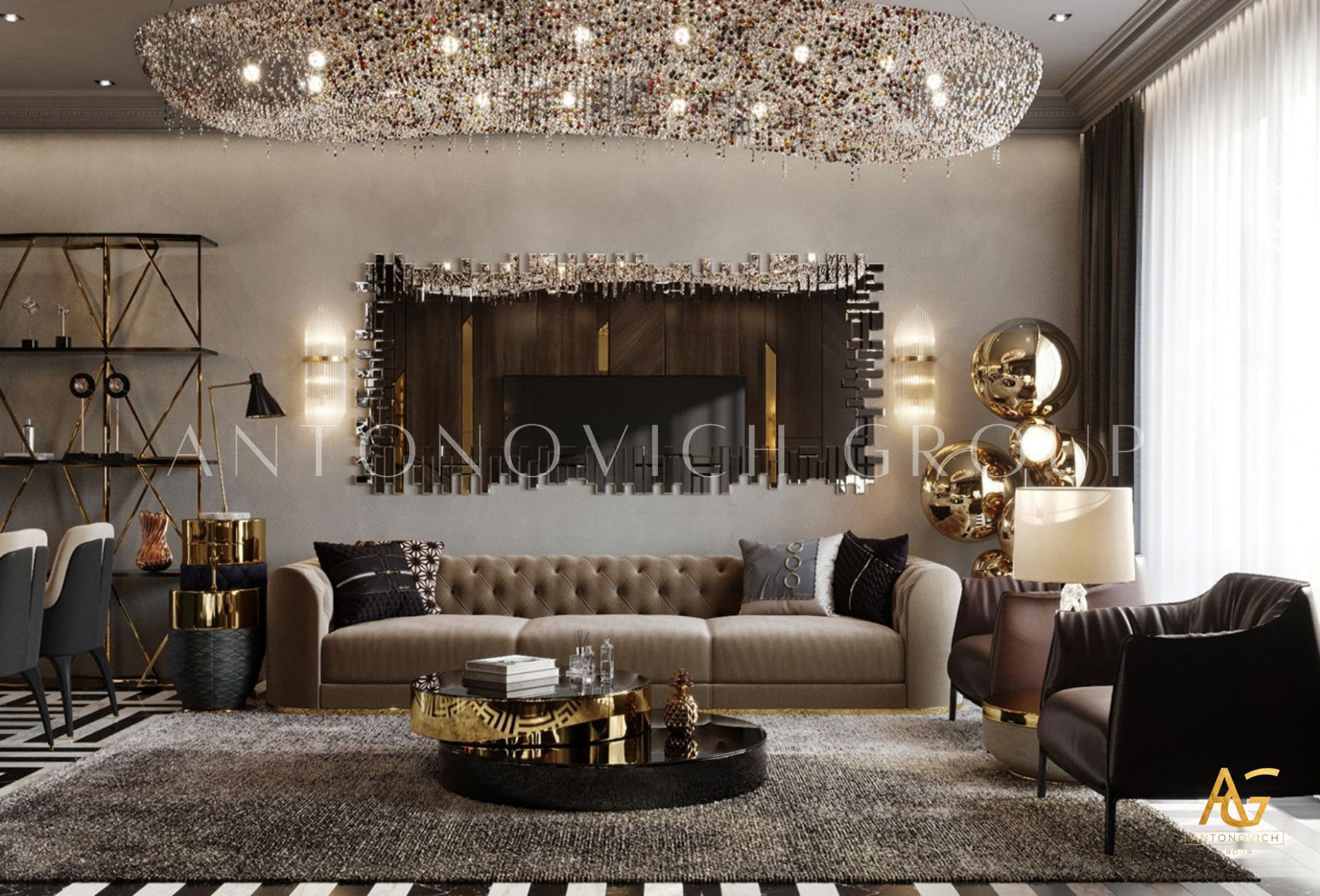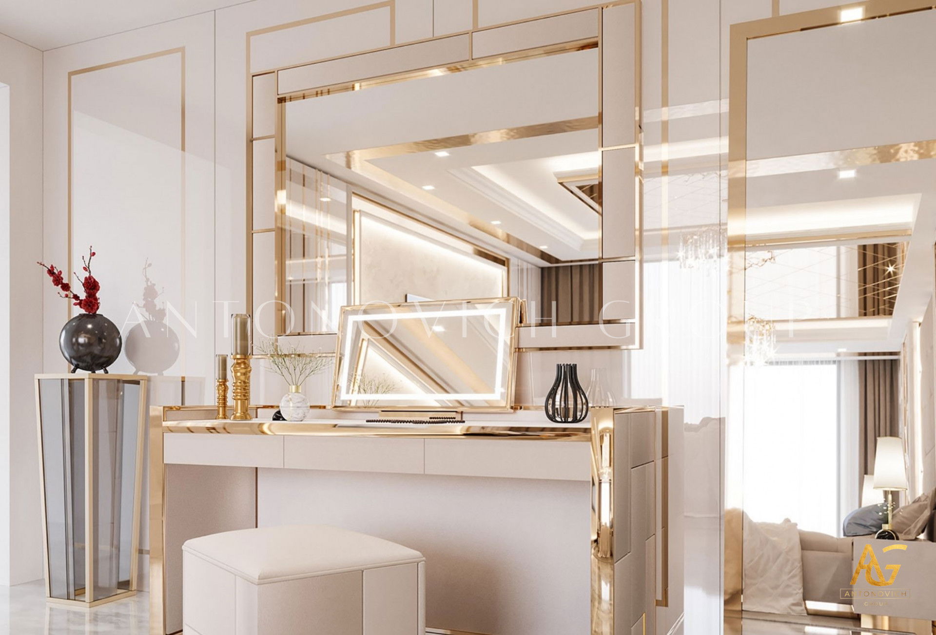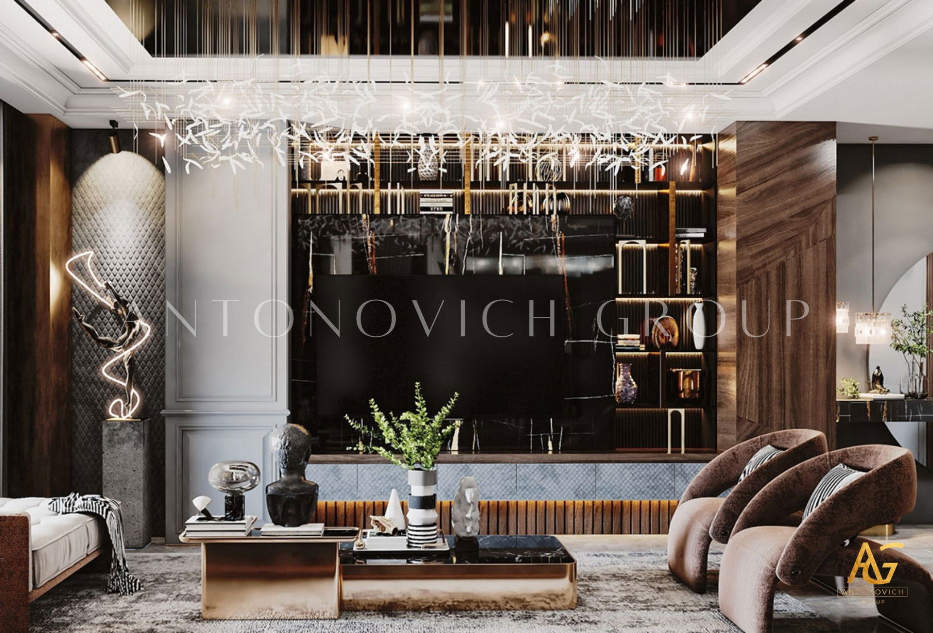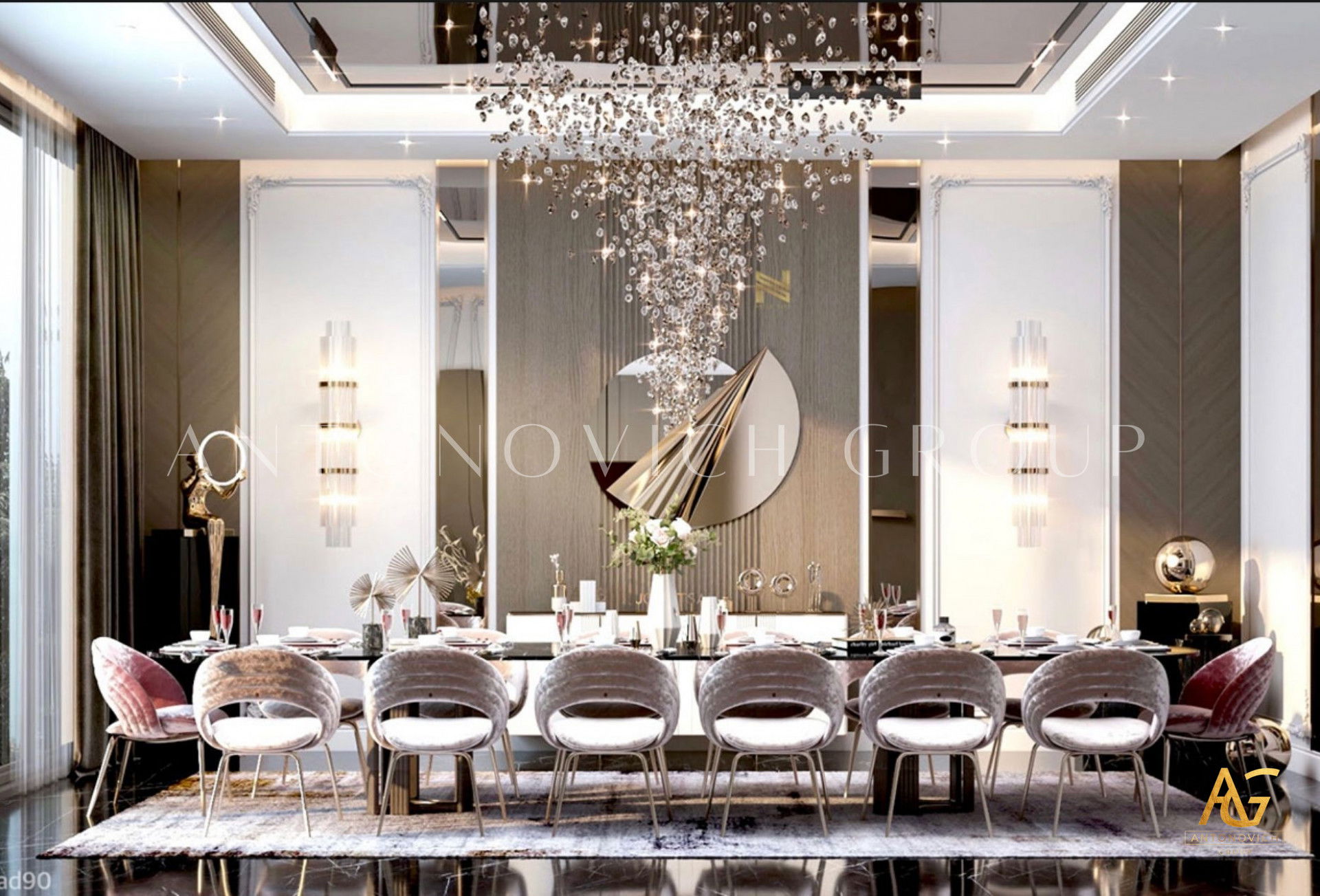 Luxury Antonovich Design created it in a modern style with practical features and bright colors. After the Dubai villa design plans was completed, the customers were pleased with the results. Theyve transformed their bland high-rise into a warm and inviting house thats not just well-designed but also comfy and lavish! The living area is only a few steps away from the large dining room. Because of the tall, big windows, fitting the entire luxury Dubai villa design plans and the kitchen has been wonderful. The luxury home interior design Dubai chose to make things better.