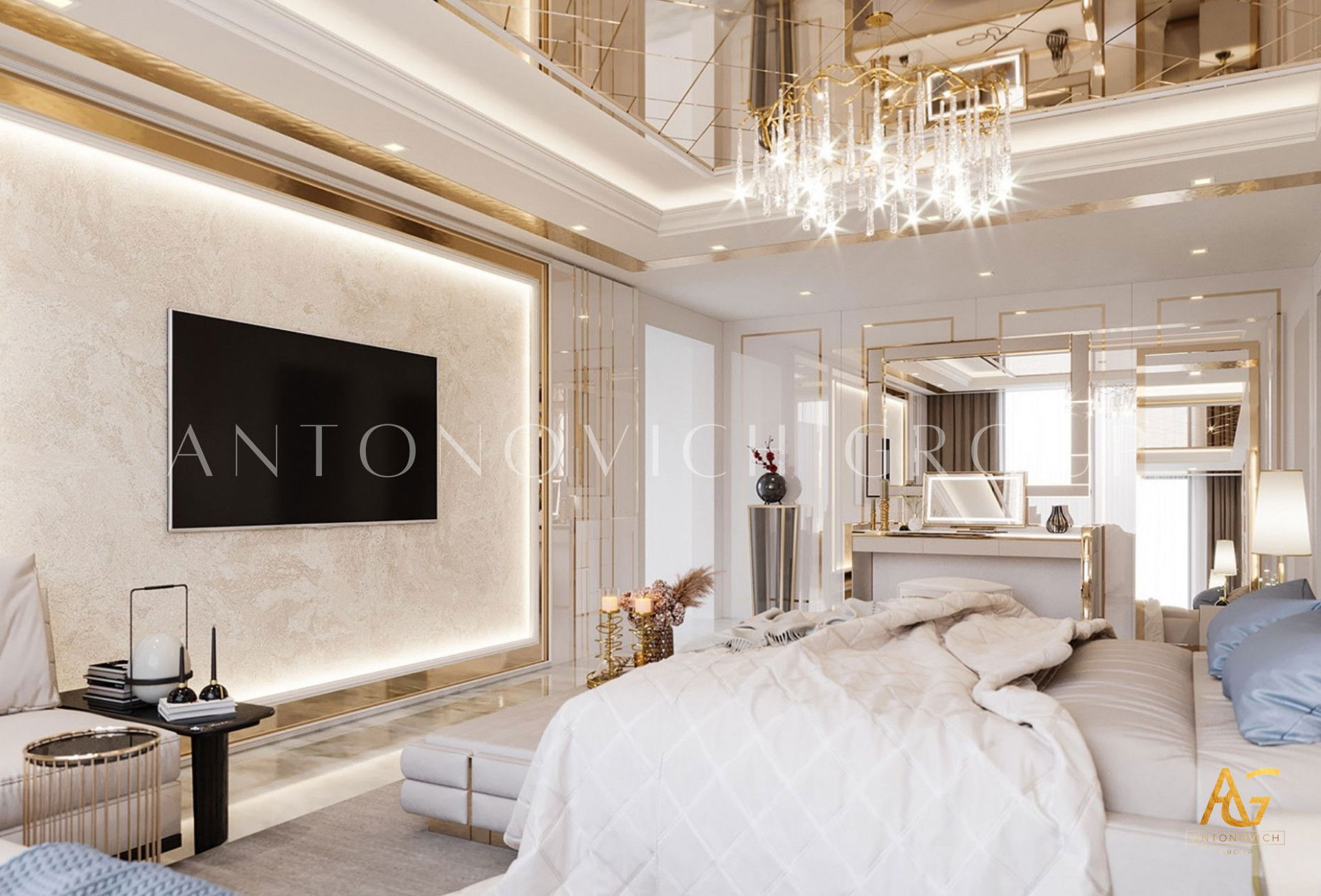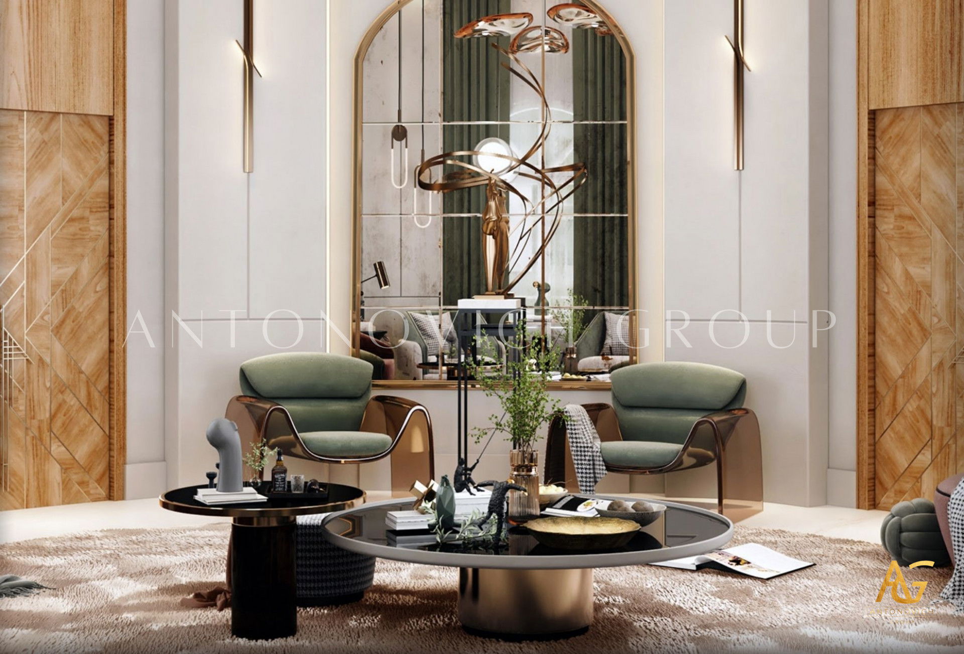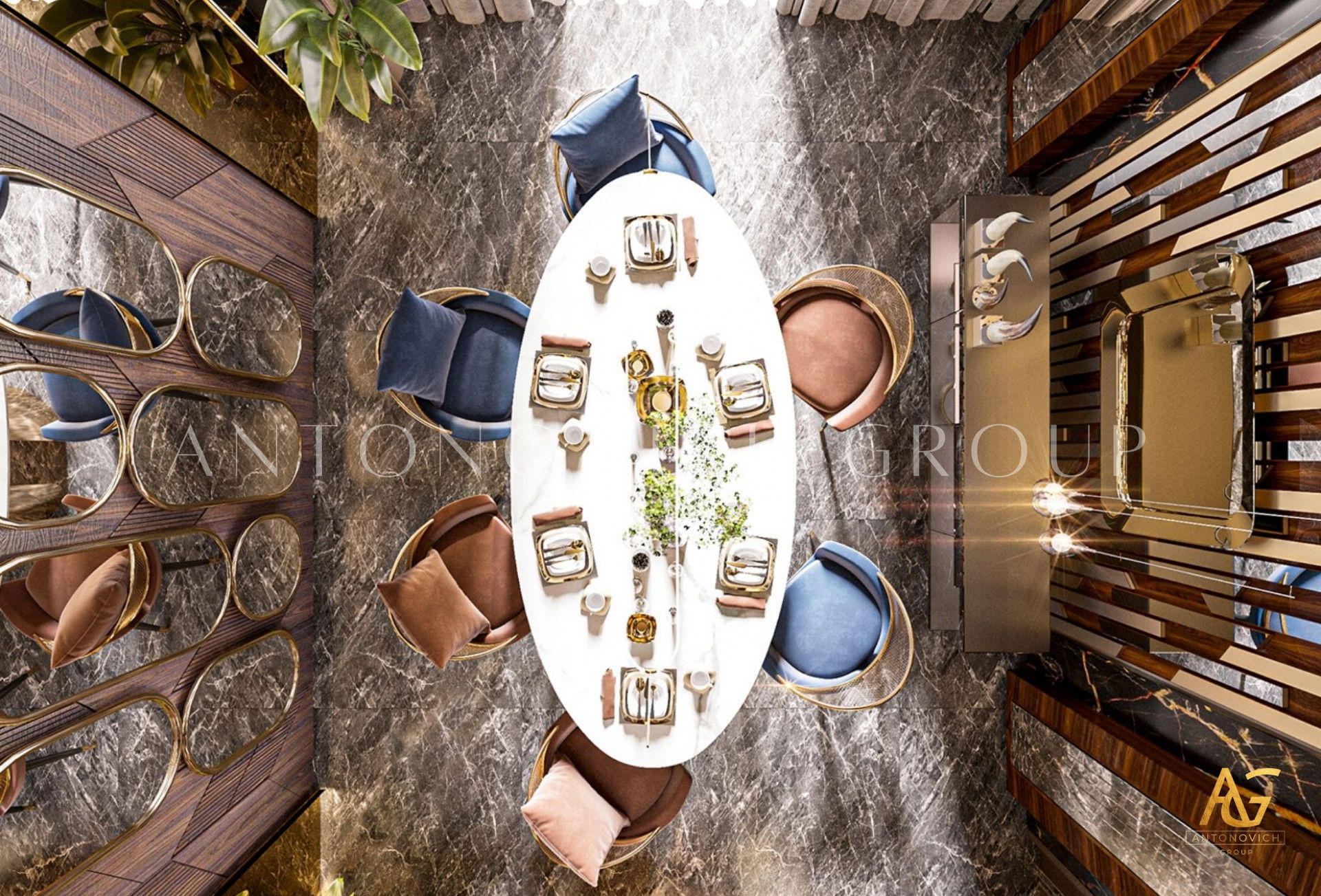 One of the nicest aspects of this luxury Dubai villa design plans is the overlooking high-ceiling. The arrangement is fantastic, as you can see from the second story. To complete the overall wonderful atmosphere of the luxury Dubai villa design plans, stunning furniture designs, beautiful accents, and high-quality materials were employed. Everything was put together to create a sumptuous atmosphere that is really stunning. In the completion of this luxury Dubai villa design plans, Luxury Antonovich Design examined two things: defining the overall aesthetic of the space and determining the primary places for furniture arrangement.