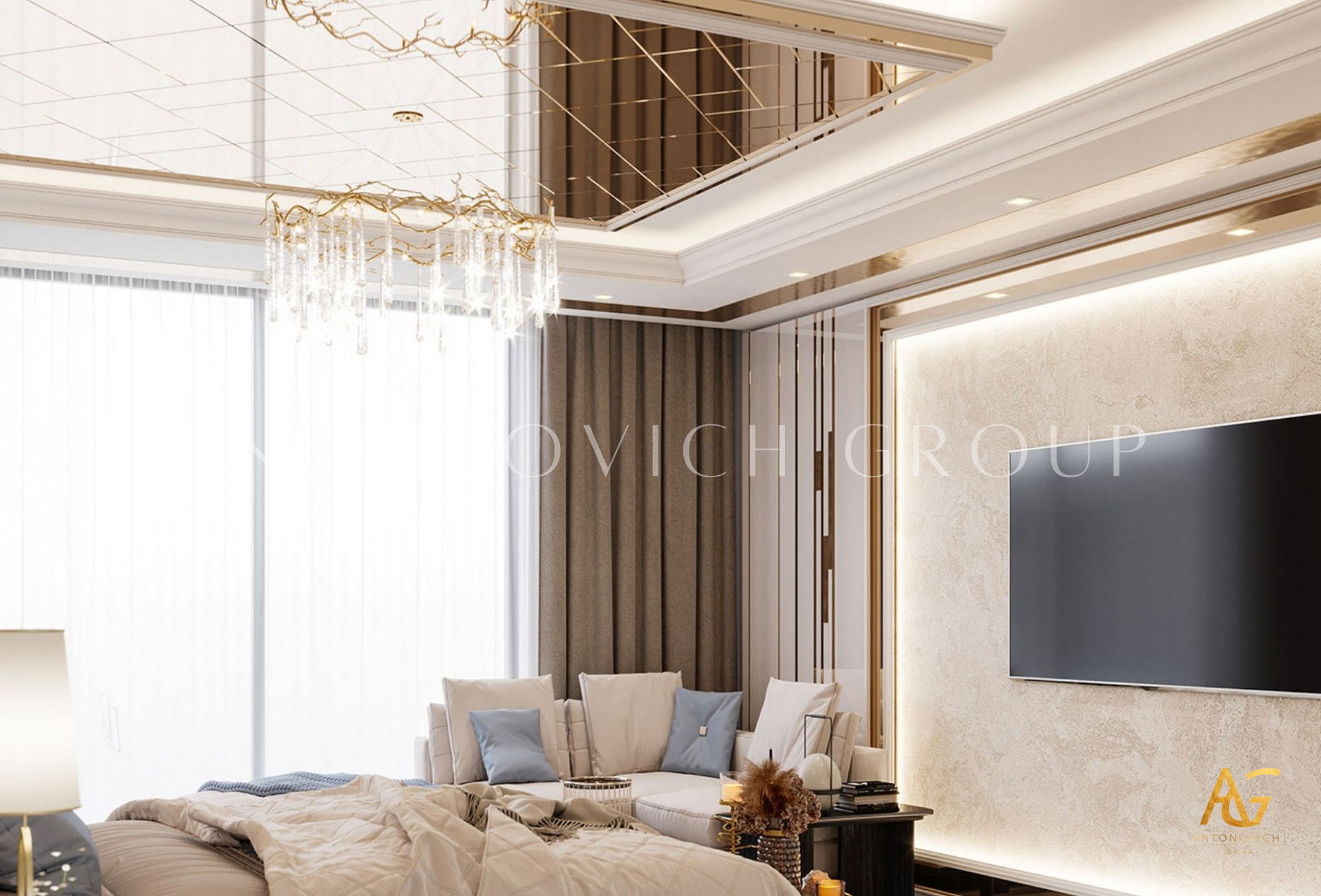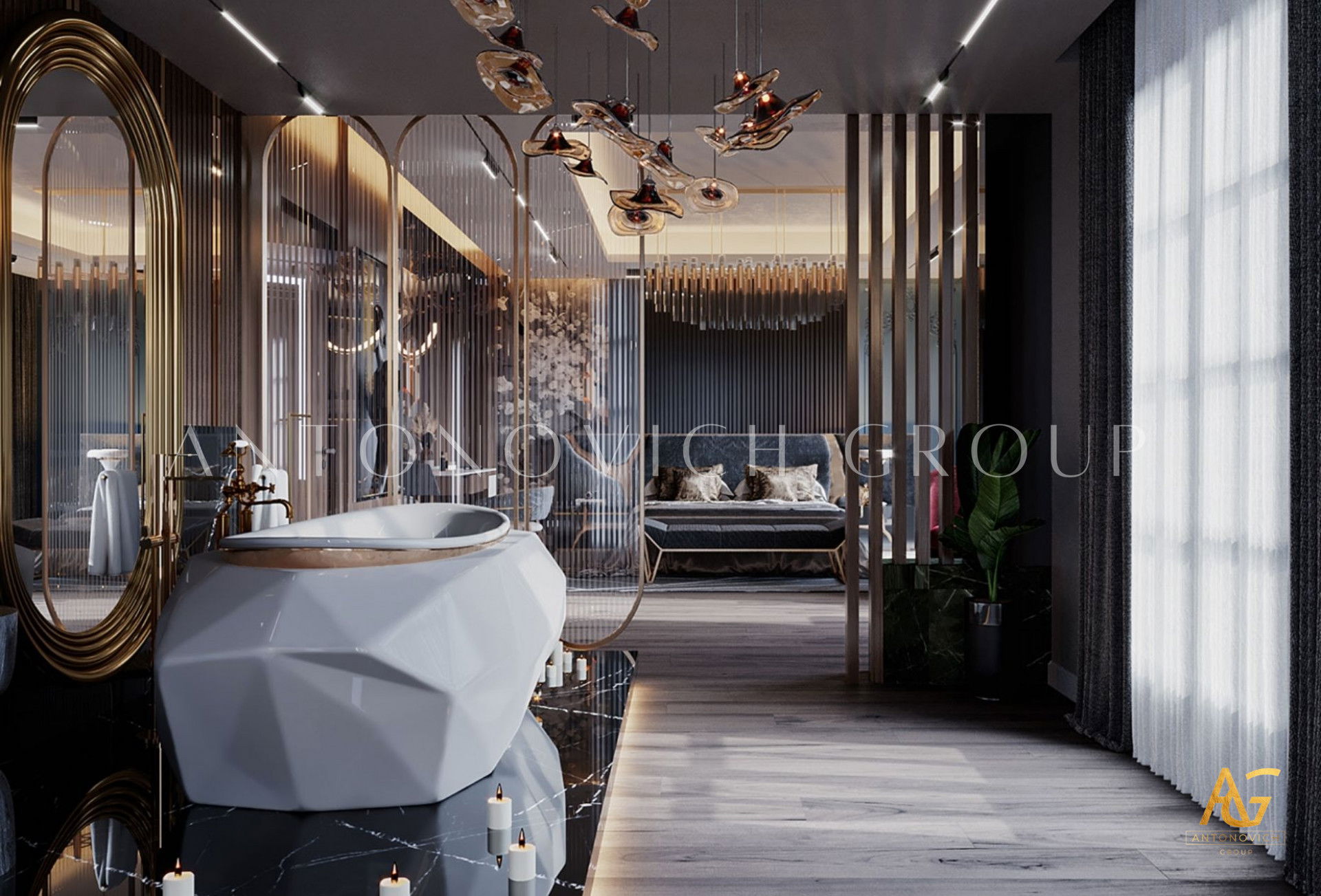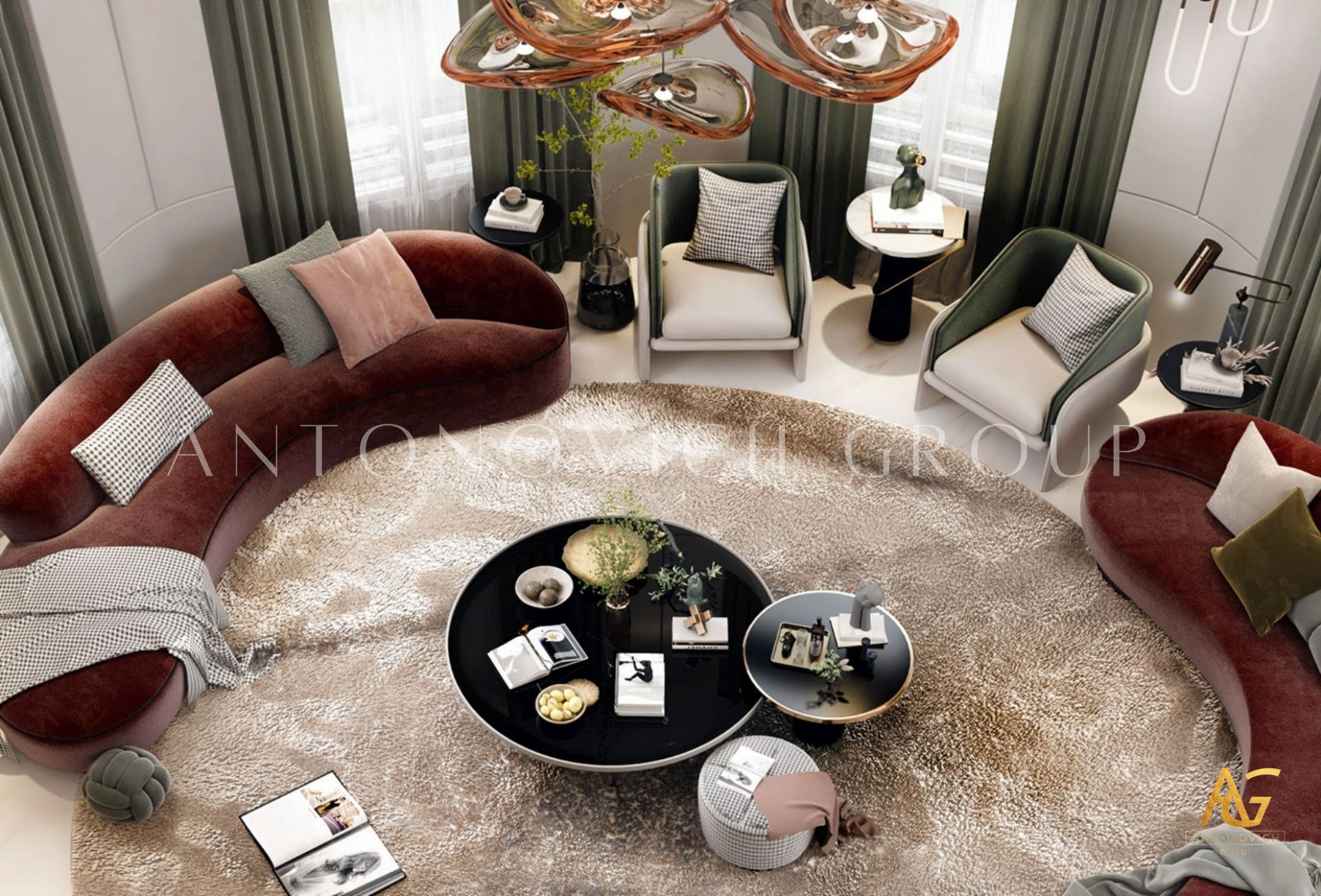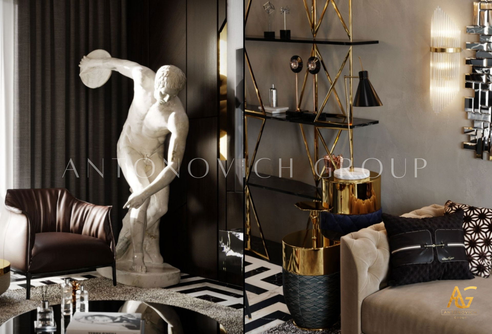 One of the nicest aspects of this luxury Dubai villa design plans is the overlooking high-ceiling. The arrangement is fantastic, as you can see from the second story. To complete the overall wonderful atmosphere of the luxury Dubai villa design plans, stunning furniture designs, beautiful accents, and high-quality materials were employed. Everything was put together to create a sumptuous atmosphere that is really stunning. In the completion of this luxury Dubai villa design plans, Luxury Antonovich Design examined two things: defining the overall aesthetic of the space and determining the primary places for furniture arrangement.
