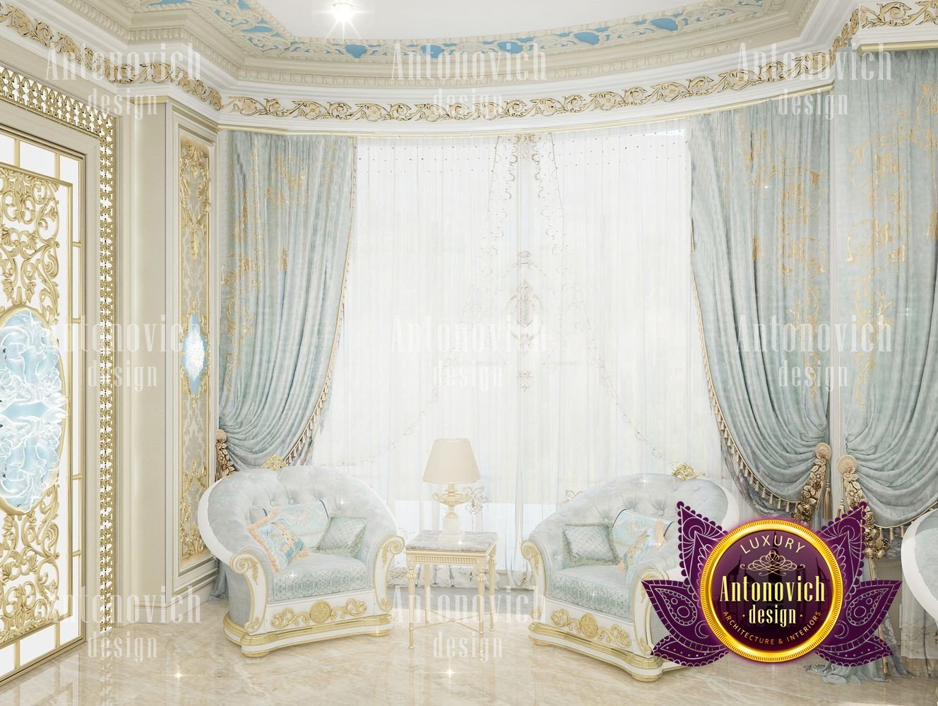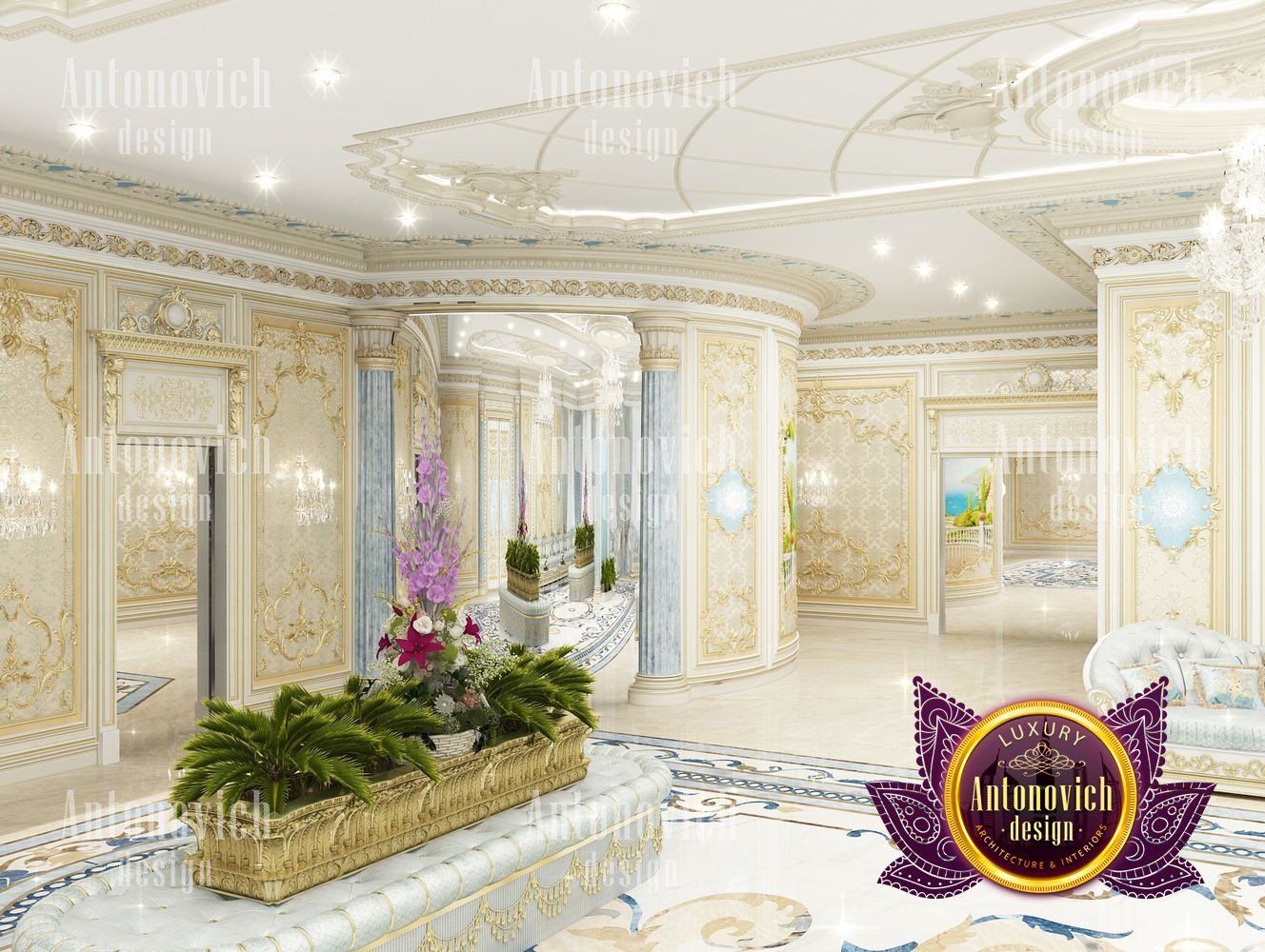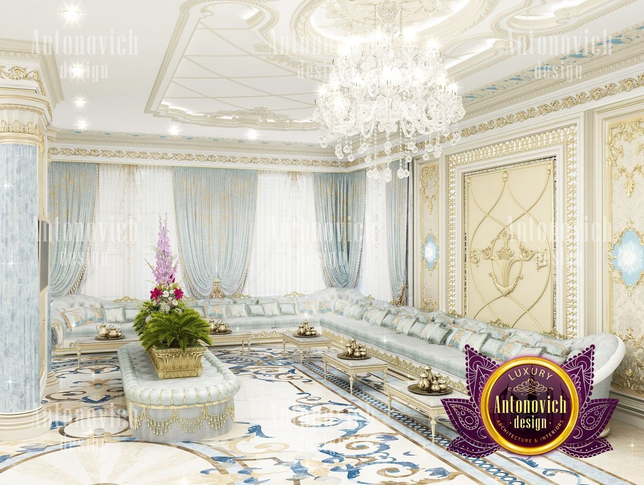 It can be repeated indefinitely that the living room is the most important room in the house. But these are not just words. It is here that all the main events in the house take place. Here welcoming guests. In this room whole family gathers. And the designers task is to create the most comfortable and thus aesthetically beautiful atmosphere. The interior design of this living room was designed for one of the elite apartments in Dubai UAE. The classical style became the basis of the project, and the Luxury Antonovich Design studios designers made it individual and exclusive. The complexity of the problem consisted in the fact that space is relatively small, and the owner of the apartment wanted to get the full set of necessary attributes of an aristocratic house. The authors of the project very successfully selected the color scheme and furniture for the interior of the living room. The biggest part of space is occupied by the dining zone which is located at the window. This is the best way to demonstrate the hospitality and friendliness of the owners of the house. A beautiful table made of natural wood, painted in milky white, is surrounded by soft chairs with a noble bearing. The chairs are upholstered in luxurious textiles with printed damask patterns. And their delicate outlines of the backs give the interior a refined and elegant charm. A large window is covered with translucent tulle of milky shade. They are framed by chic curtains made of silk velvet in lilac tones. Special attention deserves the decor of the walls in the interior of the living room. Here wood paneling is filled with beautiful silk wallpaper. They are complemented by exquisite sconces and art paintings with special illumination. Every detail in the interior makes sense and its philosophical significance. green landscape design, gypsum decor design, gypsum interior decorators uae, hall interior design ideas
