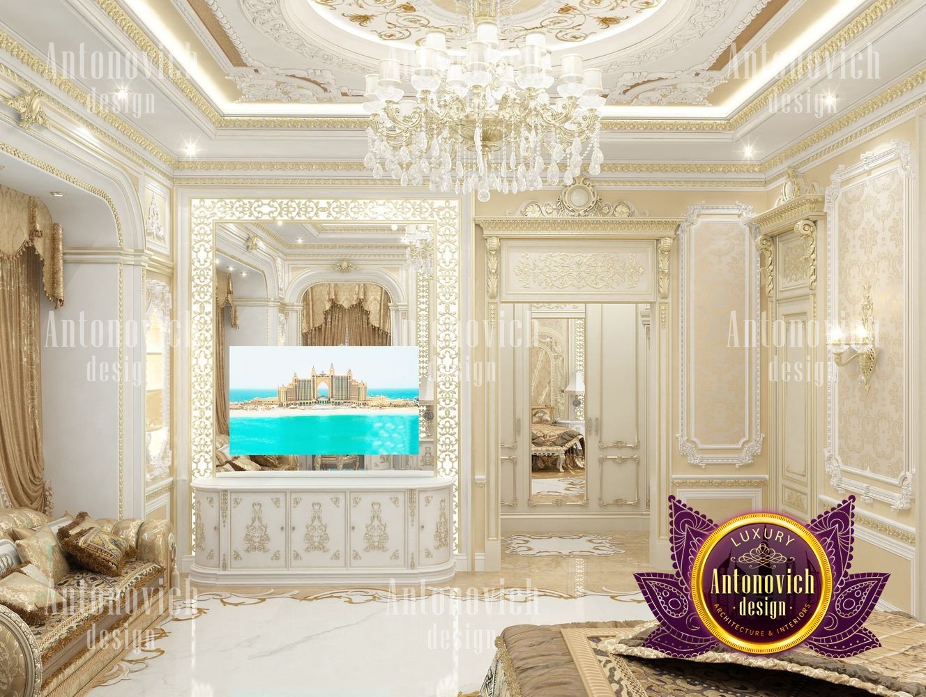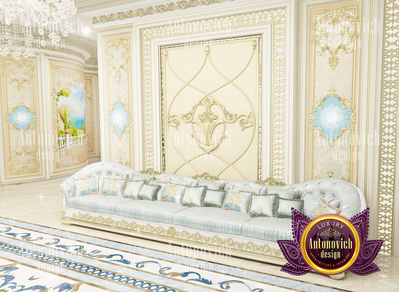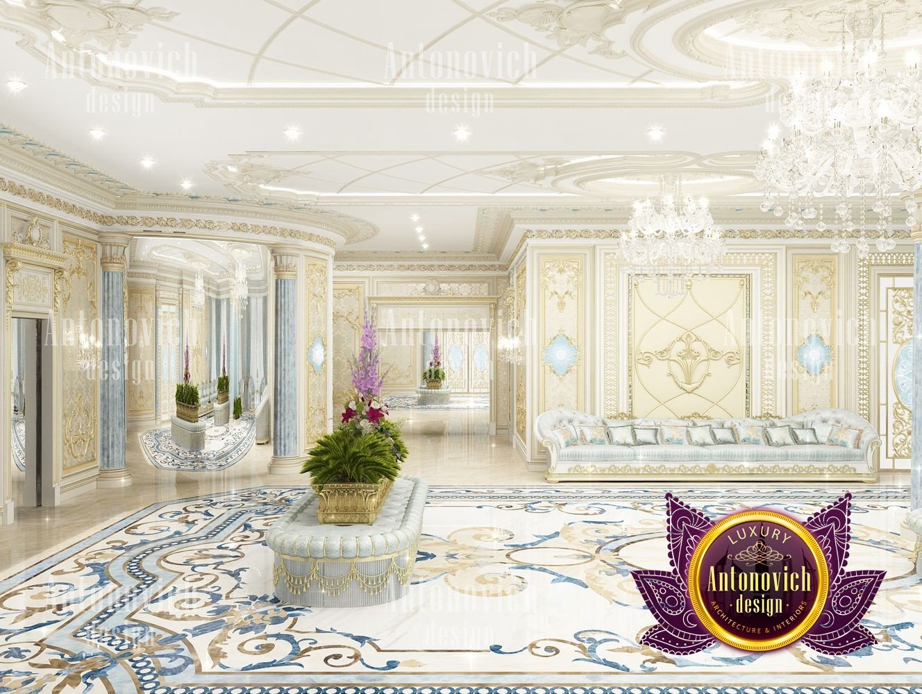 It can be repeated indefinitely that the living room is the most important room in the house. But these are not just words. It is here that all the main events in the house take place. Here welcoming guests. In this room whole family gathers. And the designers task is to create the most comfortable and thus aesthetically beautiful atmosphere. The interior design of this living room was designed for one of the elite apartments in Dubai UAE. The classical style became the basis of the project, and the Luxury Antonovich Design studios designers made it individual and exclusive. The complexity of the problem consisted in the fact that space is relatively small, and the owner of the apartment wanted to get the full set of necessary attributes of an aristocratic house. The authors of the project very successfully selected the color scheme and furniture for the interior of the living room. The biggest part of space is occupied by the dining zone which is located at the window. This is the best way to demonstrate the hospitality and friendliness of the owners of the house. A beautiful table made of natural wood, painted in milky white, is surrounded by soft chairs with a noble bearing. The chairs are upholstered in luxurious textiles with printed damask patterns. And their delicate outlines of the backs give the interior a refined and elegant charm. A large window is covered with translucent tulle of milky shade. They are framed by chic curtains made of silk velvet in lilac tones. Special attention deserves the decor of the walls in the interior of the living room. Here wood paneling is filled with beautiful silk wallpaper. They are complemented by exquisite sconces and art paintings with special illumination. Every detail in the interior makes sense and its philosophical significance. green landscape design, gypsum decor design, gypsum interior decorators uae, hall interior design ideas