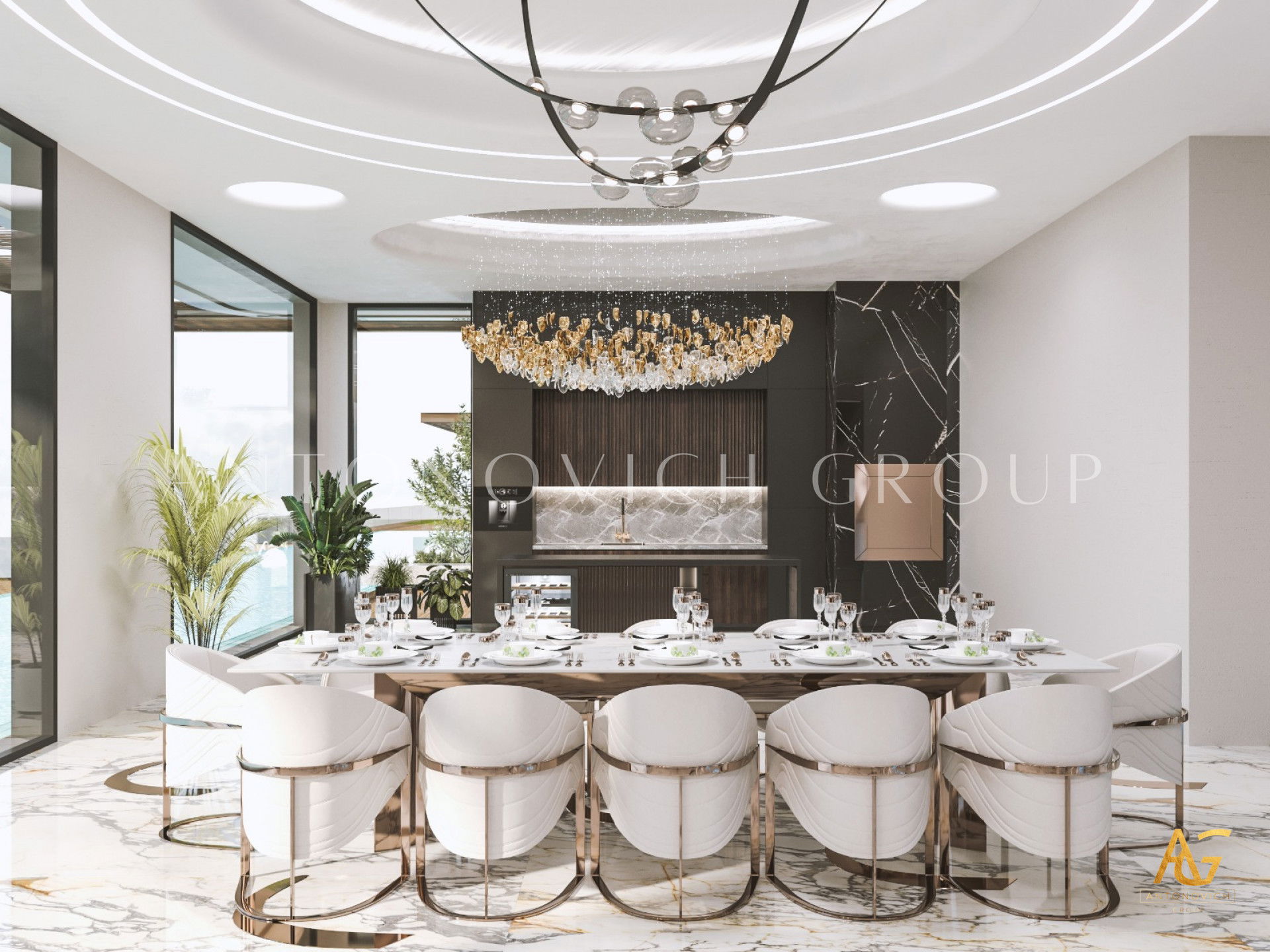 The dining area is not just a place for meals; it's a stage for culinary experiences. Antonovich Group curates a setting where every dining occasion becomes an affair to remember, surrounded by luxurious aesthetics.