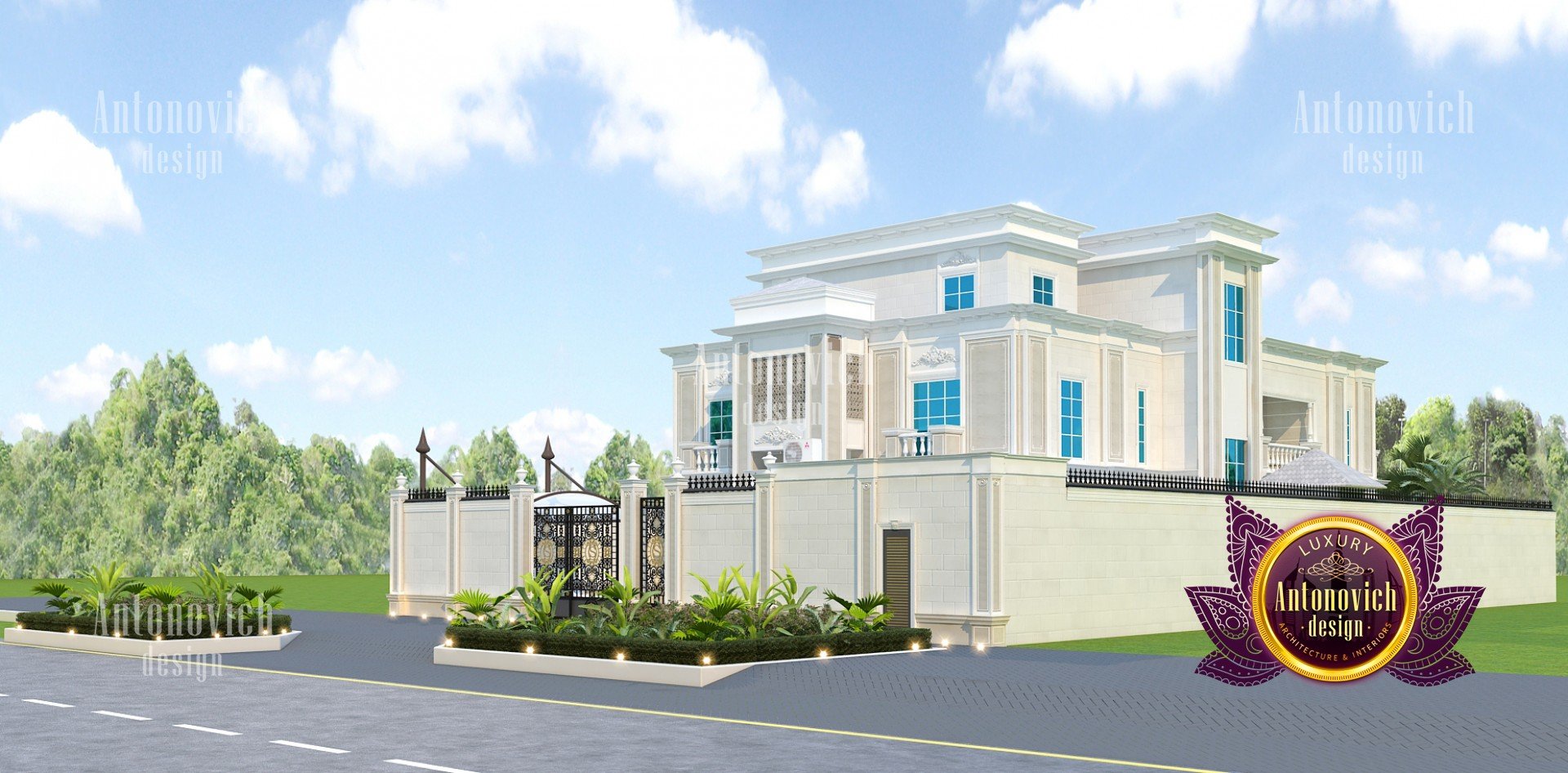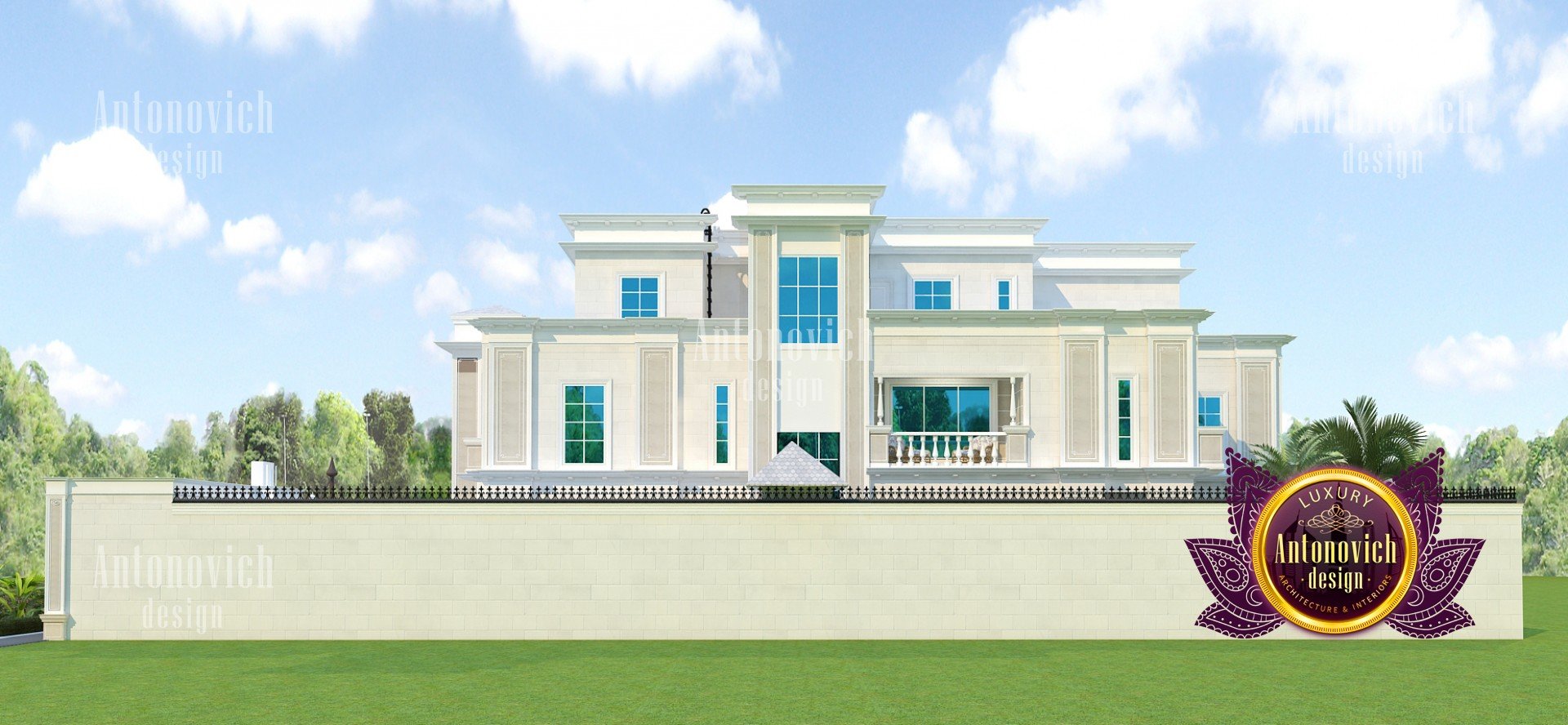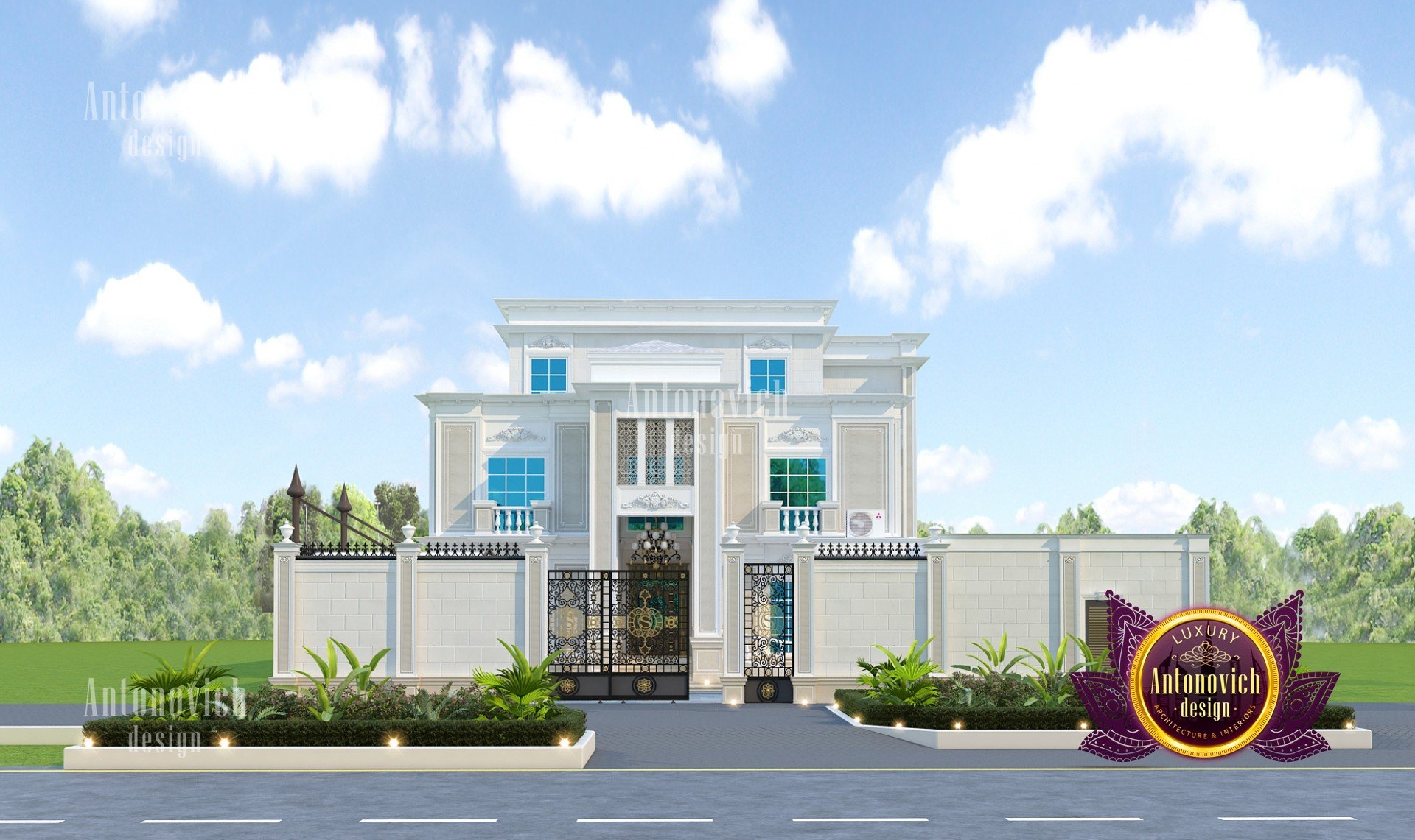 The facade design of the house primarily reflects the high status of its owner, the refined taste, and understanding of the beautiful. Architects of the studio Luxury Antonovich Design developing authors projects of elite villas use all directions of design. The facade design of the house becomes one with the landscape design, as well as with the house interior. And work on the external appearance of the building is an important part of the project of the house. The facade design, like any other design direction, is influenced by styles and fashion trends. In this project, the modern classic acquired unique beauty features, thanks to ingenious authors solutions of interior designers and architects Dubai UAE. The facade of the house is very expressive and magnificent. The exquisite elements of the building decor and the delightful play of light and shade contributes to this. Large windows visually make the building more light and graceful. A pleasant light hue of noble materials harmoniously combines with the surrounding landscape design. The smooth roof of the building along the entire perimeter is outlined by a low multileveled cornice. These decor elements are ideally in harmony with the fencing of the territory. The central gate is decorated with openwork forging. The design of the building facade is harmoniously interconnected with landscape design. Exquisite bas-reliefs, pilasters and decorative wrought-iron balconies add extravagance to the building facade. The elegant and stylish facade of the house serves as a perfect prelude to the interior story, which tells about the interior of the respectable and luxurious house.