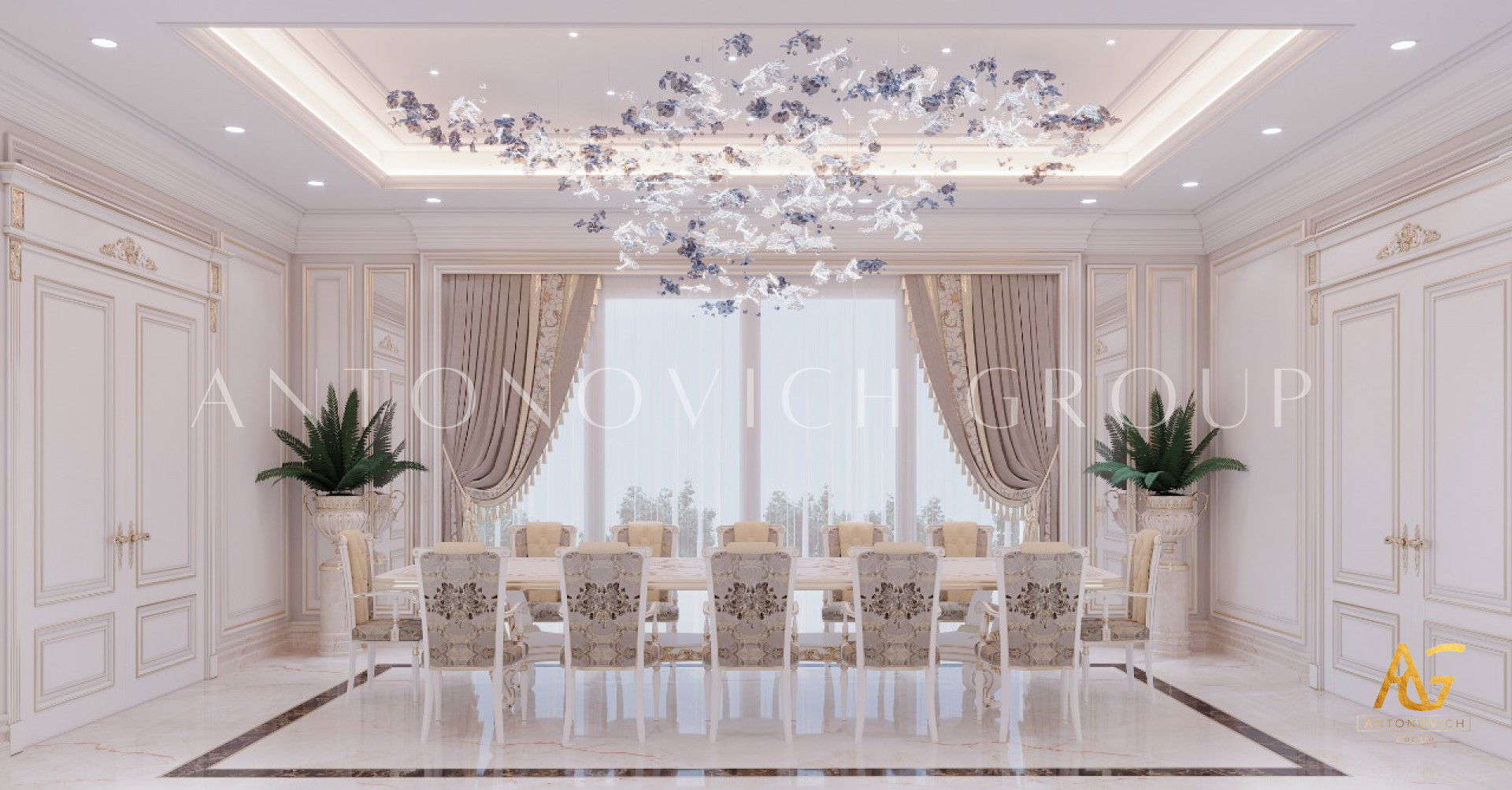 لا يمكن إنكار النهج الحديث والأنيق لتصميم غرفة الطعام في مثل هذه الغرفة الجميلة ذات النوافذ. تحتل المواد الطبيعية والنغمات الصامتة مركز الصدارة هنا ، مما يعكس صدى المناظر الطبيعية خارج النافذة ويمنح المساحة إحساسًا بالهدوء والدفء والترحيب بدلاً من الانسداد. يعد تصميم غرفة الطعام هذا مثالًا على كيفية تحقيق مزاج عصري أنيق. هنا ، بدلاً من مجموعة الكراسي التقليدية ، يتم استخدام مقعد طويل مع وسائد مزخرفة على جانب واحد. يمكن أن يكون تصميم غرفة الطعام هو النقطة المحورية في الحياة الأسرية ، خاصة إذا كان المطبخ الصغير يفتقر إلى مساحة لطاولة وكراسي. تنقسم تصاميم غرف الطعام الحديثة إلى فئتين: غرف الطعام المفتوحة وغرف الطعام الرسمية ، والتي تُستخدم للتجمعات العائلية الكبيرة والعطلات والمناسبات الخاصة. هناك خيارات لتزيين غرفة الطعام الرسمية أو غير الرسمية. طاولة طعام واسعة وكراسي مريحة تخلق أجواء رائعة لتناول الطعام والمحادثة. تضفي أواني الطعام العصرية الجميلة أو مجموعات أواني الطعام العتيقة طابعًا وشخصية على تصميم غرفة الطعام. تعد القدرة على توفير الرفاهية للمالكين دون المبالغة في ذلك تحديًا كبيرًا للمساكن الفاخرة. لذلك ، تميل التصميمات الداخلية الرسمية إلى أن تكون ذات أسقف عالية ومضاءة جيدًا مع إضاءة مزاجية وعلوية. قد يكون الأثاث ضئيلًا ، لكنه كبير بما يكفي لاستيعاب تجمعات متواضعة. يوجد دائمًا جدار لهجة يلفت الانتباه بعيدًا عن بقية الغرفة باتجاه نقطة الاتصال الرئيسية. يمكن أن يكون نحتًا أو عملًا فنيًا. لربط غرفة معًا ، يتم دائمًا استخدام ألوان من نفس لوحة الألوان و / أو سجادة ضخمة.