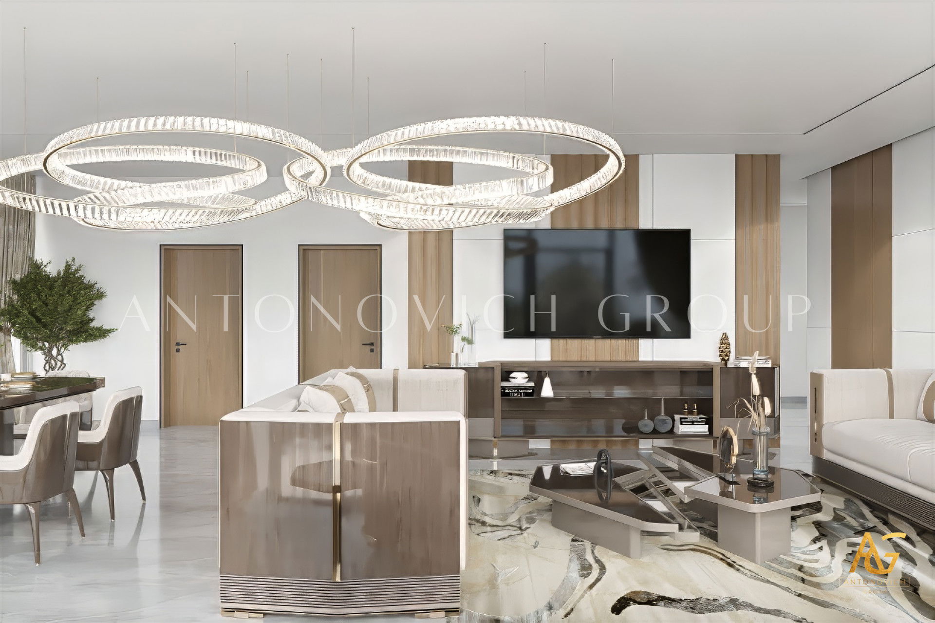 تعتبر علامة مميزة لخبرة مجموعة أنتونوفيتش هي إنشاء أثاث وحلول إضاءة مصممة خصيصًا. يتم إنتاج الأرائك والطاولات القهوة والخزائن المصممة خصيصًا لتتناسب مع حجم وموضوع غرفة المعيشة. تضيف الثريات البارزة وأنظمة الإضاءة المتعددة الأناقة والدفء، مما يحول غرفة المعيشة إلى مساحة وظيفية وجذابة.