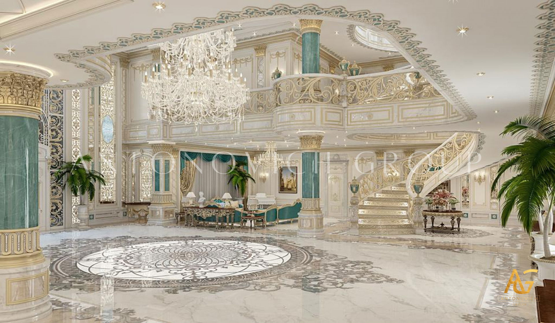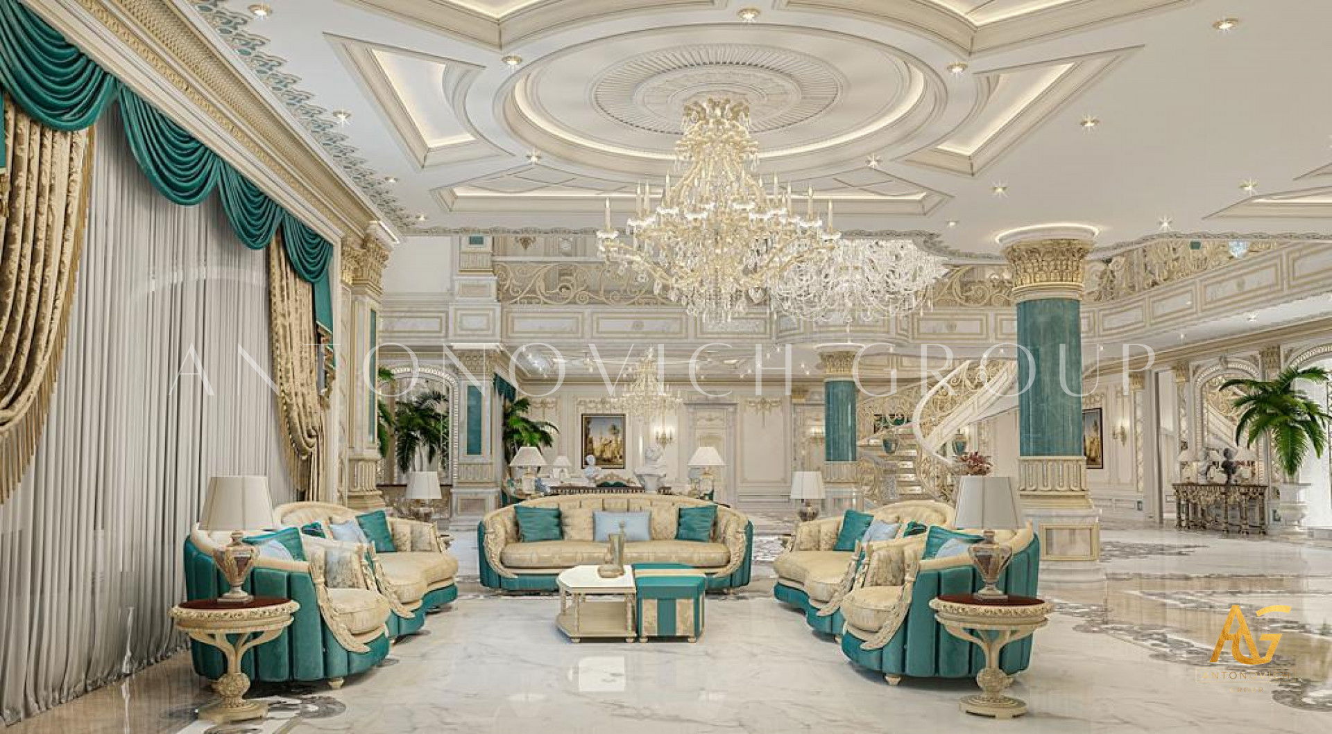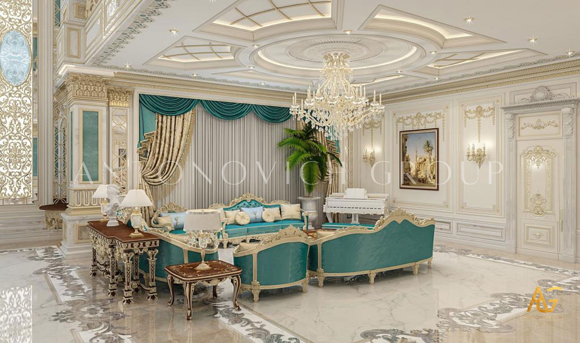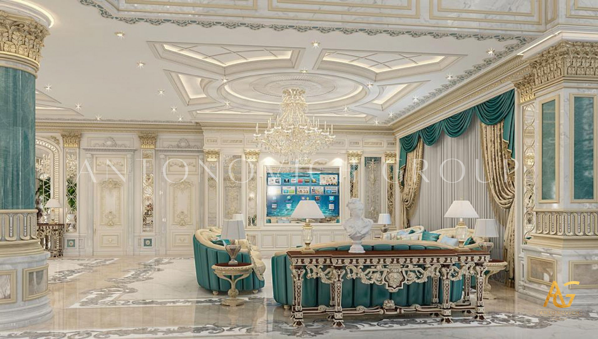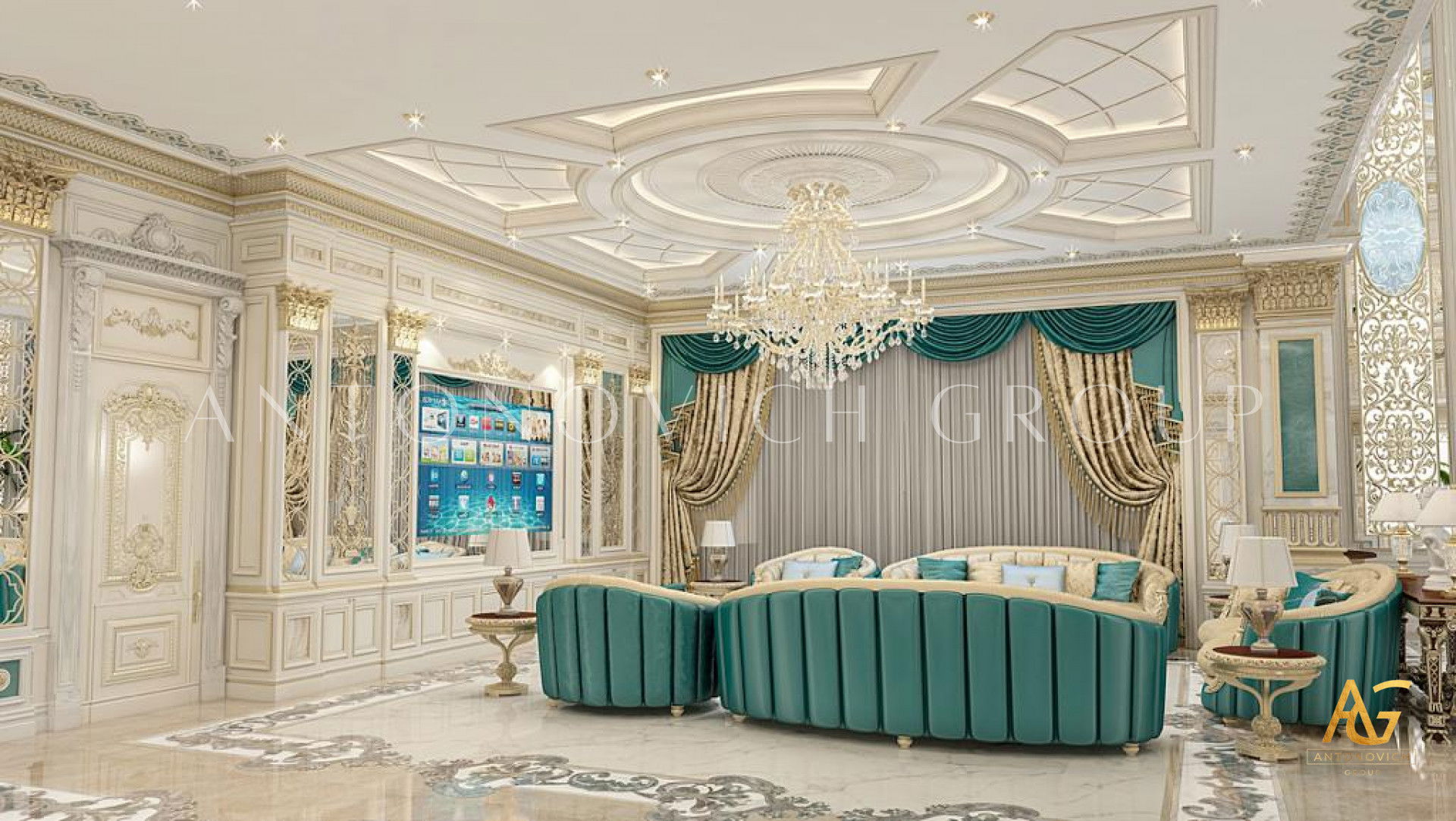 إن إنشاء تصميم داخلي في المملكة العربية السعودية مثل هذا صعب دون مساعدة أفضل مصممي الديكور الداخلي في الرياض. فقد أنتجت لاكشري أنتونوفيتش ديزاين هذا التصميم الداخلي الفاخر في المملكة العربية السعودية بأسلوب احترافي مع أفضل مصممي الديكور الداخلي في الرياض. تداخلات الألوان والأنماط مذهلة، ونظام الألوان السائد هو الأخضر مع الأبيض. لذا تتميز غرفة المعيشة الفخمة هذه بتصميم رائج لمدة طويلة . ويساهم الأثاث الرائع والفاخر بشكل كبير في اعطاء أجواء الفخامة الحديثة. ان التصميم الداخلي لغرفة المعيشة الفاخرة هو مثالي لمنازل الرياض.