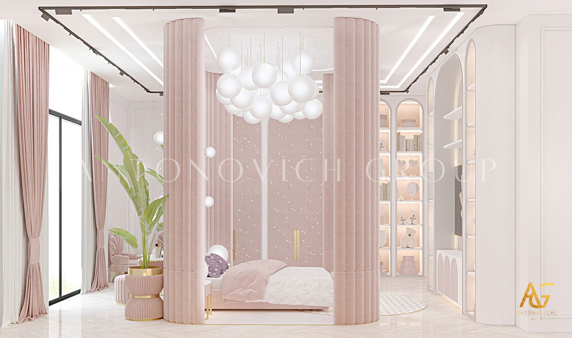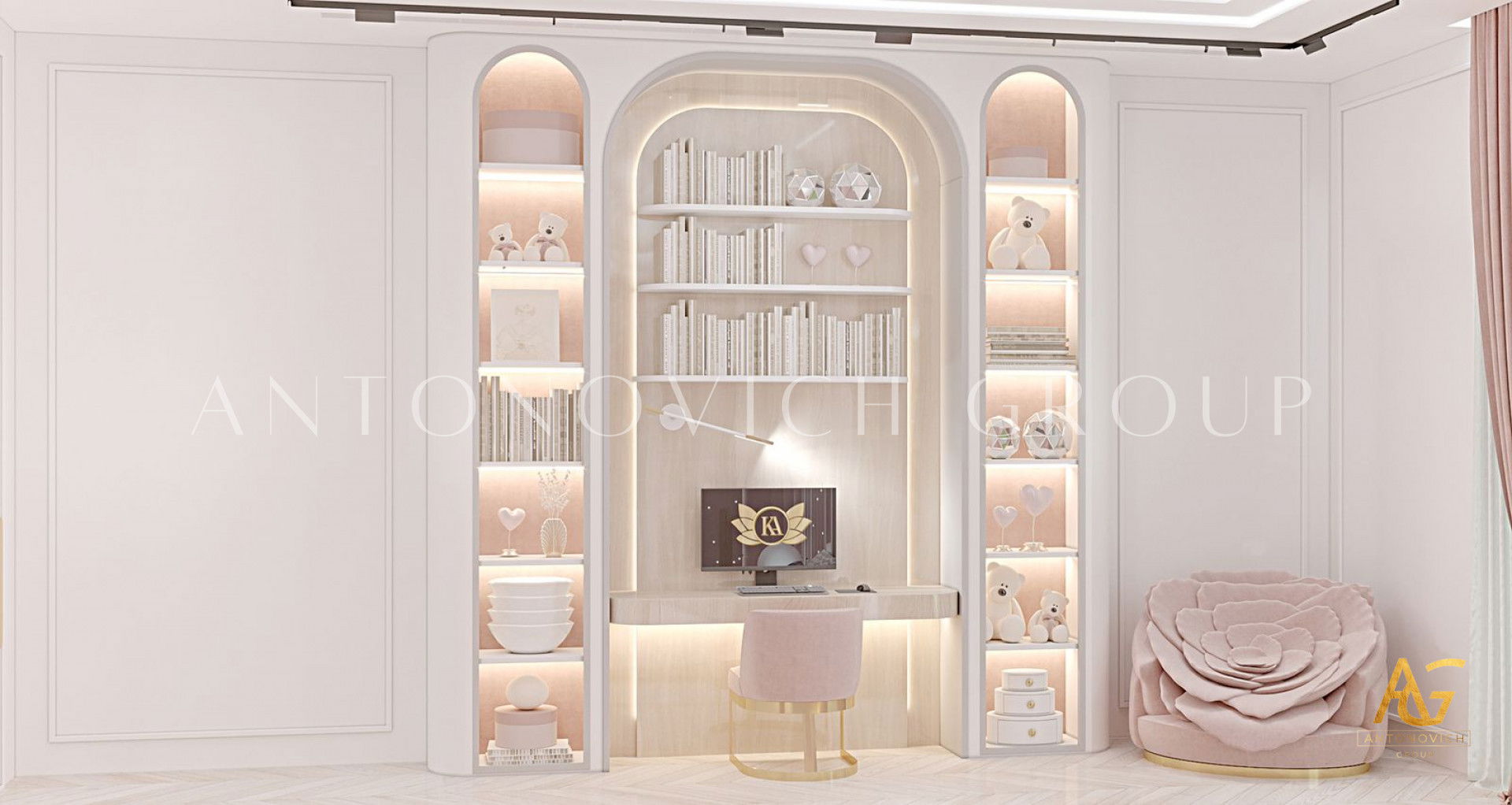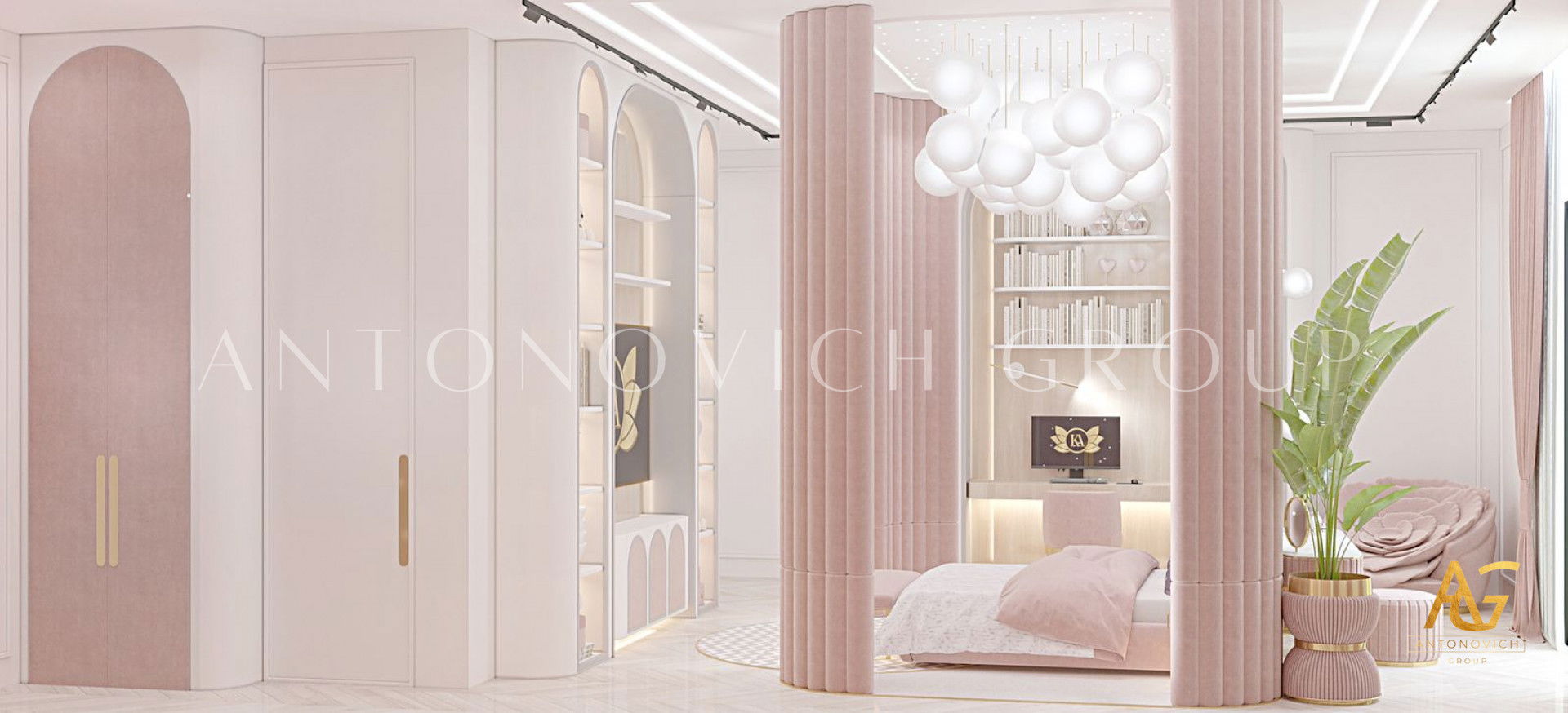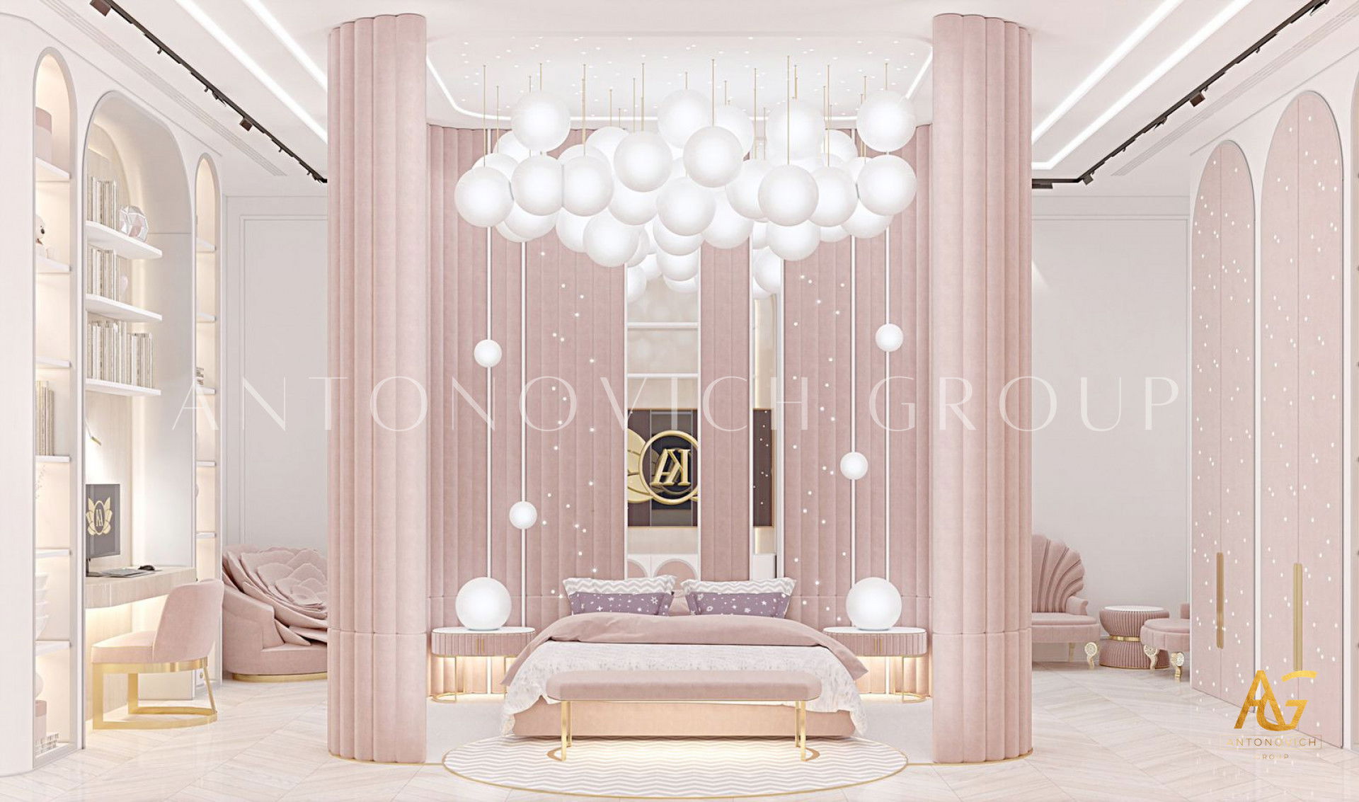 ان أفضل من يقوم بالتصميمات الداخلية العصرية هم بلا شك لاكشري انتونوفيتش ديزاين. هذه الغرفة الوردية هي بلا شك أفضل تصميم لغرفة نوم فاخرة من قبل أفضل مصممي الديكور الداخلي في الرياض. وتتميز الغرفة بأجواء الإضاءة الحديثة العصرية المتميزة. وبالطبع فان الغرض منه هو عرض غرفة نوم أنثوية تناسب سيدة أو فتاة. ان الوردي والأبيض ، وكذلك الرمادي الجميل ، كلها ألوان متكاملة وعصرية. تساهم الديكورات أيضًا في الشعور العصري بالتصميم الداخلي لغرفة النوم الفاخرة ، والذي تم إنشاؤه بواسطة واحدة من أكبر شركات التصميم الداخلي في المملكة العربية السعودية.