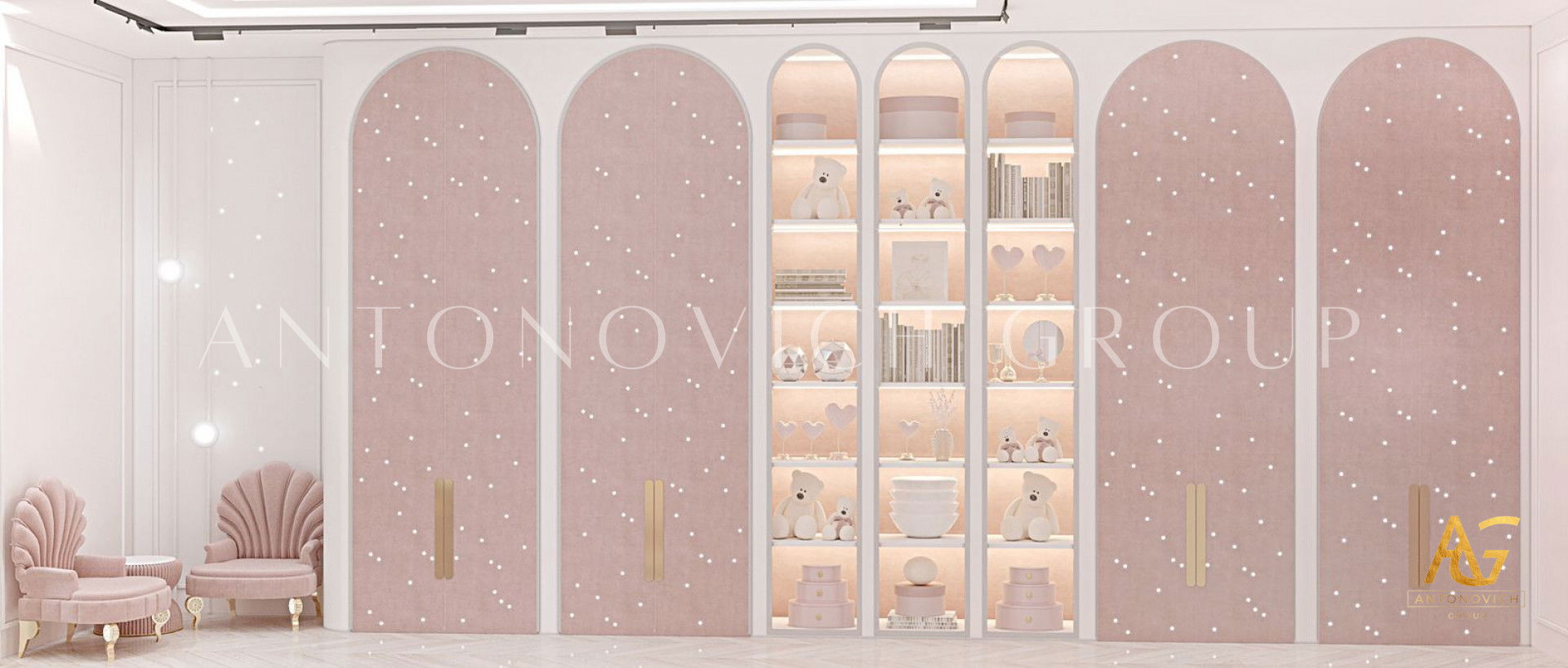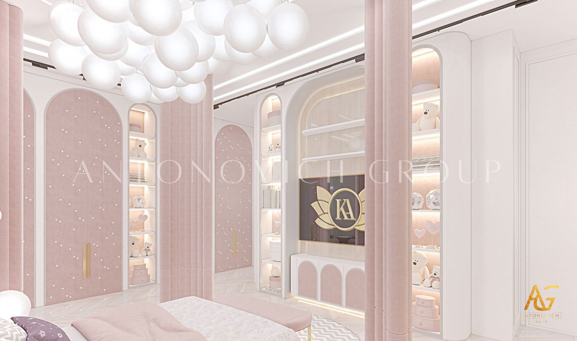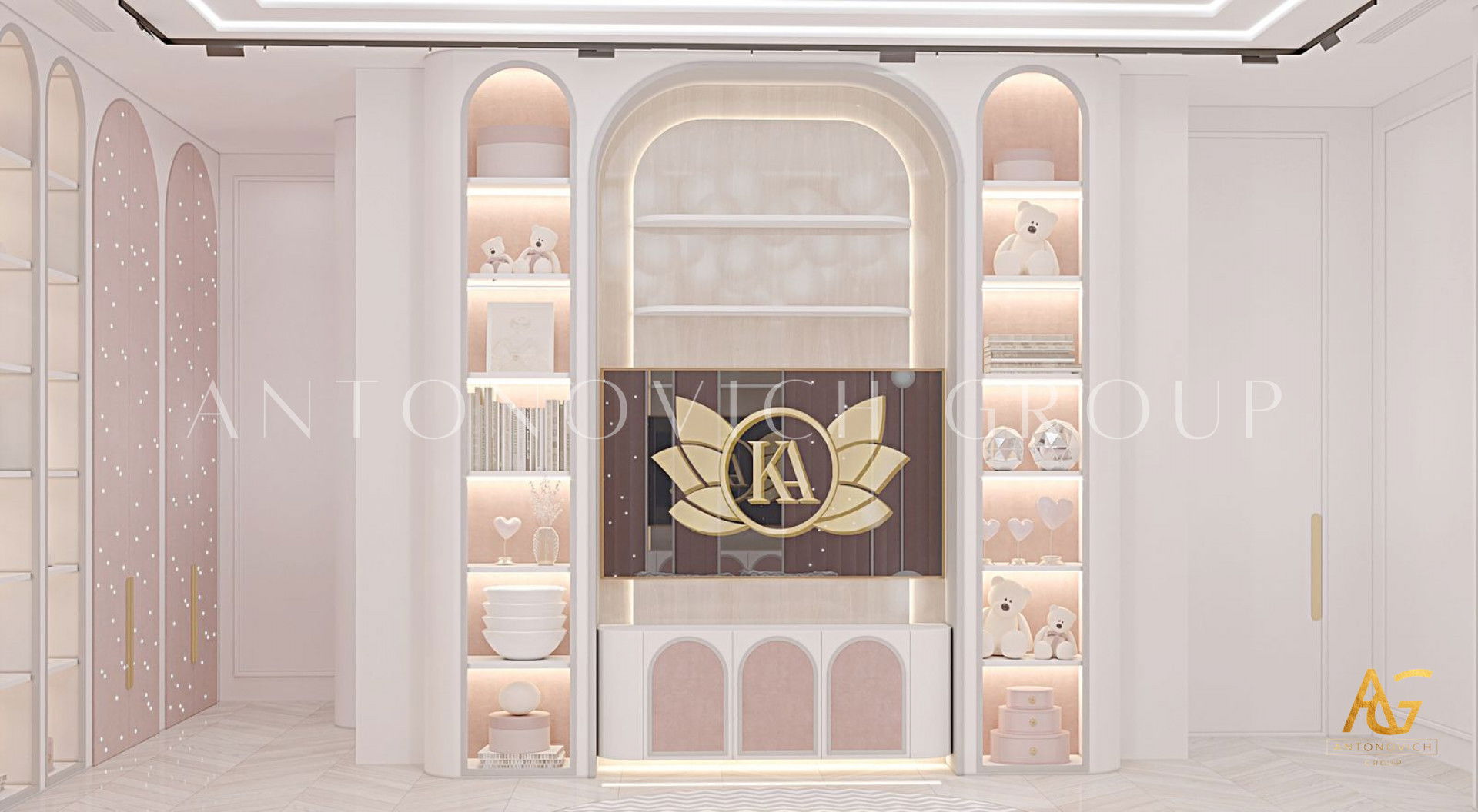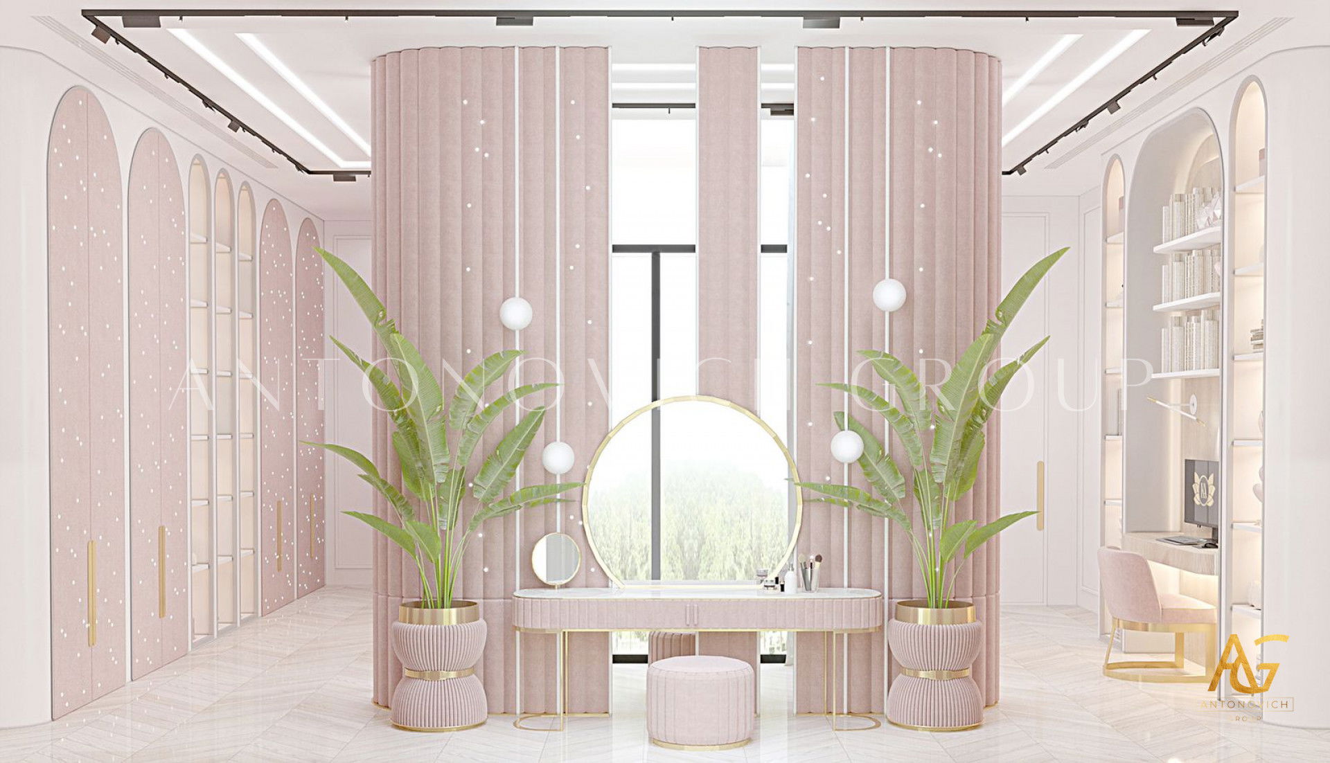 أحد أكثر الجوانب التي تجذب الانتباه وتخطف الانظار في هذا التصميم الداخلي الحديث في السعودية هو المزيج الرائع بين اللون الوردي والأبيض والإضاءة المناسبة. حيث يعد اللون الوردي في الجدران والديكورات أحد مجالات التركيز الرئيسية للتصميم الداخلي الحالي. تستخدم لاكشري أنطونوفيتش ديزاين ، وأفضل مصممي الديكور الداخلي في الرياض ، مواد فاخرة عالية الجودة بتفاصيل مصنوعة خصيصًا لتكمل أناقة هذا التصميم الداخلي الحديث.