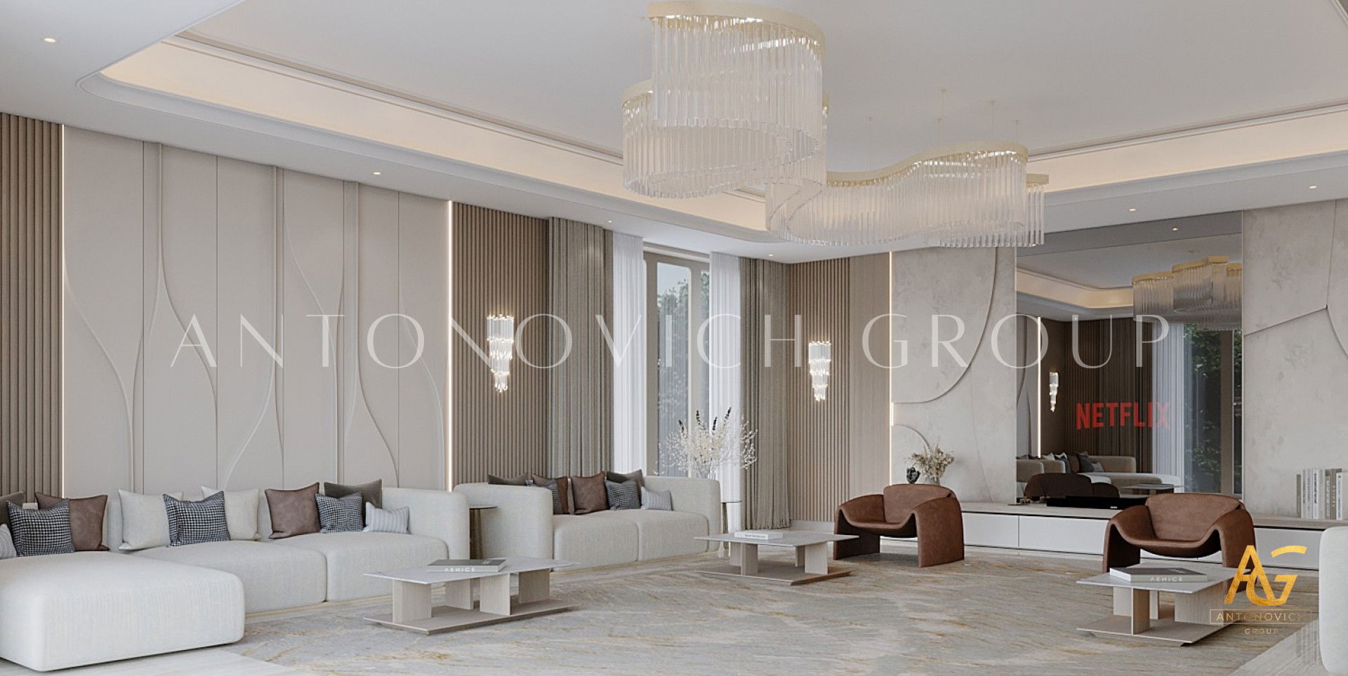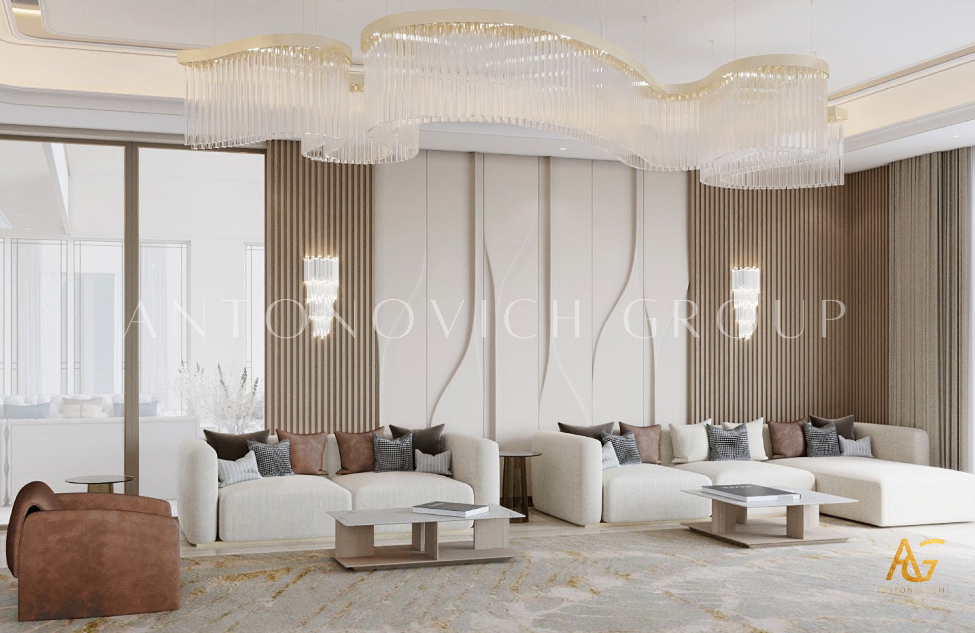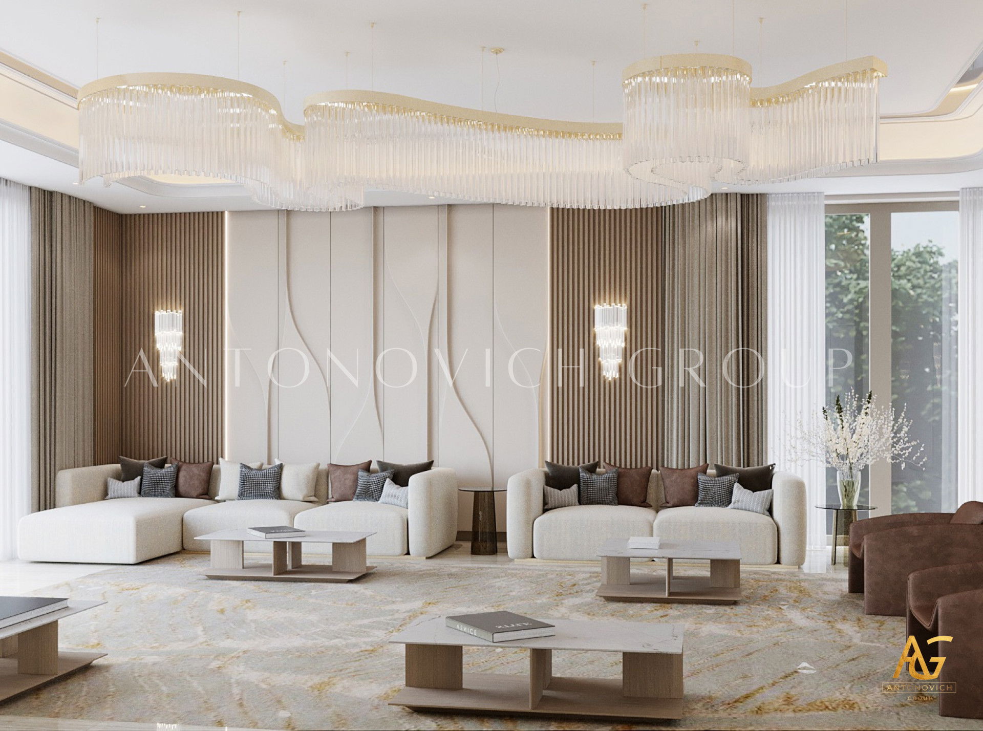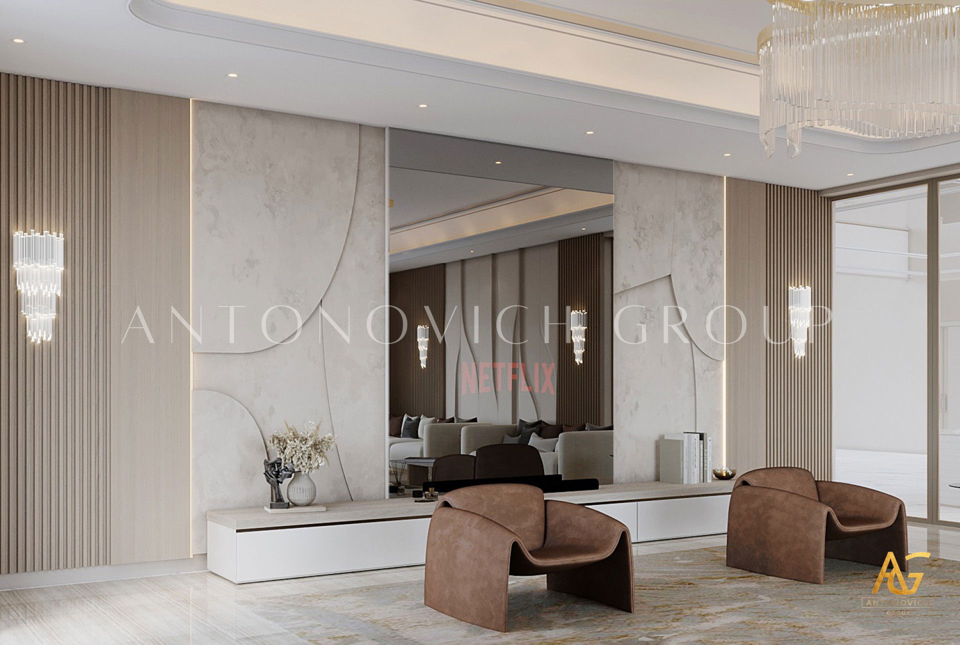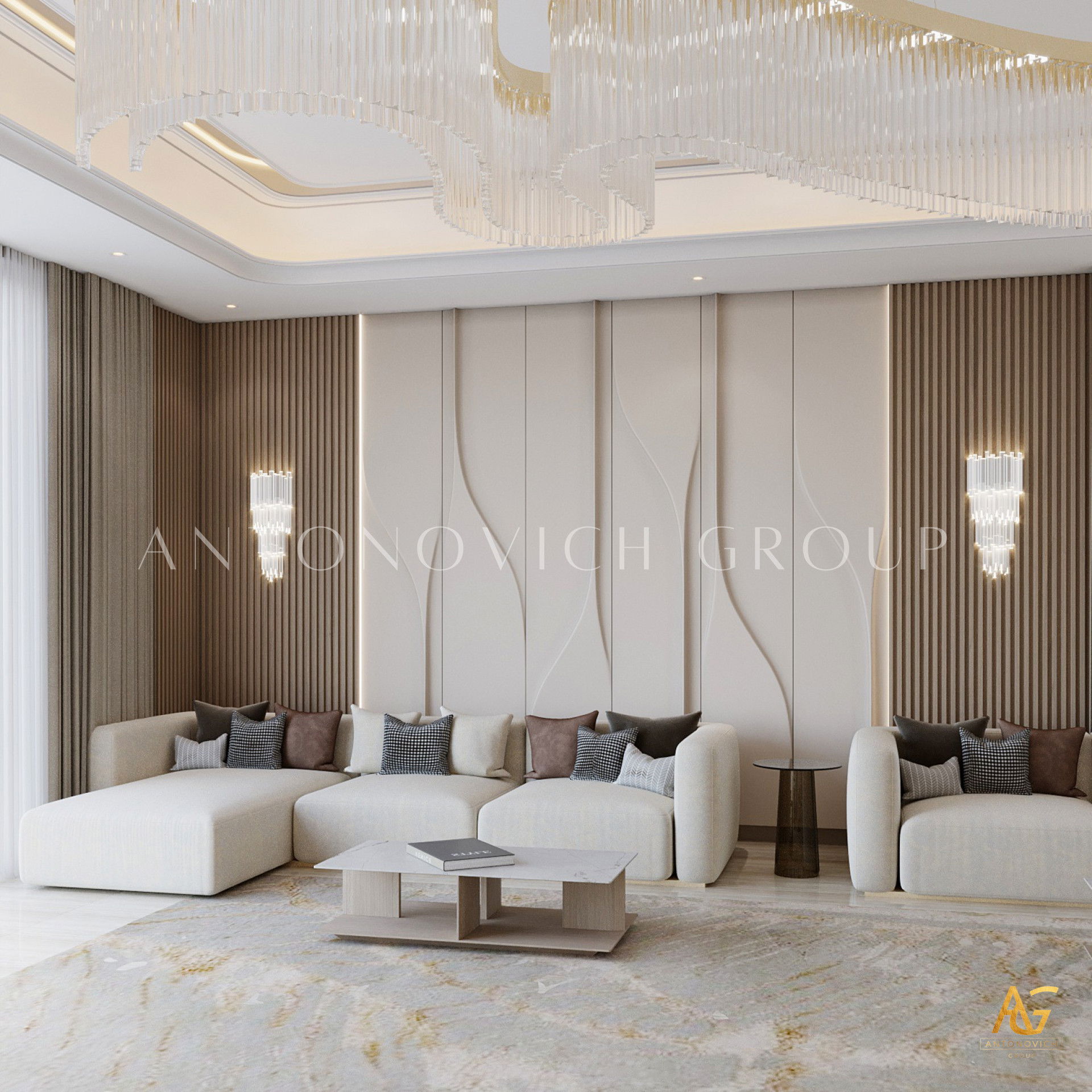 كان أصحاب الشقق الفاخرة في دبي يحلمون بواحة خاصة بهم داخل شقة حضرية. التصميم الداخلي لغرفة المعيشة ، كما لو كان منسوخًا من أحلامهم. يلامس أوتار الروح الرقيقة ، ويمنحهم إحساسًا رائعًا بعطلة الاسترخاء التي حلموا بها. يدعم التصميم الداخلي لغرفة المعيشة بأسلوب حديث مفهوم التصميم العام للداخل. تكتسب الأشكال والخطوط اللاكونية في مشروع المؤلف معنى خاصًا ، لا سيما فلسفة الراحة المطلقة. جزء من هذا الشعور بالراحة هو أن مساحة واحدة تندمج بشكل متناغم مع منطقة المعيشة ومنطقة تناول الطعام والمطبخ. وتتدفق كل منطقة من هذه المناطق إلى بعضها البعض ، مما يؤدي إلى انسجام كامل وإدراك بصري مثالي من الناحية الجمالية. يتميز تصميم غرفة المعيشة بطابع مشرق وفريد من نوعه. هنا ، يجمع المصممون الداخليون في دبي بشكل مبهج بين الرقة والشدة ودفء المنزل والاحترام. يكتمل الجدار المزين بالحجر الطبيعي بمدفأة معاصرة. الأرائك والكراسي منجدة بنسيج نبيل من الظل الأسود. إنها تتناقض بشكل رائع مع اللوحة الأصلية ثلاثية الأبعاد على جدار واحد. يمنح تصميم السقف غرفة المعيشة الداخلية ديناميكية وأصالة. تم تزيين الامتداد الأبيض الثلجي بخطوط من الإضاءة الخلفية LED ، والتي تشكل زخرفة مجردة كاملة. تمت إضافة الإضاءة الداخلية بمصباح أرضي ساحر ومعاصر ومصابيح سقف. تذوب واجهات المطبخ الناعمة ذات الزخارف الطبيعية بدقة في الصورة العامة للداخل المريح.