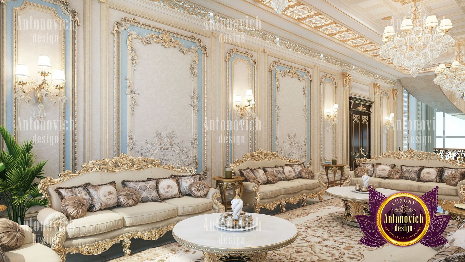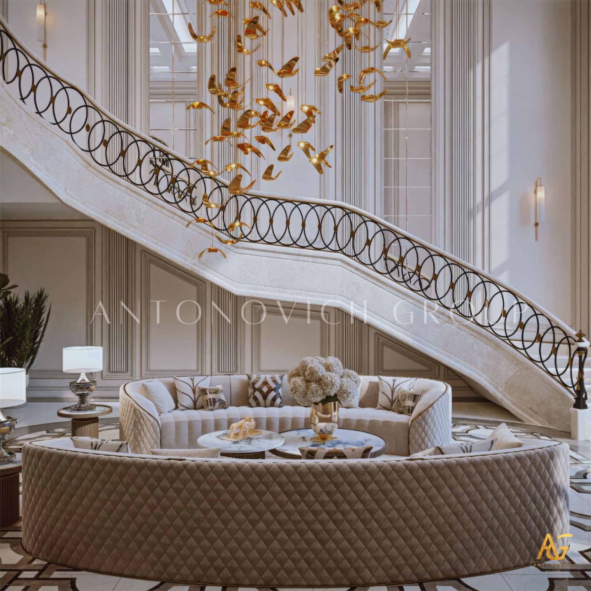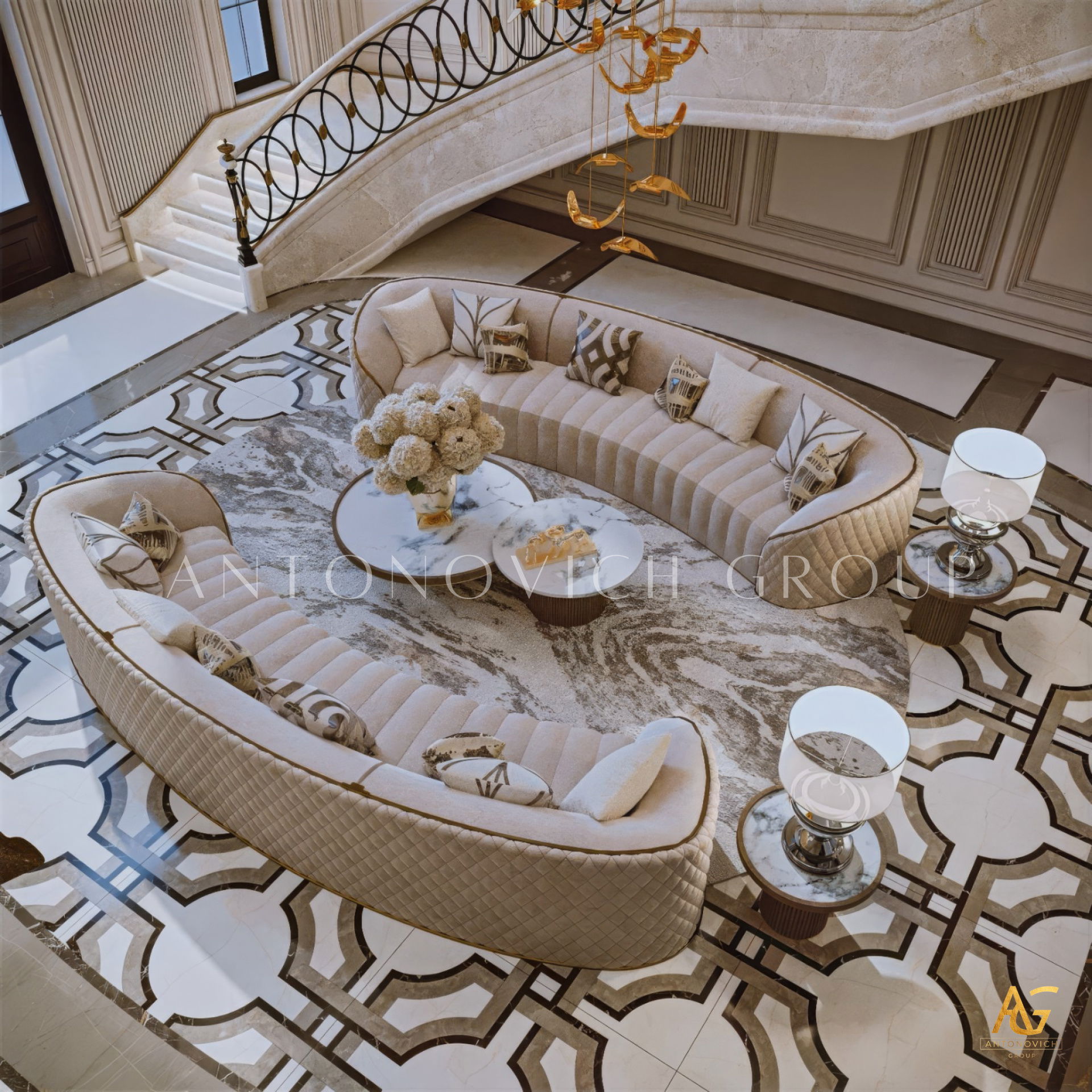عظمة القصور الملكية في إيطاليا وفرنسا وإنجلترا لا تتوقف عن جذب انتباه محبي الطراز الكلاسيكي. يختار العديد من عملاء استوديو التصميم من لاكشري انتونوفيتش ديزاين بالضبط خيار قصر الفخامة على الطراز الكلاسيكي ، للتأكيد على نجاحات حياتهم ومكانتهم وبالطبع الذوق الرفيع. يعكس التصميم الداخلي لغرفة المعيشة مع منطقة لتناول الطعام بلا شك رفاهية القصر الحديث. يحترم مصممو الديكور الداخلي في دبي جميع شرائع وتقاليد الطراز الكلاسيكي ، ويتركون مجالًا للارتجال وأفكار التصميم الأصلية. وهكذا ، يصبح كل جزء داخلي لؤلؤة فريدة من نوعها في فن التصميم. الجزء الداخلي من غرفة المعيشة مليء بالمعنى العميق. هنا يمكنك رؤية ملاحظات الإمبراطورية والباروك والكلاسيكية الجديدة. الديكور التقليدي للجدران ، حيث ظلال الجص غير اللامع مع بتلات الجص مع التذهيب تظليل بشكل مثالي العناصر الداخلية الأكثر إشراقًا. مما لا شك فيه أن العنصر الأكثر روعة وإشراقًا في داخل غرفة المعيشة هو الأرضية الفخمة المصنوعة من الرخام الطبيعي بزخارف منحوتة. الزخرفة معقدة للغاية مع استخدام عشرات الأنواع من الأحجار الطبيعية ، مما يسمح لك بإعادة إنشاء صورة سجادة جميلة بصريًا ستظل جميلة وجذابة إلى الأبد. تم تزيين النوافذ المقوسة بستائر جميلة من الحرير النبيل مع صبغة برونزية. موجة ناعمة من اللمبريكين والدانتيل الذهبي يتردد صداها مع باقي عناصر الديكور الداخلي. أعطى مؤلفو المشروع الدور الريادي في هذه الغرفة للأثاث. أصبحت الأرائك والكراسي بذراعين لهجة مشرقة ، بفضل التنجيد الجميل للمنسوجات الزرقاء المزينة بالتطريز.