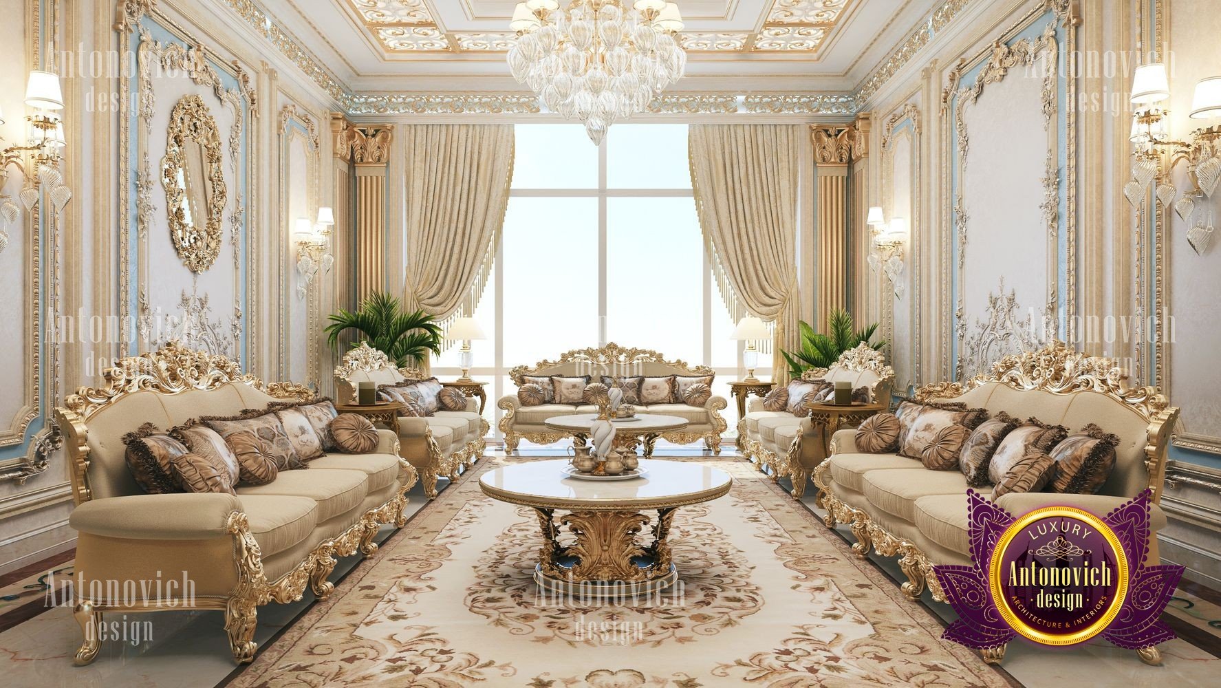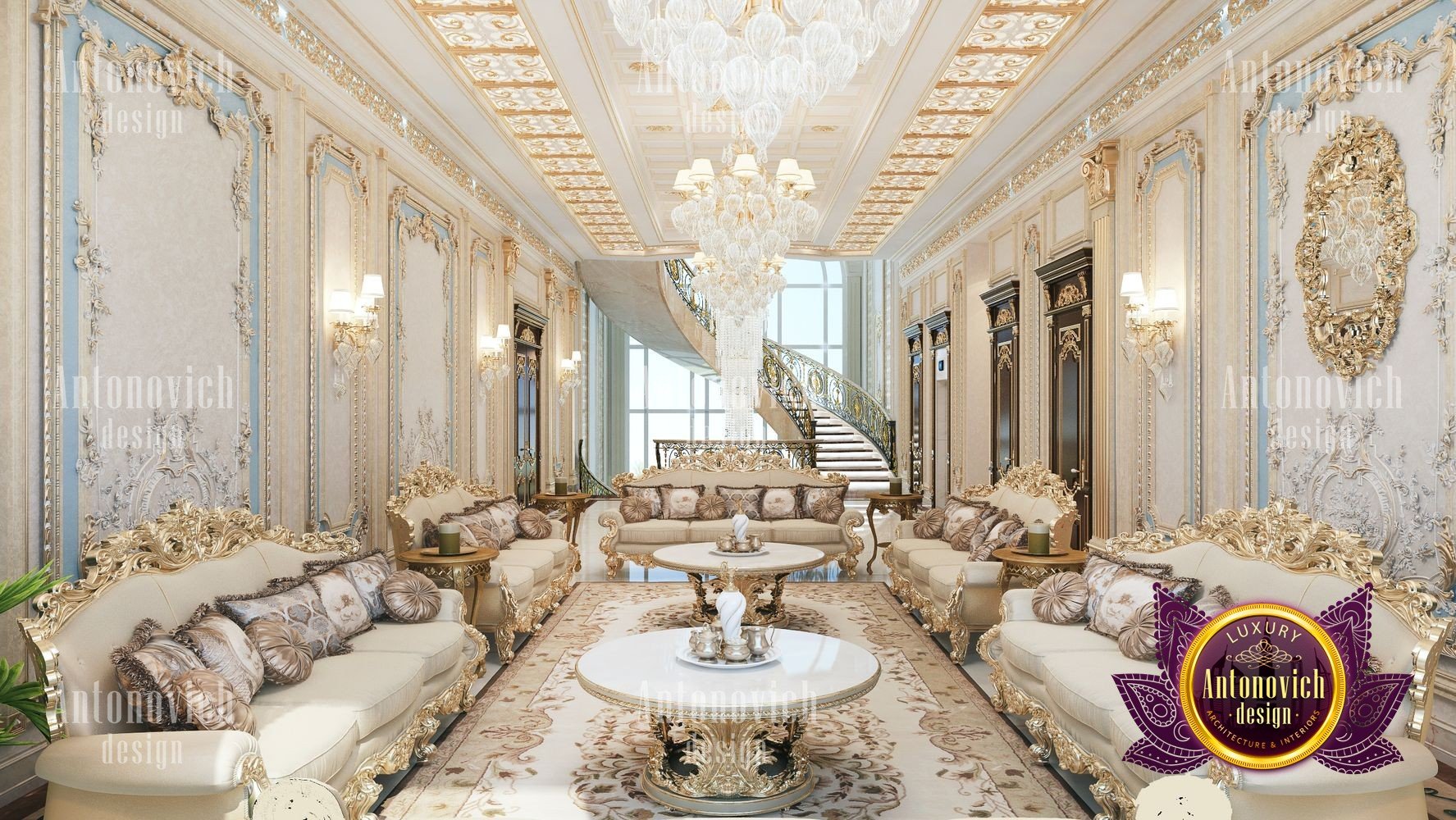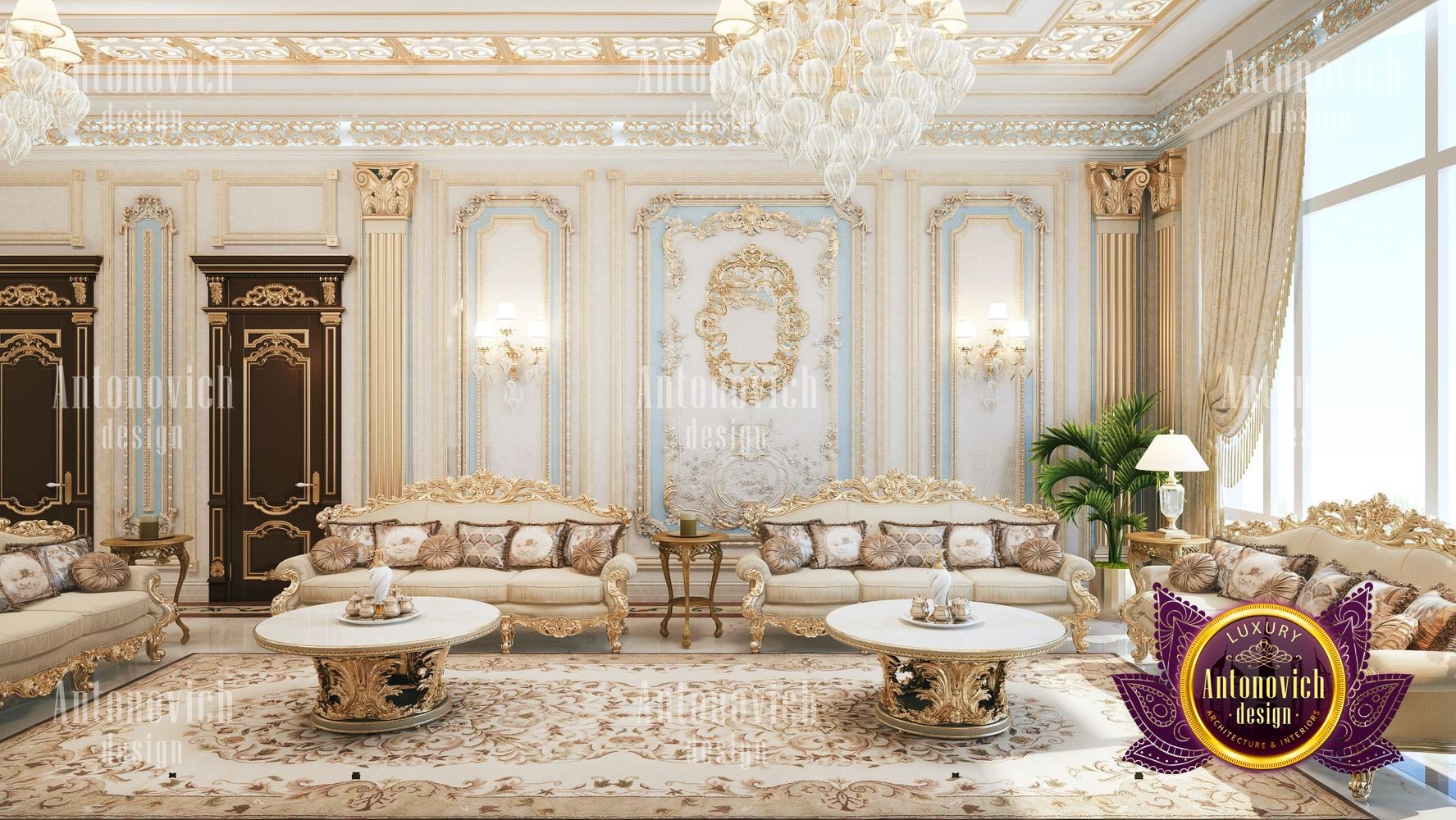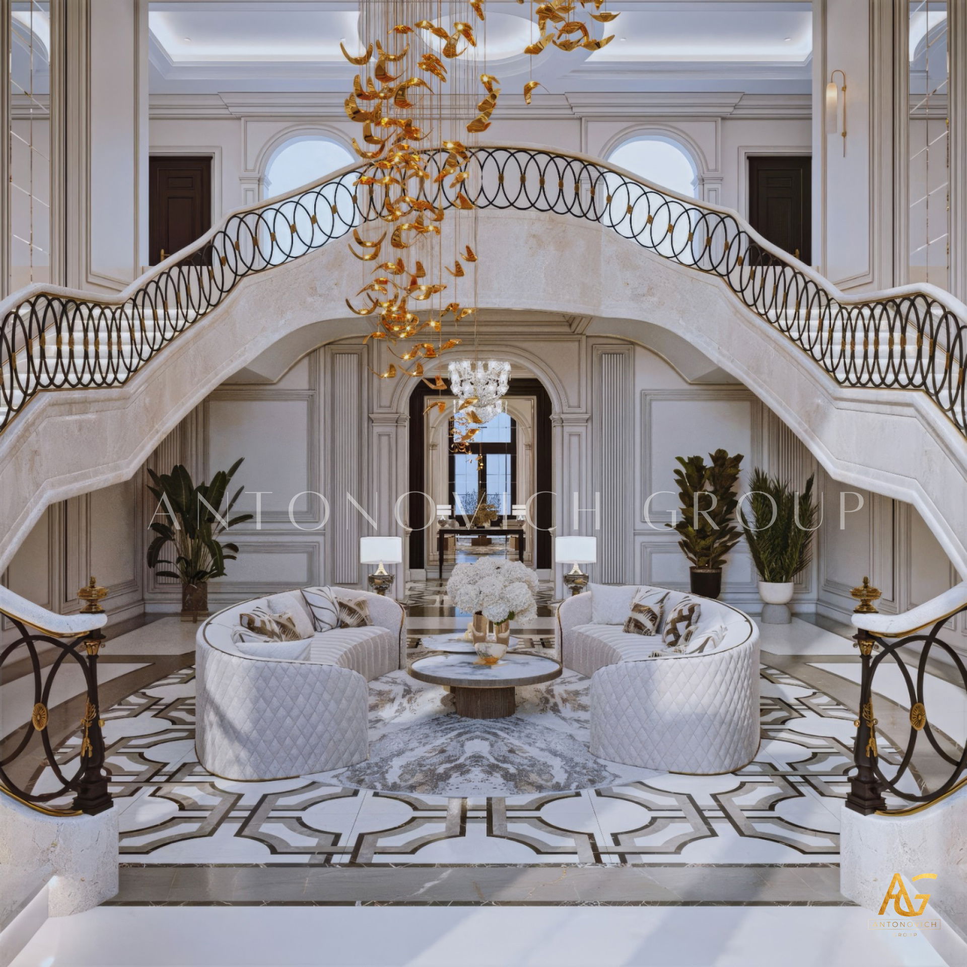 عظمة القصور الملكية في إيطاليا وفرنسا وإنجلترا لا تتوقف عن جذب انتباه محبي الطراز الكلاسيكي. يختار العديد من عملاء استوديو التصميم من لاكشري انتونوفيتش ديزاين بالضبط خيار قصر الفخامة على الطراز الكلاسيكي ، للتأكيد على نجاحات حياتهم ومكانتهم وبالطبع الذوق الرفيع. يعكس التصميم الداخلي لغرفة المعيشة مع منطقة لتناول الطعام بلا شك رفاهية القصر الحديث. يحترم مصممو الديكور الداخلي في دبي جميع شرائع وتقاليد الطراز الكلاسيكي ، ويتركون مجالًا للارتجال وأفكار التصميم الأصلية. وهكذا ، يصبح كل جزء داخلي لؤلؤة فريدة من نوعها في فن التصميم. الجزء الداخلي من غرفة المعيشة مليء بالمعنى العميق. هنا يمكنك رؤية ملاحظات الإمبراطورية والباروك والكلاسيكية الجديدة. الديكور التقليدي للجدران ، حيث ظلال الجص غير اللامع مع بتلات الجص مع التذهيب تظليل بشكل مثالي العناصر الداخلية الأكثر إشراقًا. مما لا شك فيه أن العنصر الأكثر روعة وإشراقًا في داخل غرفة المعيشة هو الأرضية الفخمة المصنوعة من الرخام الطبيعي بزخارف منحوتة. الزخرفة معقدة للغاية مع استخدام عشرات الأنواع من الأحجار الطبيعية ، مما يسمح لك بإعادة إنشاء صورة سجادة جميلة بصريًا ستظل جميلة وجذابة إلى الأبد. تم تزيين النوافذ المقوسة بستائر جميلة من الحرير النبيل مع صبغة برونزية. موجة ناعمة من اللمبريكين والدانتيل الذهبي يتردد صداها مع باقي عناصر الديكور الداخلي. أعطى مؤلفو المشروع الدور الريادي في هذه الغرفة للأثاث. أصبحت الأرائك والكراسي بذراعين لهجة مشرقة ، بفضل التنجيد الجميل للمنسوجات الزرقاء المزينة بالتطريز.