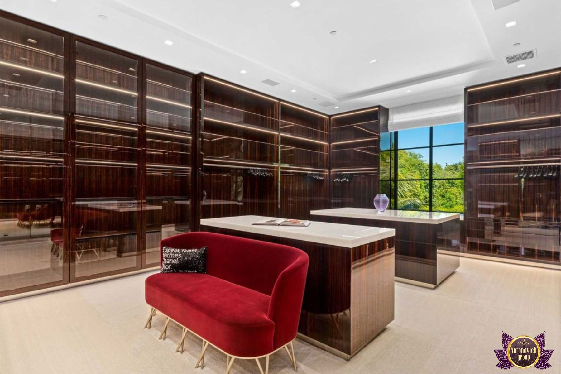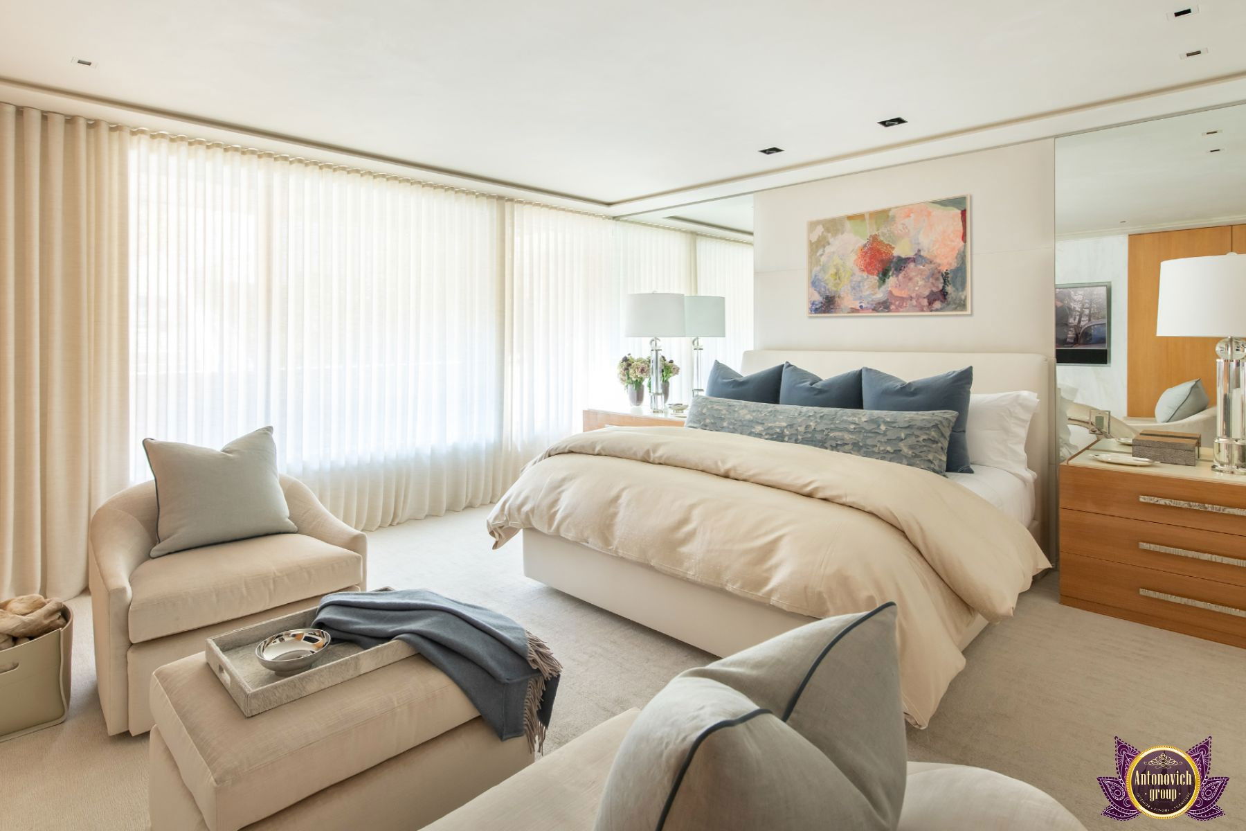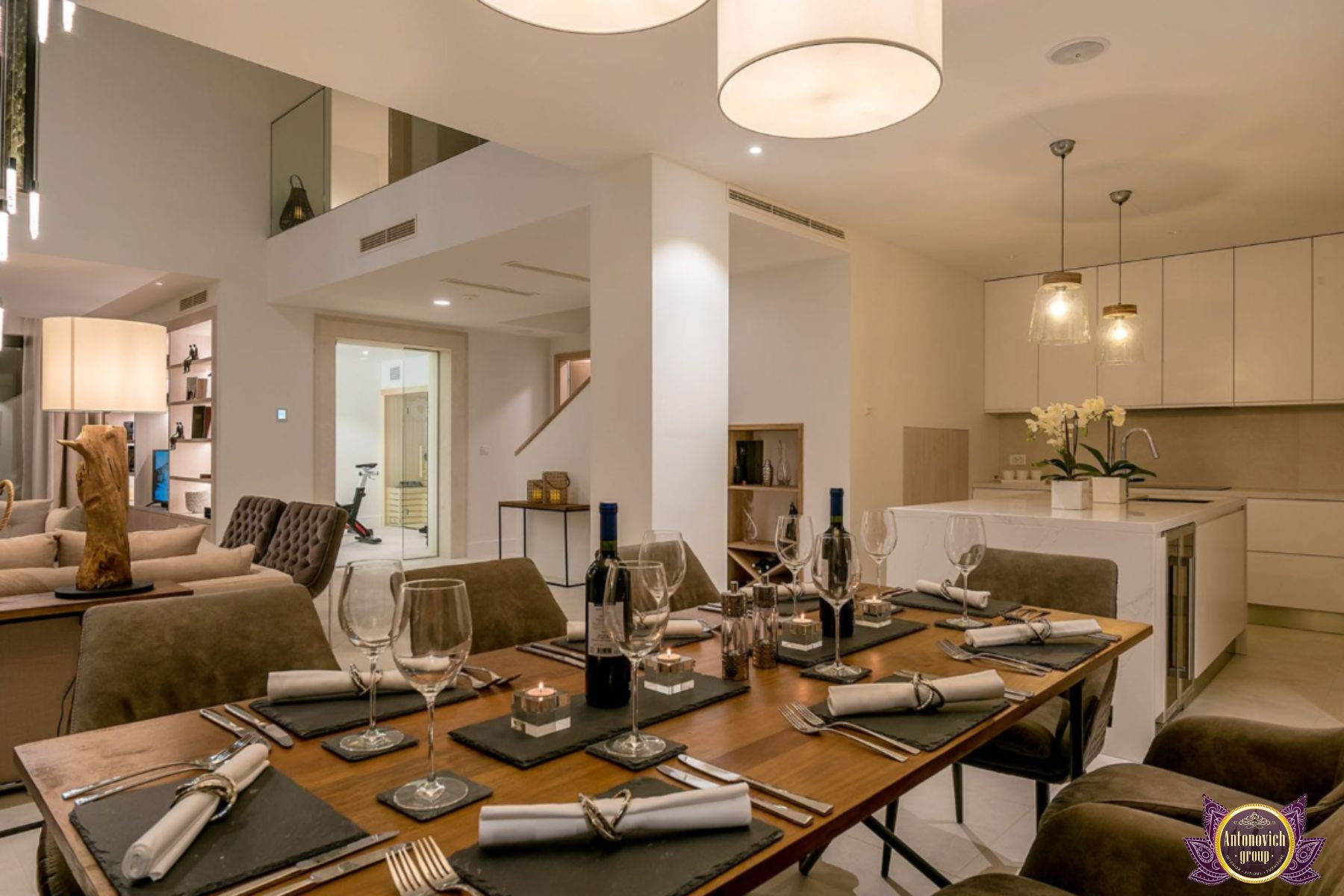 صممت مجموعة أنتونوفيتش هذا البنتهاوس الداخلي مع وضع الراحة في الاعتبار. مع لمسات متناغمة من الأناقة الفخمة ، قام فريق التصميم الداخلي لدينا بإحياء أجواء المزاج الداخلي الأكثر استرخاءً وهدوءًا. نوافذ زجاجية مفتوحة على مصراعيها تخلق مناظر بانورامية رائعة لنخلة جميرا. كفريق يقدم خدمات التصميم الداخلي الكامل والتجهيز والتجديد للوحدات السكنية الراقية مثل هذه البنتهاوس المذهلة في نخلة جميرا في أنانتارا ، بذلت مجموعة أنتونوفيتش كل جهدها ومواهبها وقدرتها على تسوية الاثاث والديكور الداخلي لتلبية المعايير العالية للمالك.