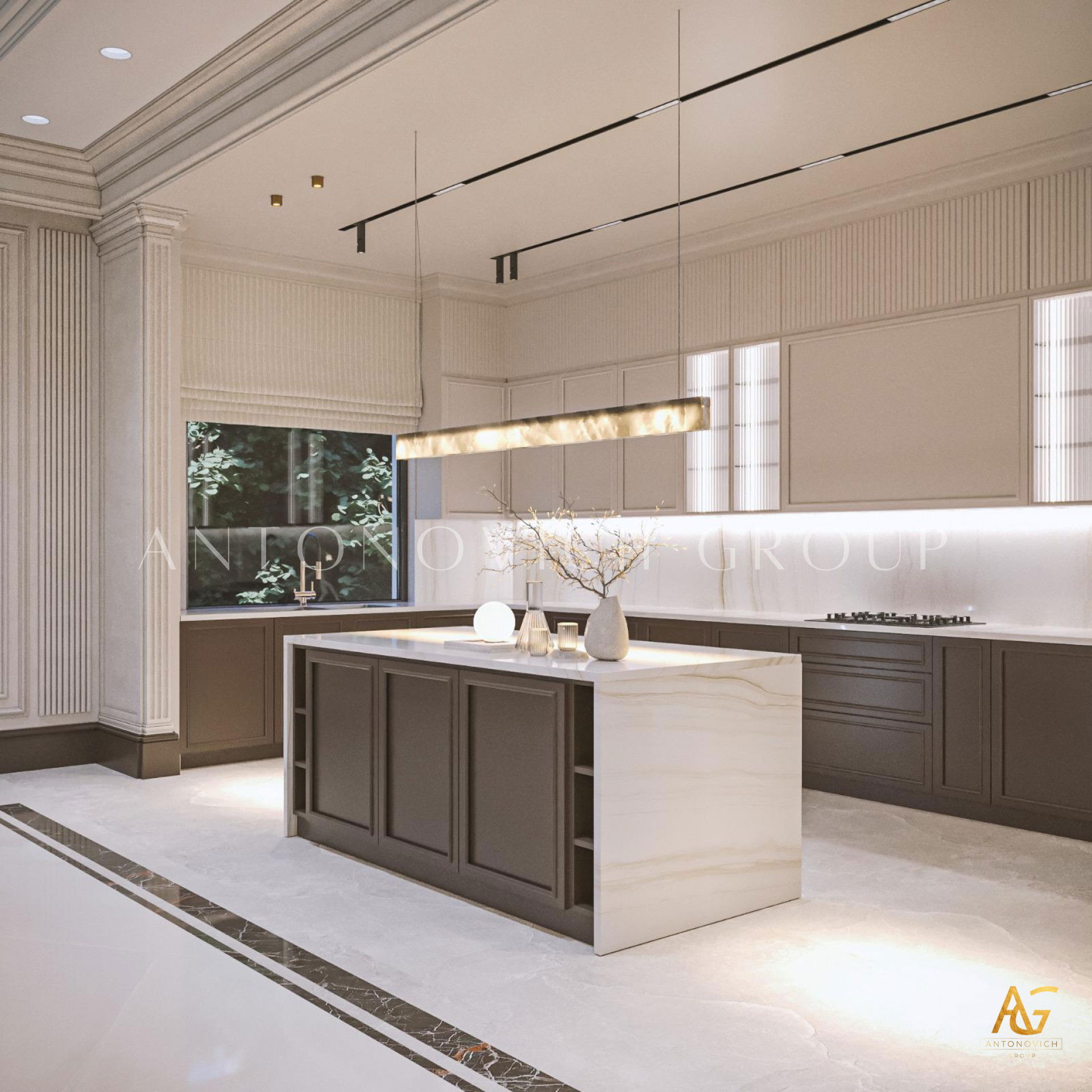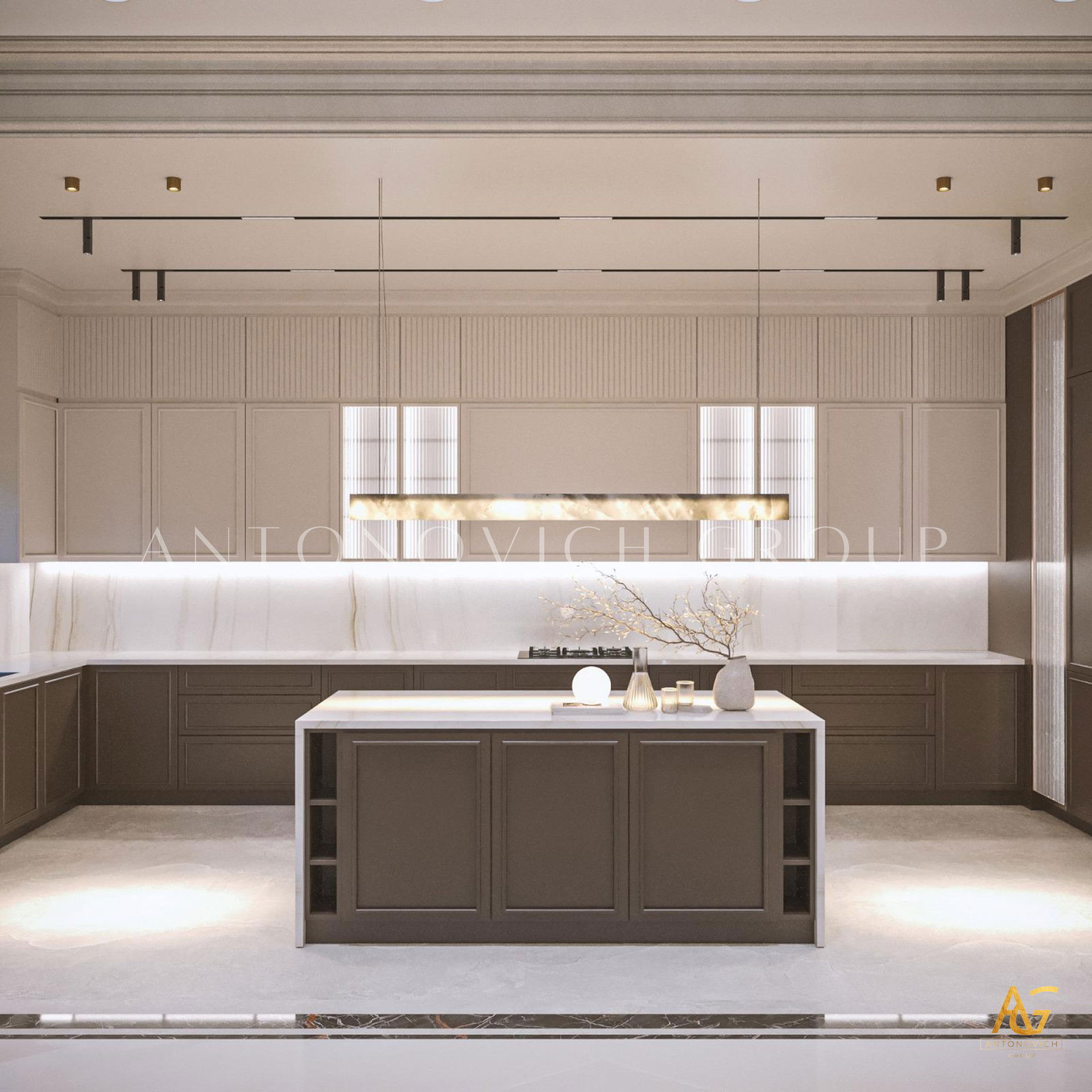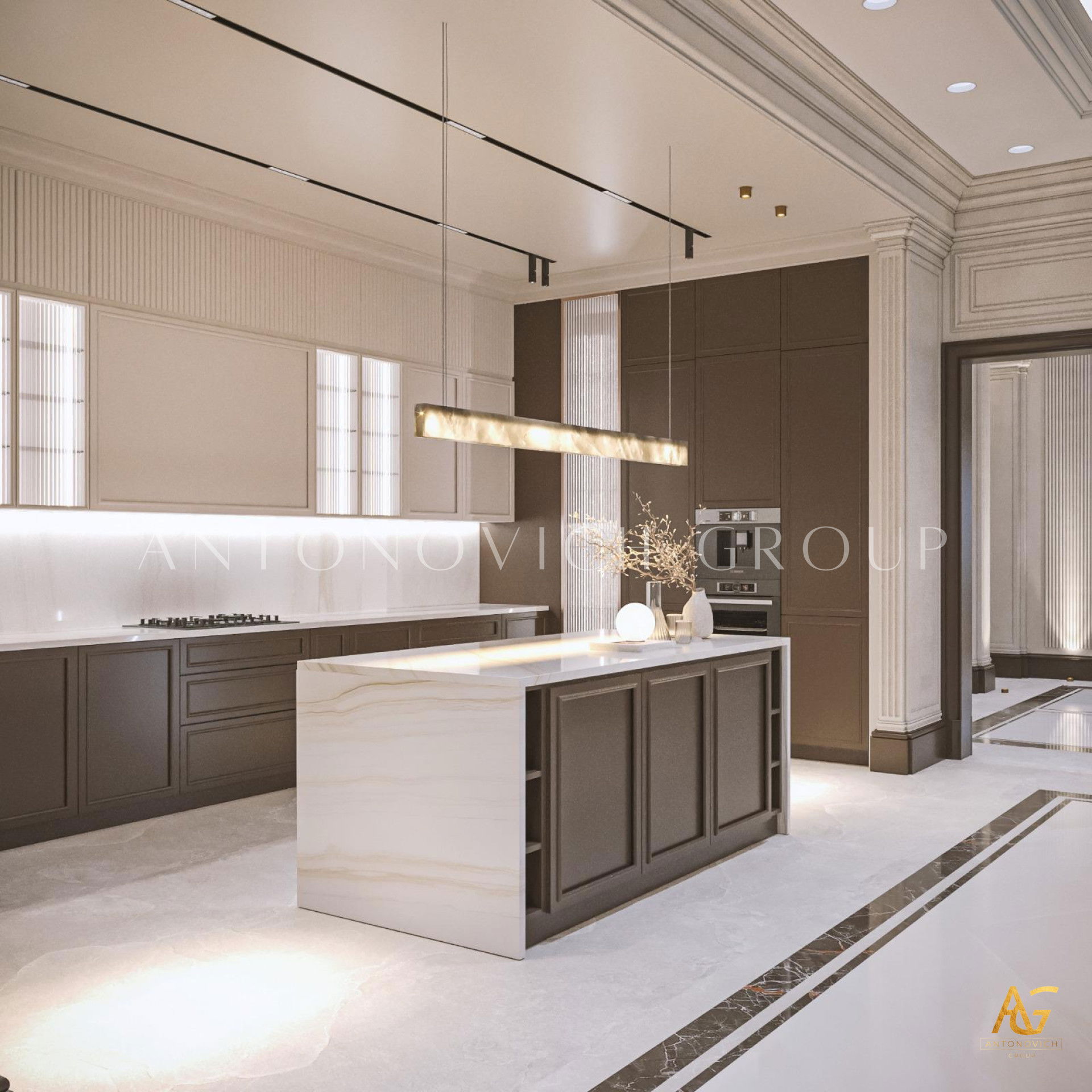 تصميم الفيلا في أبو ظبي هو مزيج ساحر من طراز الآرت ديكو والطراز الحديث. ترف الحقبة الجديدة، و الذي يقدمه إستوديو لاكشري أنطونوفيتش ديزاين لزبائنه ، يجمع ما بين الأفكار المبتكرة والتقاليد. أصبح تصميم المطبخ استمرار موجز لمفهوم تصميم كل المنزل. المساحات الواسعة في الطابق الأول ضمت منطقة المطبخ ومنطقة تناول الطعام. هذه المساحات هي متساوية في القيمة مع مساحات غرفة الجلوس المريحة. في مثل هذا التصميم الداخلي الفاخر يتم الشعور بالخفة والإنسجام . لم يتم تحميل التصميم الداخلي في تفاصيل لا داعي لها من الديكور، ولكن مع ذلك تبدو أنيقة جدا ورائعة. مصممي التصميم الداخلي في أبوظبي من أجل تقسيم المساحة إستخدموا اثنتين من الثريات الضخمة الأنيقة على نمط آرت ديكو مع معلقات الكريستال الكبيرة. لإنشاء جو ديناميكي والشعور الكامل بالإنسجام تم تقسيم السقف إلى عدة منافذ على شكل مستطيل. الزخرفة الشبكية ، و أضواء LED، و عناصر المرايا ، كل هذا معا يشكل صورة كاملة لزخرفة السقف. أضواء السقف الإضافية تعزز لمعان التصميم الداخلي الفاخر. التصميم الداخلي للمطبخ مليء بالتفاصيل الرائعة. على سبيل المثال، للتمييز ما بين مساحة المطبخ وغرفة الجلوس فإن مصممي التصميم الداخلي عرضوا عمودين رشيقيين مع تيجان من الفضة، والتي تقع بينهم حبات الكريستال.