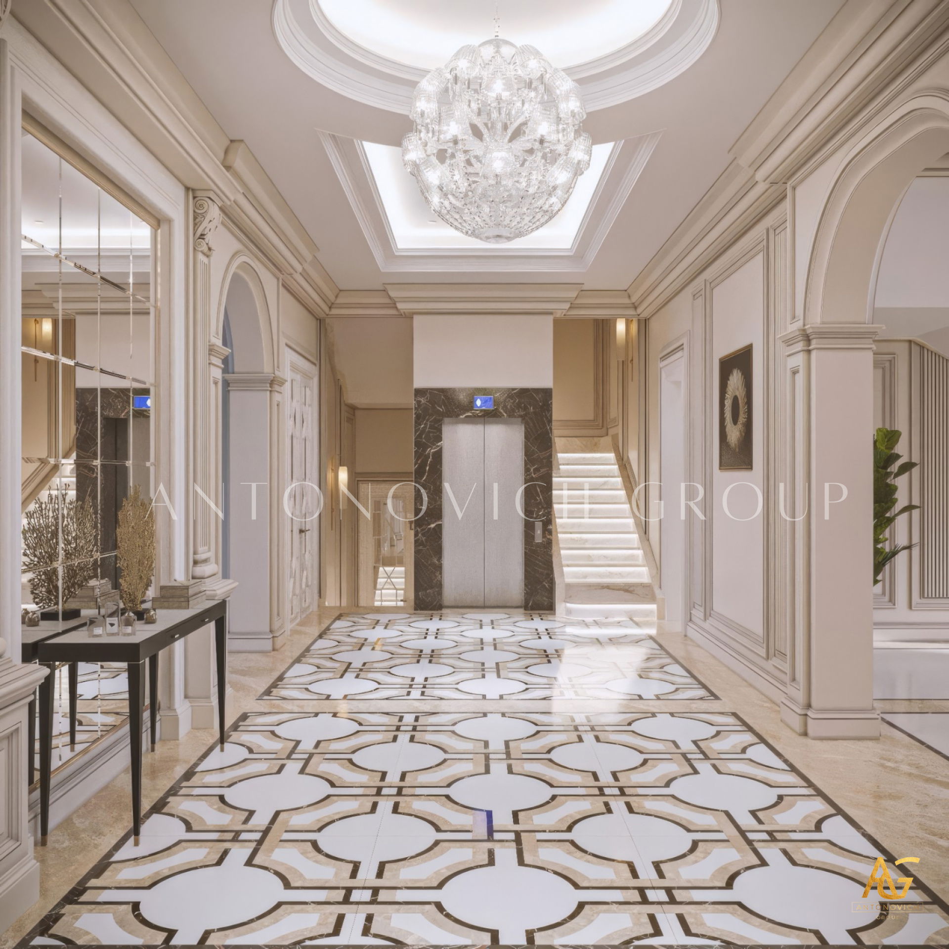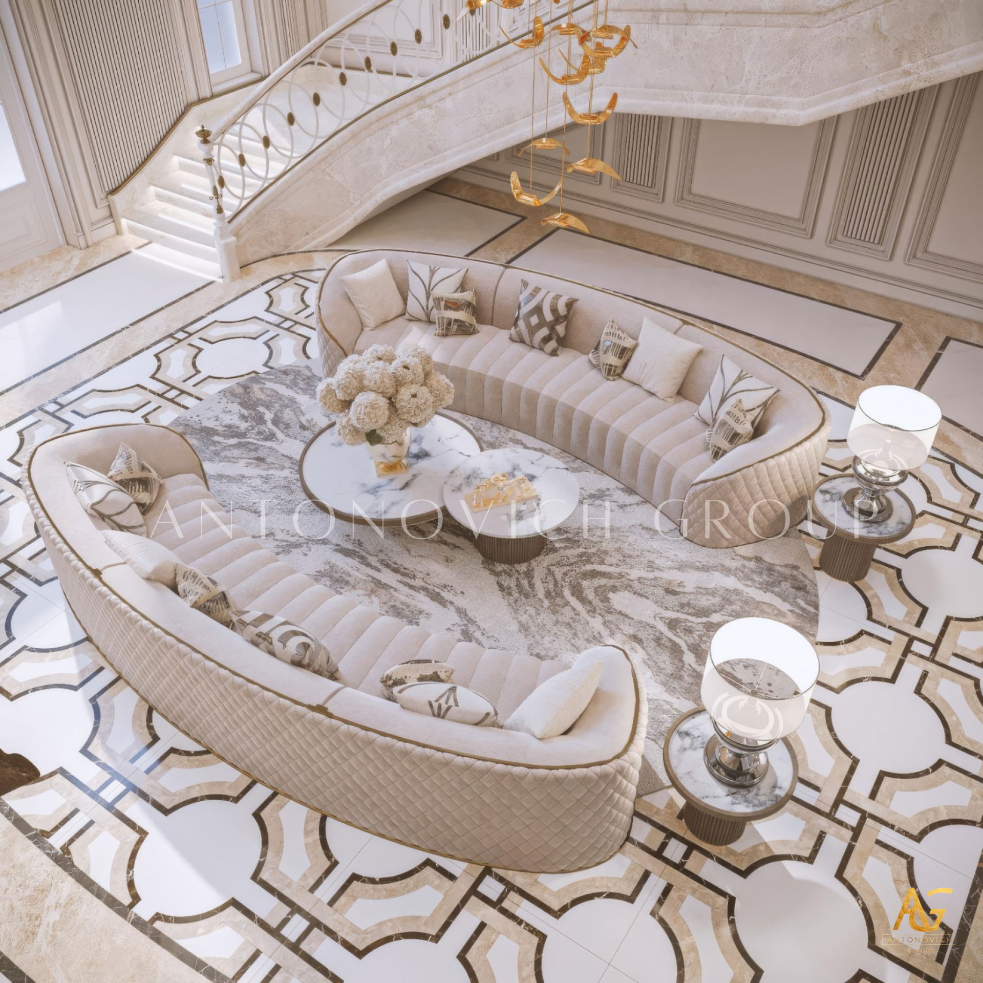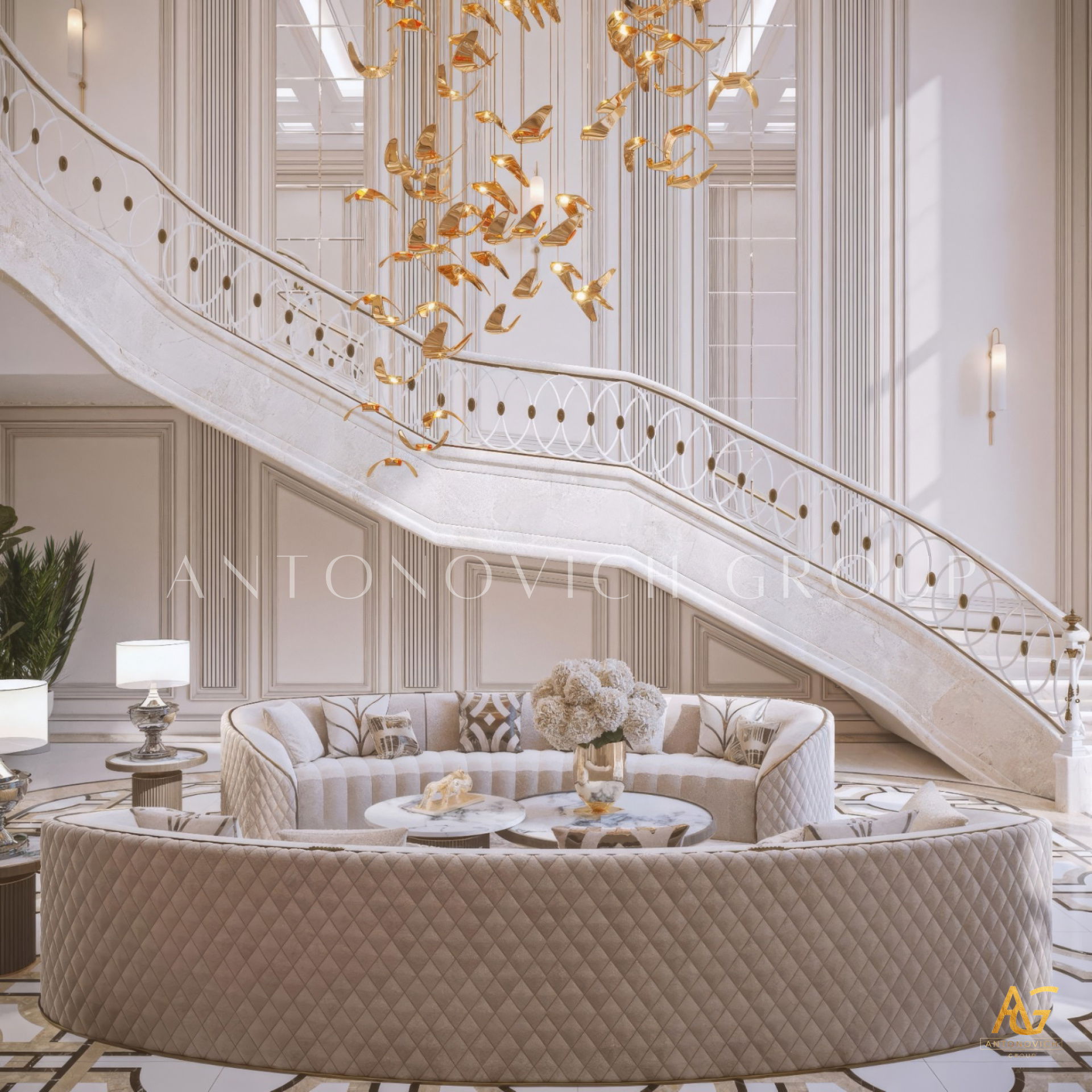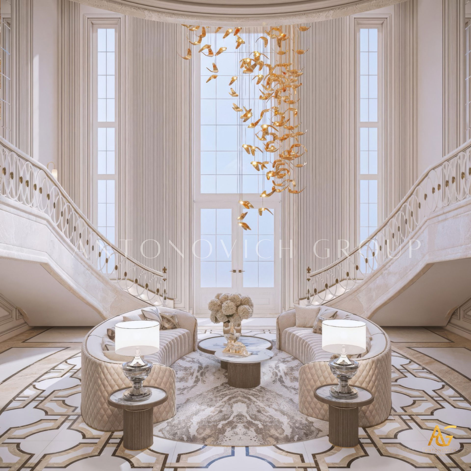 إن ما يجعل التصميم الداخلي لغرفة المعيشة متكاملاً في مظهره الفاخر هو الأثاث الفاخر المطعم بالديكور المنحوت الرائع. هنا يمكن قضاء الوقت مع الأسرة وكذلك يمكن دعوة الأصدقاء. إن أصحاب المنزل في دبي هم أشخاص كريمي الضيافة ووديين الذين يرحبون بالضيوف دوماً ومستعدين لتقديم الأفضل من كل شيء. عرض مصممو التصميم الداخلي في دبي حلول أنيقة ورائعة للتصميم الداخلي في روح الكلاسيكية الحديثة التي تعكس بشكل كامل مكانة هذا المنزل ومفهوم الجمال. توحي غرفة المعيشة المريحة ذات النوافذ البانورامية الكبيرة إلى المزاج اللطيف من الراحة المنزلية. النوافذ مغطاة بستائر فخمة على الطراز الكلاسيكي من الحرير النبيل. تشديداً على حسن ضيافة هذا المنزل يولي مصممز التصميم الداخلي في دبي اهتماماً خاصاً للقسم الذي يضم غرفة تناول الطعام. تم تطعيم طاولة الطعام الكبيرة المصنوعة من أنواع الخشب النبيل بالديكور المنحوت. تحيط به الكراسي المرتفعة الناعمة ذات القامة الفخمة. تقوم التريات الكريستالية ذات المعلقات الكثيرة بتزيين مركز غرفة المعيشة وغرفة تناول الطعام. وتحت لمعان الكريستال تبدو لعبة الظلال للزخارف الجصية ساحرة. يعكس التصميم الداخلي لغرفة المعيشة الكمال الجمالي والمزاج الأنيق للقصر الحديث. تبدو الأرضيات من الخشب الطبيعي ذات التشريب الخاص دافئة ومريحة ويعزز هذا الشعور السجاد الفارسي الفاخر في منطقة غرفة المعيشة ومنطقة تناول الطعام. إن التصميم الداخلي الفاخر من لاكشري أنطونوفيتش ديزاين يعبر عن الشخصية الفردية لكل منزل ويمنح أصحابه الشعور الفريد من الراحة في أي وقت من اليوم.