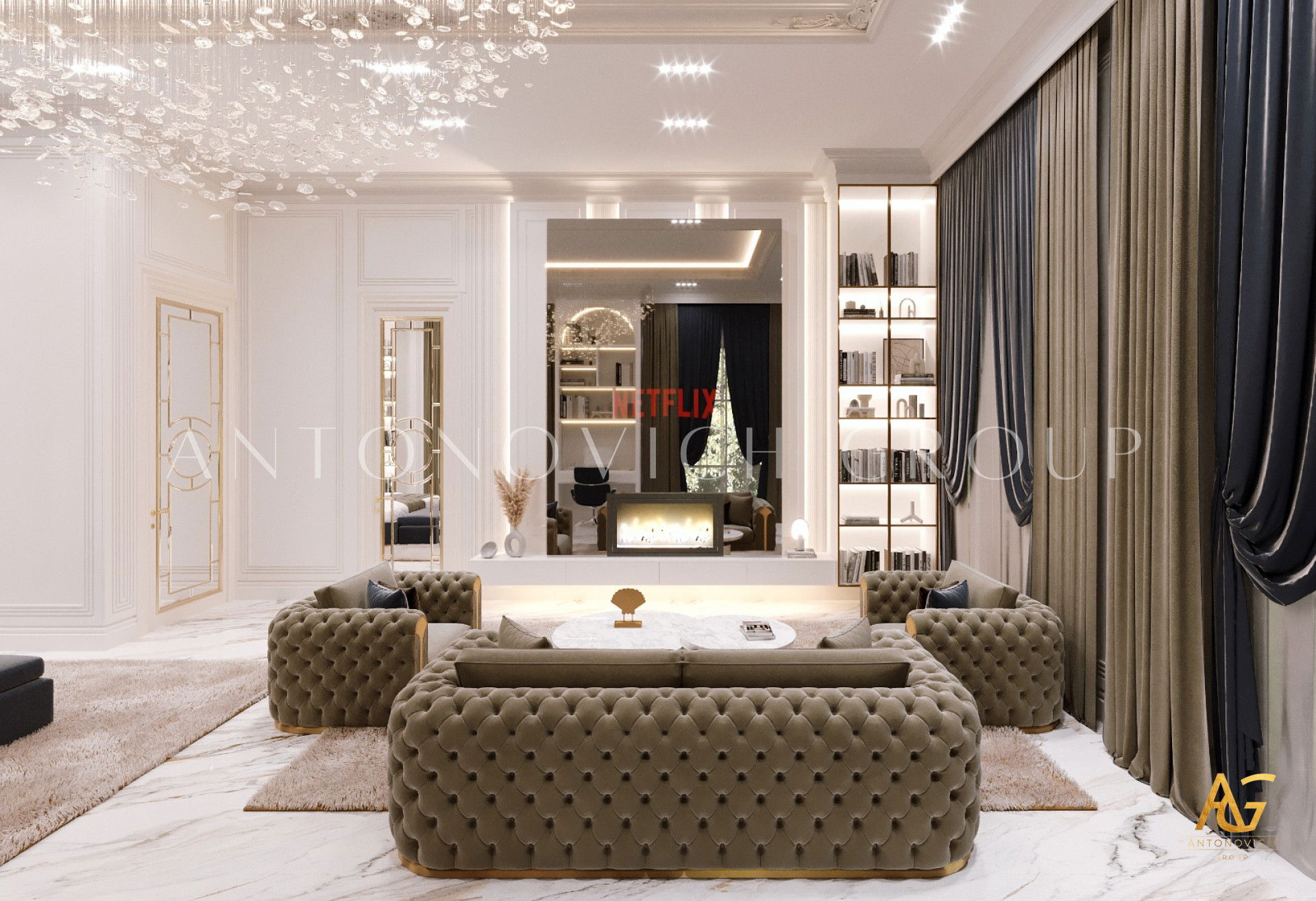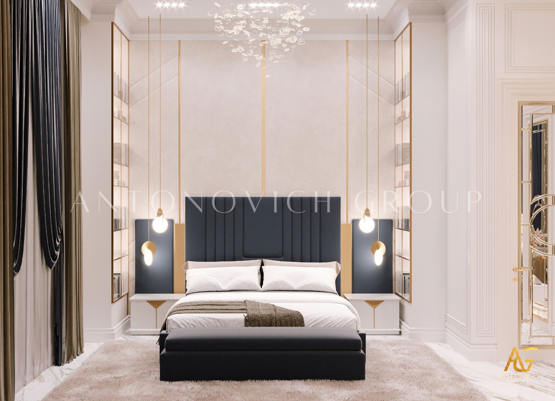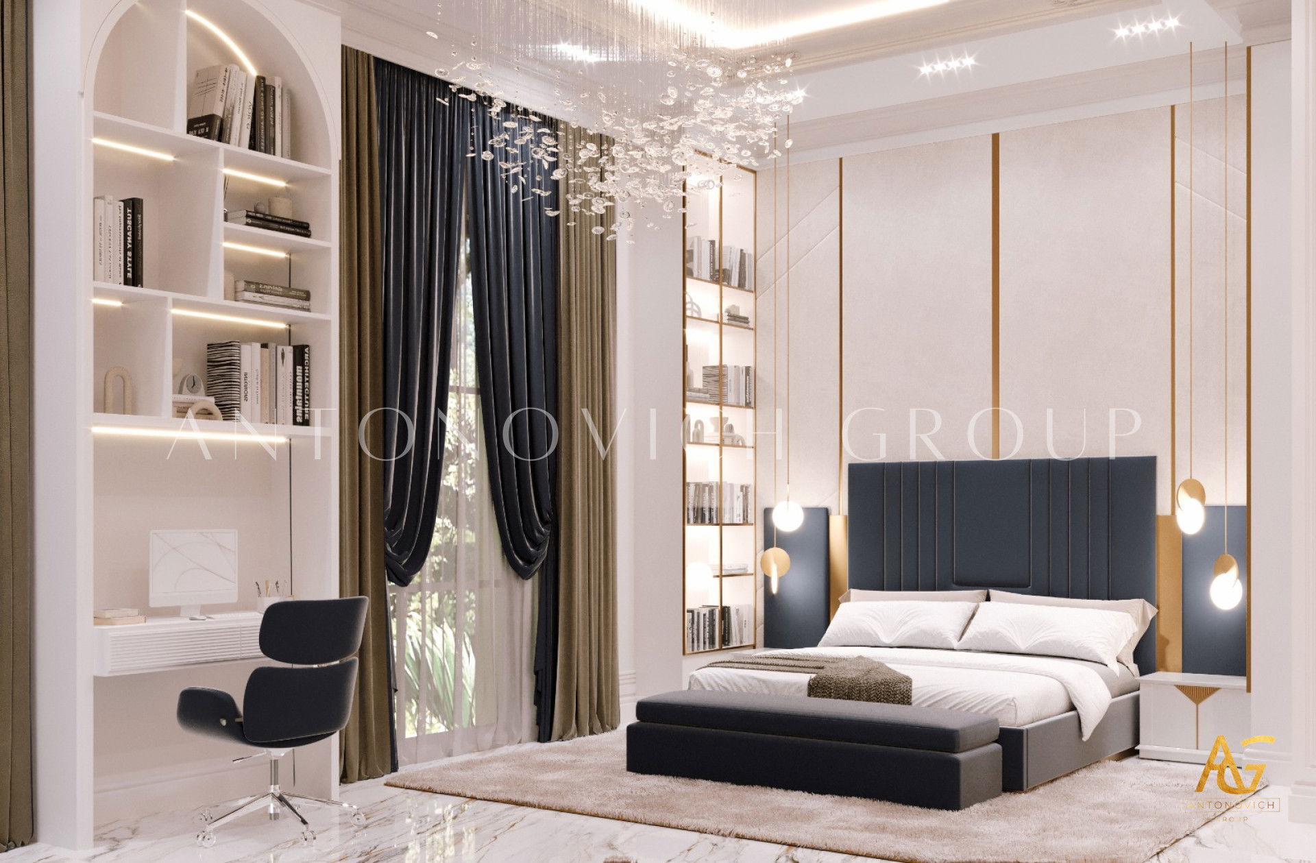 يتميز التصميم الداخلي لغرفة نوم فتاة شابة معاصرة بطبعه الزاهي والغير عادي كما هي الفتاة الشابة بنفسها. إن تصميم غرفة النوم للفتاة يأخذ بعين الاعتبار ميزات شخصية الفتاة، عمرها وتفضيلاتها. فالداخلية المريحة مليئة بالمزاج الفاخر والميزات الرائعة. يتميز تصميم غرفة النوم على الطراز الحديث بدفء الراحة المنزلية. الأرضية مصنوعة من خشب داكن من الأنواع القيمة ذو تشريب خاص. أمام هذه الخلفية الداكنة يبدو النقض أنيقاً على شكل سجاد طبيعي رقيق حليبي اللون. إن تصميم السقف يتناسق أكثر مع أسلوب البساطة. قام مصممي التصميم الداخلي دبي باستبدال الثريا التقليدية بخطوط إضاءة LED والأضواء النقطية الموضوعة حول محيط القسم. ويستمر هذا الإيجاز اللطيف في ديكور الجدران. إن المزيج الرائع من الجص الزخرفي ذو اللون البني الفانح وورق الجدان النسيجي ذو اللون الأبيض يمنح الداخلية طابعاً فريداً وحيوياً. في هذا المكان اللطيف والمريح أصبحت التفاصيل المشرقة هي الكرسي الأرجواني الناعم المنجد بالمخمل الناعم وكذلك السرير المريح. يزين السرير لوح أمامي ناعم منجد بالجلد الطبيعي ذو الخطوط المجردة. تمنح الحلول التصميمية الجريئة للداخلية الفخامة والراحة. السرير مزين بوسائد رائعة مطرزة بأحجار الراين وشراشف الحرير. أصبح تصميم داخلية غرفة النوم مشروعاً معقداً. الغرفة مقسومة إلى قسمين. وواحد من القسمين هي غرفة أطفال جميلة ذات الأثاث الفاخر والموقد الصناعي.