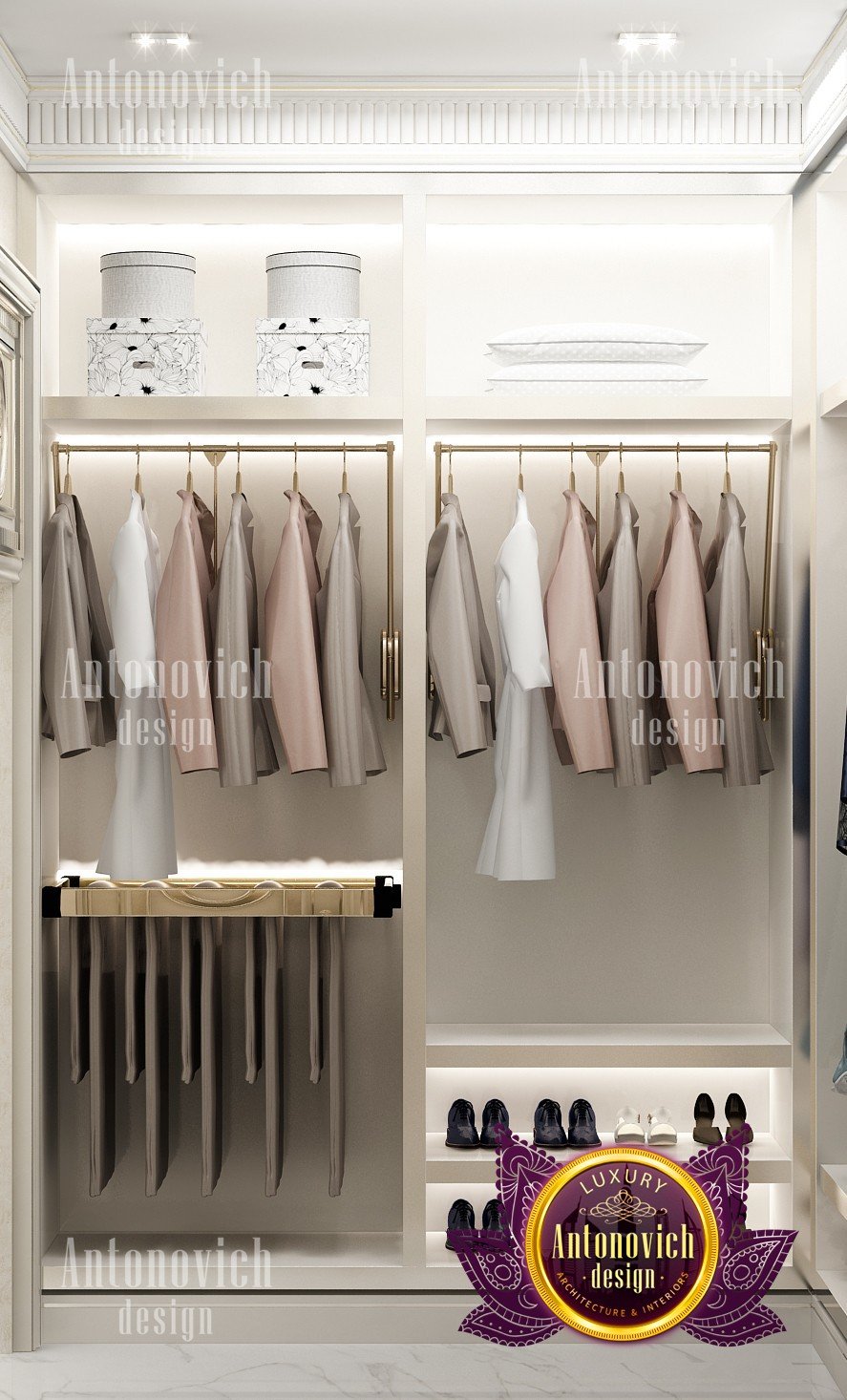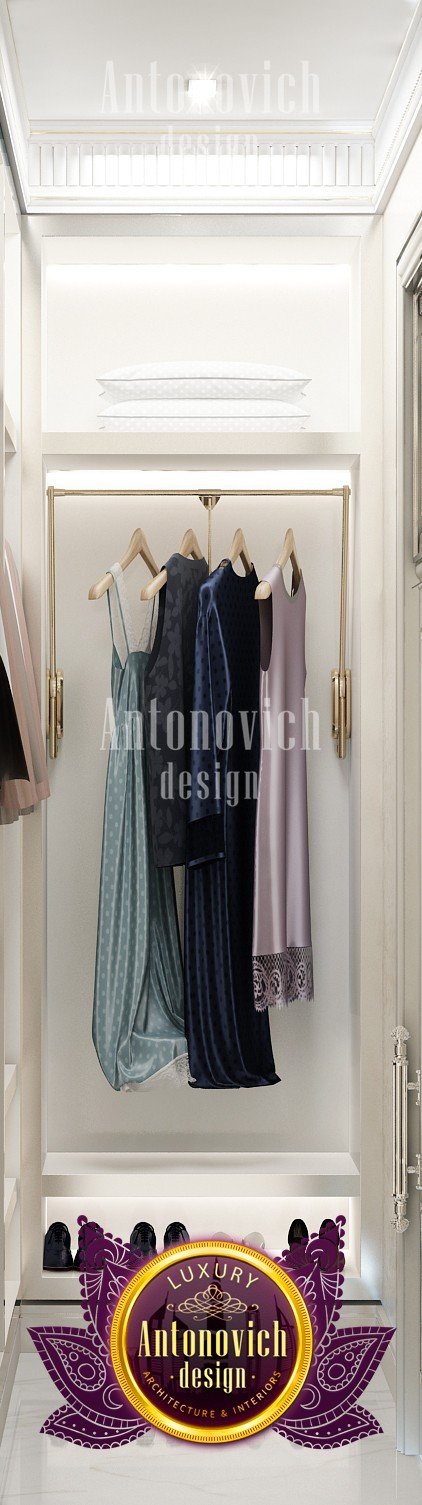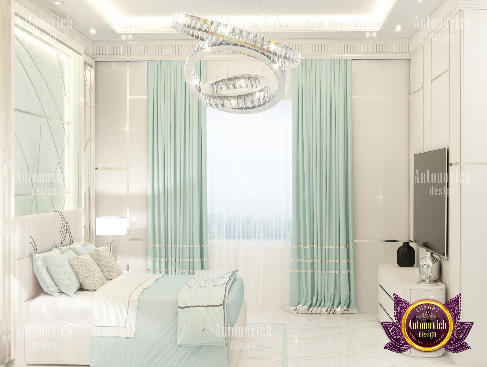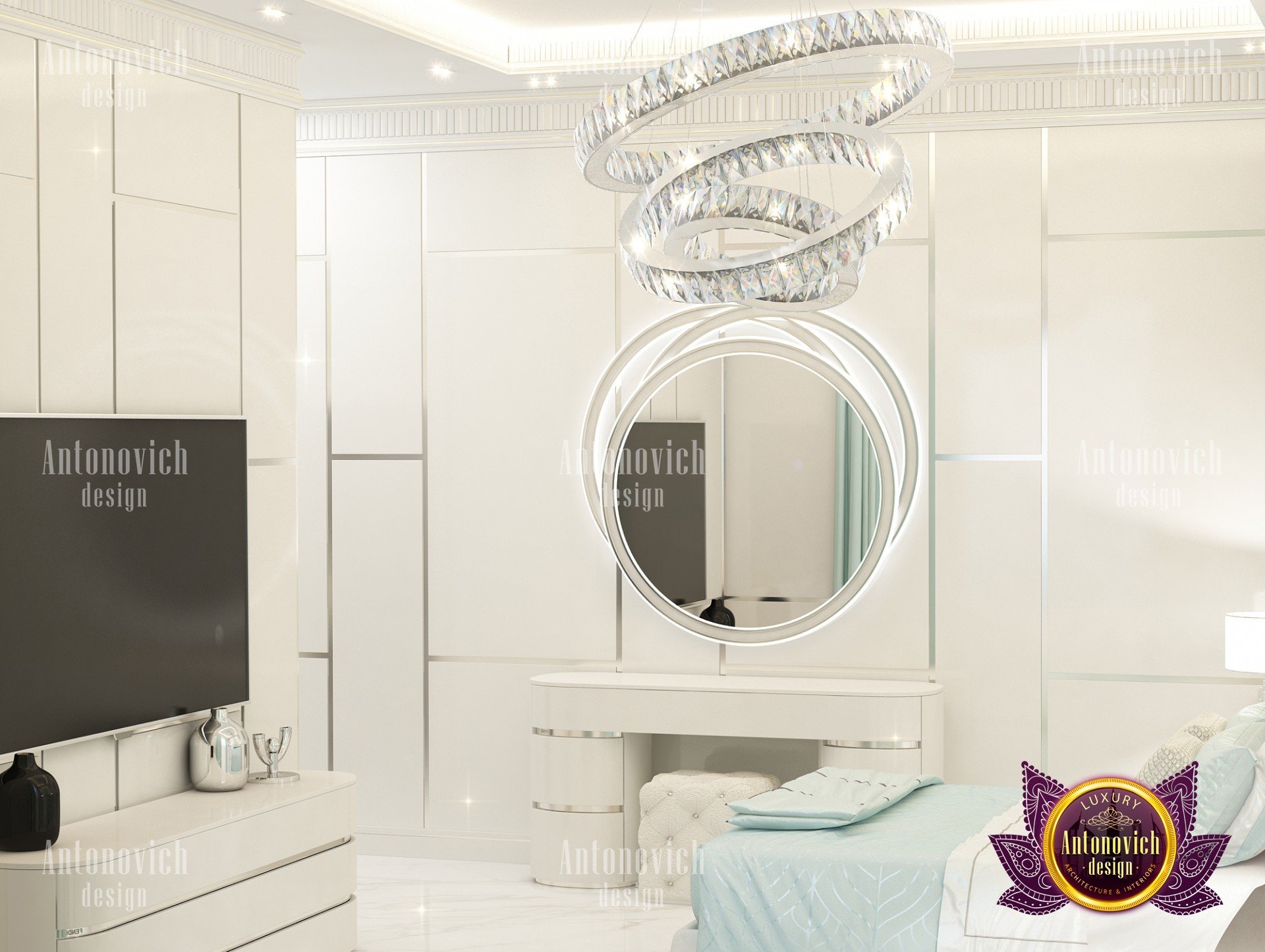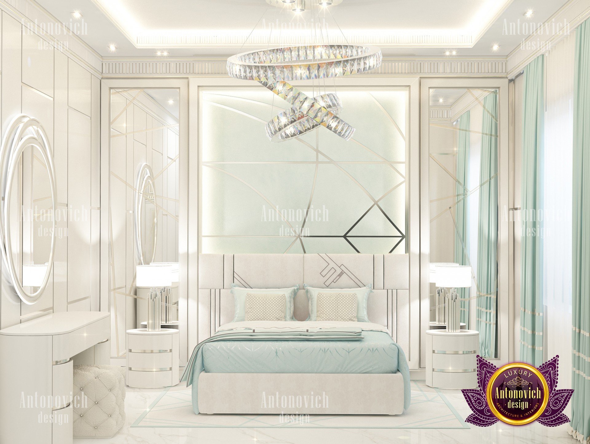 إن الحلول الجريئة والمبتكرة للمصممين في هذا المشروع يوافق تماماً الشخصية الجريئة والغير عادية لأصحاب الشقة. فالعملاء اشتهوا القرارات الجريئة وكانوا مستعدين للتجارب. أصبح تصميم غرفة النوم على الطراز الحديث استمراراً متناغماً للصورة الكاملة للطابق الأول. يتصف تصميم شقق دبي بشخصية معبرة وزاهية ذات شعور رائع بدفء الطبيعة والحلول التصميمية الفعالة في روح توجه التكنولوجيا الحديثة. إن الميل الكبير إلى الفضاء المفتوح الذي تتصف به التصاميم الحديثة لمس غرفة النوم في هذا المشروع. تنفصل غرفة النوم عن غرفة المعيشة بفاصل ذو إدراج من الزجاج النصف شفاف وشريط من الموقد الحديث. وإن عدم وجود الأبواب التقليدية يهيء إلى المشاعر الزاهية واللحظات المغرية. يمثل السرير قطعة الخشب الصلب المستند على قاعدة مخبأة. وتقوم لوحة الجدار الناعمة الممتدة على مساحة الجدار بأكمله بدور اللوح الأمامي للسرير. اللوحة منجدة بمخمل بيجي ناعم وذات إدراجات من الخشب الداكن. هذا الإدراج يتناسق بشكل راقي مع الأرضيات المصنوعة من الخشب ذو القيمة. أما اللوحة ذاتها فتؤكد بأناقة على دفء الراحة المنزلية وكذلك السجاد الرقيق فاتح اللون. وكان الحل الجريء الآخر هو تبديل الثريا التقليدية بخطوط إضاءة الـLED. فالإضاءة الناعمة الزرقاء تحت السرير تصنع مؤثرات انعدام الوزن. يبدو السرير وكأنه يحوم في الفضاء المريح لغرفة النوم الفاخرة.