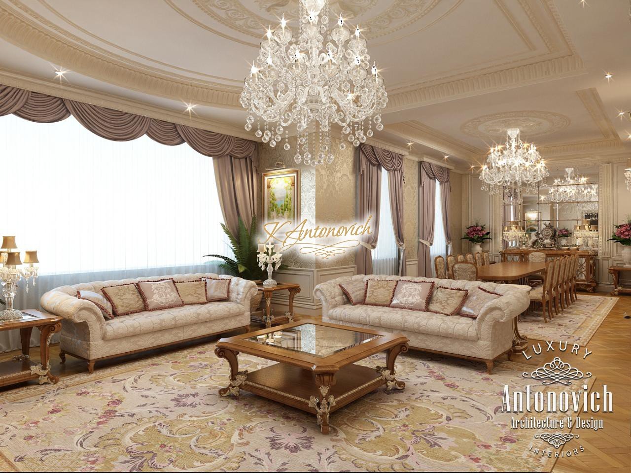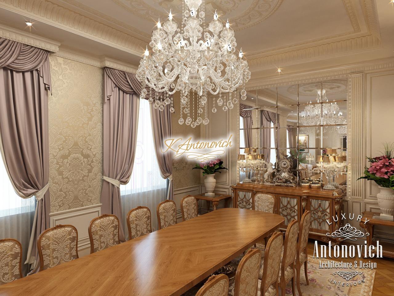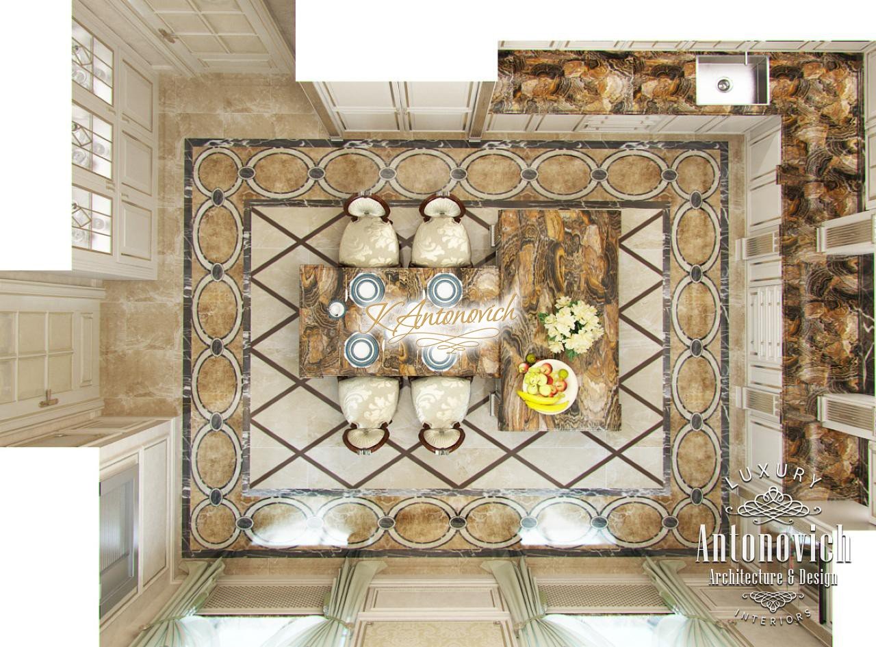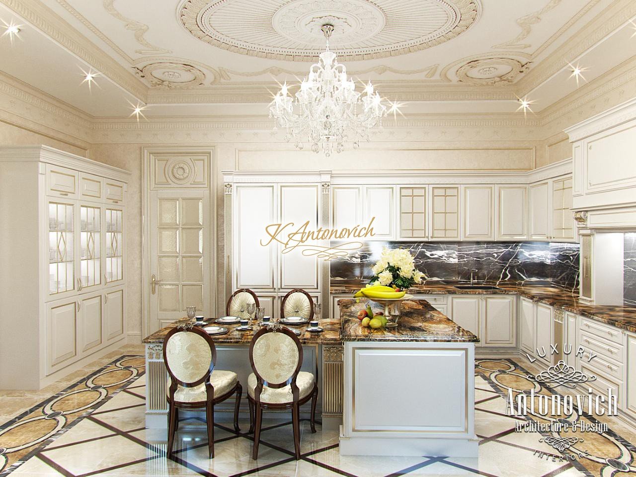 تصميم التصميم الداخلي على النمط الكلاسيكي كانت دائما شعبي على مدى عدة قرون. هذا النمط يعكس تماما المكانة العالية لأصحاب المنازل والشقق وفهمهم العميق للجمال والذوق الرفيع. تصميم التصميم الداخلي في أسلوب الكلاسيكية الحديثة من استوديو التصاميم لاكشري أنطونوفيتش ديزاين حيث في كل مشروع له سمات الجمال الفريدة من نوعها، مع الحفاظ على تقليد النمط الكلاسيكي. مصممي التصميم الداخلي في دبي يكملون دائما تقاليد عناصر الديكور العصرية والإضاءة. تصميم المنزل في دبي يملأ المساحات بشعور دفء الراحة المنزلية و المزاج المشمس. منطقة المطبخ الكبيرة تبدو أكثر اتساعا وأكثر سهولة، وذلك بفضل حقيقة أن هنا تسود مجموعة مشرقة من الألوان. السقف المرتفع بظلال ألوان الكريم يجمع المساحة الفاخرة. التجاعيد الرشيقة لديكور الجص تلعب بتراقص بطريقة توزريع الضوء و الصورة تحت الثريا الكريستال الضخمة و أضواء السقف الخفيفة الصغيرة. الستائر في التصميم الداخلي للمطبخ أصبحت لمسات مشرقة وغنية. معلق على النوافذ الستائر من الحرير الثمين ذو الظل الناعم للون الأخضر ويستكملها ستارة ناعمة بظلال لون الاخضر الغني. الأرضية الفاخرة من الرخام الطبيعي المزينة بالأنماط المنحوتة الرائعة. تكمل واجهات المطبخ الأثاث في لون الكريمي لأسطح العمل من الرخام الأسود. هذا التباين يصبح أكثر تعبيرا بسبب خطوط الإضاءة المخفية .
