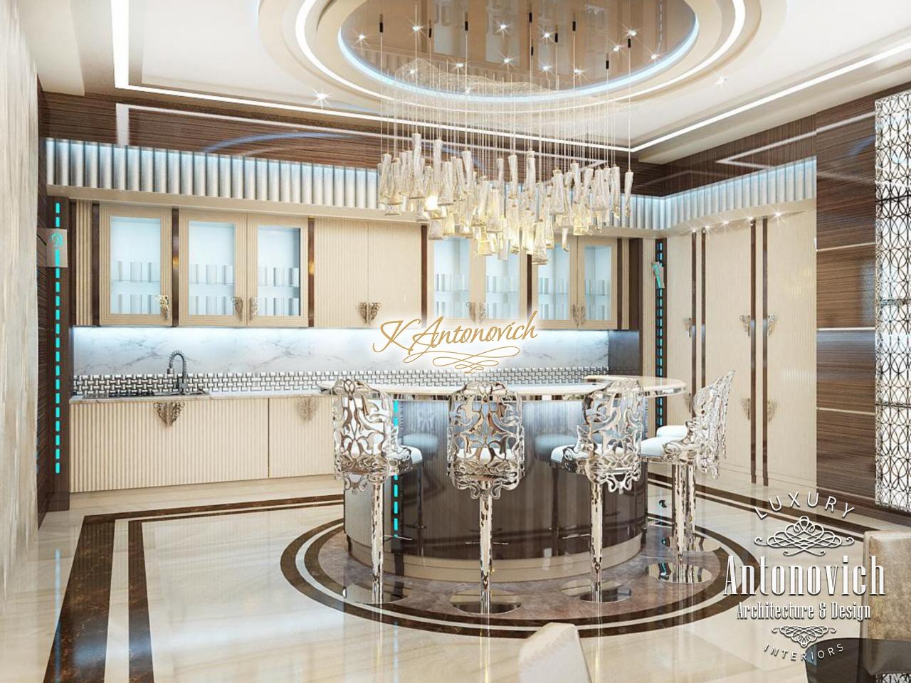 النمط الحديث و نمط آرت ديكو يتشابكان بدقة في هذا المشروع المؤلف للتصميم الداخلي للشقة في دبي. ترف الحقبة المقبلة يطرحها مصممي الديكور الداخلي لاكشري أنطونوفيتش ديزاين التصميم هو الأناقة، والروعة وولادة نمط جديد في تصميم التصاميم الداخلية. تصميم مطبخ دبي مليء بالقرارات المؤلفة المذهلة. مؤلفو المشروع التقطوا بدقة زخارف تصميم غرفة الجلوس ونقلوها إلى التصميم الداخلي للمطبخ. يذهل ويسر ديكور السقف. الثريا المؤلفة الأصلية هي ثريا مصنوعة من معلقات من الكريستال على أسلاك نحيفة. الوهم الجميل لانعدام الوزن يجعل هذا الجزء من التصميم الداخلي للمطبخ الداخلية صورة مثالية فريدة من نوعها تماما. ويحيط الثريا قبة دائرية مع خط من الضوء الأزرق الخفيف وعنصر مشدود بلون الشوكولاته. ديكور السقف يلتقط دوافع ديكور الأرضيات. محيط دائرة الشكل الصحيح منحوت من الرخام بالظل البني يحدد الرف الشريطي النصف الدائري. التصميم الداخلي البارز أصبحت الكراسي العالية من الصلب مع ظهورهم المخرمة المنحوتة. لديكور الجداران فإن مصممي الديكور الداخلي في دبي يستخدمون الأنواع الغالية من الخشب، والتي هي مغطاة بالورنيش. على هذه الخلفية تبدو الواجهات الرائعة للمطبخ باللون الكريمي مع عناصر الأجهزة الرائعة على التباين الساحر. تصميم مطبخ دبي أنيق وببساطة ينسجم مع التصميم الداخلي للشقة الفاخرة. تصميم المشروع يؤكد الاحترام والأصالة للمالكين.