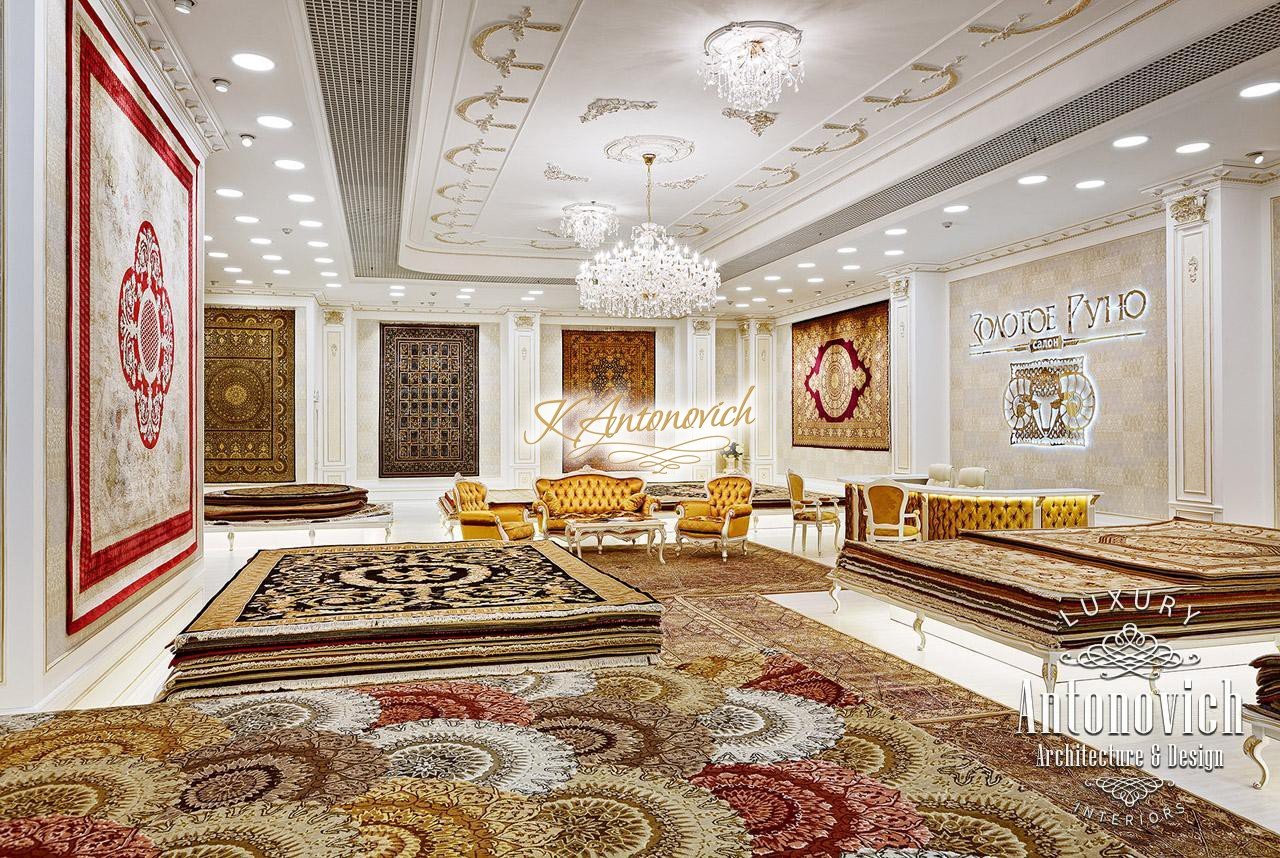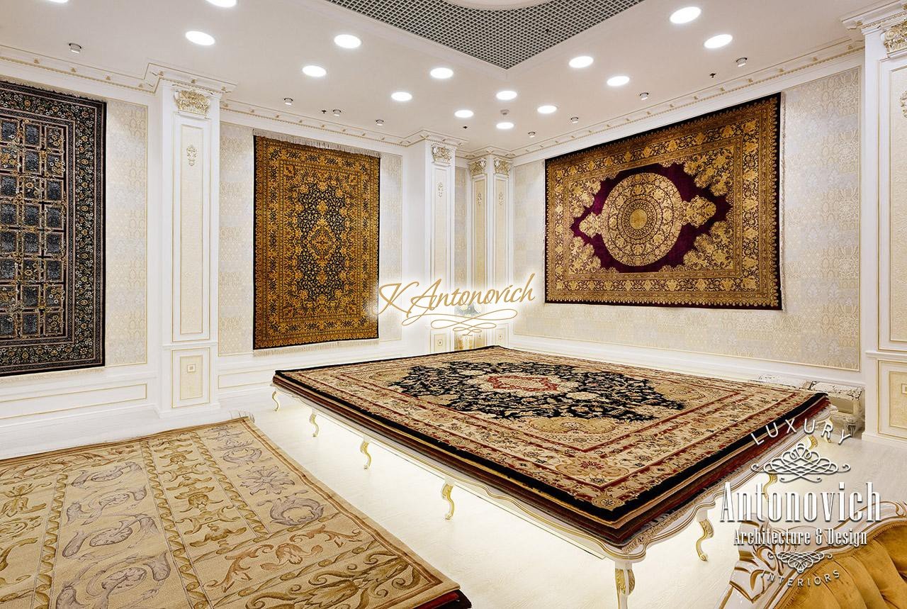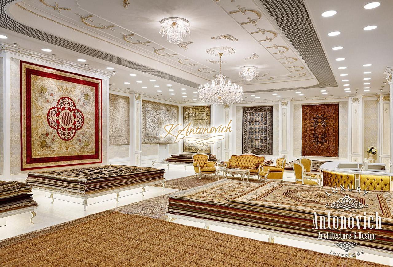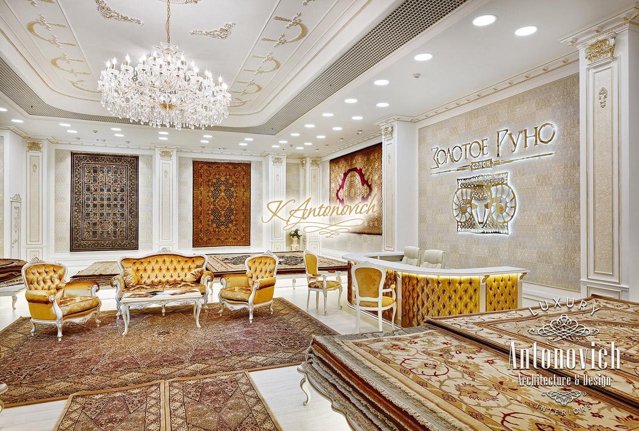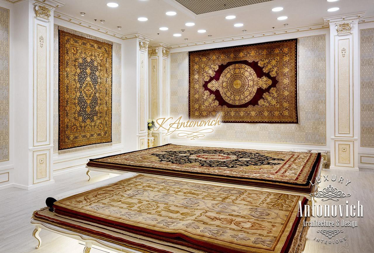 التصميم الفاخر للتصاميم الداخلية في دولة الإمارات العربية المتحدة من الاستوديو يؤكد تماما الغرض من الأماكن، ورؤيتهم والاتجاه. المشروع المؤلف لصالون السجاد الفاخر أصبح الداخلية قطع المنتجات الفاخرة. مصممين التصميم الداخلي في دبي نظموا تماما مساحة التصميم الداخلي. في المشروع سلطوا الضوء ببراعة على أهم شيء، السجاد الفاخر. وبذلك أنشأووا التصميم الداخلي والذي فيه يشعر كلا من المشترين والمديرين بالدفء والراحة. ويرتبط التصميم الداخلي ارتباطا وثيقا بمفهوم العلامة التجارية. هذا يسلط الضوء على الاستقبال الفاخر، والمزين بلوحة ناعمة باللون الذهبي مع علامة زرقاء. الأثاث المنجد يتناغم بشكل كامل مع عنصر الديكور. ويزين السقف العالي في المنتصف الثريا الأنيقة من الكريستال تحيط بها الدوامات الأنيقة من الزخارف الجصية. حول محيط السقف من أجل التأكيد على مزايا المنتجات وضع المصممين التصميم الداخلي أضواء دائرية للسقف. في ديكور الجدران أعمدة ناصعة البياض رائعة مطلية على الإطار بلون الذهب ألمع الخيارات المنتج. وهكذا، كل سجادة تشبه لوحة لفنان عظيم. و الإضاءة الإضافية تتيح للعملاء التمتع الكامل بجمال المنتج وتقييمه. كما يليق السجاد بالصالون في ديكورالأرضيات تحضر منتجات السجاد الفاخر. هذه اللحظة تملأ التصميم الداخلي بشعور لطيفا من دفء الراحة المنزلية. التصميم الداخلي في دبي – انه دائما مزيج متناغم من الفخامة والأداء الوظيفي. وكان الحل الرائع والمشرق رفع البضائع على الموائد الواسعة على الأرجل المنحنية بأمان.