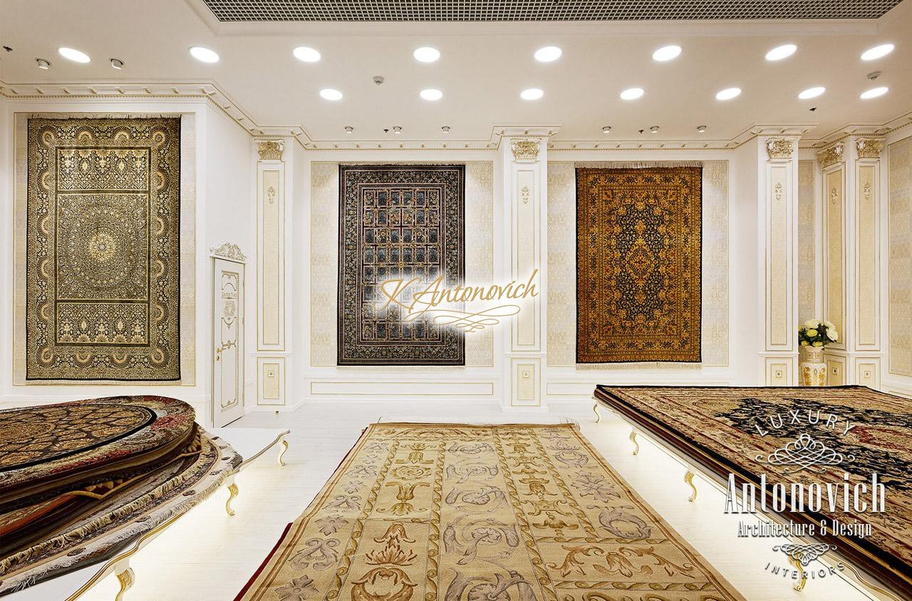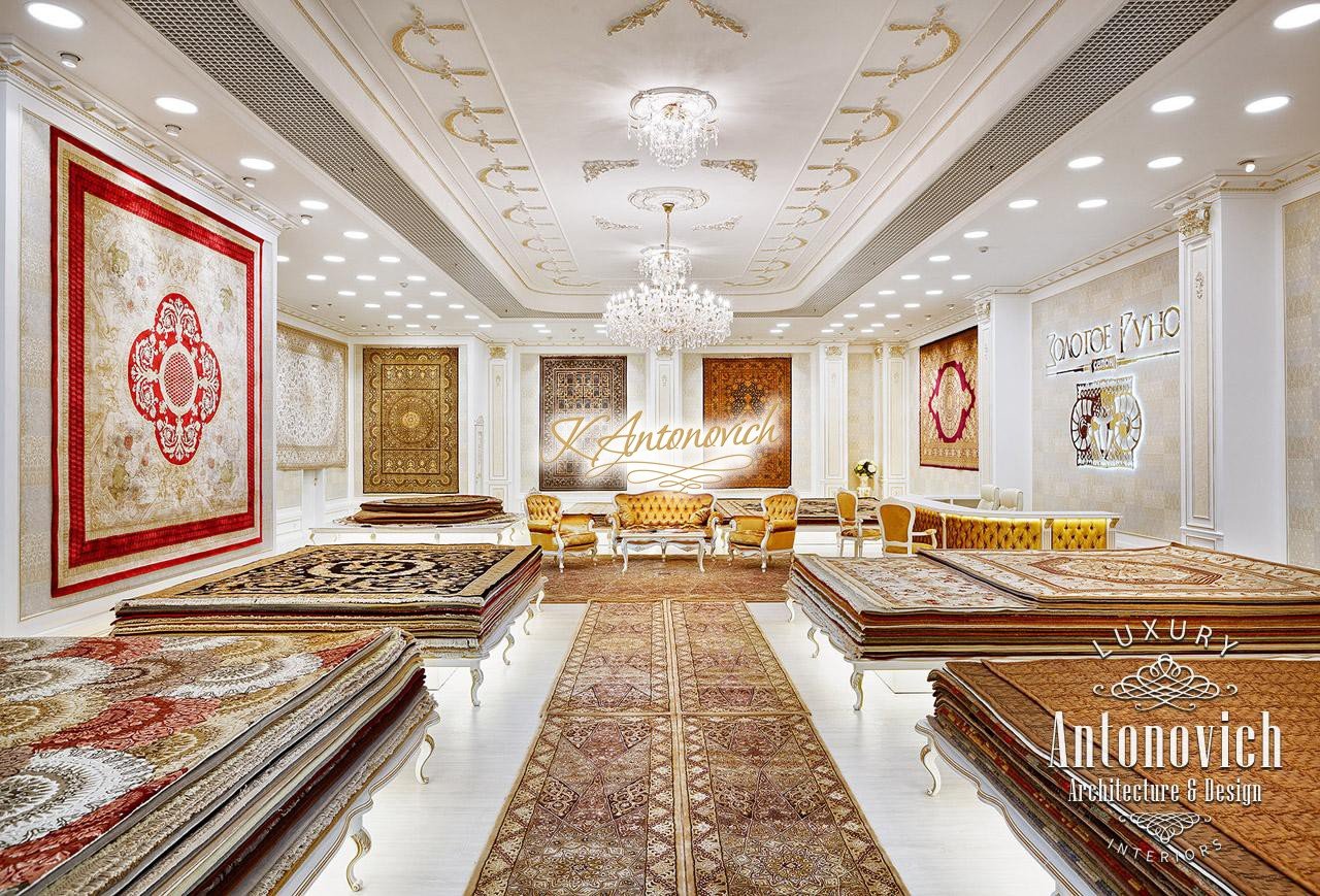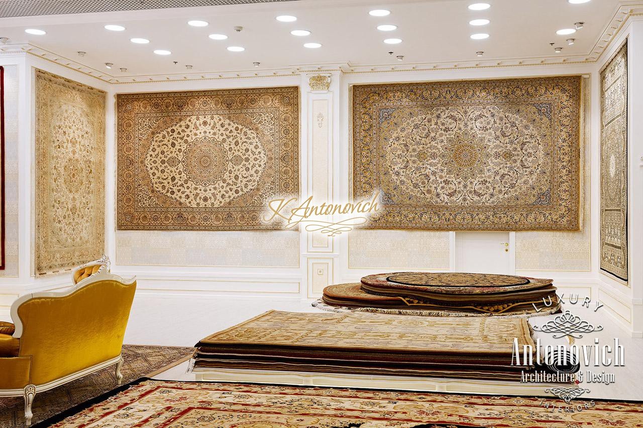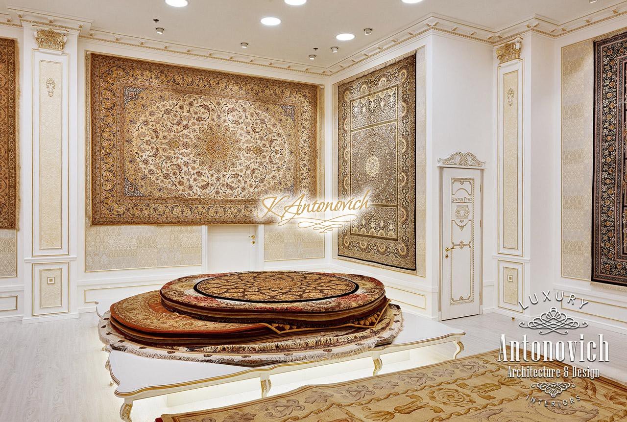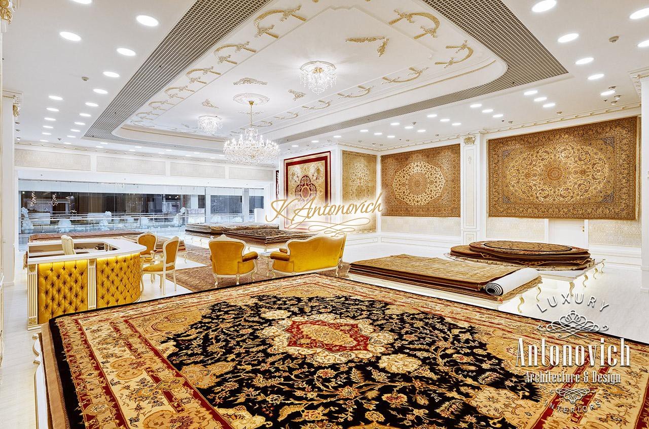 التصميم الفاخر للتصاميم الداخلية في دولة الإمارات العربية المتحدة من الاستوديو يؤكد تماما الغرض من الأماكن، ورؤيتهم والاتجاه. المشروع المؤلف لصالون السجاد الفاخر أصبح الداخلية قطع المنتجات الفاخرة. مصممين التصميم الداخلي في دبي نظموا تماما مساحة التصميم الداخلي. في المشروع سلطوا الضوء ببراعة على أهم شيء، السجاد الفاخر. وبذلك أنشأووا التصميم الداخلي والذي فيه يشعر كلا من المشترين والمديرين بالدفء والراحة. ويرتبط التصميم الداخلي ارتباطا وثيقا بمفهوم العلامة التجارية. هذا يسلط الضوء على الاستقبال الفاخر، والمزين بلوحة ناعمة باللون الذهبي مع علامة زرقاء. الأثاث المنجد يتناغم بشكل كامل مع عنصر الديكور. ويزين السقف العالي في المنتصف الثريا الأنيقة من الكريستال تحيط بها الدوامات الأنيقة من الزخارف الجصية. حول محيط السقف من أجل التأكيد على مزايا المنتجات وضع المصممين التصميم الداخلي أضواء دائرية للسقف. في ديكور الجدران أعمدة ناصعة البياض رائعة مطلية على الإطار بلون الذهب ألمع الخيارات المنتج. وهكذا، كل سجادة تشبه لوحة لفنان عظيم. و الإضاءة الإضافية تتيح للعملاء التمتع الكامل بجمال المنتج وتقييمه. كما يليق السجاد بالصالون في ديكورالأرضيات تحضر منتجات السجاد الفاخر. هذه اللحظة تملأ التصميم الداخلي بشعور لطيفا من دفء الراحة المنزلية. التصميم الداخلي في دبي – انه دائما مزيج متناغم من الفخامة والأداء الوظيفي. وكان الحل الرائع والمشرق رفع البضائع على الموائد الواسعة على الأرجل المنحنية بأمان.