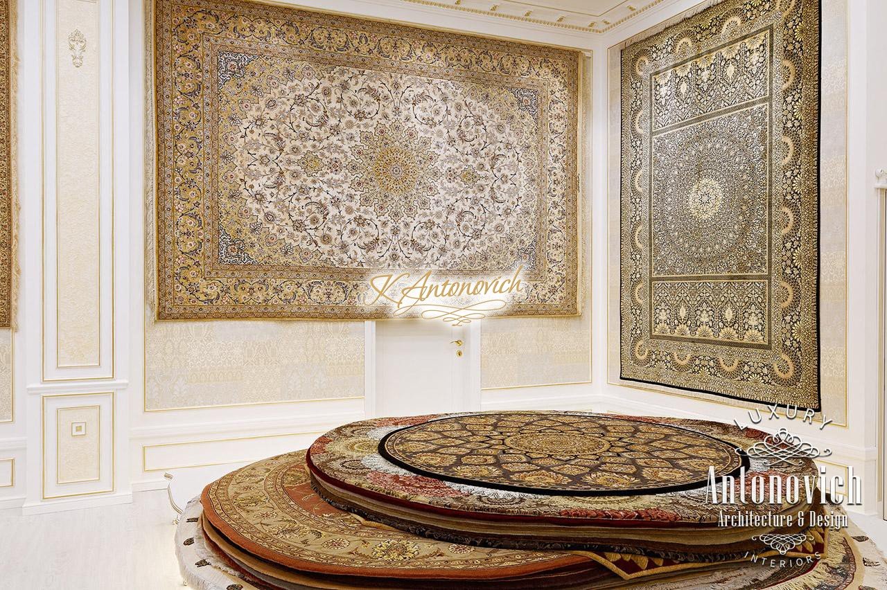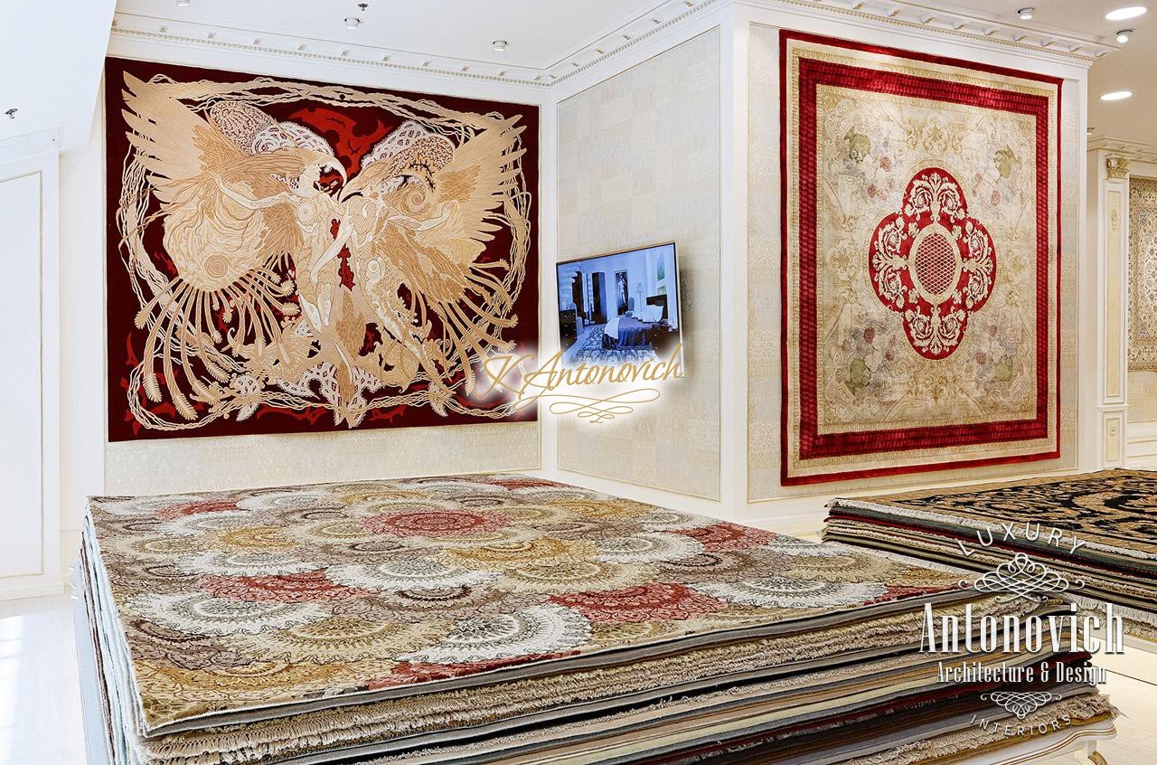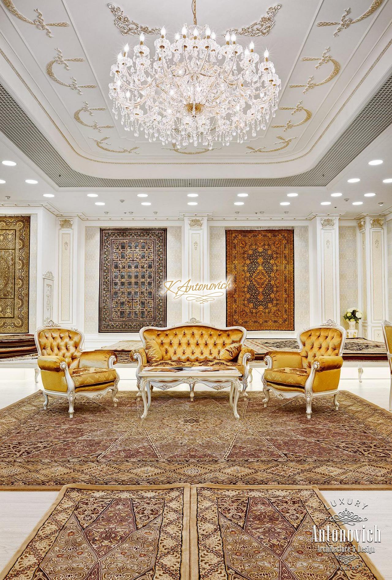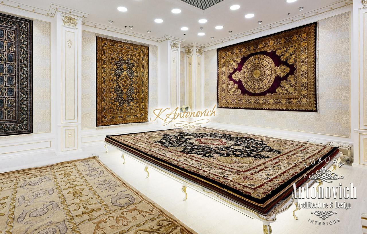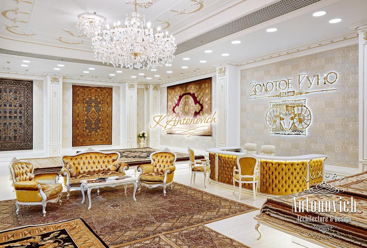 التصميم الفاخر للتصاميم الداخلية في دولة الإمارات العربية المتحدة من الاستوديو يؤكد تماما الغرض من الأماكن، ورؤيتهم والاتجاه. المشروع المؤلف لصالون السجاد الفاخر أصبح الداخلية قطع المنتجات الفاخرة. مصممين التصميم الداخلي في دبي نظموا تماما مساحة التصميم الداخلي. في المشروع سلطوا الضوء ببراعة على أهم شيء، السجاد الفاخر. وبذلك أنشأووا التصميم الداخلي والذي فيه يشعر كلا من المشترين والمديرين بالدفء والراحة. ويرتبط التصميم الداخلي ارتباطا وثيقا بمفهوم العلامة التجارية. هذا يسلط الضوء على الاستقبال الفاخر، والمزين بلوحة ناعمة باللون الذهبي مع علامة زرقاء. الأثاث المنجد يتناغم بشكل كامل مع عنصر الديكور. ويزين السقف العالي في المنتصف الثريا الأنيقة من الكريستال تحيط بها الدوامات الأنيقة من الزخارف الجصية. حول محيط السقف من أجل التأكيد على مزايا المنتجات وضع المصممين التصميم الداخلي أضواء دائرية للسقف. في ديكور الجدران أعمدة ناصعة البياض رائعة مطلية على الإطار بلون الذهب ألمع الخيارات المنتج. وهكذا، كل سجادة تشبه لوحة لفنان عظيم. و الإضاءة الإضافية تتيح للعملاء التمتع الكامل بجمال المنتج وتقييمه. كما يليق السجاد بالصالون في ديكورالأرضيات تحضر منتجات السجاد الفاخر. هذه اللحظة تملأ التصميم الداخلي بشعور لطيفا من دفء الراحة المنزلية. التصميم الداخلي في دبي – انه دائما مزيج متناغم من الفخامة والأداء الوظيفي. وكان الحل الرائع والمشرق رفع البضائع على الموائد الواسعة على الأرجل المنحنية بأمان.