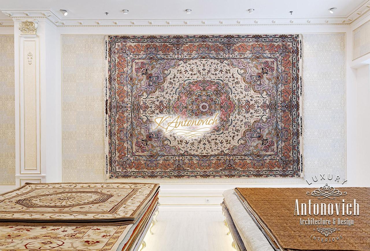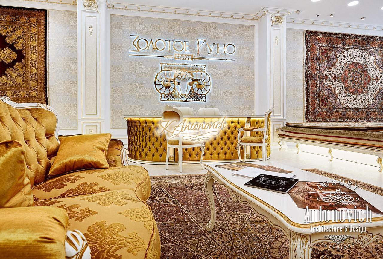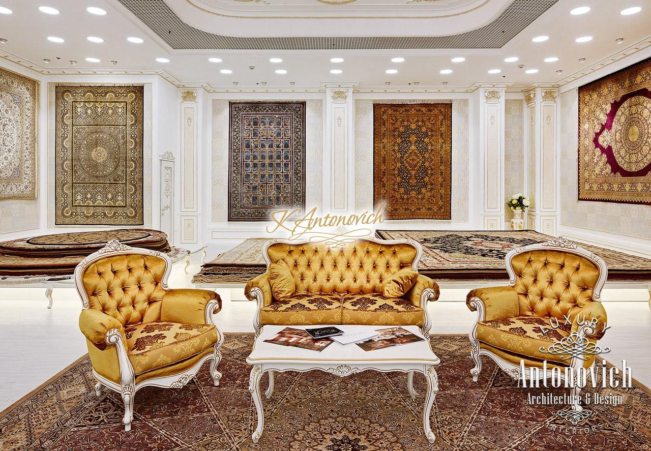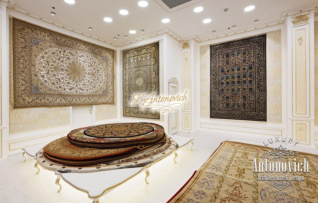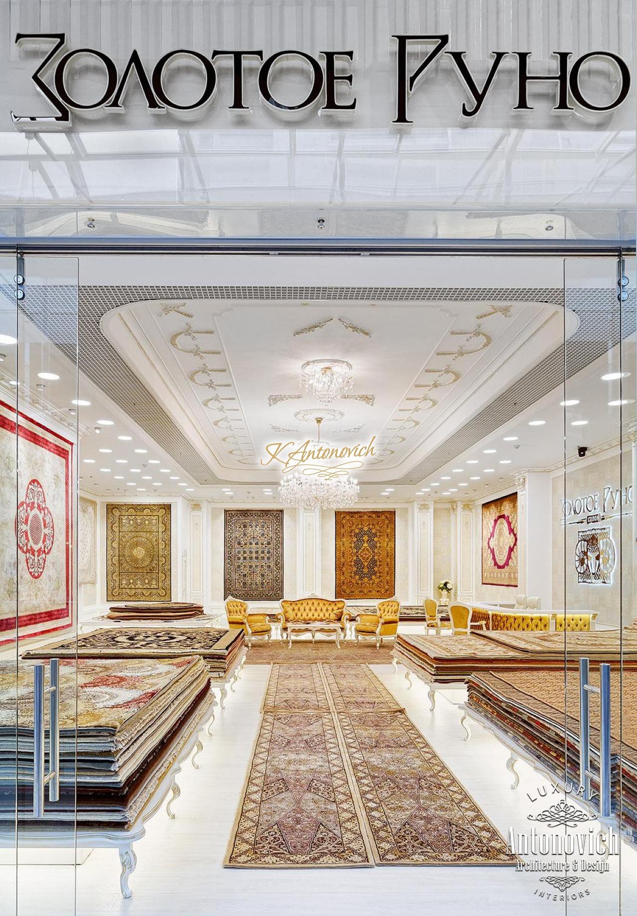 التصميم الفاخر للتصاميم الداخلية في دولة الإمارات العربية المتحدة من الاستوديو يؤكد تماما الغرض من الأماكن، ورؤيتهم والاتجاه. المشروع المؤلف لصالون السجاد الفاخر أصبح الداخلية قطع المنتجات الفاخرة. مصممين التصميم الداخلي في دبي نظموا تماما مساحة التصميم الداخلي. في المشروع سلطوا الضوء ببراعة على أهم شيء، السجاد الفاخر. وبذلك أنشأووا التصميم الداخلي والذي فيه يشعر كلا من المشترين والمديرين بالدفء والراحة. ويرتبط التصميم الداخلي ارتباطا وثيقا بمفهوم العلامة التجارية. هذا يسلط الضوء على الاستقبال الفاخر، والمزين بلوحة ناعمة باللون الذهبي مع علامة زرقاء. الأثاث المنجد يتناغم بشكل كامل مع عنصر الديكور. ويزين السقف العالي في المنتصف الثريا الأنيقة من الكريستال تحيط بها الدوامات الأنيقة من الزخارف الجصية. حول محيط السقف من أجل التأكيد على مزايا المنتجات وضع المصممين التصميم الداخلي أضواء دائرية للسقف. في ديكور الجدران أعمدة ناصعة البياض رائعة مطلية على الإطار بلون الذهب ألمع الخيارات المنتج. وهكذا، كل سجادة تشبه لوحة لفنان عظيم. و الإضاءة الإضافية تتيح للعملاء التمتع الكامل بجمال المنتج وتقييمه. كما يليق السجاد بالصالون في ديكورالأرضيات تحضر منتجات السجاد الفاخر. هذه اللحظة تملأ التصميم الداخلي بشعور لطيفا من دفء الراحة المنزلية. التصميم الداخلي في دبي – انه دائما مزيج متناغم من الفخامة والأداء الوظيفي. وكان الحل الرائع والمشرق رفع البضائع على الموائد الواسعة على الأرجل المنحنية بأمان.