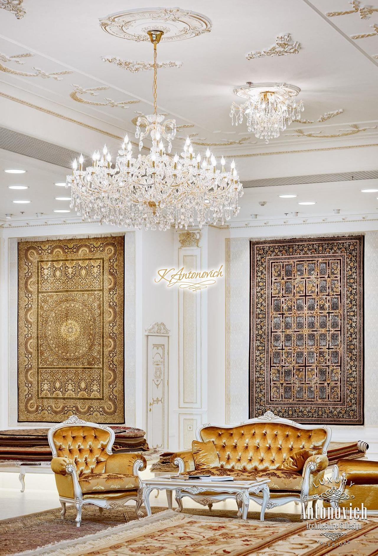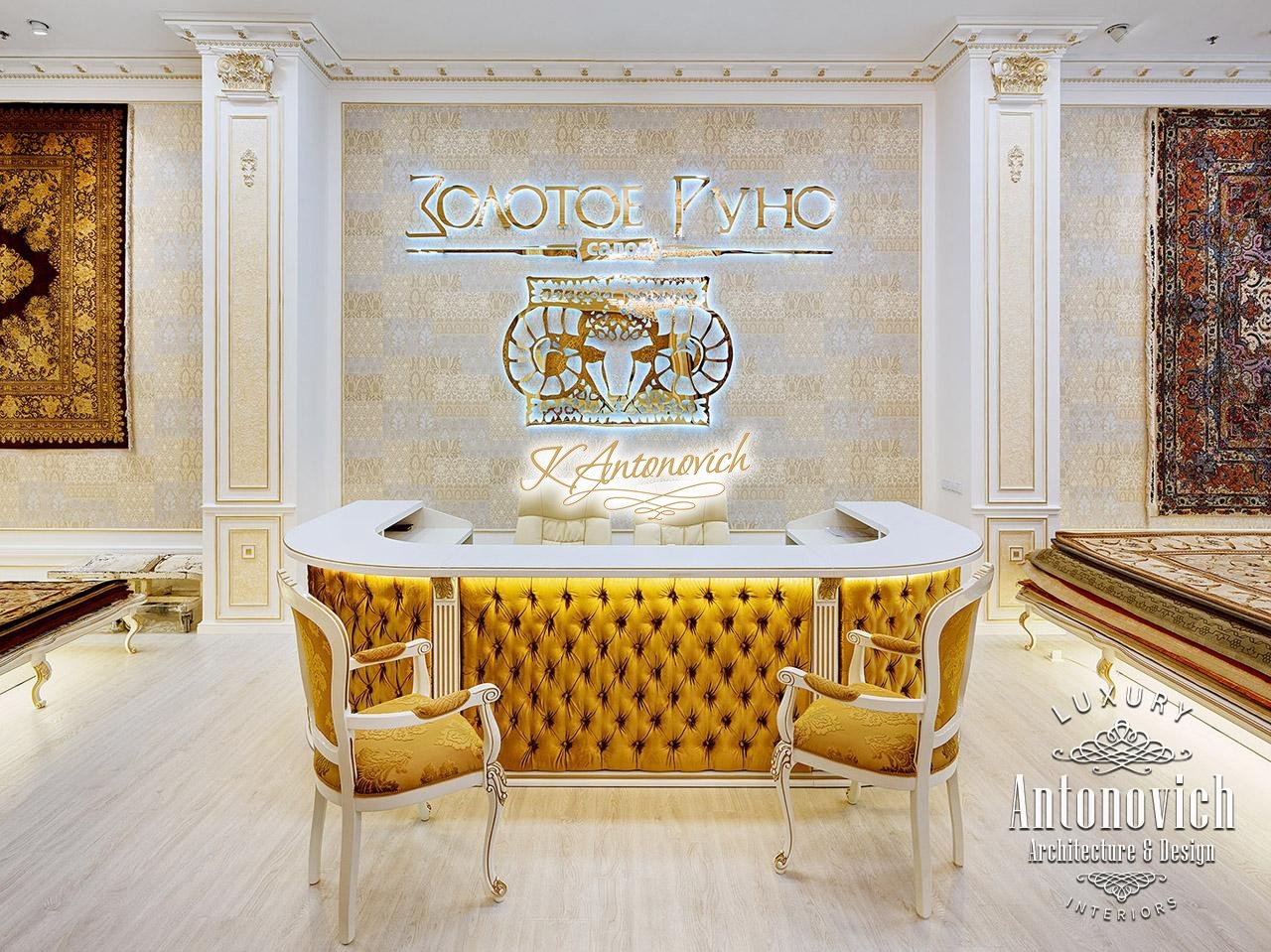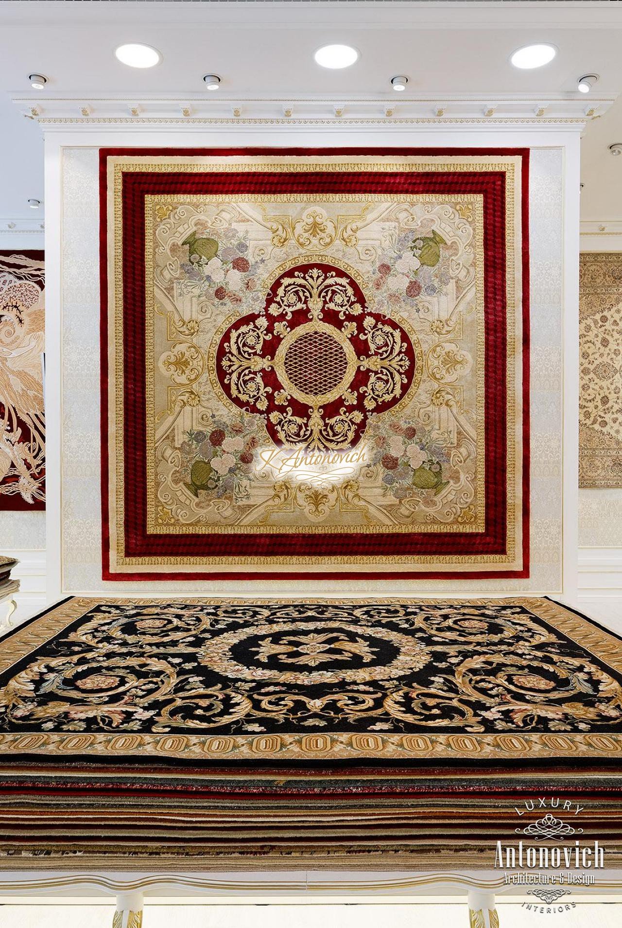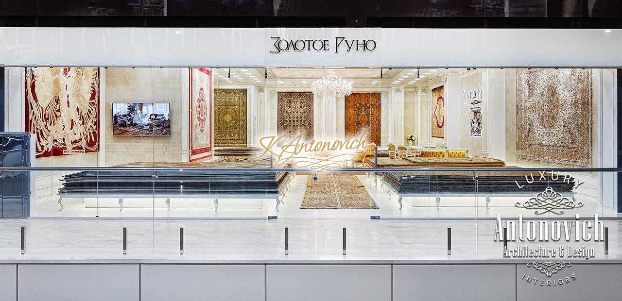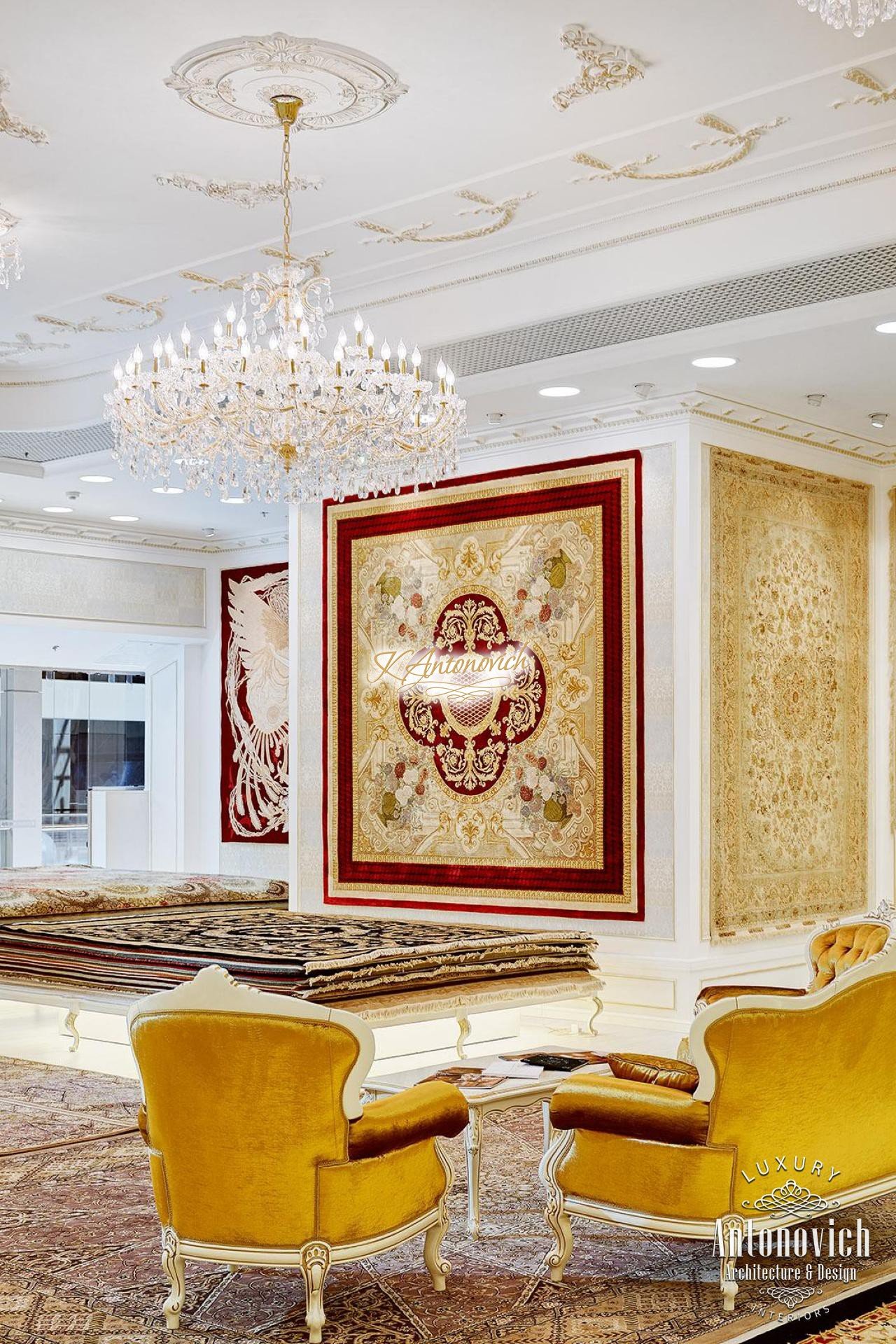 التصميم الفاخر للتصاميم الداخلية في دولة الإمارات العربية المتحدة من الاستوديو يؤكد تماما الغرض من الأماكن، ورؤيتهم والاتجاه. المشروع المؤلف لصالون السجاد الفاخر أصبح الداخلية قطع المنتجات الفاخرة. مصممين التصميم الداخلي في دبي نظموا تماما مساحة التصميم الداخلي. في المشروع سلطوا الضوء ببراعة على أهم شيء، السجاد الفاخر. وبذلك أنشأووا التصميم الداخلي والذي فيه يشعر كلا من المشترين والمديرين بالدفء والراحة. ويرتبط التصميم الداخلي ارتباطا وثيقا بمفهوم العلامة التجارية. هذا يسلط الضوء على الاستقبال الفاخر، والمزين بلوحة ناعمة باللون الذهبي مع علامة زرقاء. الأثاث المنجد يتناغم بشكل كامل مع عنصر الديكور. ويزين السقف العالي في المنتصف الثريا الأنيقة من الكريستال تحيط بها الدوامات الأنيقة من الزخارف الجصية. حول محيط السقف من أجل التأكيد على مزايا المنتجات وضع المصممين التصميم الداخلي أضواء دائرية للسقف. في ديكور الجدران أعمدة ناصعة البياض رائعة مطلية على الإطار بلون الذهب ألمع الخيارات المنتج. وهكذا، كل سجادة تشبه لوحة لفنان عظيم. و الإضاءة الإضافية تتيح للعملاء التمتع الكامل بجمال المنتج وتقييمه. كما يليق السجاد بالصالون في ديكورالأرضيات تحضر منتجات السجاد الفاخر. هذه اللحظة تملأ التصميم الداخلي بشعور لطيفا من دفء الراحة المنزلية. التصميم الداخلي في دبي – انه دائما مزيج متناغم من الفخامة والأداء الوظيفي. وكان الحل الرائع والمشرق رفع البضائع على الموائد الواسعة على الأرجل المنحنية بأمان.