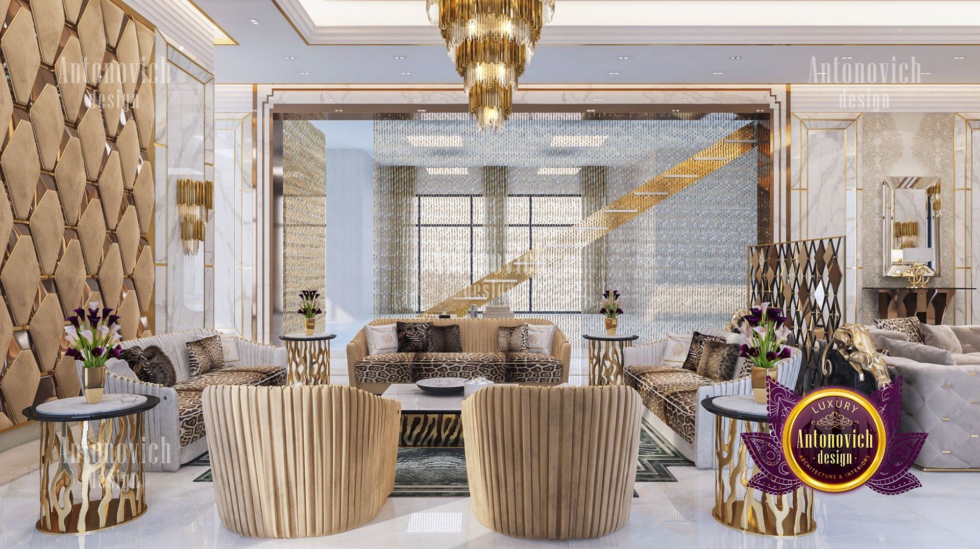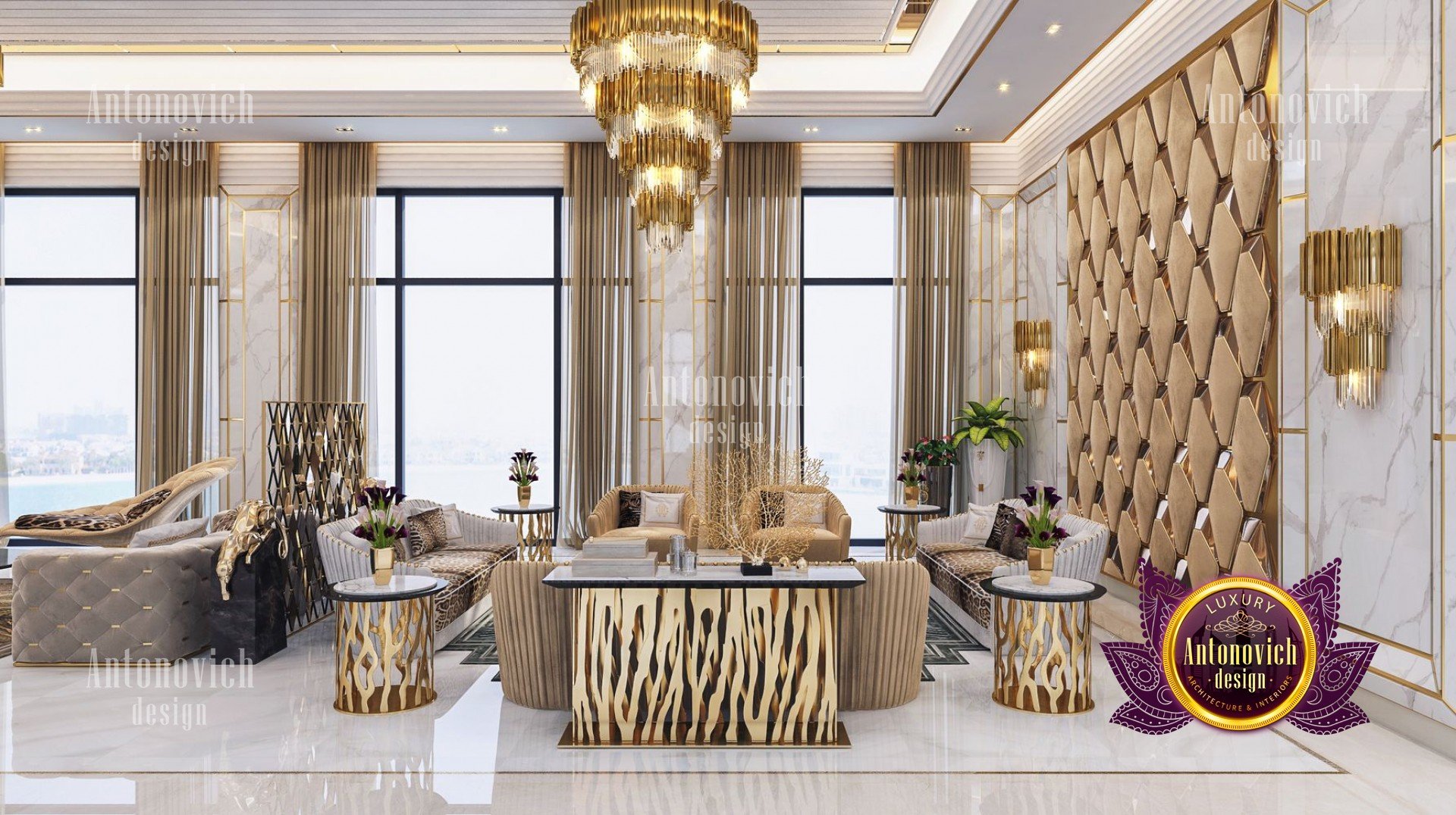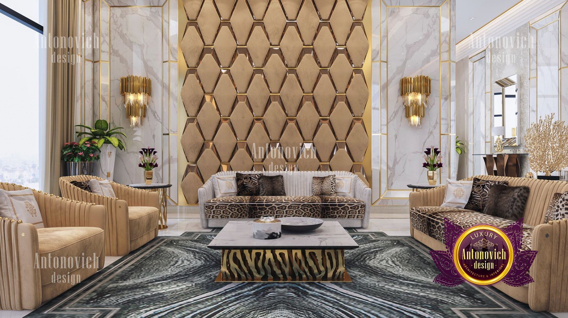 ما الذي يجعل غرفة المعيشة راقية؟ هل هو اللون؟ الاثاث؟ الثريا؟ يعتقد فريقنا أن كل هذه الأشياء ضرورية في بناء غرفة نوم مصقولة ومصممة جيدًا. يتم أخذ هذه العناصر في الاعتبار حتى تبدو غرفة المعيشة الخاصة بك أكثر حيوية وأناقة. إنه المكان الذي تستمتع فيه بالضيوف ويكون بمثابة منطقة استقبال في منزلك. يتأكد فريقنا من أننا نقدم لمنزلك الجمال الذي سيعكس شخصيتك. الفخامة هي الكلمة لوصف غرفة المعيشة هذه. تضبط نغماته الفخمة المزاج بينما الأرضية الرخامية والثريا الكريستالية هي الخيارات المثالية للقطع التكميلية. ستلاحظ الوسادة المنجدة باللون الرمادي وهو لون محايد يوازن جماليات الغرفة. تضفي لمسات الألوان الداكنة مظهرًا راقيًا بذهبي ساحر. يلفت الجدار اللامع على شكل قرص العسل الأنظار على الفور ، بينما تخلق البطانات الذهبية على الجدران الرخامية لمسة نهائية مذهلة. هذا يخلق تفاصيل معدنية سرية تضيف لهجة مذهلة.