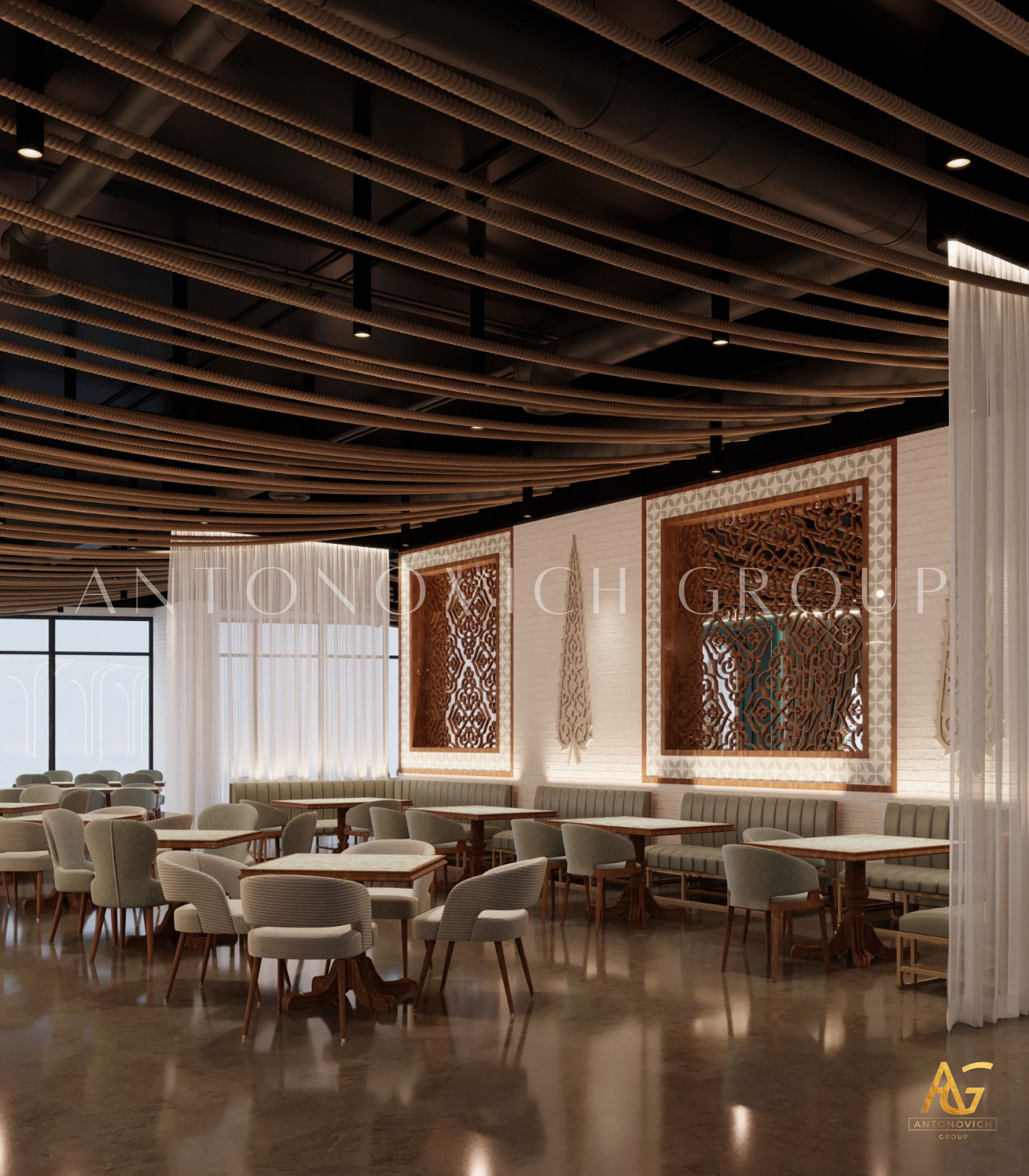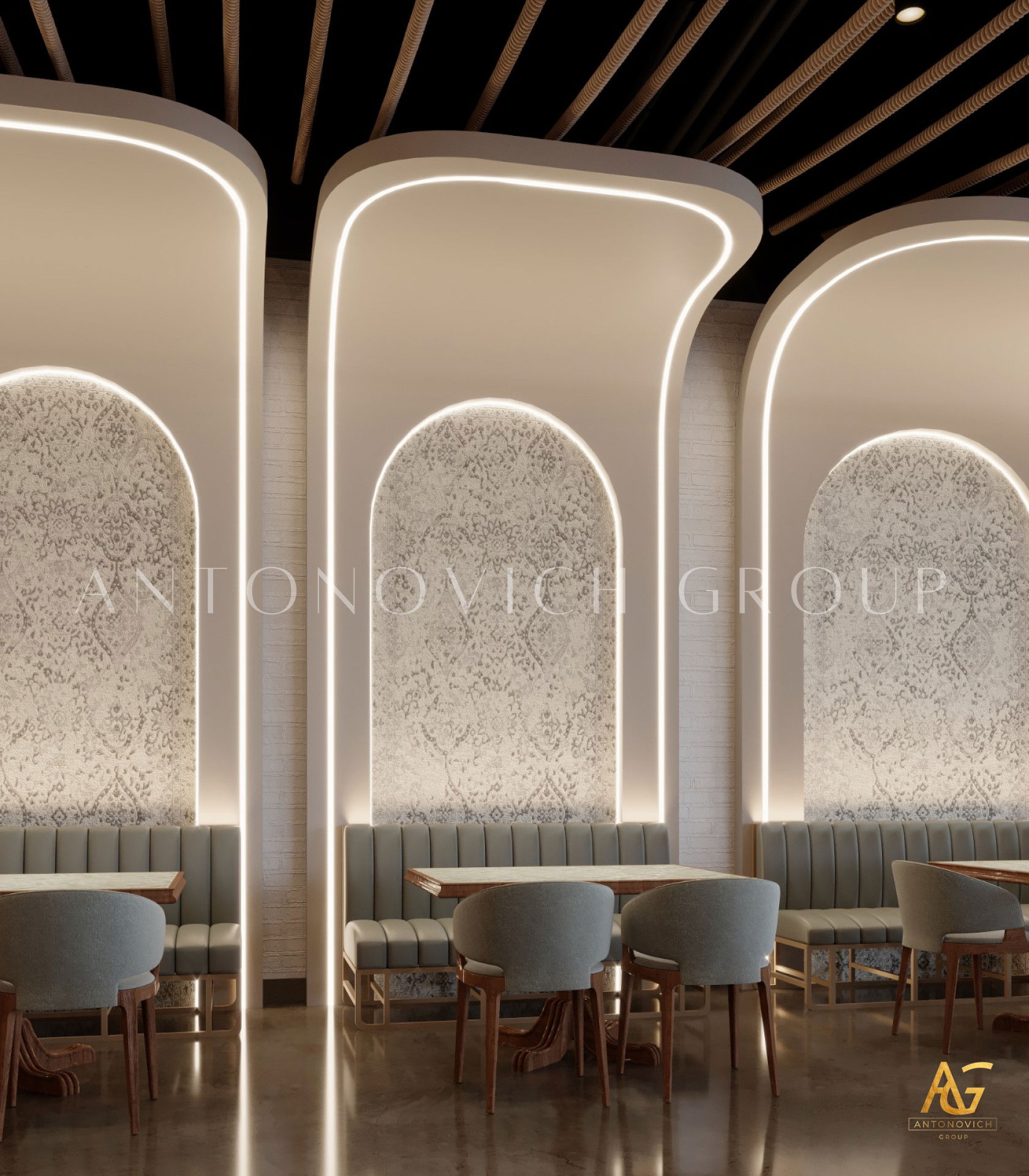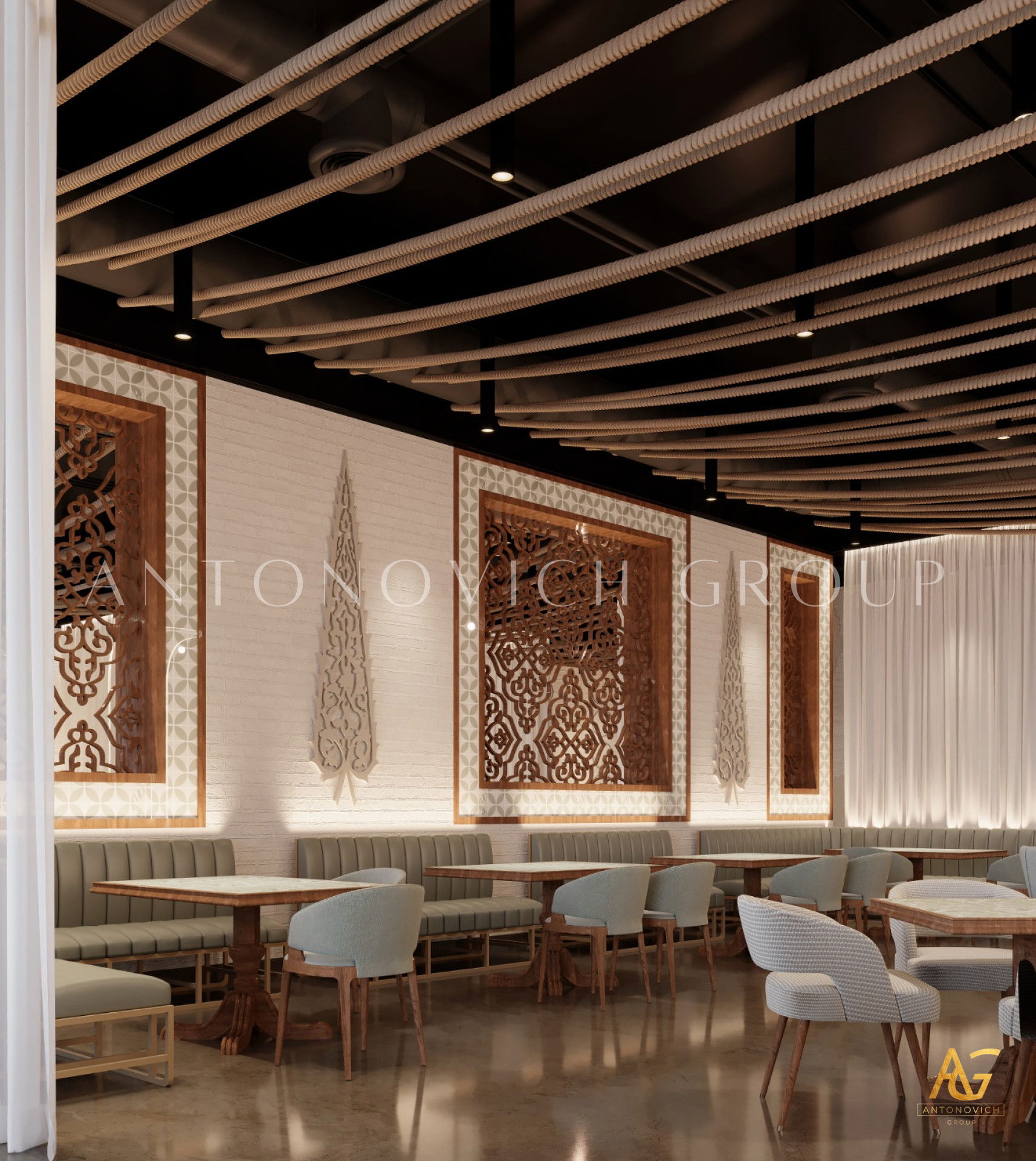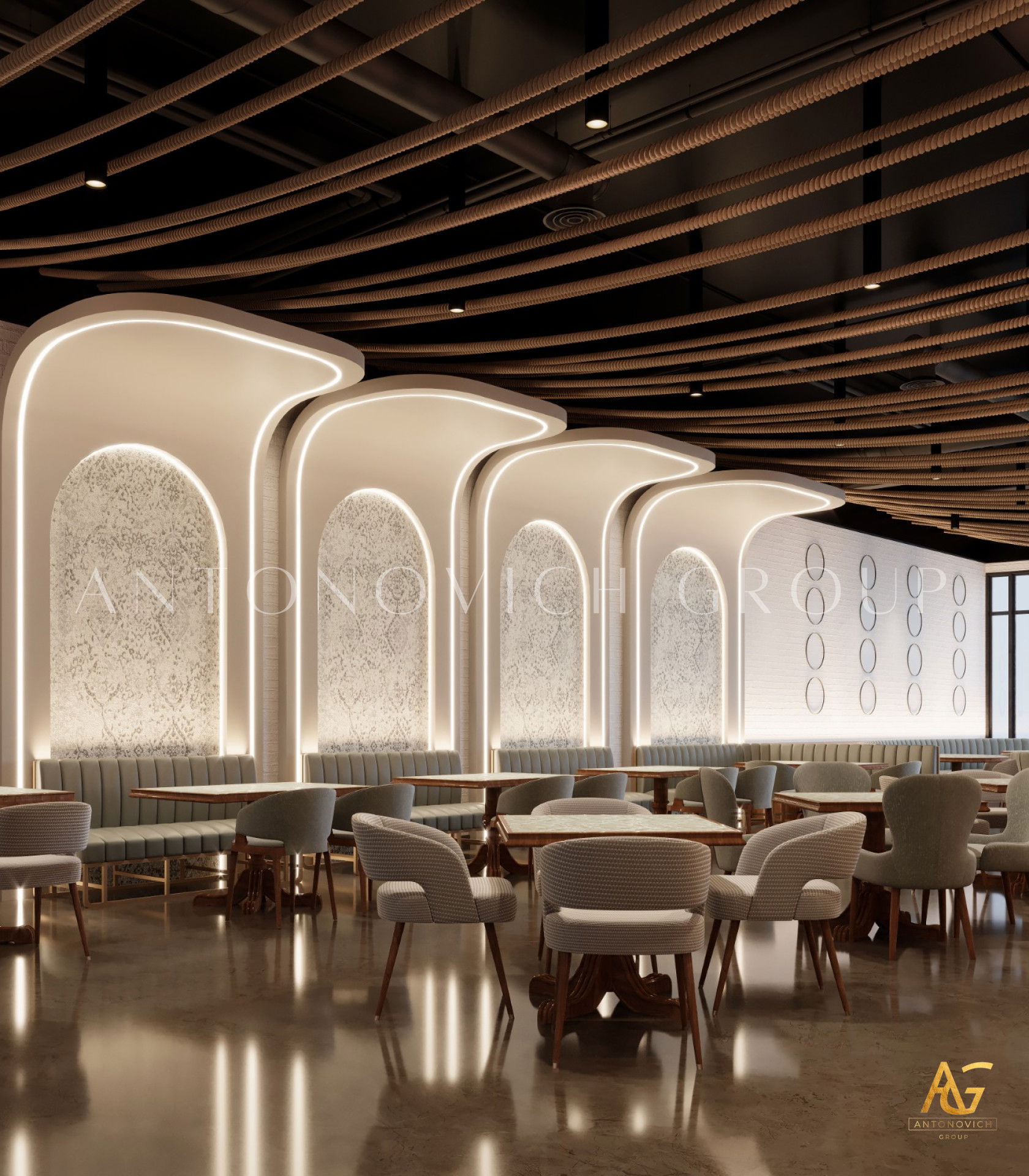 يتميز هذا التصميم الداخلي الرائع للمطعم المذهل بالالوان البنفسجي والذهبي والكريمي وبأنماط زخرفية تفوق الخيال ، فإنه مزيج ممتاز لمطعم مذهل. نرى الأرضيات مبلطة بأسلوب فاخر مع تصميمات شوهدت حصريًا في لاكشري أنتونوفيتش ديزاين ، أفضل شركة لتصميم المطاعم في دبي. ان الموضوع العام لتصميم المطعم هو الفخامة العصرية. وتظهر ديكورات الجدران المجردة في المنتج النهائي ، وهو عبارة عن طين مصنوع يدويًا مذهلًا والذي ستستمتع به. يحتوي هذا التصميم على منضدات والتي تحتوي على لوح أمامي جميل يكمل المظهر العام للمطعم. ان هذا التصميم جميل ومتطور لديكور المطعم الحديث. الأرضيات ذات ملمس جميل. إن هذه هي أفضل فكرة ديكور للمطعم جميلة والتي تتميز بالهدوء والأناقة ويشمل التصميم الداخلي الكامل للمطعم كل ما تحتاجه فانه يتميز بالعناصر المتلألئة في جميع أنحاء التصميم الداخلي المذهل للمطعم. وقد اختارت لاكشري انتونوفيتش ديزاين ، أفضل شركة لتصميم المطاعم في دبي ، اللون البني الرائع لهذا التصميم الداخلي للمطعم الفخم لأنه أفضل لون للإحساس بالفخامة.