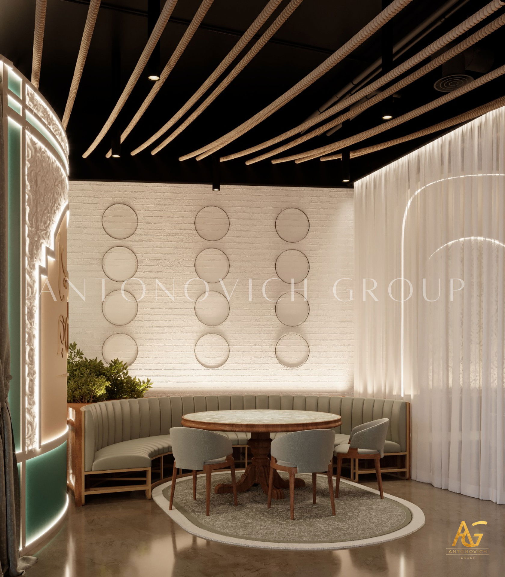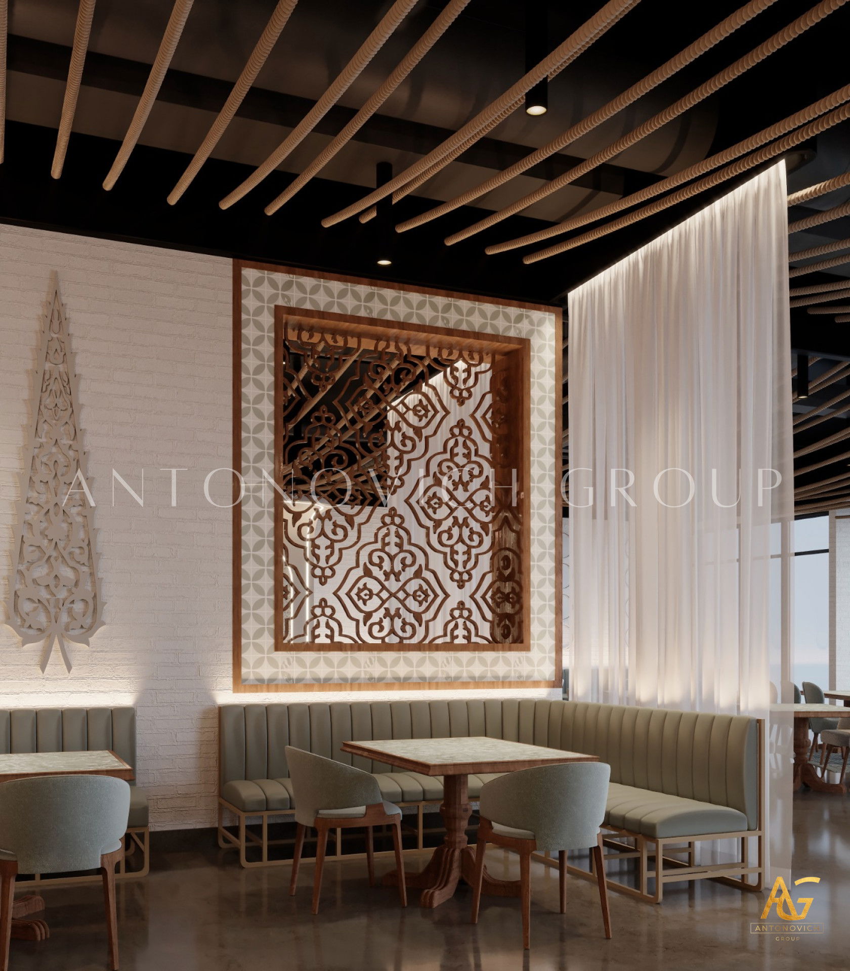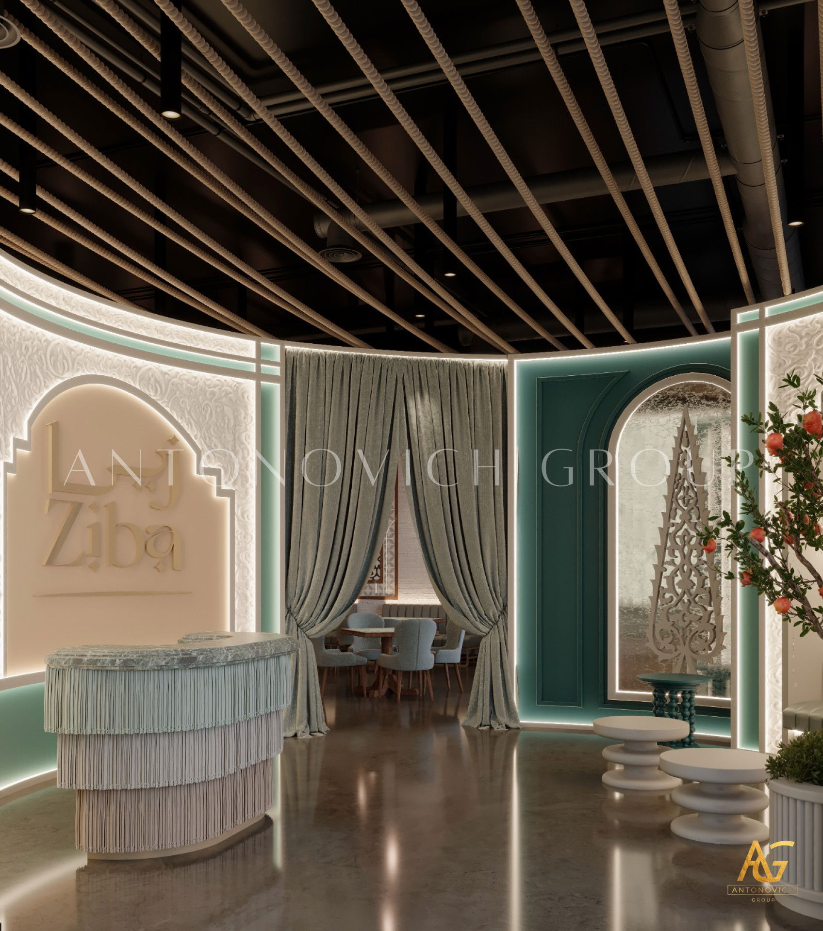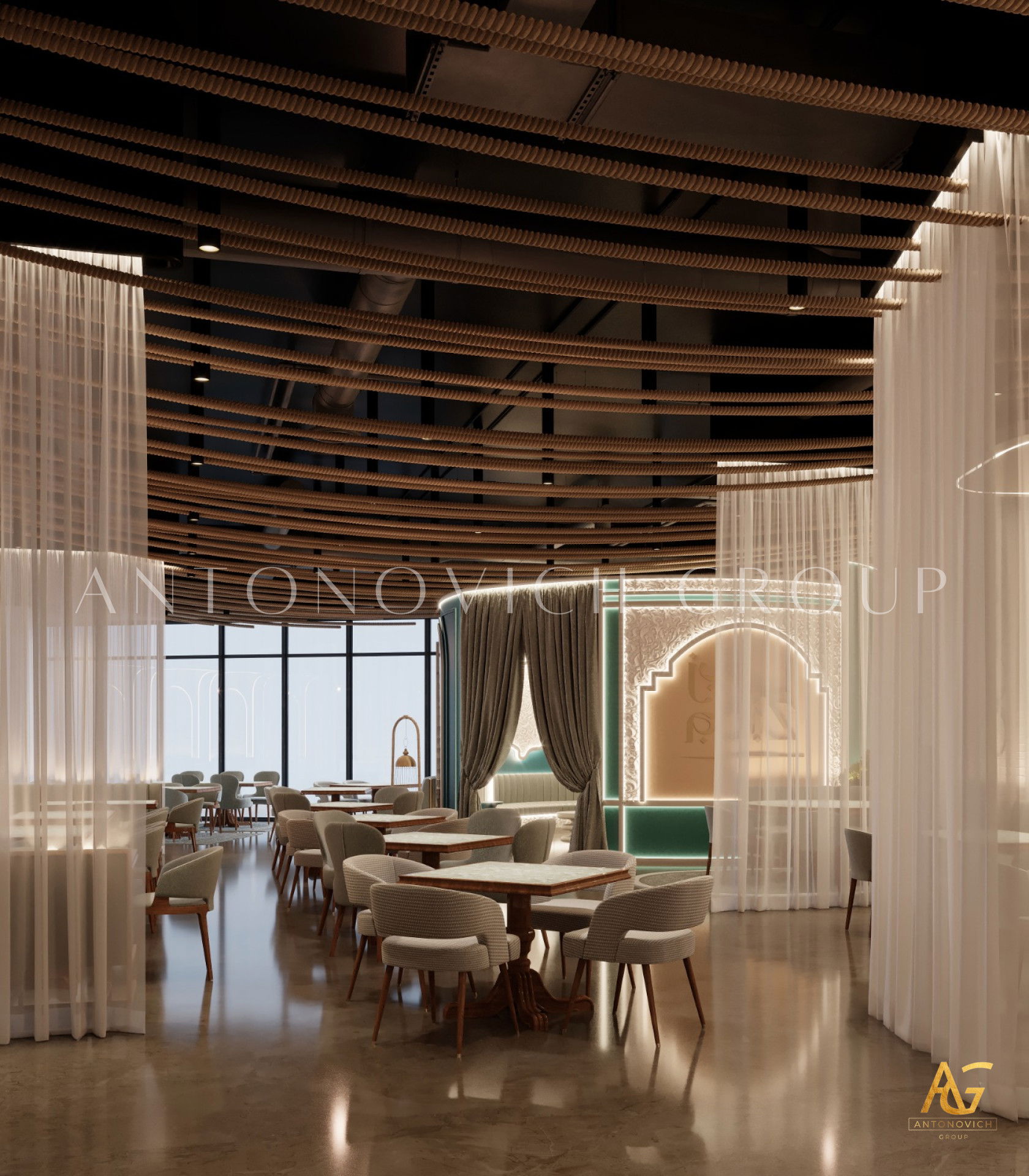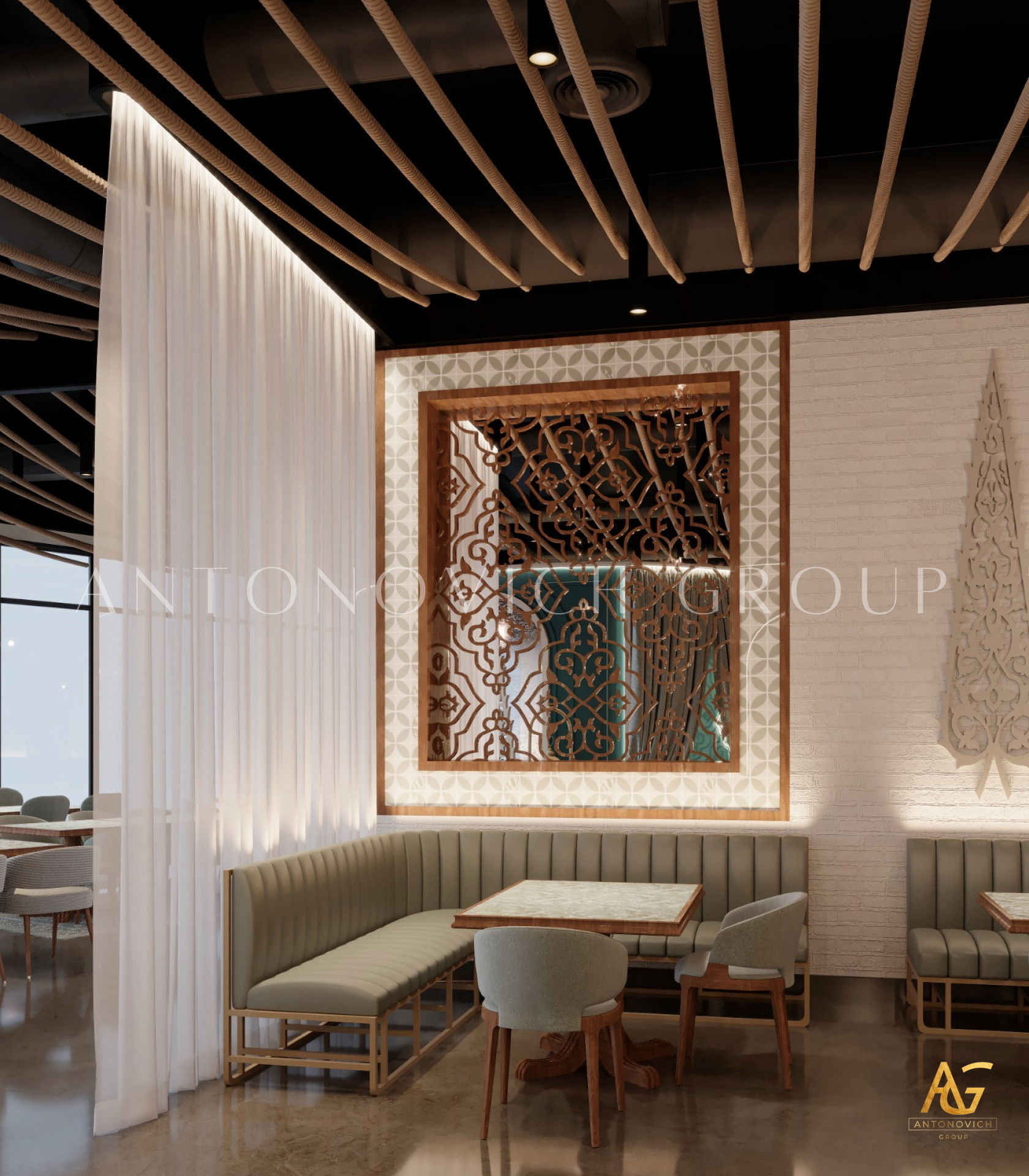 يتميز هذا التصميم الداخلي الرائع للمطعم المذهل بالالوان البنفسجي والذهبي والكريمي وبأنماط زخرفية تفوق الخيال ، فإنه مزيج ممتاز لمطعم مذهل. نرى الأرضيات مبلطة بأسلوب فاخر مع تصميمات شوهدت حصريًا في لاكشري أنتونوفيتش ديزاين ، أفضل شركة لتصميم المطاعم في دبي. ان الموضوع العام لتصميم المطعم هو الفخامة العصرية. وتظهر ديكورات الجدران المجردة في المنتج النهائي ، وهو عبارة عن طين مصنوع يدويًا مذهلًا والذي ستستمتع به. يحتوي هذا التصميم على منضدات والتي تحتوي على لوح أمامي جميل يكمل المظهر العام للمطعم. ان هذا التصميم جميل ومتطور لديكور المطعم الحديث. الأرضيات ذات ملمس جميل. إن هذه هي أفضل فكرة ديكور للمطعم جميلة والتي تتميز بالهدوء والأناقة ويشمل التصميم الداخلي الكامل للمطعم كل ما تحتاجه فانه يتميز بالعناصر المتلألئة في جميع أنحاء التصميم الداخلي المذهل للمطعم. وقد اختارت لاكشري انتونوفيتش ديزاين ، أفضل شركة لتصميم المطاعم في دبي ، اللون البني الرائع لهذا التصميم الداخلي للمطعم الفخم لأنه أفضل لون للإحساس بالفخامة.