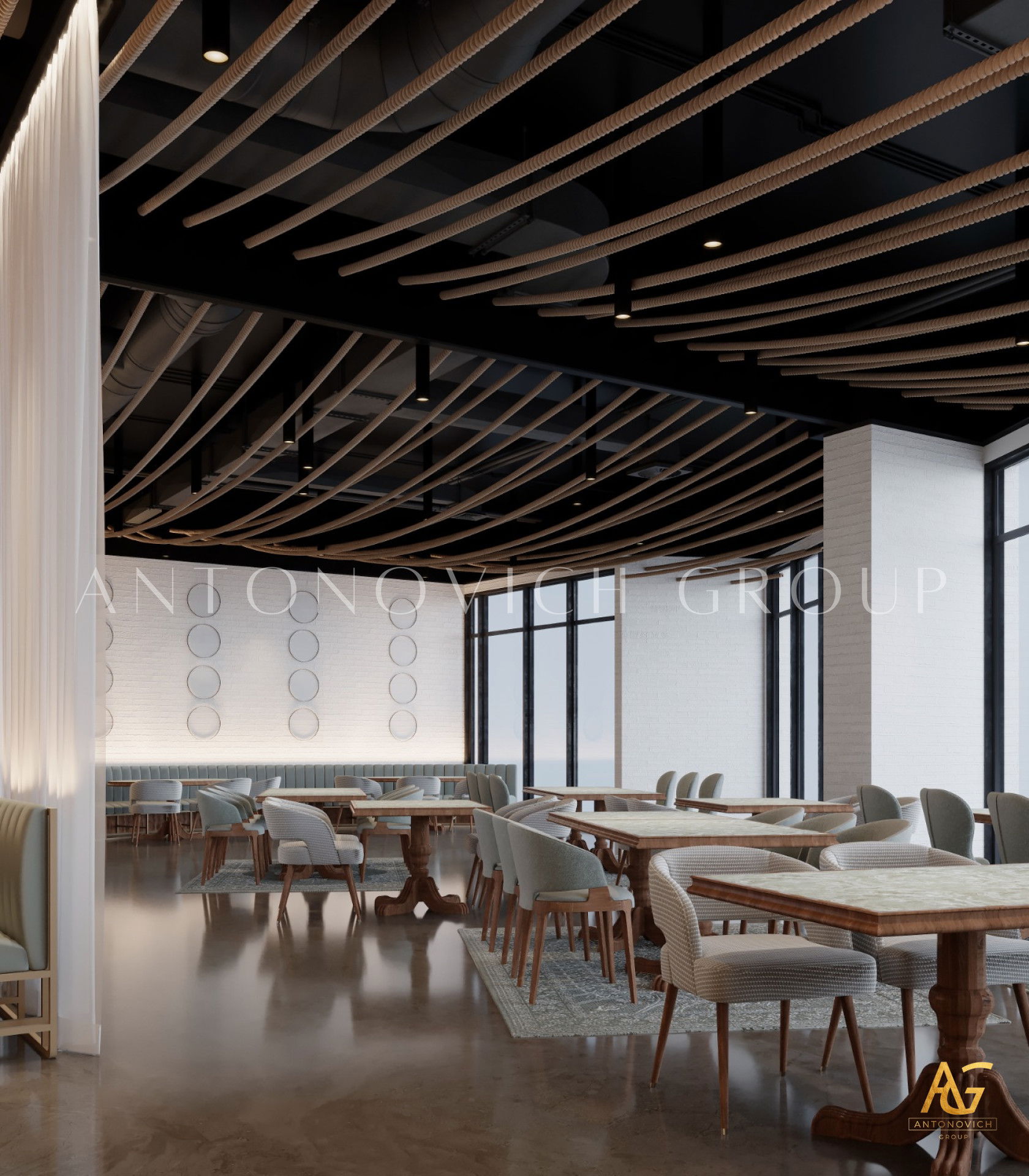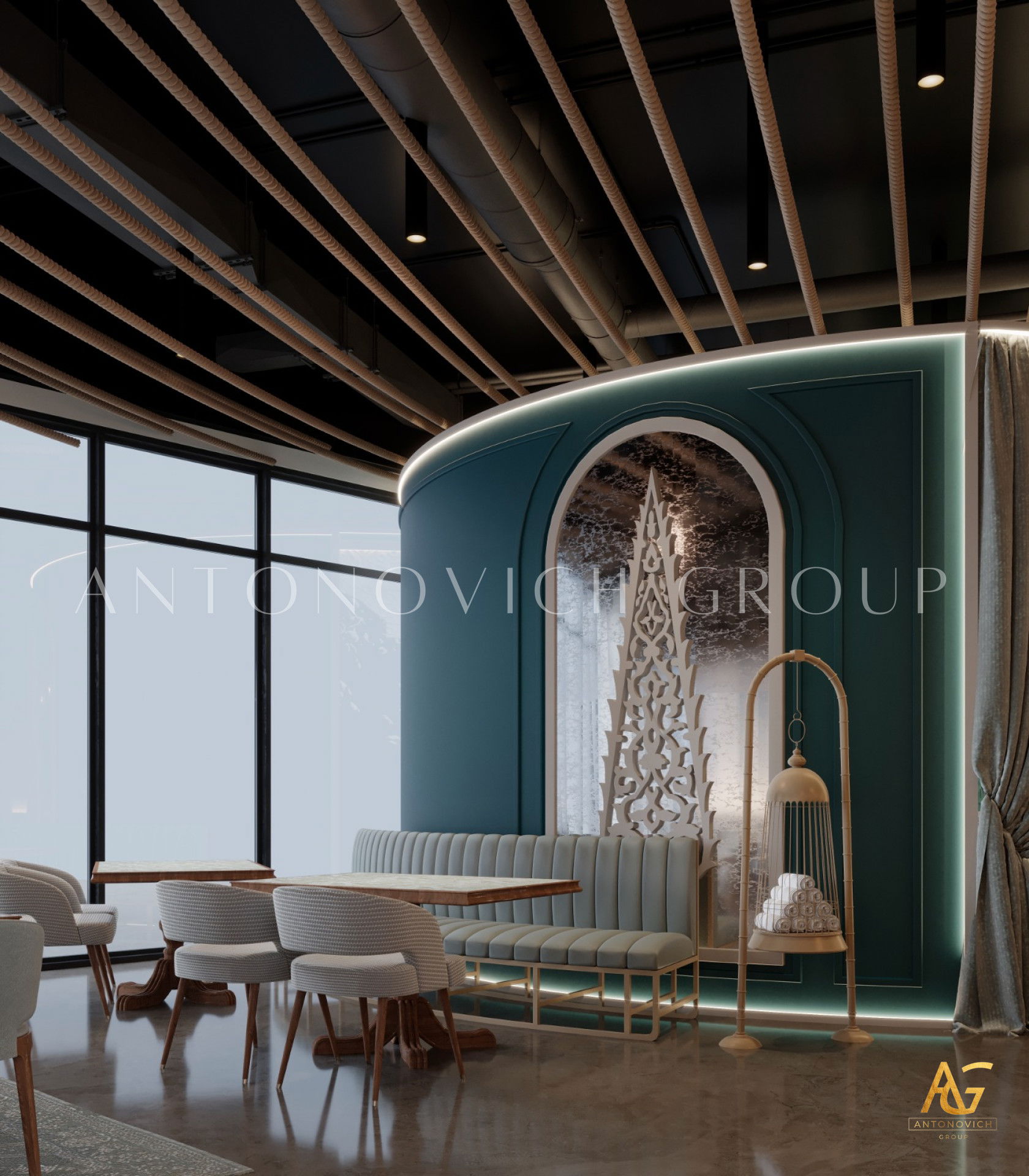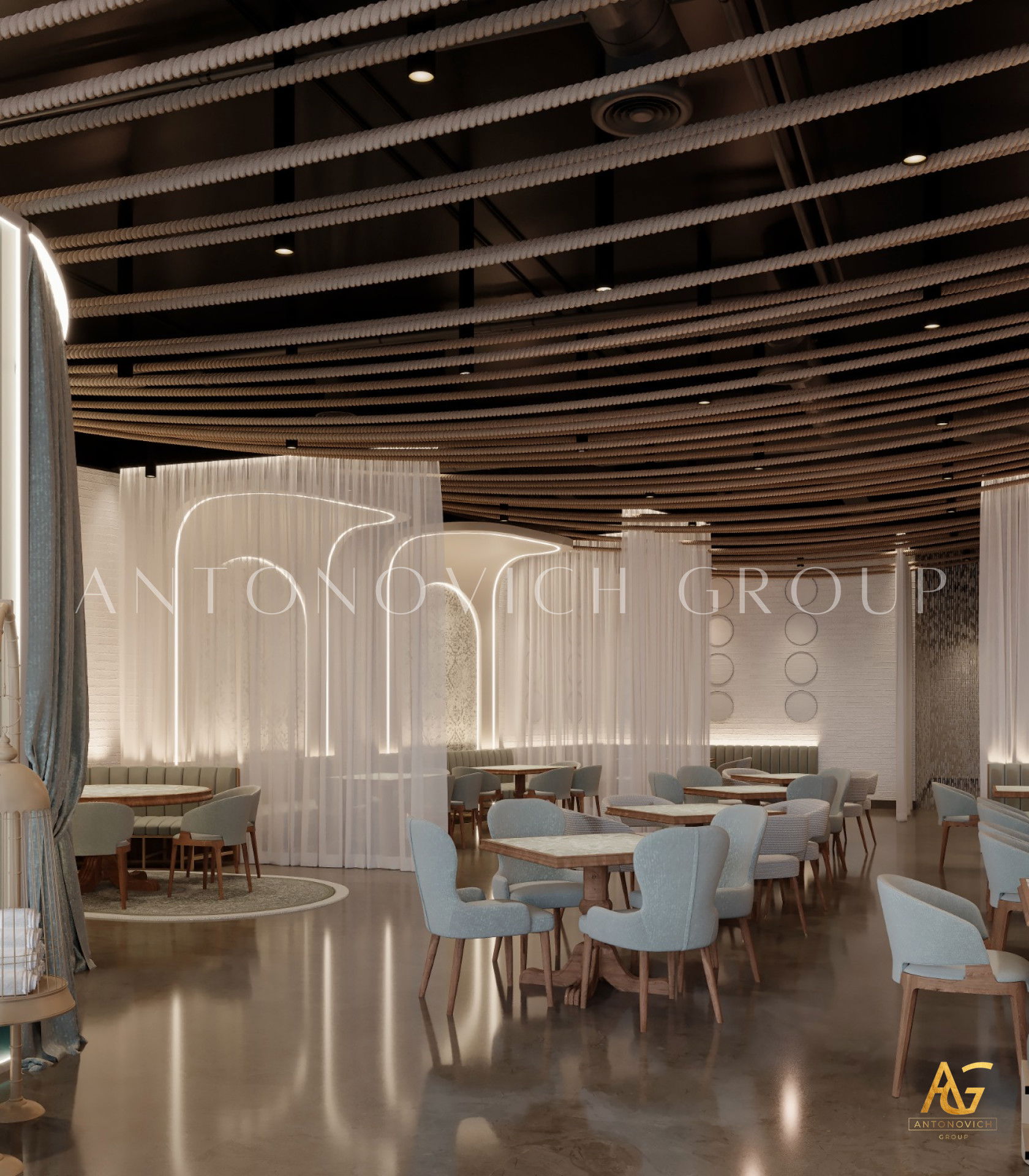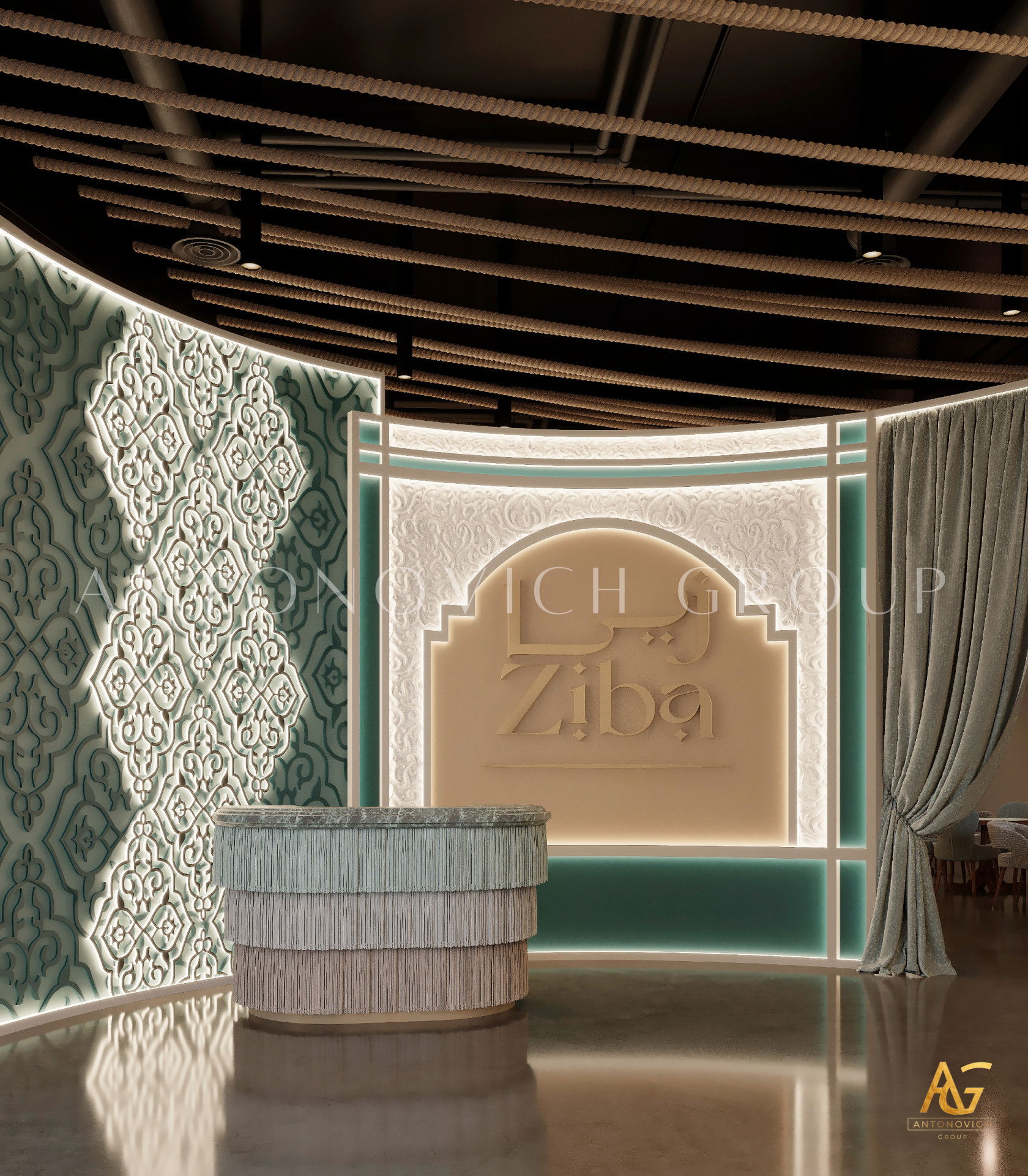 يتميز هذا التصميم الداخلي الرائع للمطعم المذهل بالالوان البنفسجي والذهبي والكريمي وبأنماط زخرفية تفوق الخيال ، فإنه مزيج ممتاز لمطعم مذهل. نرى الأرضيات مبلطة بأسلوب فاخر مع تصميمات شوهدت حصريًا في لاكشري أنتونوفيتش ديزاين ، أفضل شركة لتصميم المطاعم في دبي. ان الموضوع العام لتصميم المطعم هو الفخامة العصرية. وتظهر ديكورات الجدران المجردة في المنتج النهائي ، وهو عبارة عن طين مصنوع يدويًا مذهلًا والذي ستستمتع به. يحتوي هذا التصميم على منضدات والتي تحتوي على لوح أمامي جميل يكمل المظهر العام للمطعم. ان هذا التصميم جميل ومتطور لديكور المطعم الحديث. الأرضيات ذات ملمس جميل. إن هذه هي أفضل فكرة ديكور للمطعم جميلة والتي تتميز بالهدوء والأناقة ويشمل التصميم الداخلي الكامل للمطعم كل ما تحتاجه فانه يتميز بالعناصر المتلألئة في جميع أنحاء التصميم الداخلي المذهل للمطعم. وقد اختارت لاكشري انتونوفيتش ديزاين ، أفضل شركة لتصميم المطاعم في دبي ، اللون البني الرائع لهذا التصميم الداخلي للمطعم الفخم لأنه أفضل لون للإحساس بالفخامة.