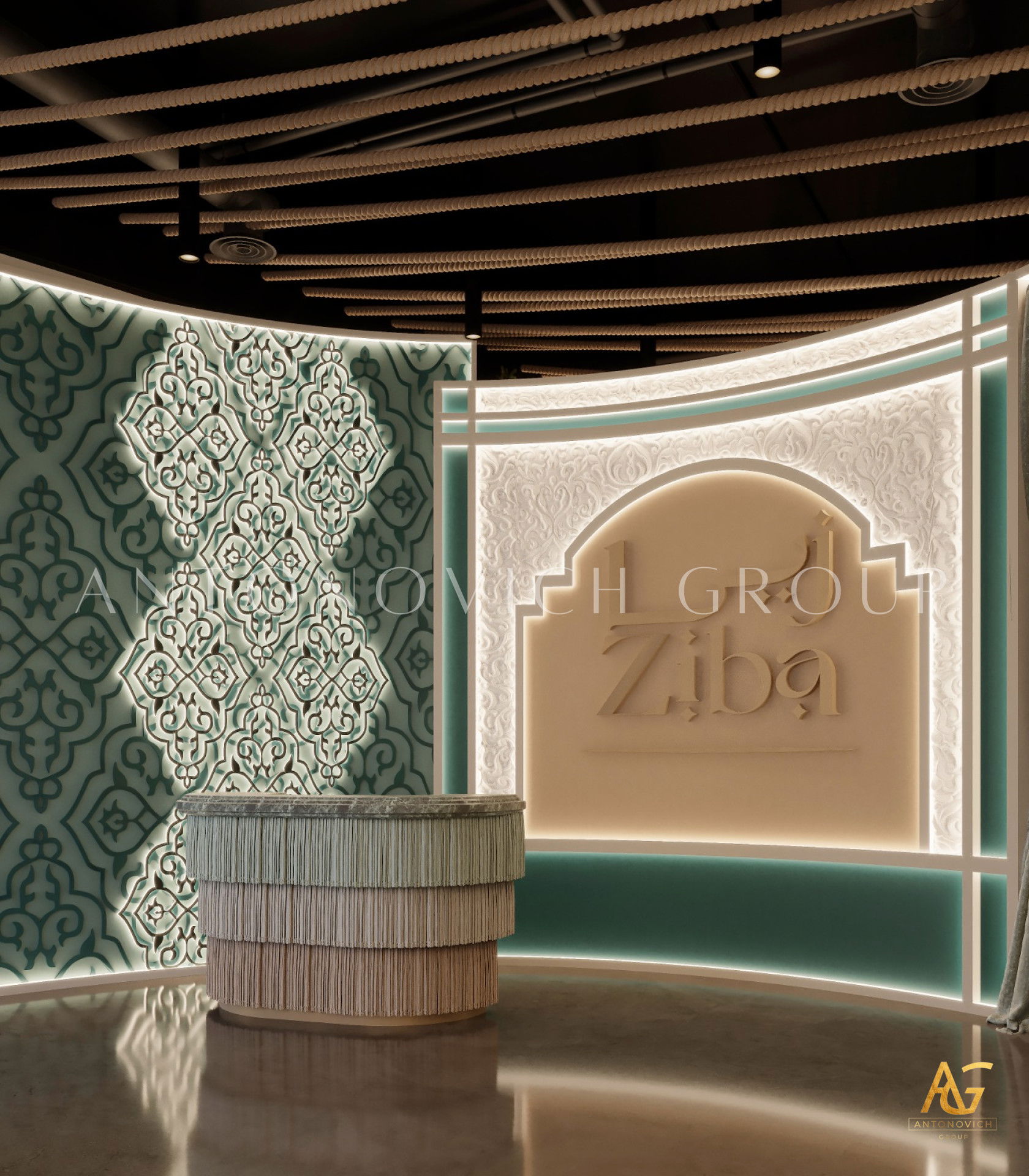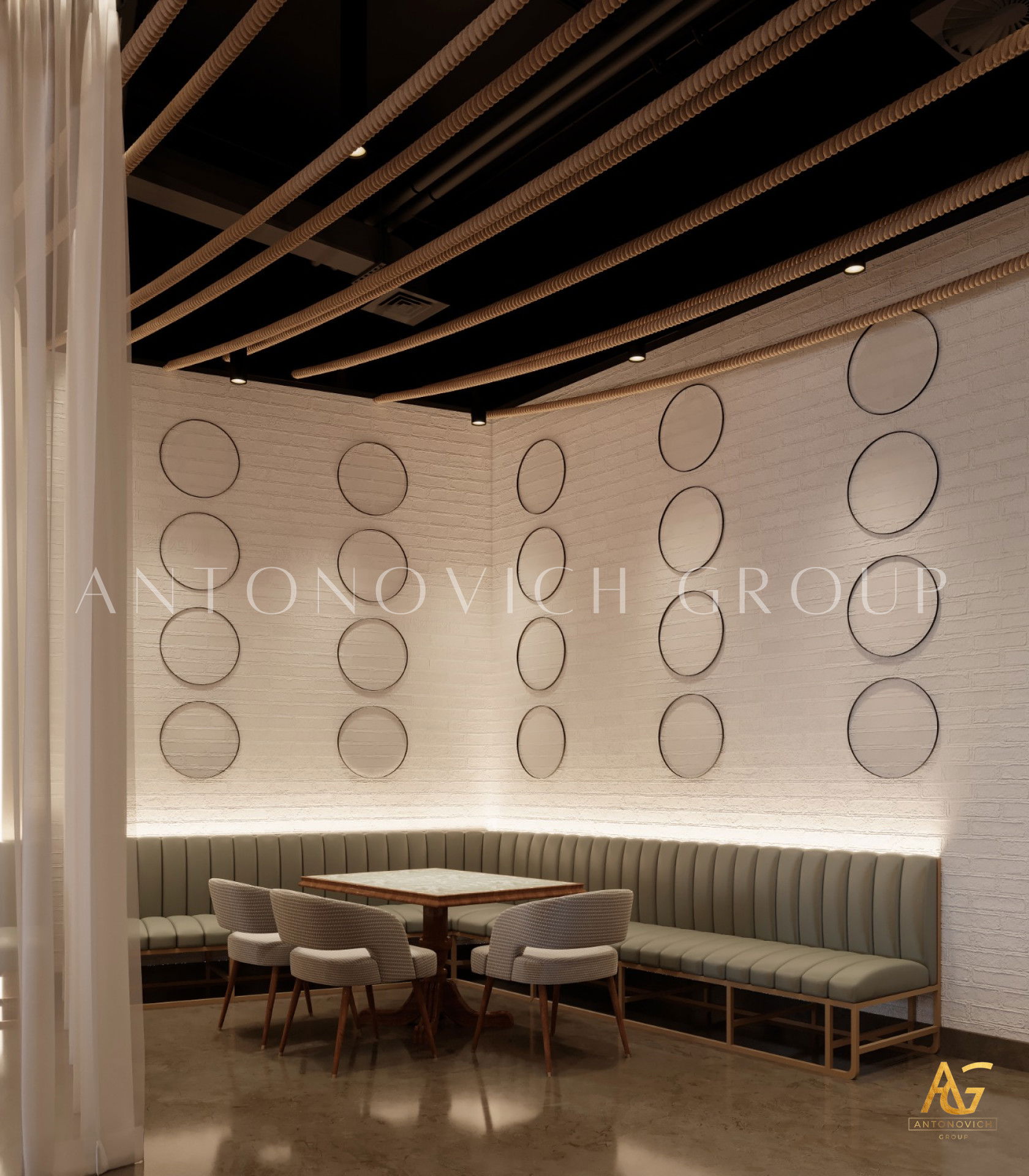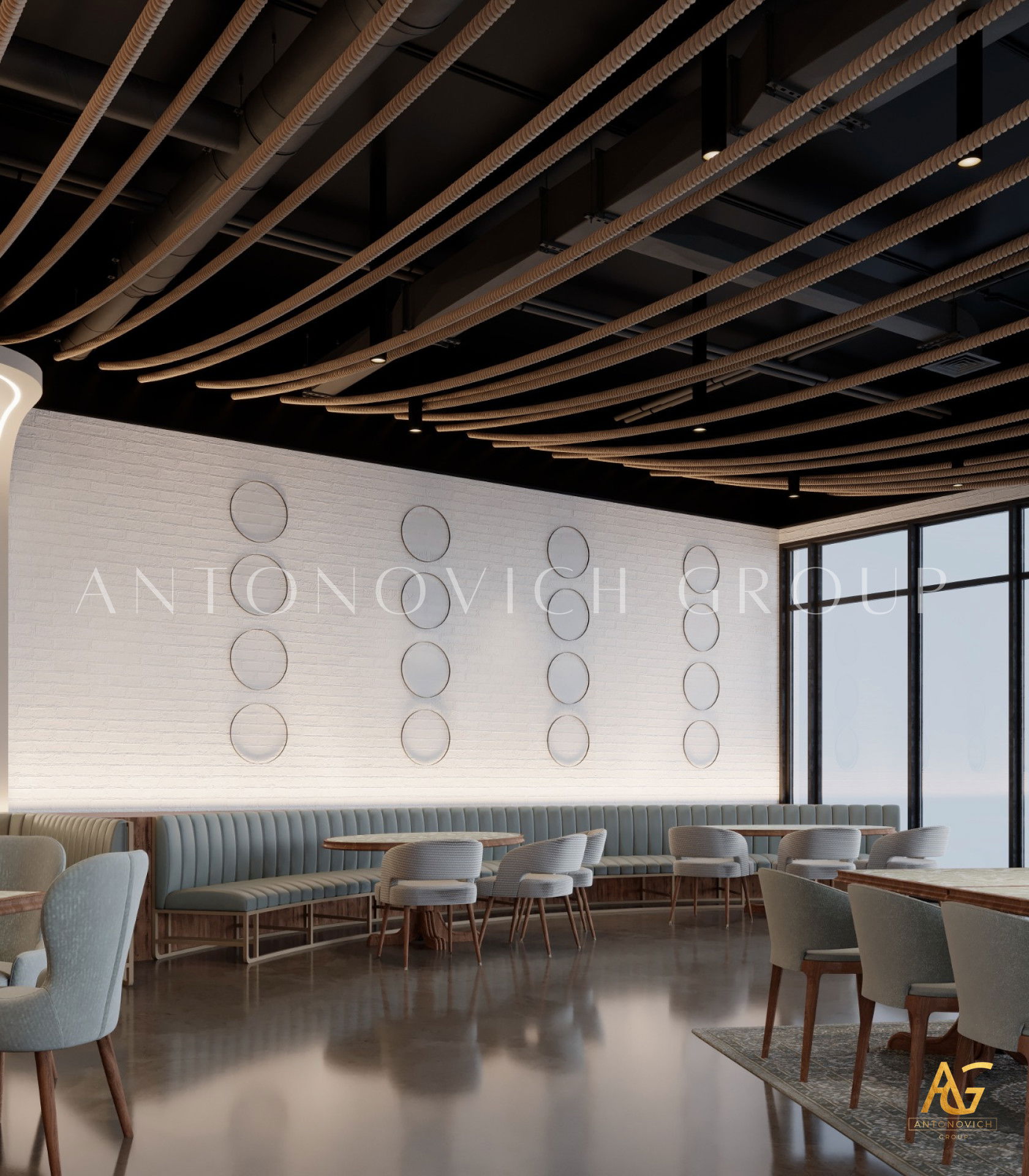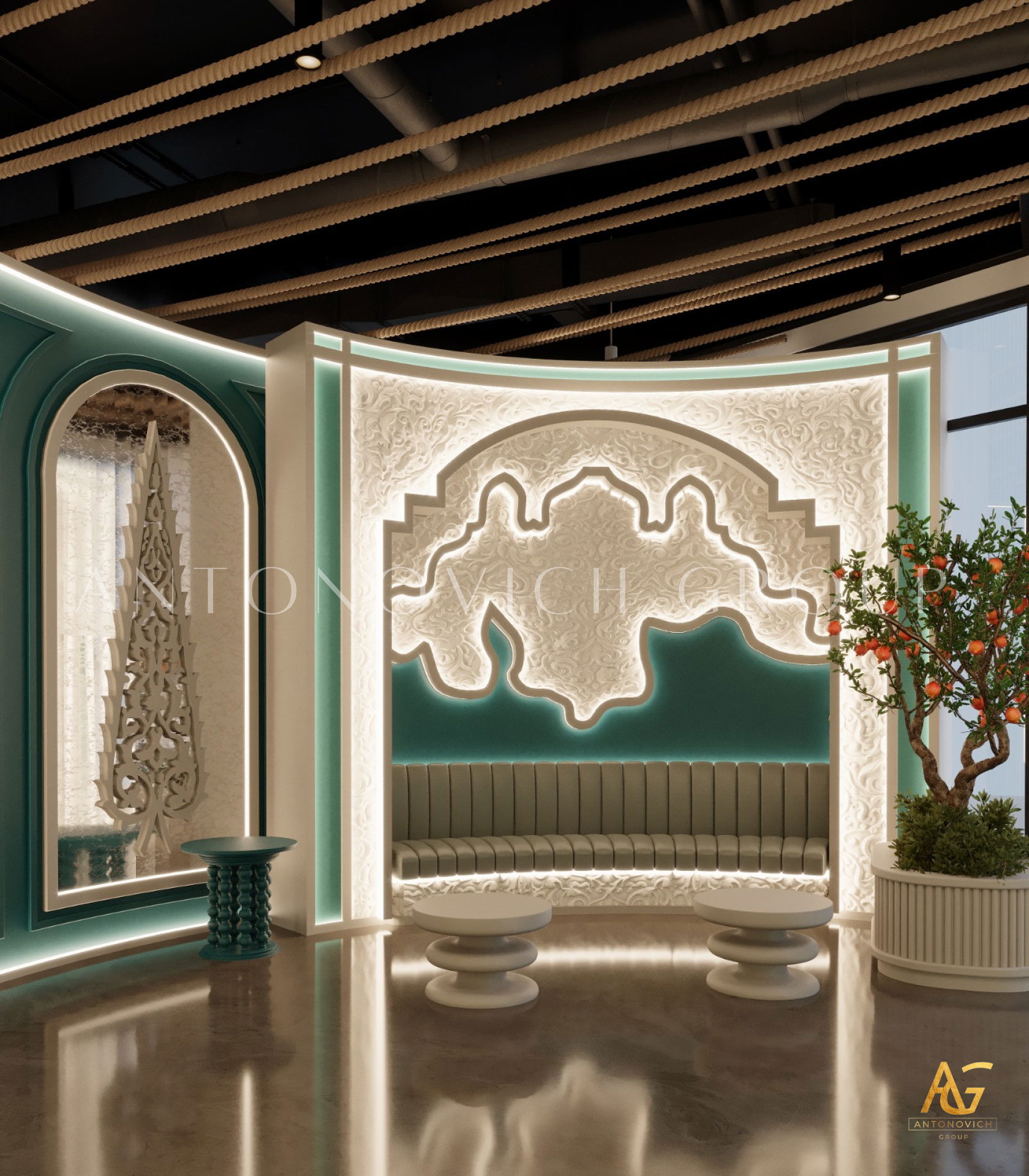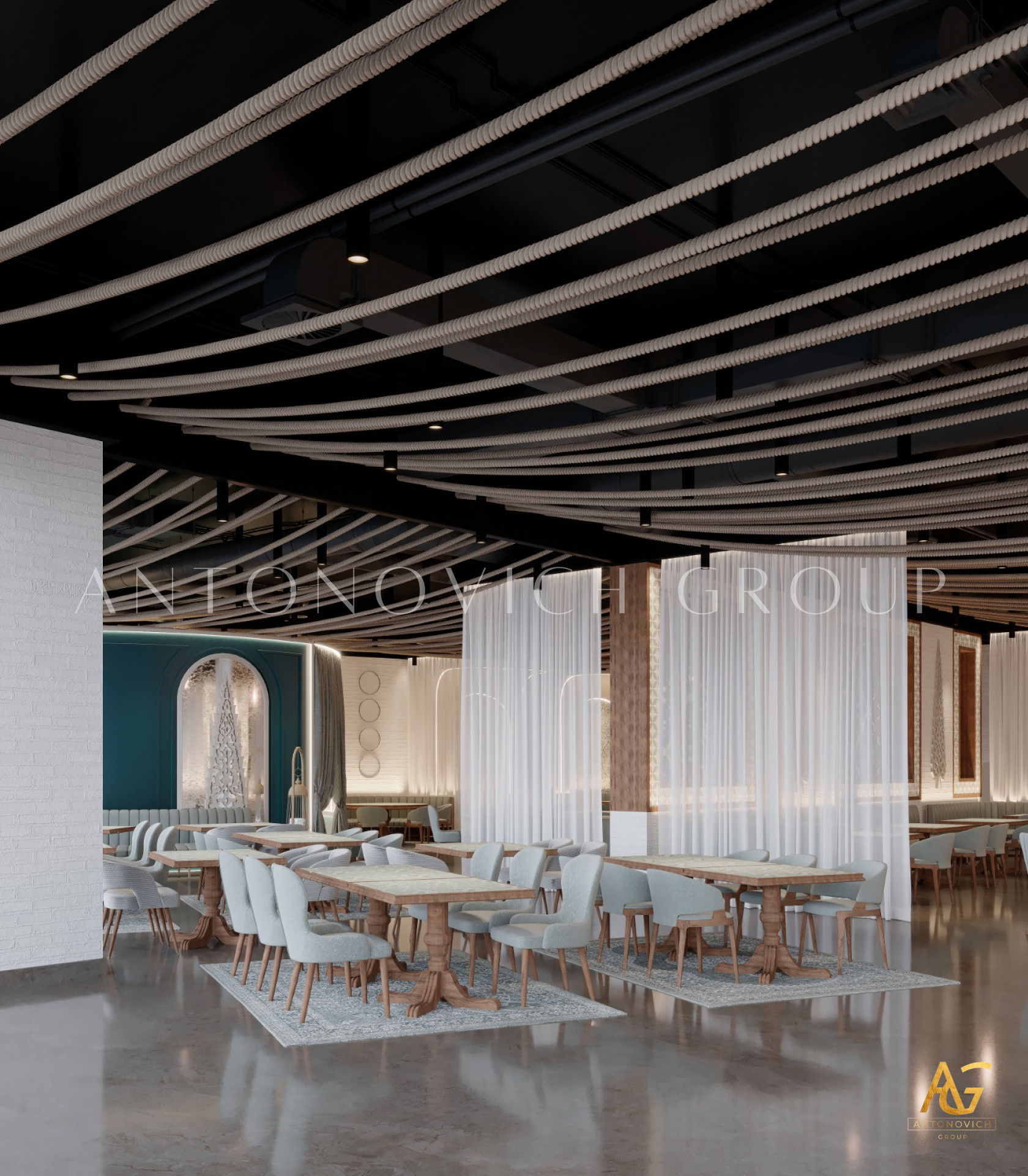 يتميز هذا التصميم الداخلي الرائع للمطعم المذهل بالالوان البنفسجي والذهبي والكريمي وبأنماط زخرفية تفوق الخيال ، فإنه مزيج ممتاز لمطعم مذهل. نرى الأرضيات مبلطة بأسلوب فاخر مع تصميمات شوهدت حصريًا في لاكشري أنتونوفيتش ديزاين ، أفضل شركة لتصميم المطاعم في دبي. ان الموضوع العام لتصميم المطعم هو الفخامة العصرية. وتظهر ديكورات الجدران المجردة في المنتج النهائي ، وهو عبارة عن طين مصنوع يدويًا مذهلًا والذي ستستمتع به. يحتوي هذا التصميم على منضدات والتي تحتوي على لوح أمامي جميل يكمل المظهر العام للمطعم. ان هذا التصميم جميل ومتطور لديكور المطعم الحديث. الأرضيات ذات ملمس جميل. إن هذه هي أفضل فكرة ديكور للمطعم جميلة والتي تتميز بالهدوء والأناقة ويشمل التصميم الداخلي الكامل للمطعم كل ما تحتاجه فانه يتميز بالعناصر المتلألئة في جميع أنحاء التصميم الداخلي المذهل للمطعم. وقد اختارت لاكشري انتونوفيتش ديزاين ، أفضل شركة لتصميم المطاعم في دبي ، اللون البني الرائع لهذا التصميم الداخلي للمطعم الفخم لأنه أفضل لون للإحساس بالفخامة.
