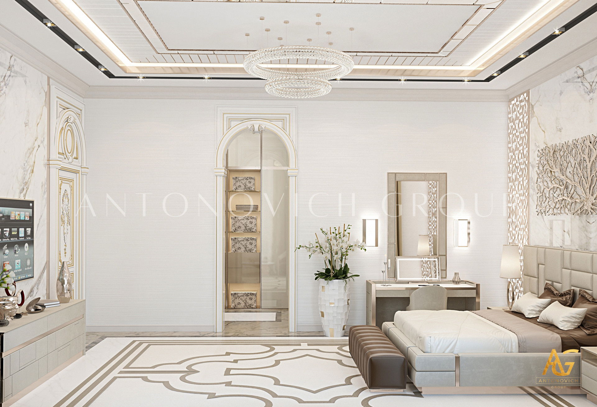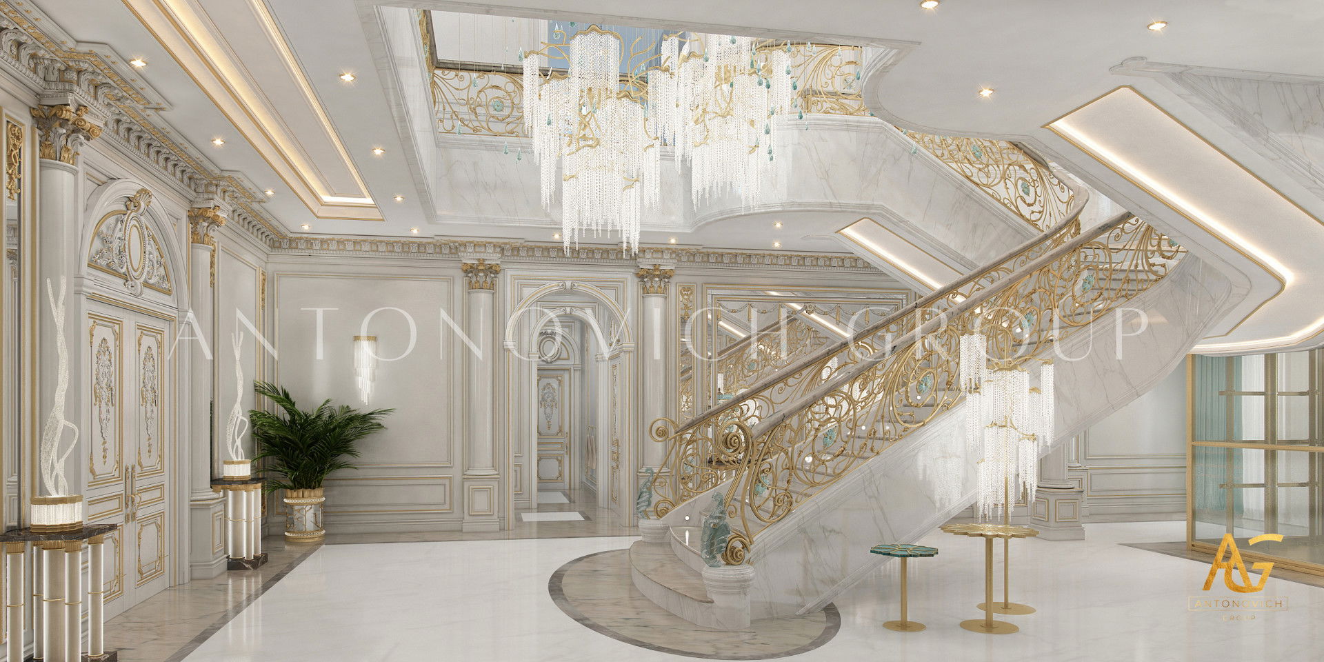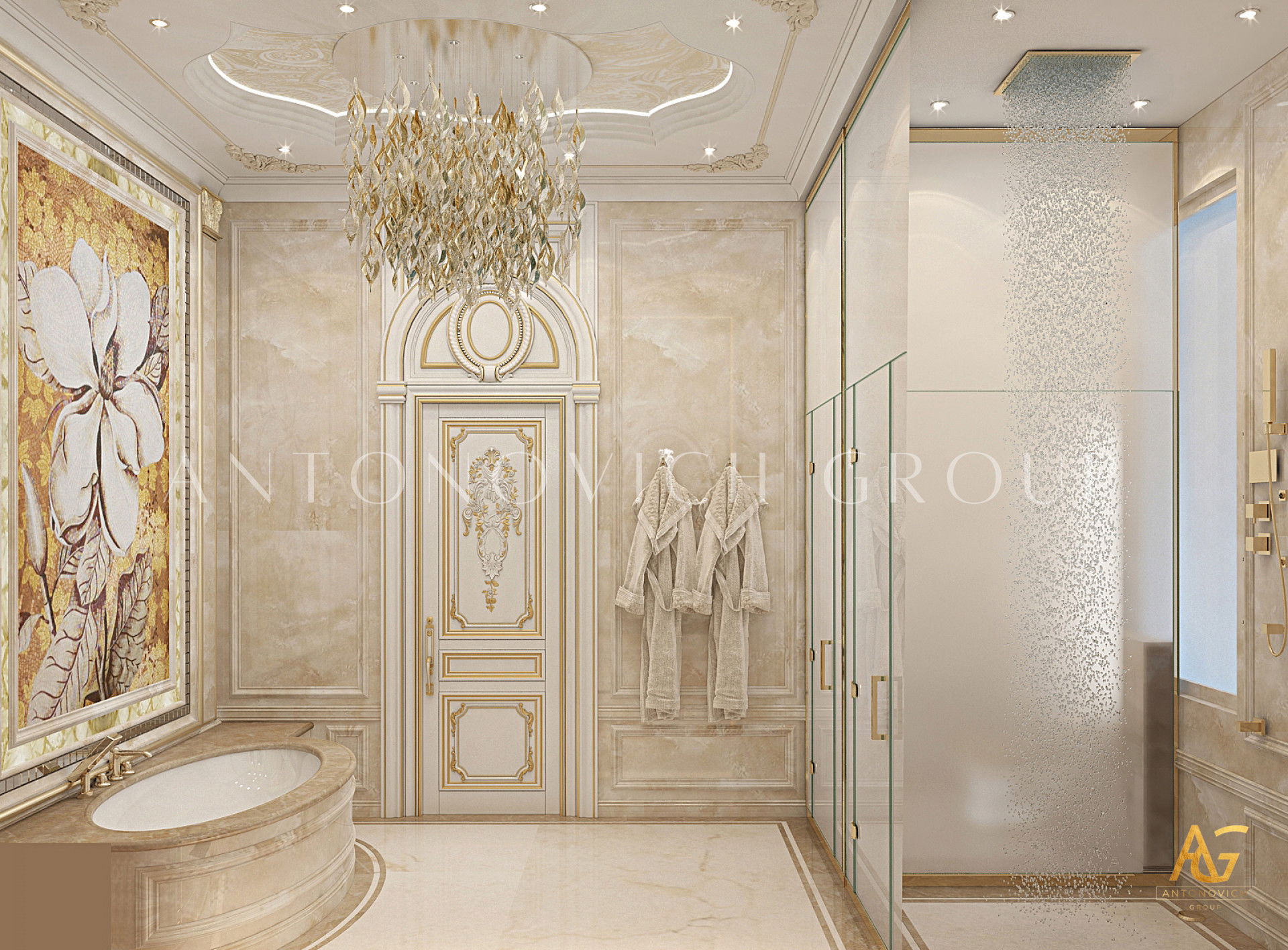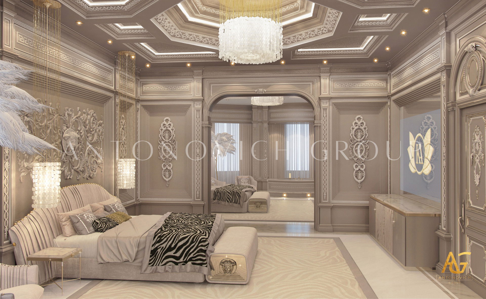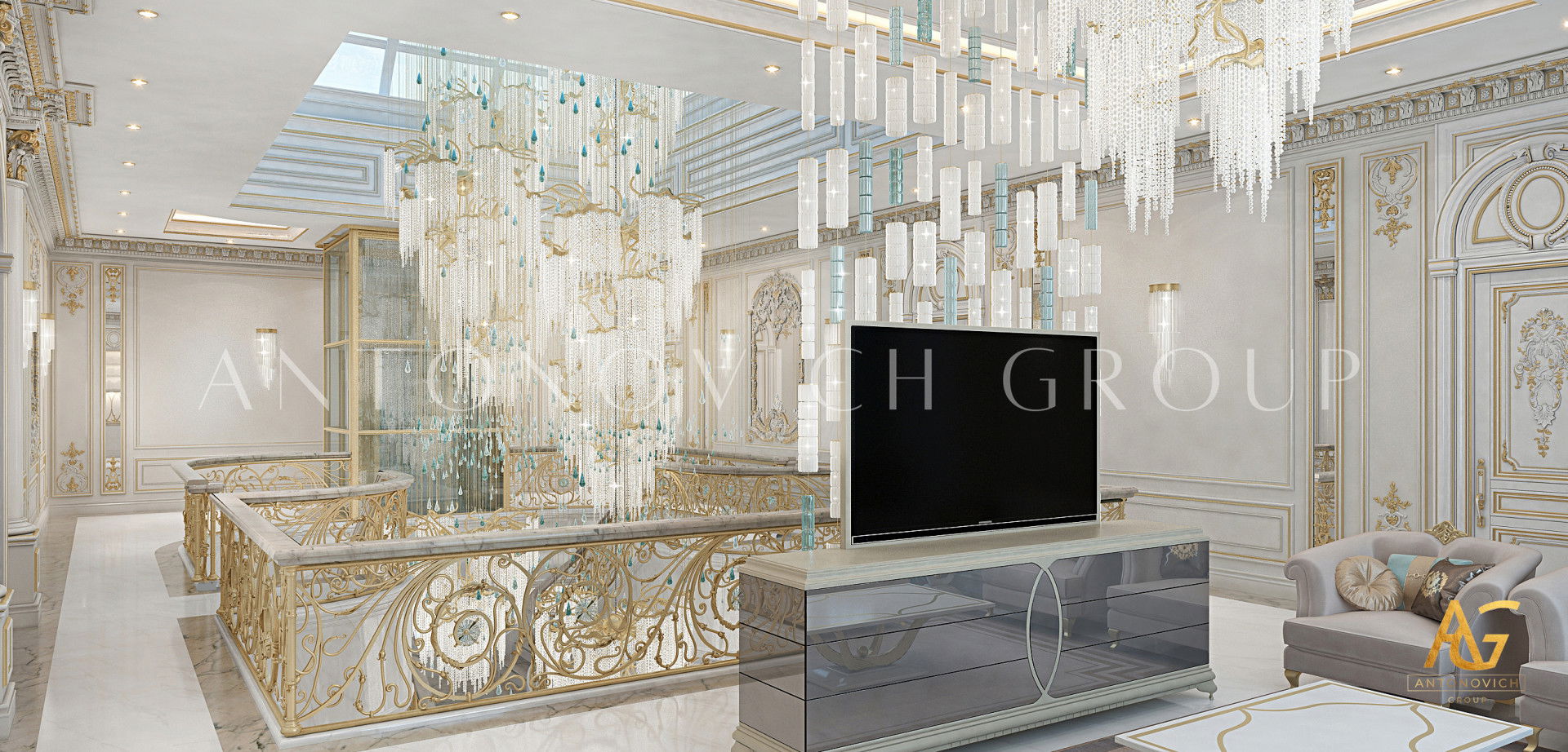 يمتلئ التصميم الداخلي لهذه الفيلا المرموقة بأجواء وديكورات داخلية لا تصدق فقد تم تصميمها بدقة حتى الكمال. لقد قامت لاكشري انتونوفيتش ديزاين باداء التصميم الأكثر إرضاءً الذي يتميز بعظمة التوازن في الأسلوب والمساحات ، وذلك بفضل نظرية التباعد المناسب وتطبيقات التصميم الخبيرة. وعند الدخول إلى هذا التصميم الداخلي النيوكلاسيكي، ستلاحظ المجموعة الأكثر روعة للتصميم الداخلي للقاعة ، والتي تتكون من الديكورات الفاخرة الباهظة الثمن ذات الطراز الملكي. وقد تم تصميم غرف النوم والمسرح المنزلي بشكل جميل بتصميم داخلي كلاسيكي حديث. وعلى عكس التصميم الداخلي للمنزل الحديث النموذجي ، قام فريق التصميم الداخلي بإنشاء تطبيقات تصميم فنية وإبداعية للغاية من أجل تلبية جميع متطلبات المشروع. فقد حققت لاكشري أنطونوفيتش ديزاين أفضل نتائج التشطيب مع اندماج رائع للتصميم الداخلي الكلاسيكي باستخدام مجموعة مختلفة من الأثاث والديكورات الحديثة.