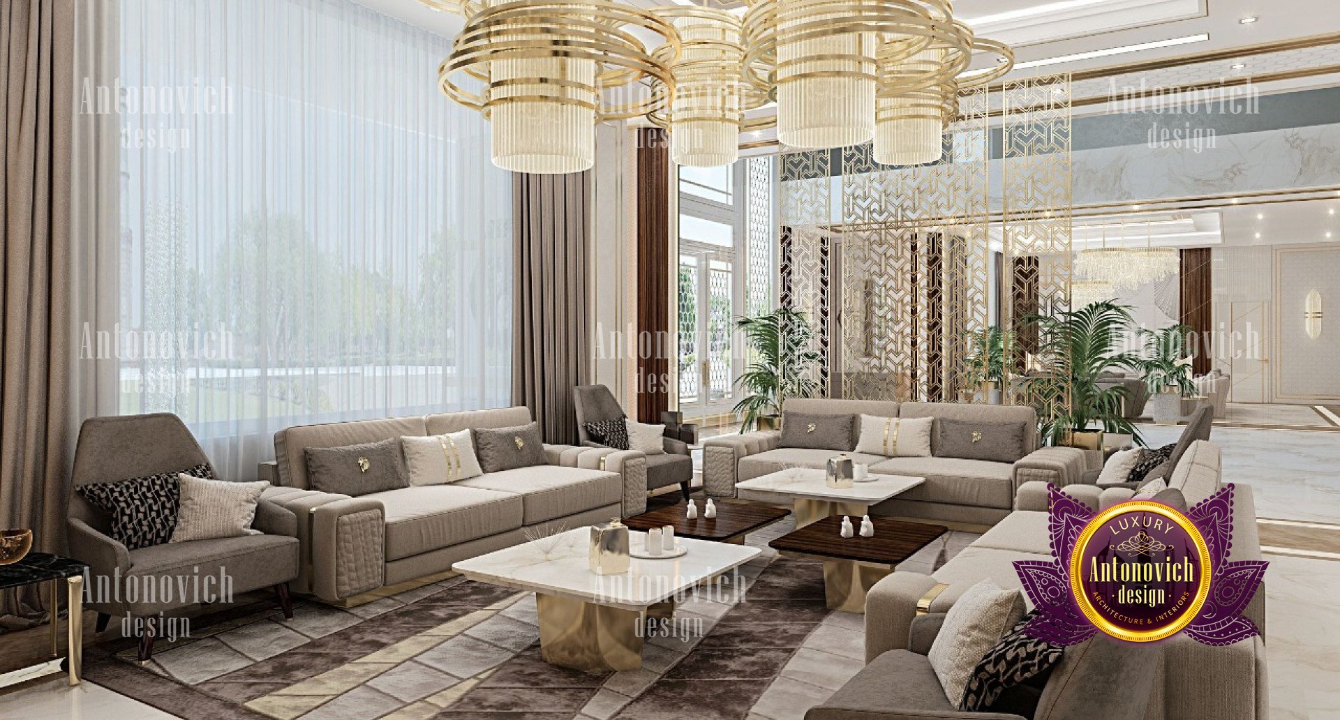 تم صنع الستائر الضخمة خصيصًا لتغطية النافذة المذهلة والواسعة. و يتميز سقف الغرفة بهندسة إضاءة مذهلة والتي سيحبها الكل . وتعتبر الأرضيات أيضًا ميزة بارزة في تصميم الشقة الجميل هذا الذي يتميز بنمط وبأسلوب مذهلان ببساطة. مع تفاصيل رائعة وفاخرة . وتم ايضا وضع طاولات صغيرة على الجانب ، مع مجموعة جميلة من النباتات لإضفاء إحساس طبيعي أكثر ، مع العناصر الخشبية الداكنة والتي تُظهر اناقة ورفاهية تصميم الشقة .