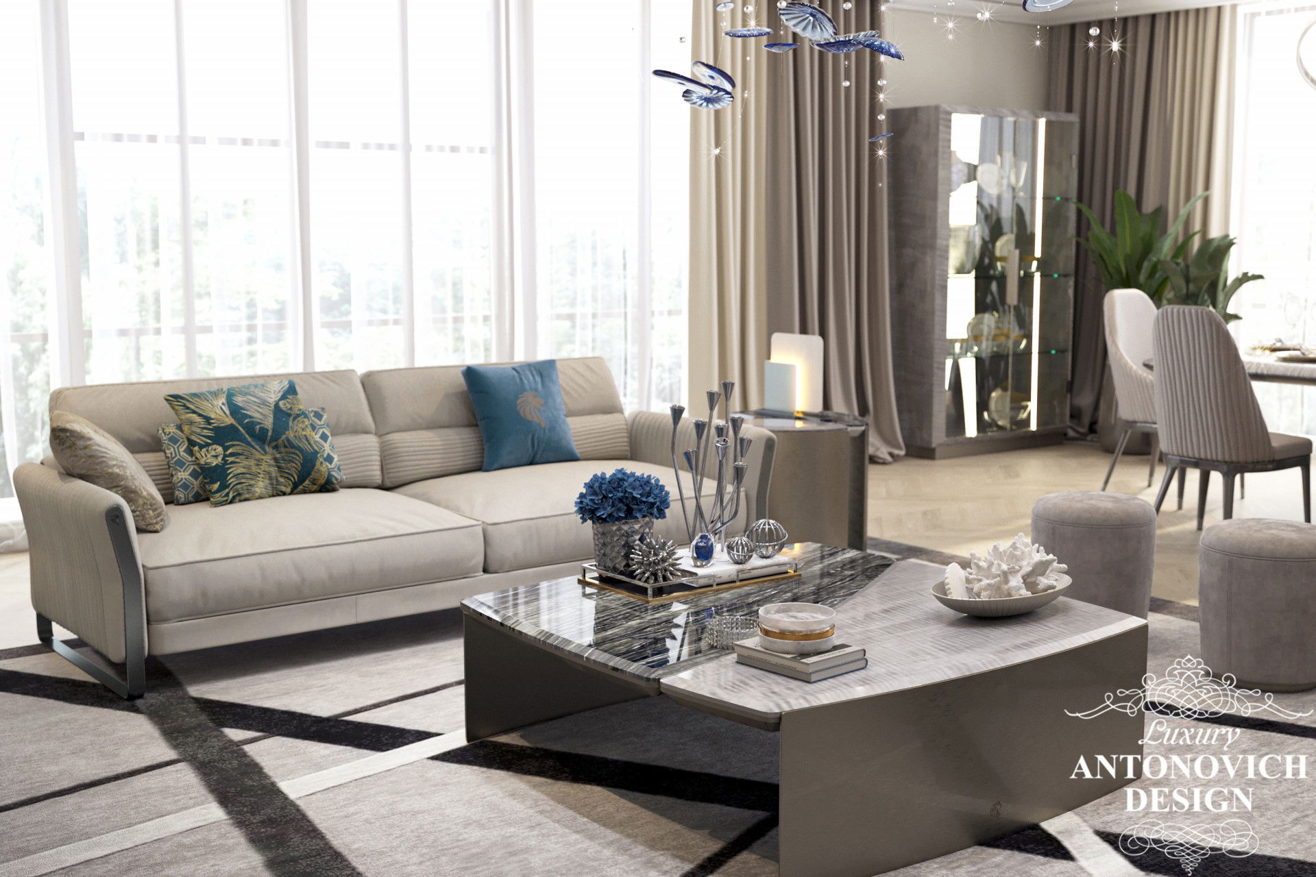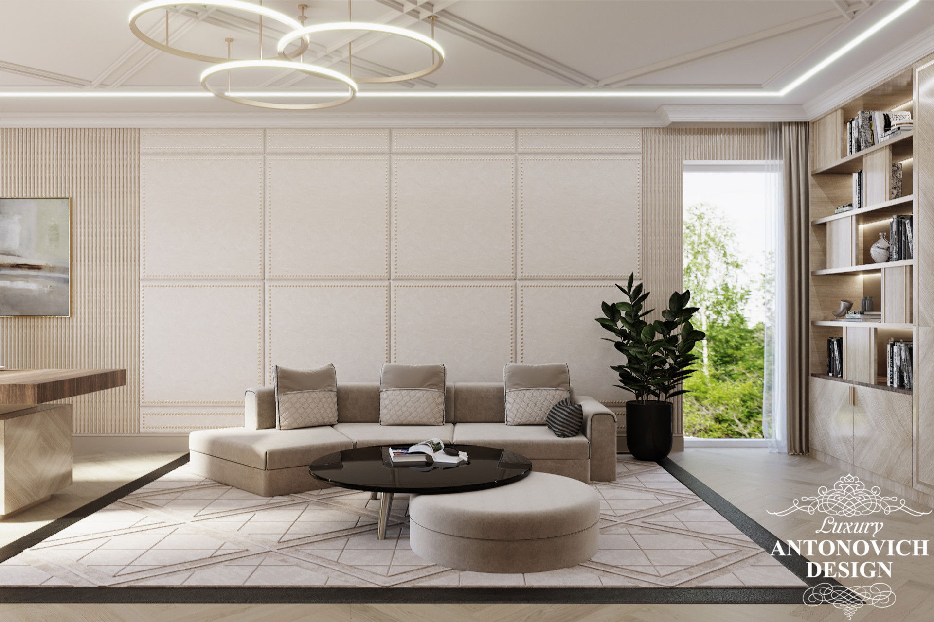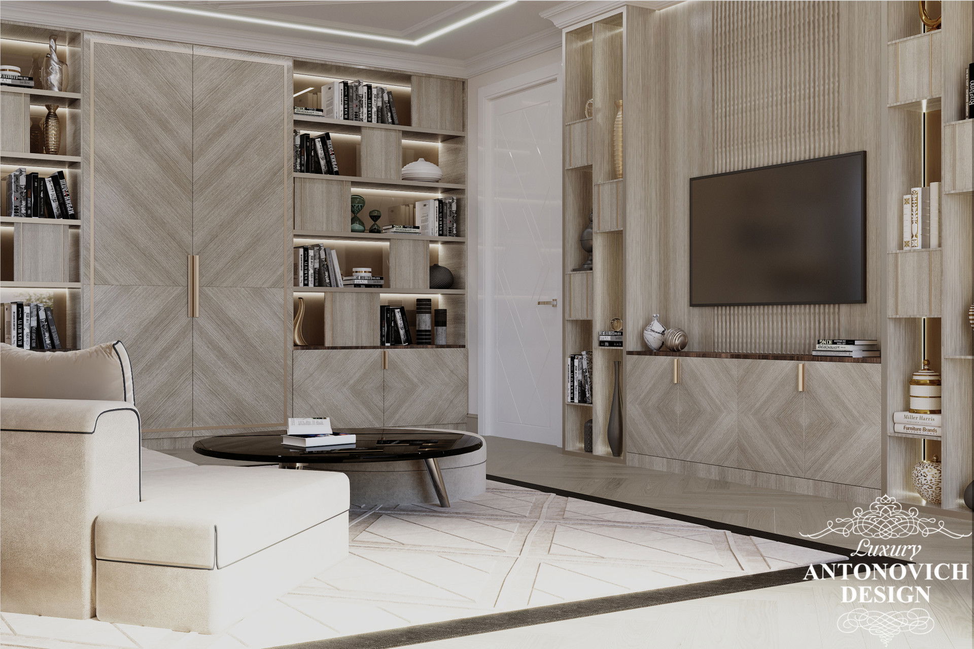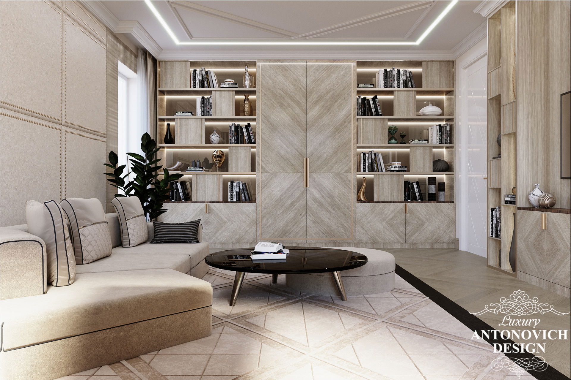 وتتميز غرفة المعيشة بسقف مرتفع يضفي على الغرفة إحساسًا بالاتساع. حيث يضيف لونها الكريمي الجميل الدفء والراحة لهذه الشقة العصرية الجميلة. ونري السجاد مُصنَّع ليلائم الأرضيات ، والأرفف مُثبَّتة جيدًا على الجانب.
