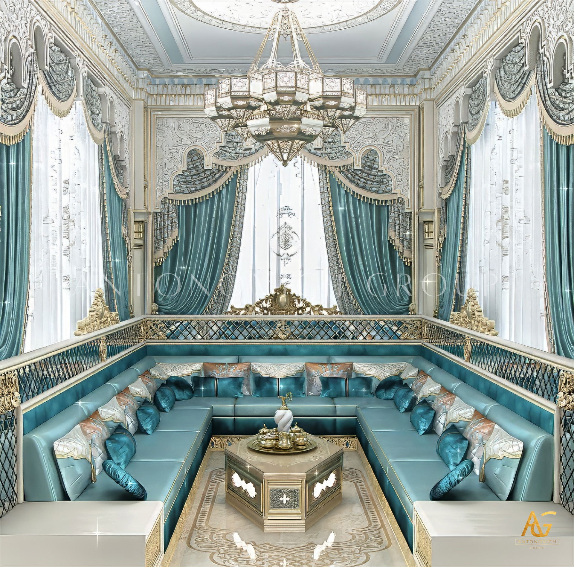Arabic majlis interior design usually has a very detailed design with a touch of glam and elegance. Selecting every furniture design and decorations that will fill in the Arabic majlis interior is another challenging task for every interior designer. Most of the Arabic majlis sitting requires a customized furniture design that only a professional interior design company Dubai has the ability to perform. Luxury Antonovich Design is the most trusted architecture and interior design company that has the full ability and capacity to perform an extra luxurious and stylish Arabic majlis interior design as well as producing a set of customized furniture designs such as a Moroccan style sitting. In fact, this amazing Arabic majlis interior design with a Moroccan style sitting was indeed one of the masterpieces that the Luxury Antonovich design has been created. Take a look at how artistic the sitting arrangement and the detailed carvings have been perfectly engraved with a special lighting accent in Arabic design. Even the set of center tables has its detailed carvings that are perfectly stunning and suitable with the full majlis arrangement. What makes this Arabic majlis interior extra stunning is the walls and its artistic carvings in a set of window style decorations that blends the entire majlis interior design.