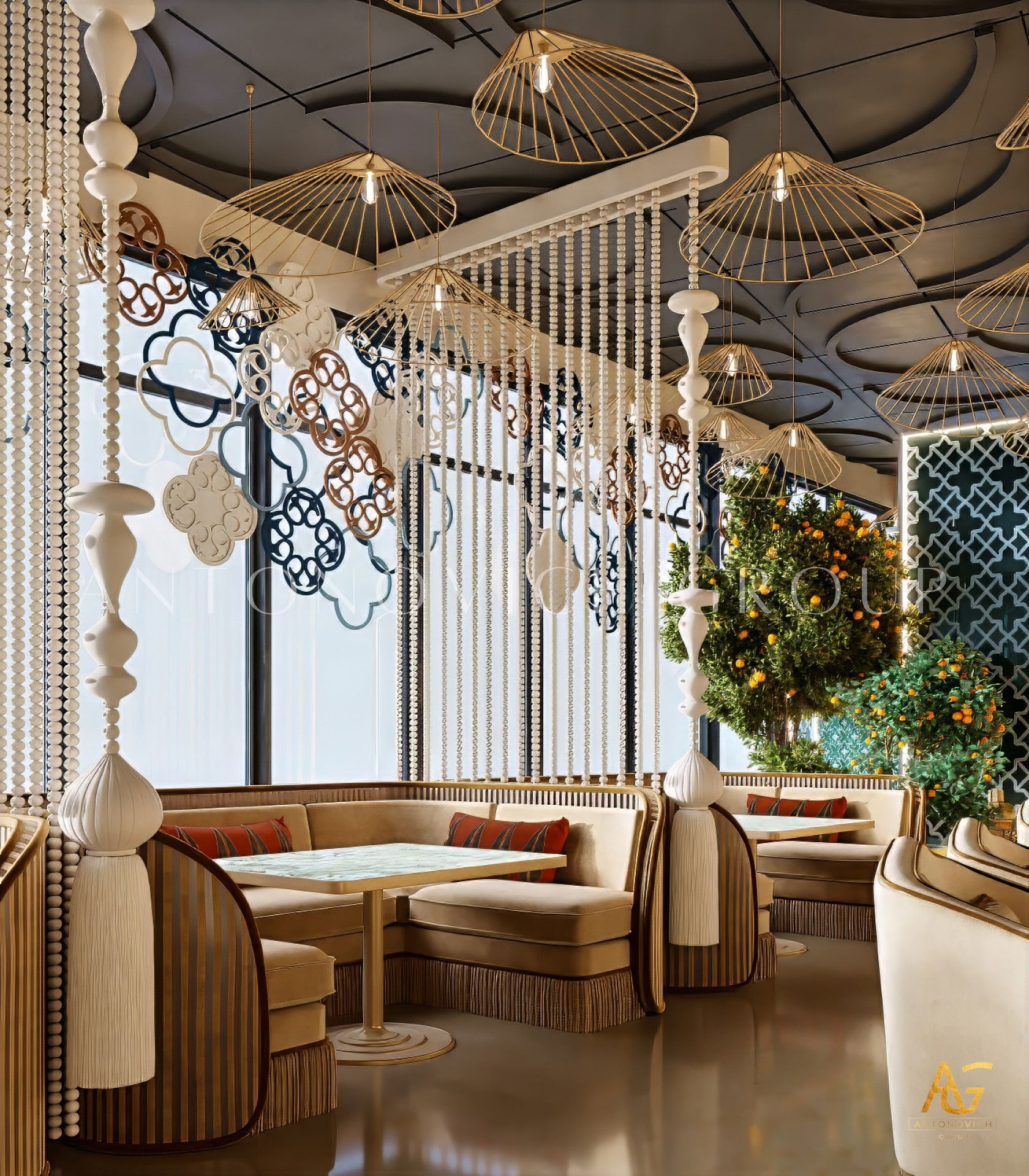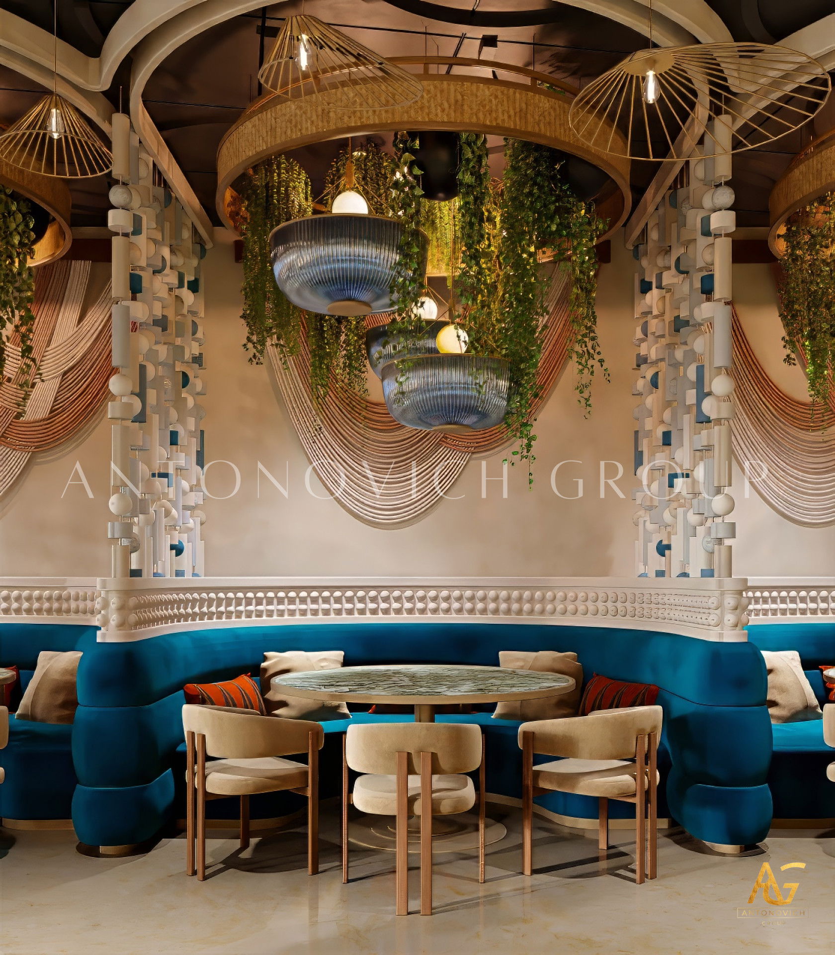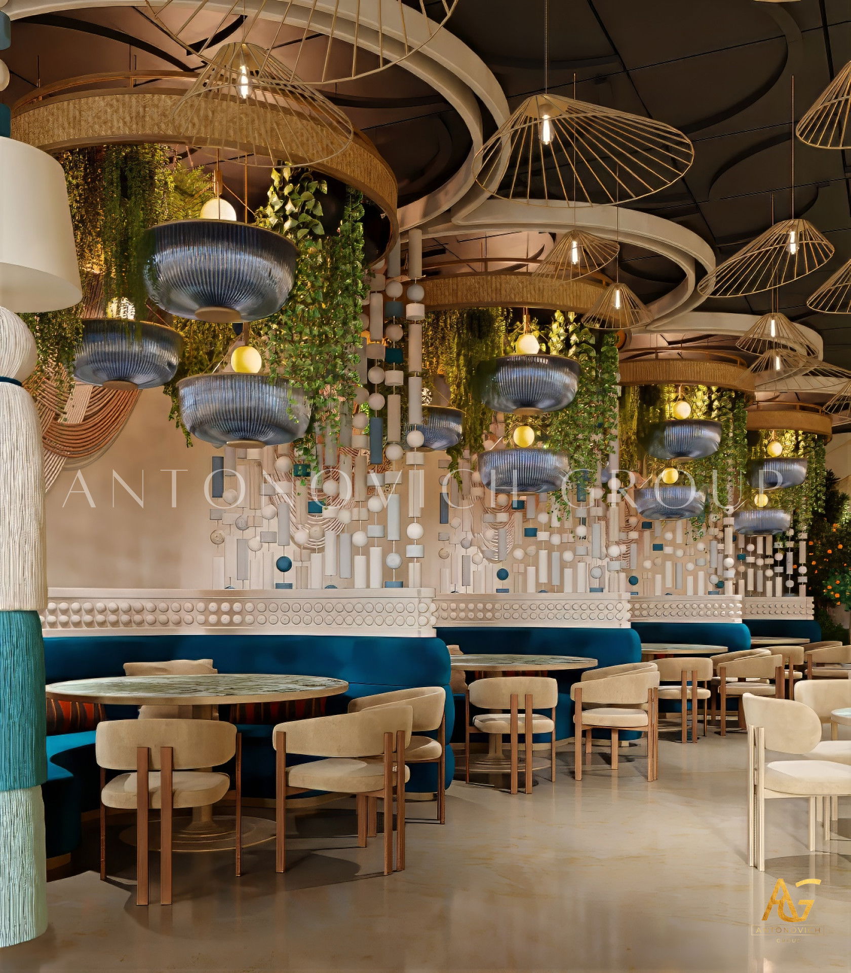In addition, Antonovich Group is known for its bespoke joinery and furniture production, which allows clients to enjoy customized pieces designed specifically for their restaurant’s theme. From fine dining tables and chairs to lighting fixtures, bar counters, and wall panels, each piece is crafted with artistry and attention to detail, adding character and sophistication to the overall space.