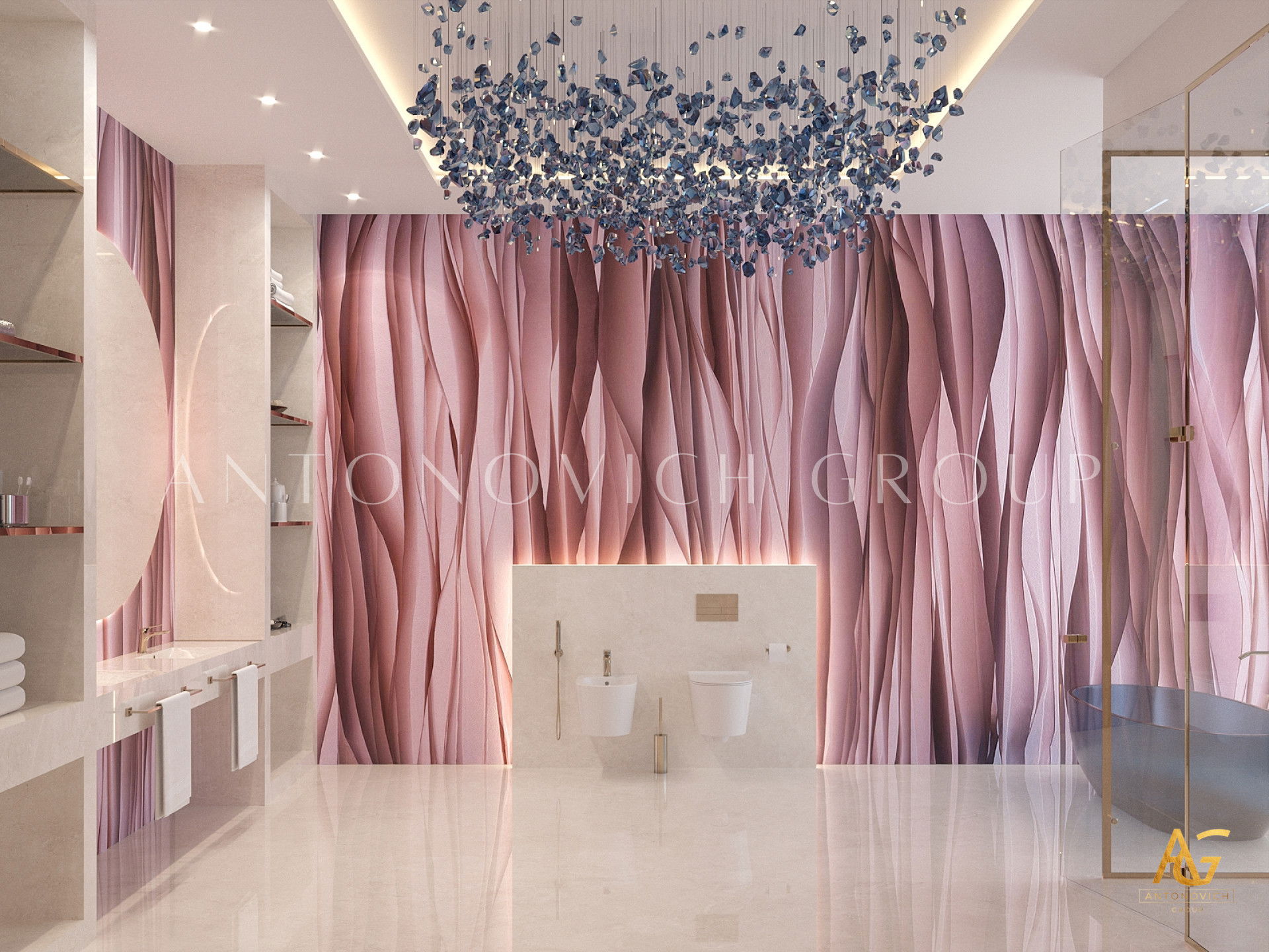 Bathrooms designed by Antonovich Group are not just functional spaces; they are expressions of bespoke luxury. The customized chandeliers and stylish walls become signatures of Antonovich Group's commitment to crafting environments that transcend the ordinary. Every design decision is intentional, transforming the spacious bathroom into an oasis of personalized indulgence.