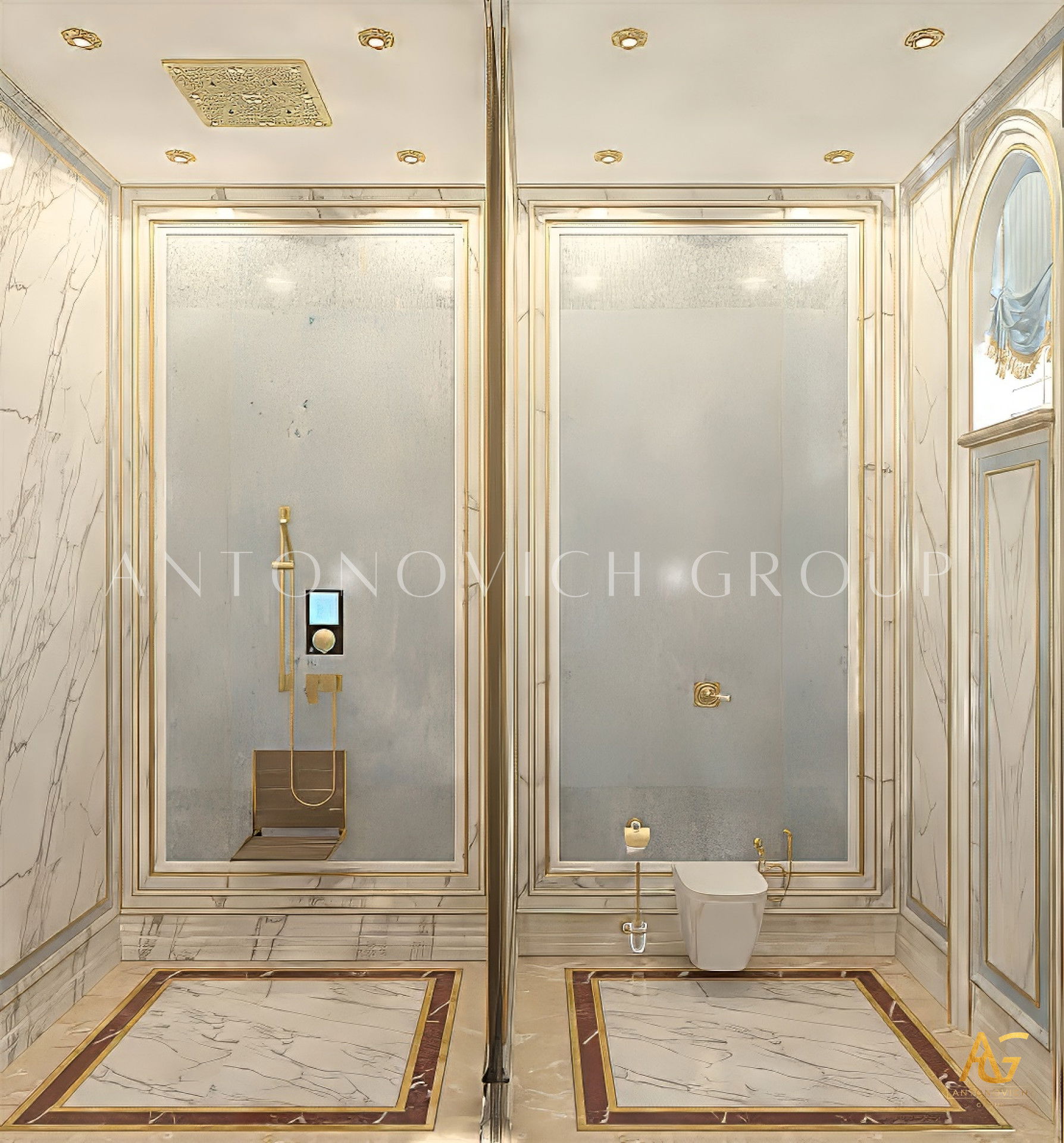 The luxury bathroom interior design plan is also excellent. As previously stated, the bathtub is in the middle, while the shower spaces are on the sides. The mirror is also large enough for you to utilize with your lovely dress every day.