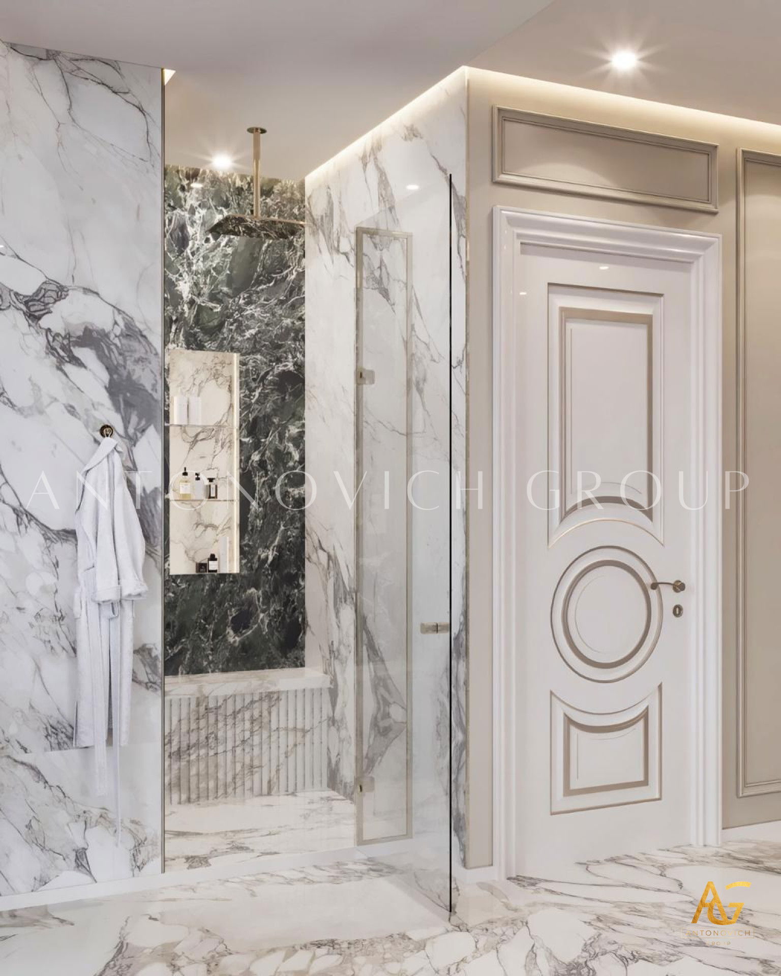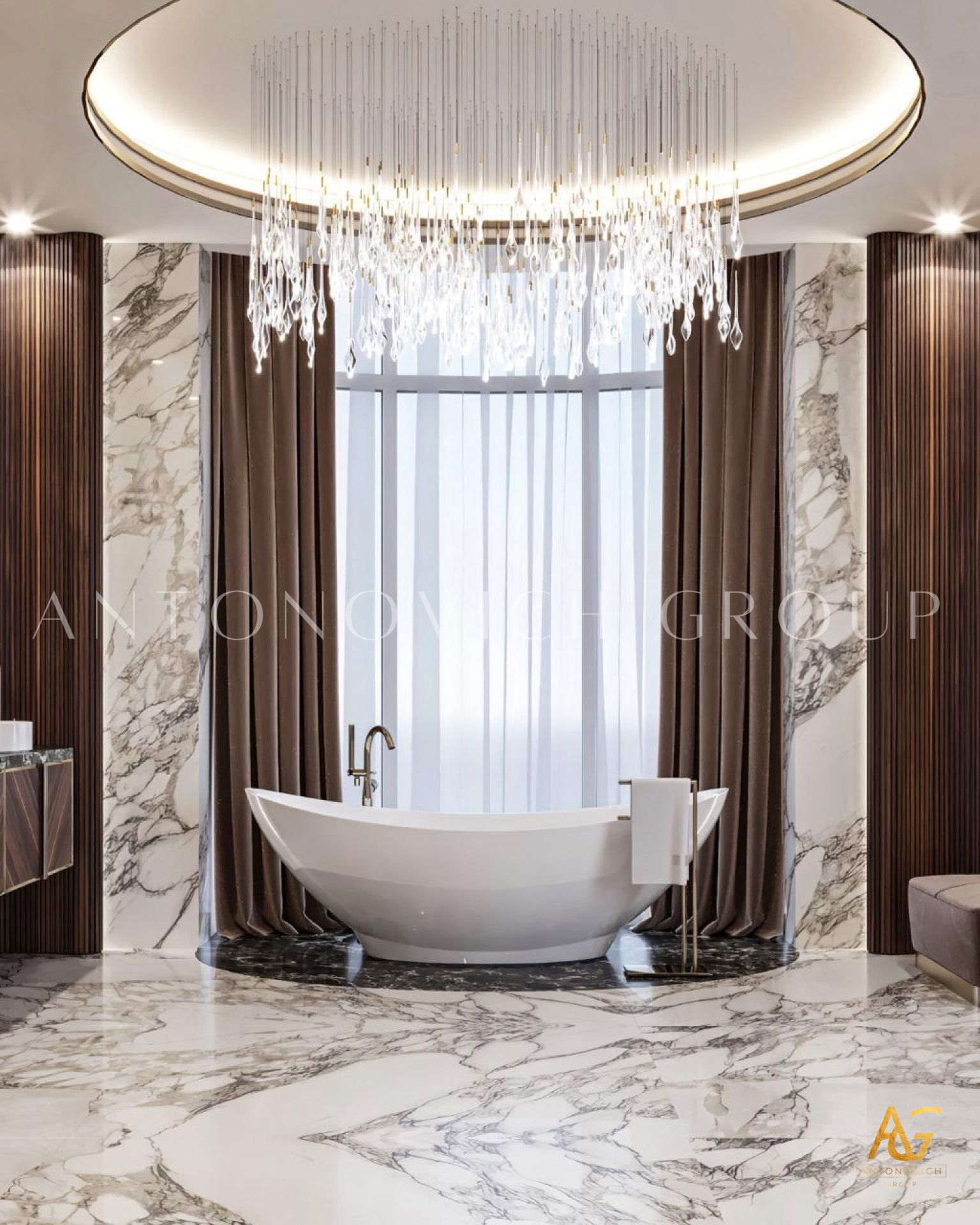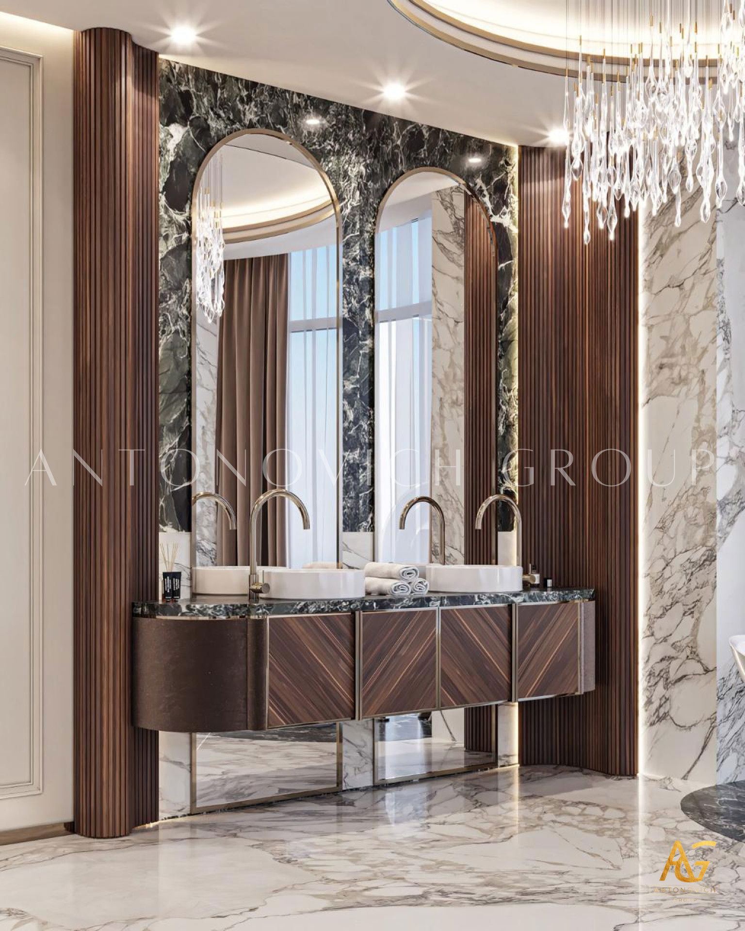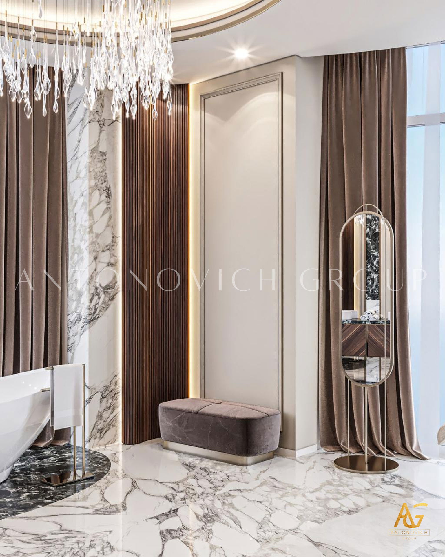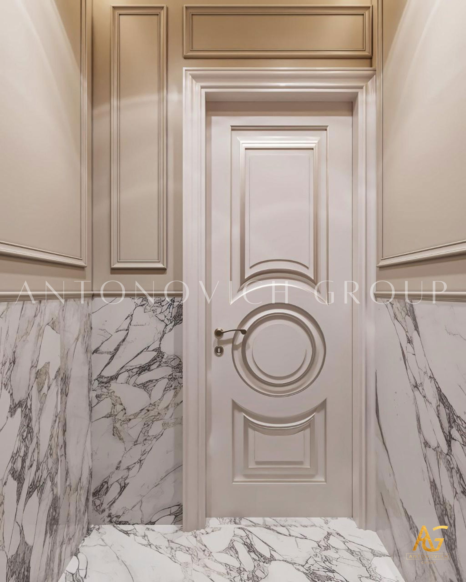 Bathroom interior design, due to the premises’ purposes, has some nuances. Dubai Interior Designers in the bathroom interior of the luxury villa in the UAE continued lush decoration and classical motifs. In a relatively small space, spectacular decorations look quite harmoniously. The ceiling is adorned with the elegant classic chandelier that looks amazing with stucco decoration. The floor design in every project of the design studio in Dubai is the creation of artistic and expressive images. The bathroom interior is decorated with carved marble floor with shiny ornaments. The walls are decorated with cream-colored stucco with the marble texture. On this background, the carved baroque frame with gold looks very juicy and bright. Zest of the bathroom interior is the door with fanciful patterns. The interior design is filled with beautiful motifs of traditional classics, which perfectly underlines the respectability and gentility of the interior.