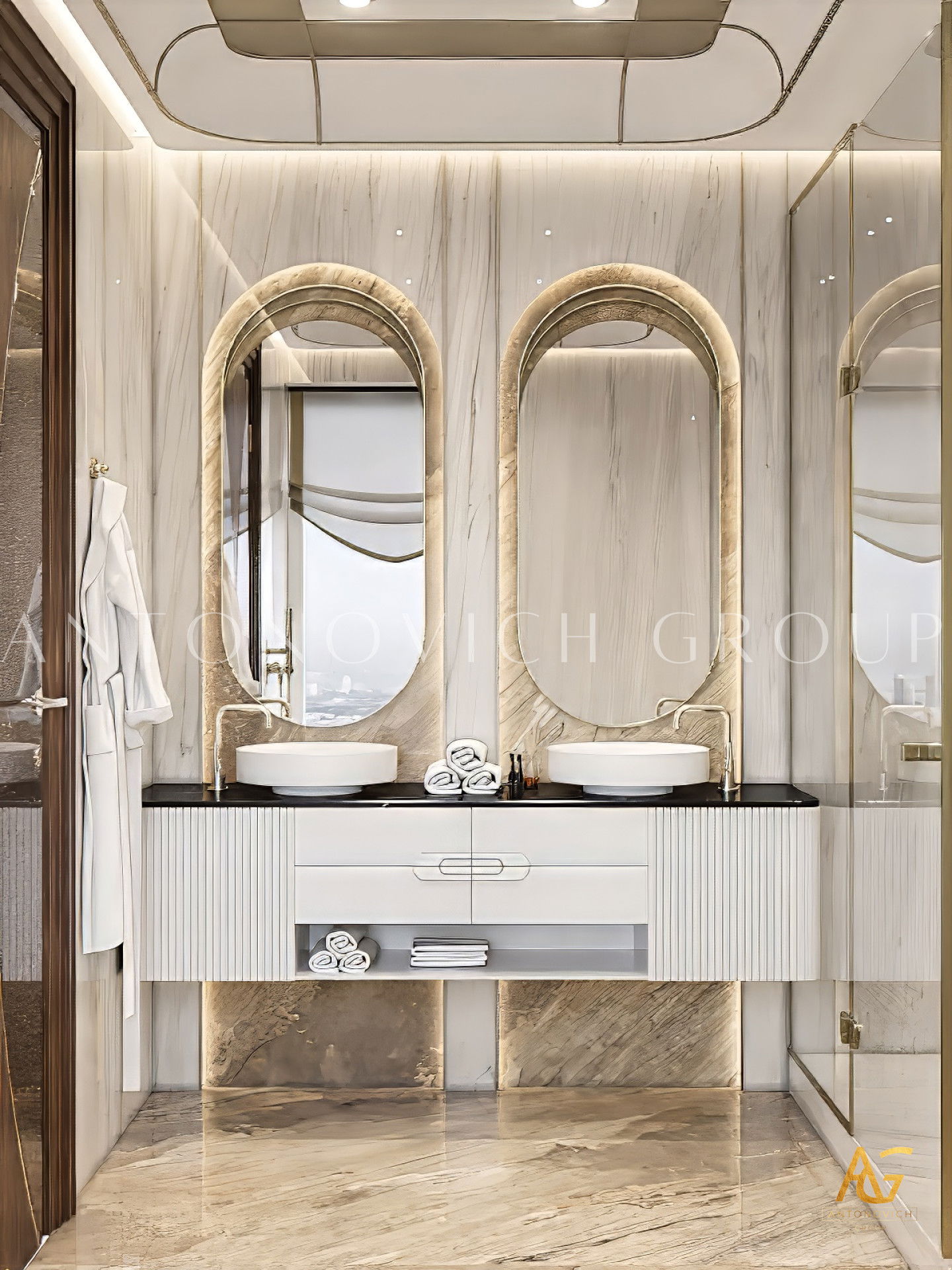 To elevate functionality, Antonovich Group incorporates premium sanitary fixtures and closet fittings. Freestanding bathtubs, walk-in showers, floating vanities, and modern faucets are paired with tailor-made storage systems, soft-closing drawers, and built-in organizers.