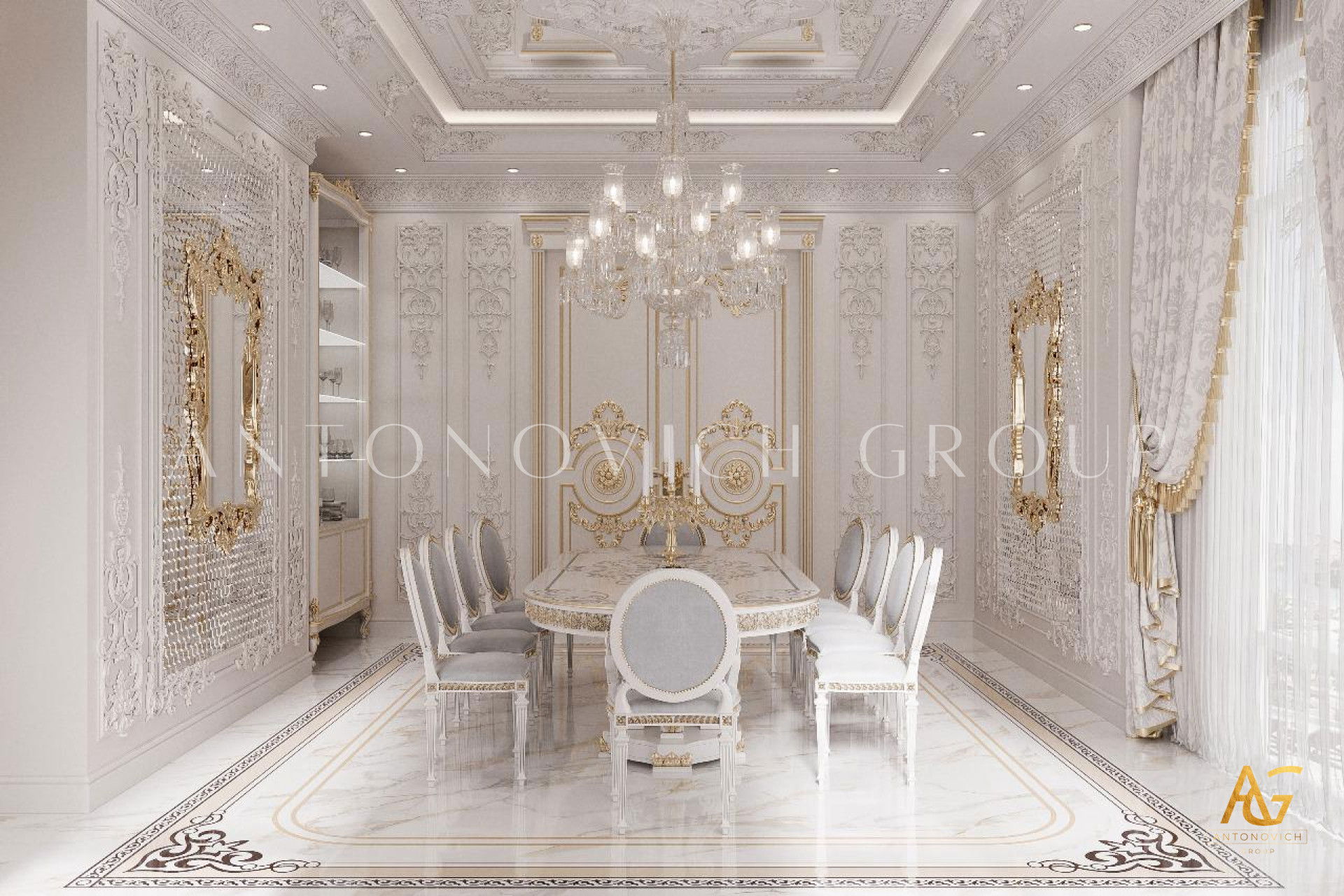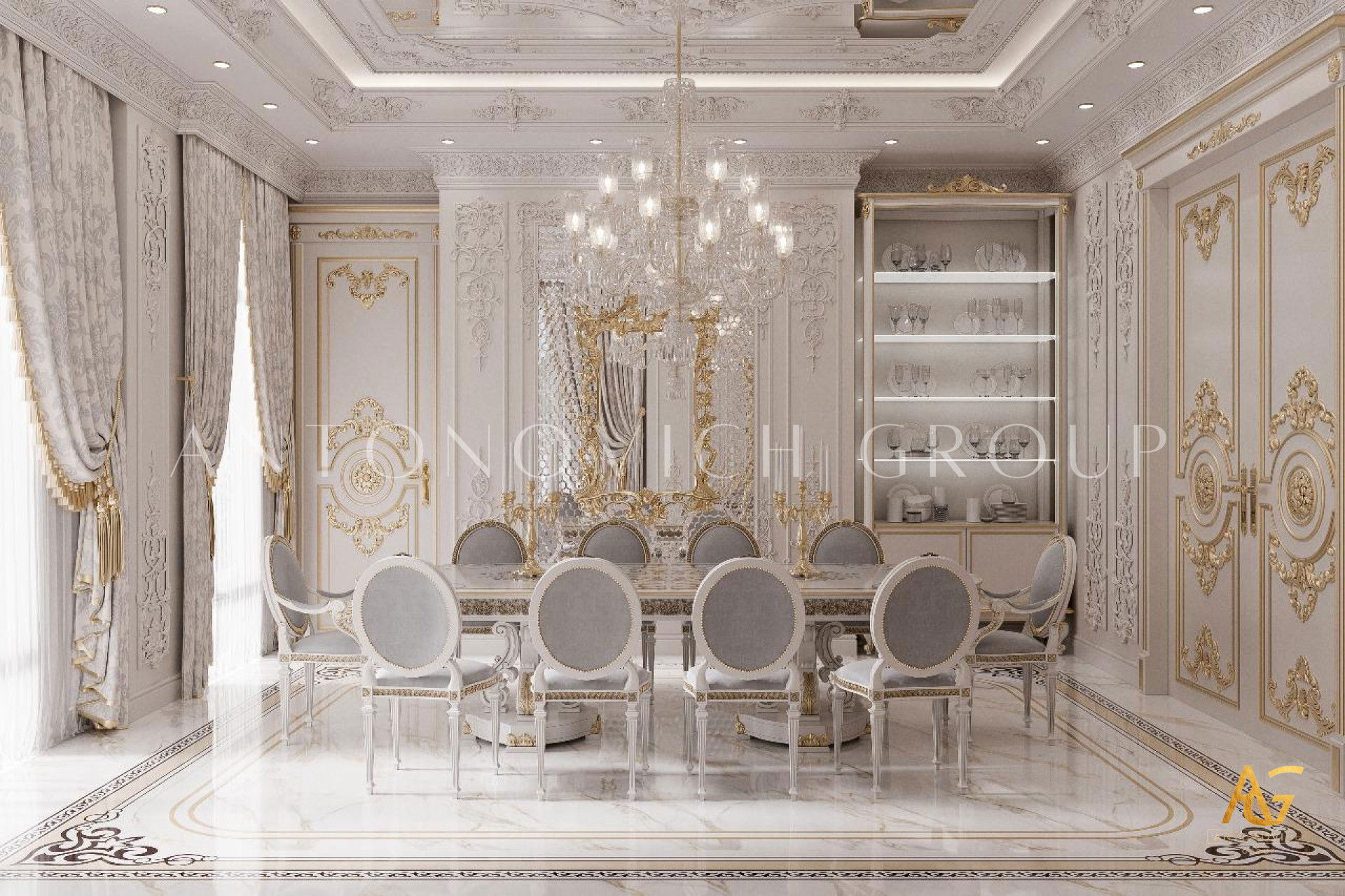 The color palette in a classic dining room interior is often rich and sophisticated, featuring shades of gold, cream, burgundy, or deep blue. Walls adorned with decorative paneling, damask wallpaper, or hand-painted frescoes contribute to an aristocratic charm. To enhance the grandeur, ceiling medallions and intricate crown molding add architectural interest and depth.