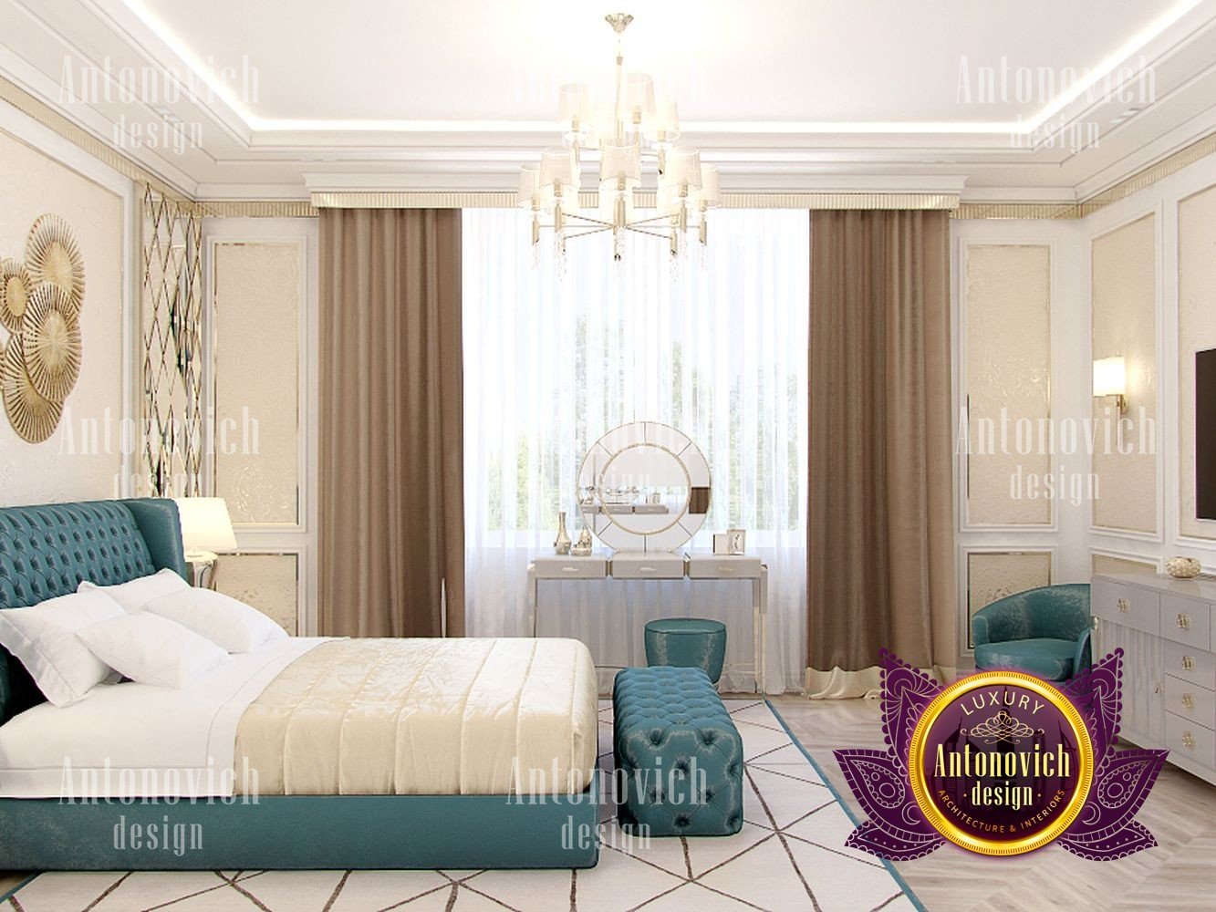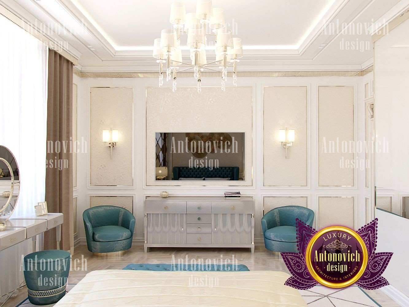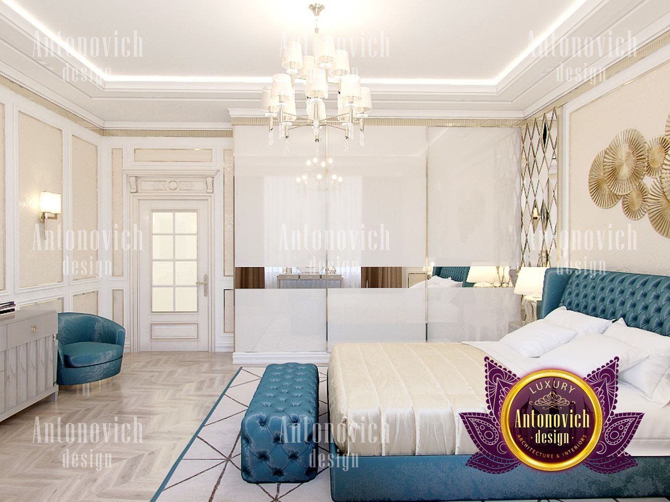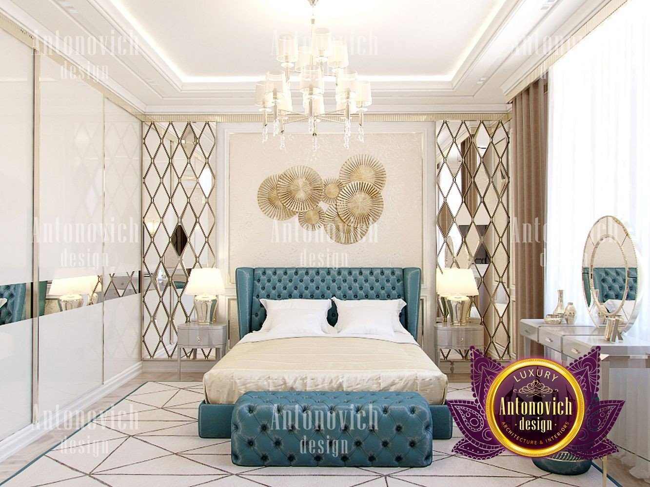 Sometimes only a geometric pattern can play a decisive role in the formation of an artistically expressive image of the interior. And in this bedroom, the beautiful motifs of the mesh rhomboid ornament exquisitely decorate the interior. The interior design of the bedroom combines classic style and art deco motifs. In the best traditions of the mentioned above art deco, the wall behind the headboard was decorated with large faceted mirrored panels. It not only visually expands the interior but also makes it very catchy and bright. Inside this radiance, a decorative panel of many stylized suns is very expressive and bright. To highlight these bright and elegant accents, the interior designers use more restrained motifs in the decor of the ceiling and furniture. Almost invisible closet perfectly fit into the bedroom interior, without loading it. A pearly white smooth surface of the ceiling was decorated with a neat chandelier with small lamps and a soft backlight along the perimeter. The authors of the project continue geometric improvisation in the design of the floor. On the parquet of light wood interestingly looks a large natural carpet with a large pattern. The bed and soft furniture of ash-blue color become the color accent. The high headboard and its footplate are decorated with a soft panel of silk with small rhombs. For window design, curtains of two types of silk were perfect. One of ash-blue color, which repeats the shade of upholstery furniture, and another of warm bronze shade. Elegant boudoir table by the window is complementing an exquisite image of the interior.