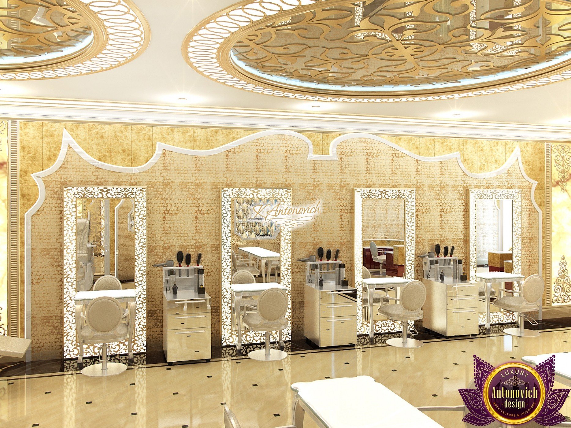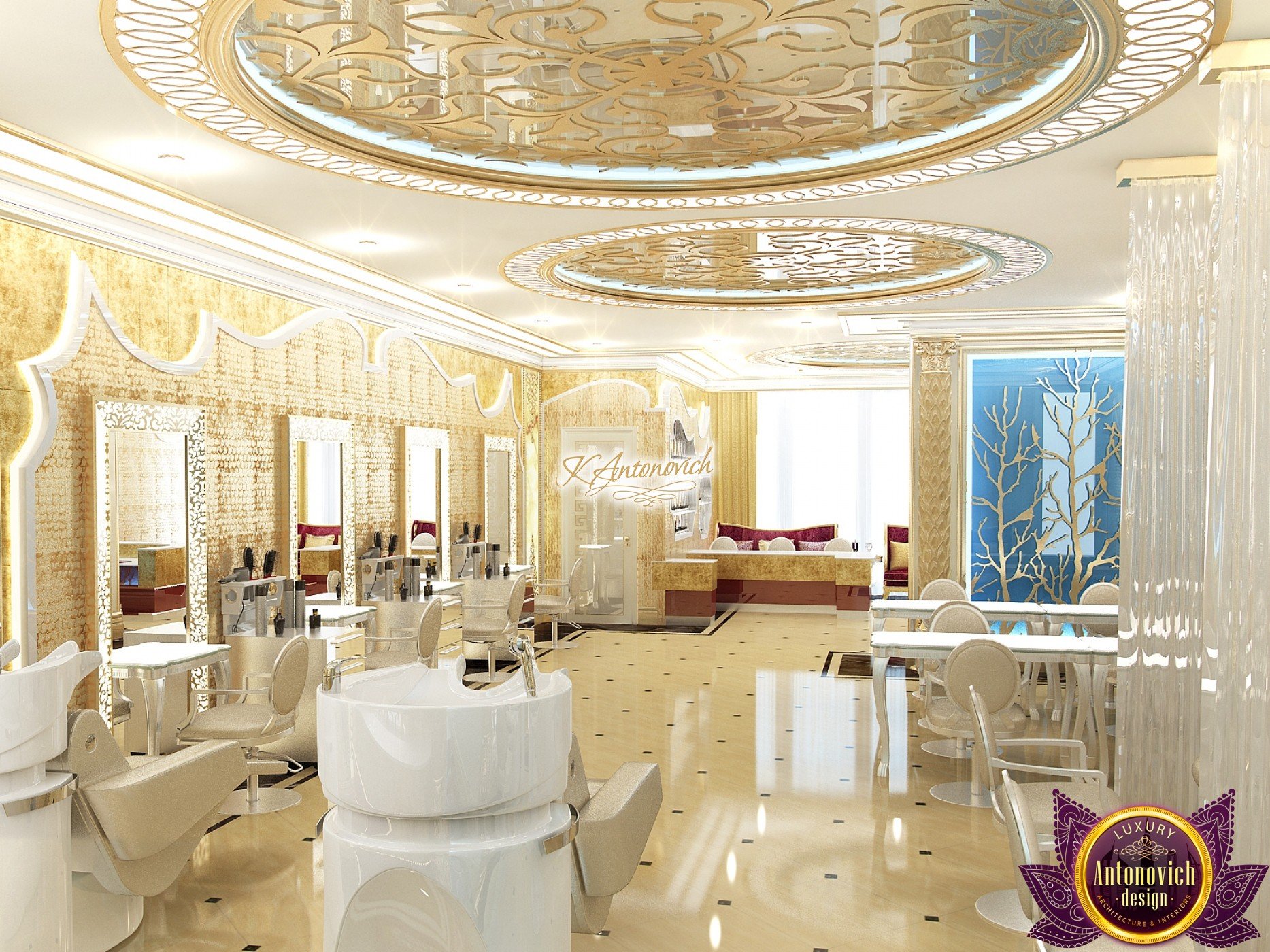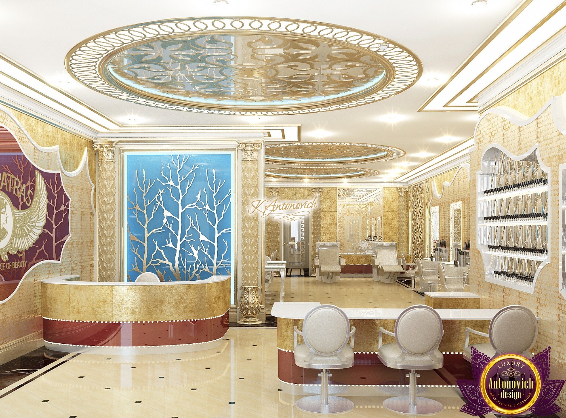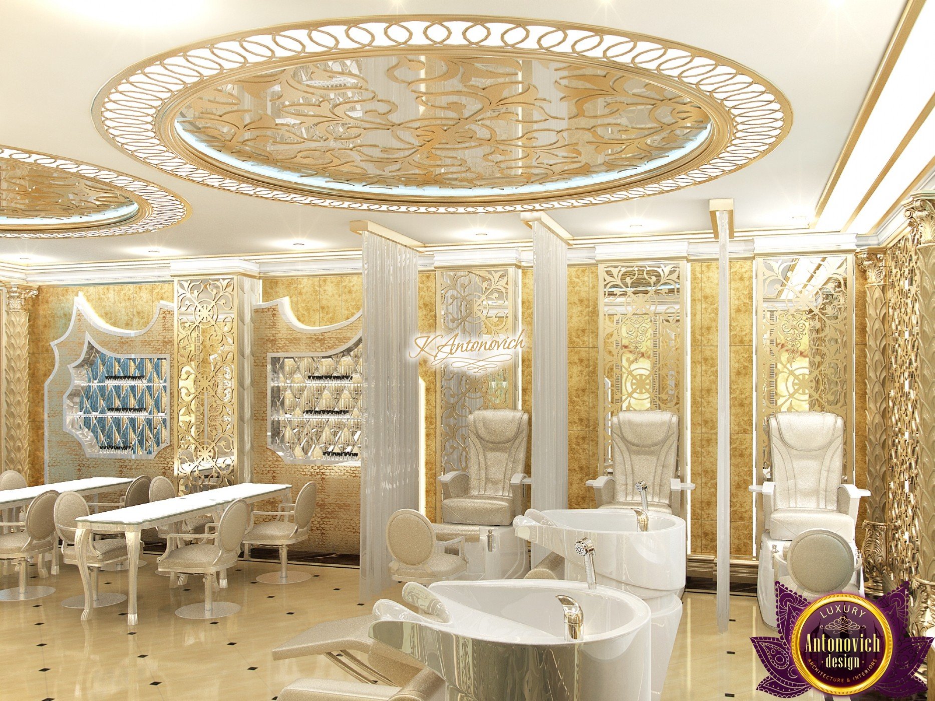Interior decorators in Lagos of a beauty salon by Luxury Antonovich Design perfectly represents the concept of an institution which offers elite services. Interior designers sought to create an atmosphere in which every visitor to the salon will feel like a queen. The interior reflects the motives of Art Deco style with Art Nouveau accents nigerian interior decoration. As the basis of the color gamut, the project authors proposed gold. Modern technology combined with the creative ideas of designers Antonovich Design Studio underlie the unique beauty of the interiors in many different directions. The interior decoration in Nigeria of a beauty salon was another masterpiece among the works of the studio. The decoration of the ceiling looks great round mirror panels with a delicate gold pattern. This technique is not only visually increases the space but also complements it even with more elegant mood.Wall design in golden tones fills the interior of the salon with especially pleasant sunny mood.To make this part of the space more expressive, and at the same time zoning it, interior designers used a white decorative wave with soft backlighting line.Part of wall decor become luxurious pilasters with petals and stucco capitals, which are completely covered with gold leaf interior decoration pictures. Such moments in the decoration images are designed to emphasize the elite status of this institution.Working on the project interior designers take into account the technical norms of the organization of such salons space. Niches with mirrors, decorative panels with floral ornaments. All this is harmoniously integrated into the luxurious look of high-end a beauty salon pictures of interior decoration.
