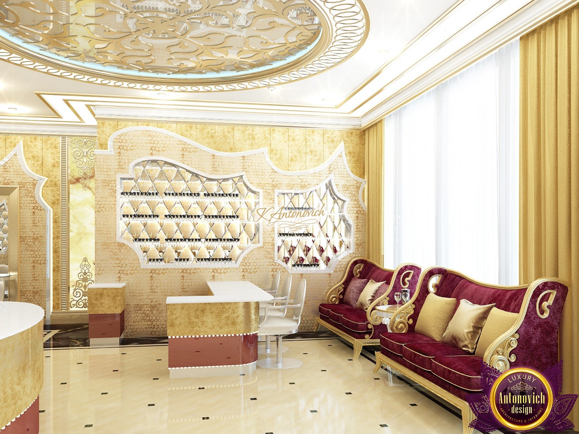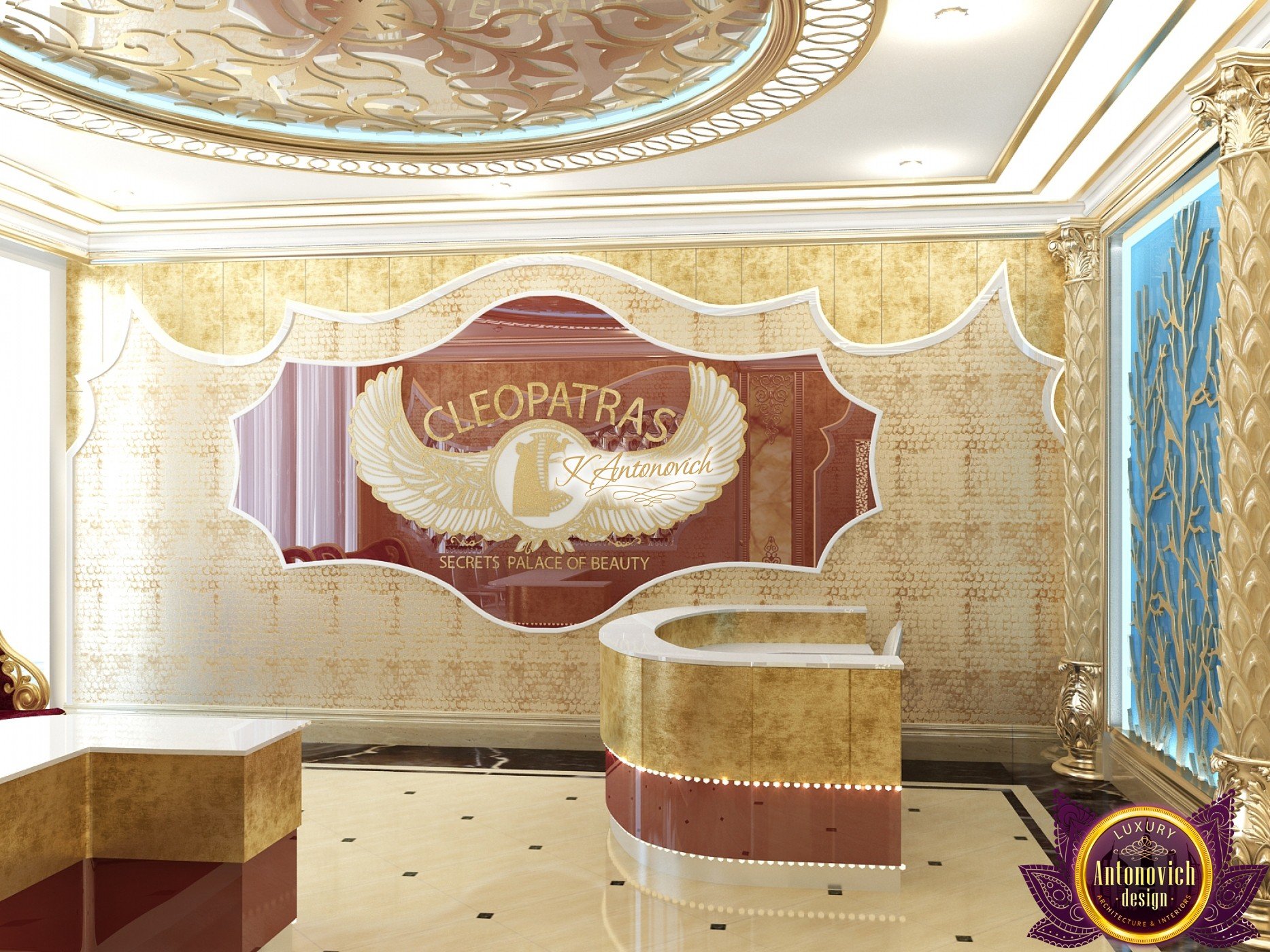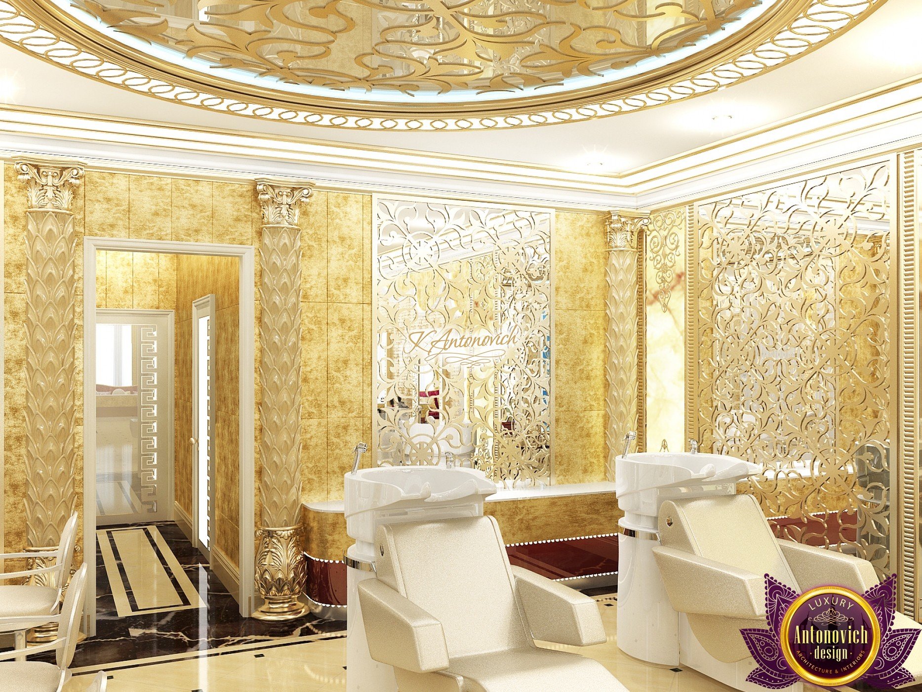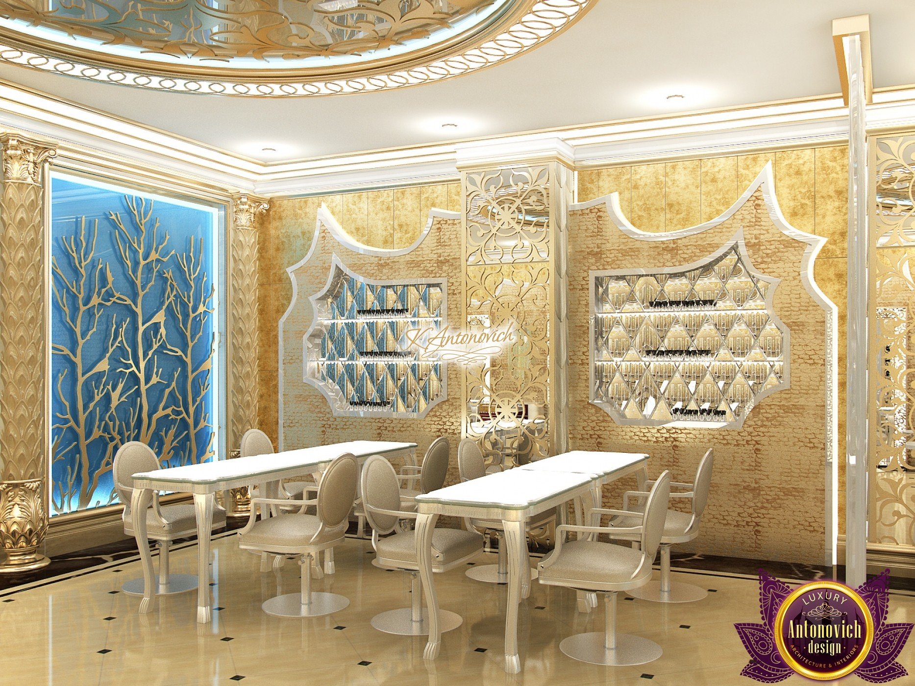Interior decorators in Lagos of a beauty salon by Luxury Antonovich Design perfectly represents the concept of an institution which offers elite services. Interior designers sought to create an atmosphere in which every visitor to the salon will feel like a queen. The interior reflects the motives of Art Deco style with Art Nouveau accents nigerian interior decoration. As the basis of the color gamut, the project authors proposed gold. Modern technology combined with the creative ideas of designers Antonovich Design Studio underlie the unique beauty of the interiors in many different directions. The interior decoration in Nigeria of a beauty salon was another masterpiece among the works of the studio. The decoration of the ceiling looks great round mirror panels with a delicate gold pattern. This technique is not only visually increases the space but also complements it even with more elegant mood.Wall design in golden tones fills the interior of the salon with especially pleasant sunny mood.To make this part of the space more expressive, and at the same time zoning it, interior designers used a white decorative wave with soft backlighting line.Part of wall decor become luxurious pilasters with petals and stucco capitals, which are completely covered with gold leaf interior decoration pictures. Such moments in the decoration images are designed to emphasize the elite status of this institution.Working on the project interior designers take into account the technical norms of the organization of such salons space. Niches with mirrors, decorative panels with floral ornaments. All this is harmoniously integrated into the luxurious look of high-end a beauty salon pictures of interior decoration.