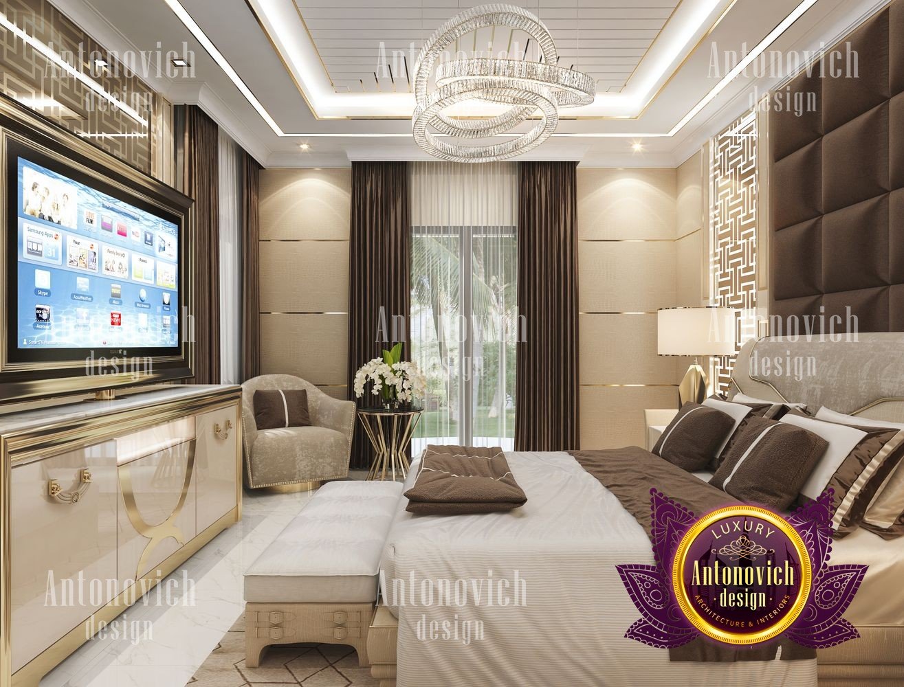There is nothing more beautiful than enjoying a comfortable rest in such a luxurious bedroom. Here, modern style, thanks to the bright accents of Art Deco, acquired the completely different look. It would seem that a few strict forms and lines here look quite festive. A great moment in the interior of this bedroom was the presence of large panoramic windows. Outside the windows, a quite bright and colorful city landscape view opens. So the ideal solution to decorate the interior was curtains in a modern style made of silk of chocolate shade. Moving eyes to the ceiling, we will see a more vivid picture of a beautiful ornament of gold lines. In the center, the interior is illuminated by a smart crystal chandelier. The floor of light marble and ceiling are decorated in large geometry patterns. Designers had offered to decorate walls in the bedroom interior with modern plaster with the gloss effect. As accents, the authors of the project use beautiful mirror panels with grid patterns of fine lines of polished brass. The additional comfort and bright luxury were given by a beautiful soft sofa by the window with pearl white velvet upholstery and inlays of natural wood, which is covered with gilding. These moments are repeated in the design of a large bed, as well as in two armchairs in a small dressing room. Behind the headboard of the bed, the interior of the large bedroom was decorated with an interesting soft panel with geometric pattern and inlays of the same polished brass. Charming bedside tables and all kinds of lamps make the interior complete.