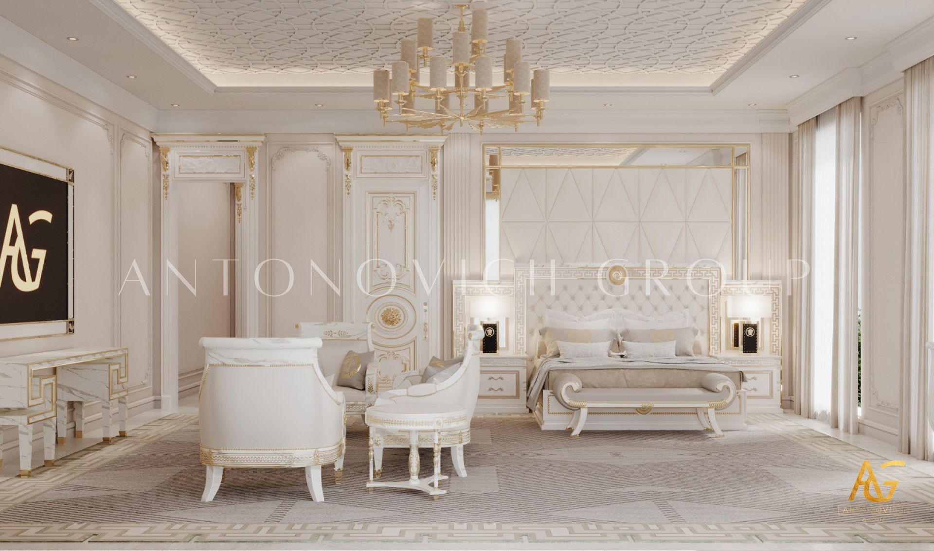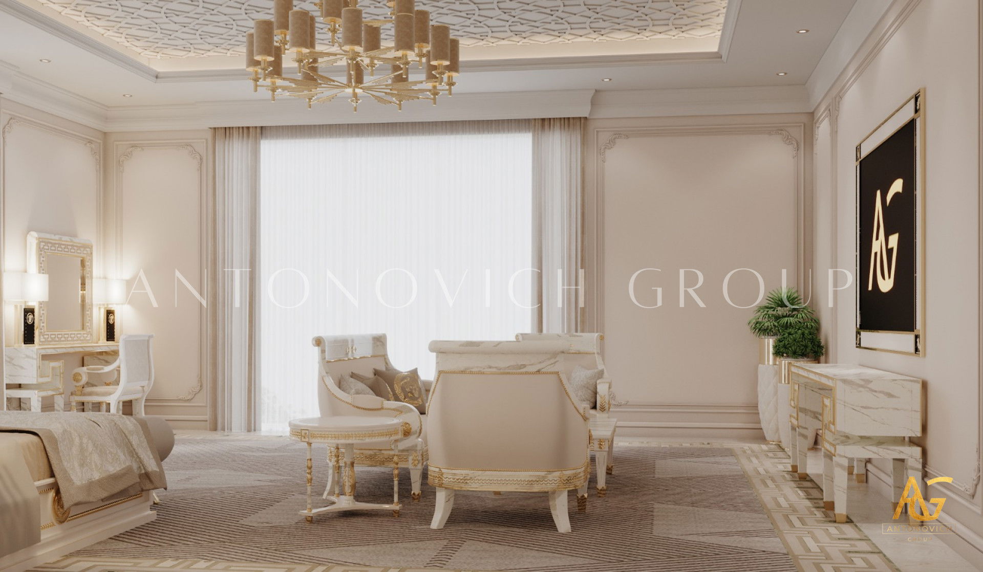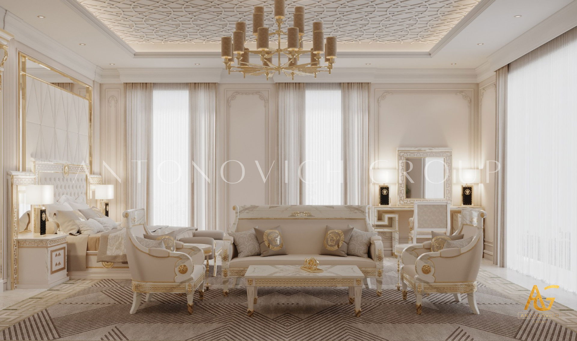 The triumph of classic style and lush luxury we see in this interior of the luxury bedroom interior design UAE. In this version, it was necessary to decorate a large room, which according to the elite house design project was allocated for the interior of the main, master luxury bedroom interior design UAE. Designers of the interior studio Luxury Antonovich Design continue the overall design concept of the project, which consists in creating an image of elegant palace luxury. In the interior, there is a very interesting moment. Basically, all the direction of the interior decoration is equally taken part in the formation of a holistic image of the luxury bedroom interior design UAE interior. So, for example, the decor of the walls is quite saturated with such traditional moments as stucco molding and gilding elements. But thanks to the color palette of the walls, which is dominated by a muted cream shade, this moment gives the room a cozy and calm charm. In the ceiling decor, designers use a pleasant pearly-white color, against the background, the magnificent crystal chandelier looks perfectly. In the example of this interior, we can observe a unique option, when the bed has an important role in the general image of the interior but is far from the main one. The basis of the bed beauty was a headboard with soft upholstery made of genuine leather and inlaid with carved handmade decor. The brightest accents were moments of textile design. The bed is decorated with a luxurious silk veil in blue shades, and the bed itself is directly located on a large natural carpet with a classic ornament. The very flooring of noble marble emphasizes the luxury of this interior.