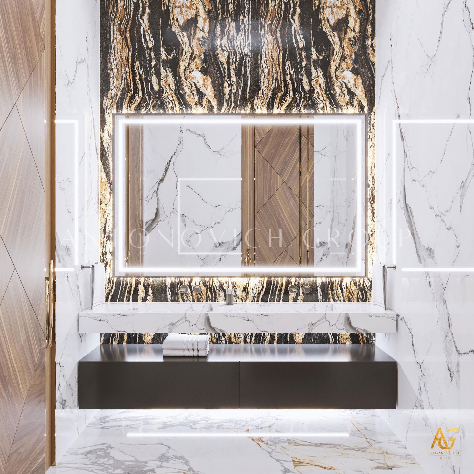 The luxurious bathroom is full of elegant and unique decor elements, each of which is a part of a unique image. Interior Designers Dubai skillfully placed into the time-honored tradition notes of contemporary trends. One of the highlights of the interior became a hanging closet with a sink, which is decorated with soft panel of genuine leather. Soft lights form a beautiful visual effect of weightlessness. Elegant decor element became the original tiles with texture that visually replicate a soft finish of the sink. Against this beautiful background bathroom interior is decorated with a large mirror in a carved gilt frame. Combination of gold, marble and creamy shades sets a gentle mood of the interior. The architectural villa design in Dubai has several bathrooms. Each room at the request of the owners of the house has become an obligatory element of the window. In this bathroom window is decorated with exquisite sided curtain of translucent silk. Noble marble floor and wall decor complement the noble and respectable image of the interior.